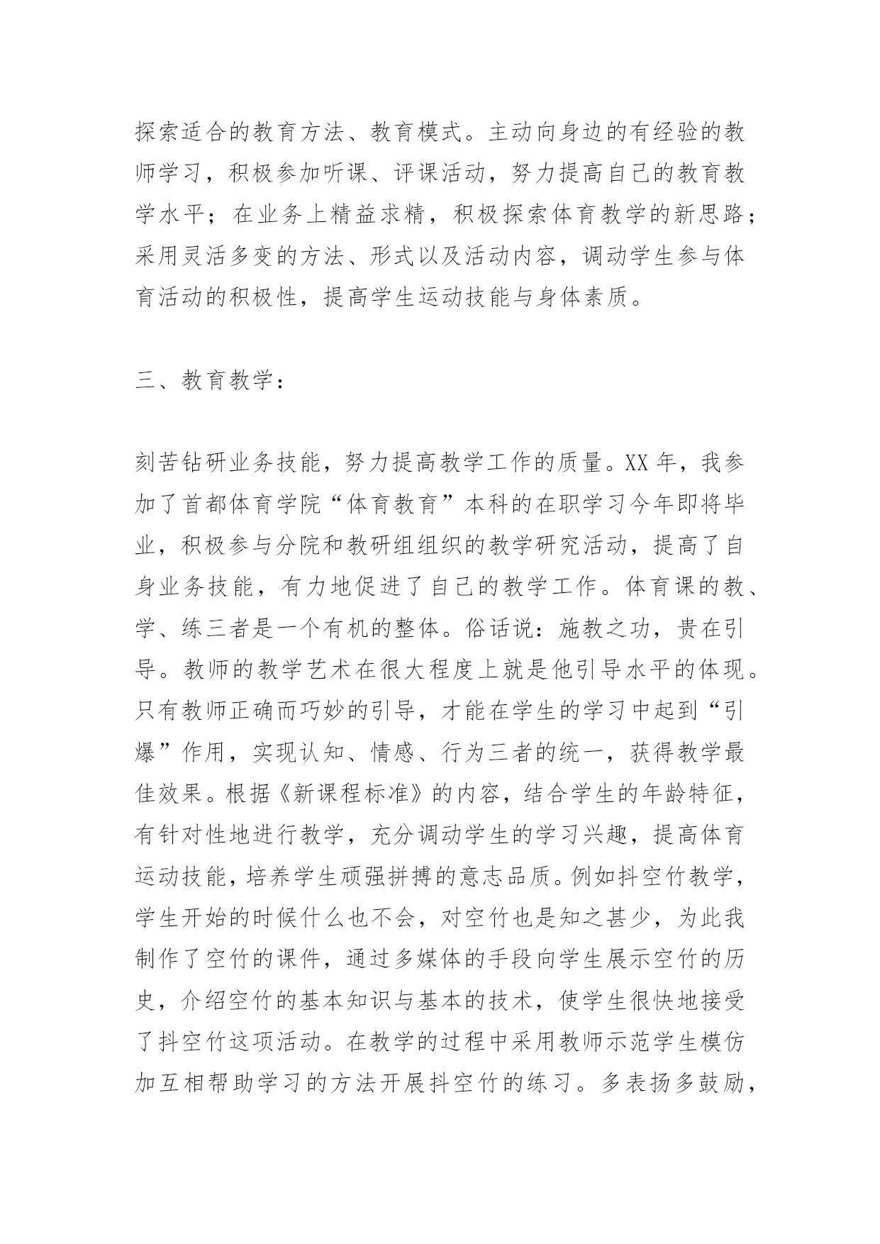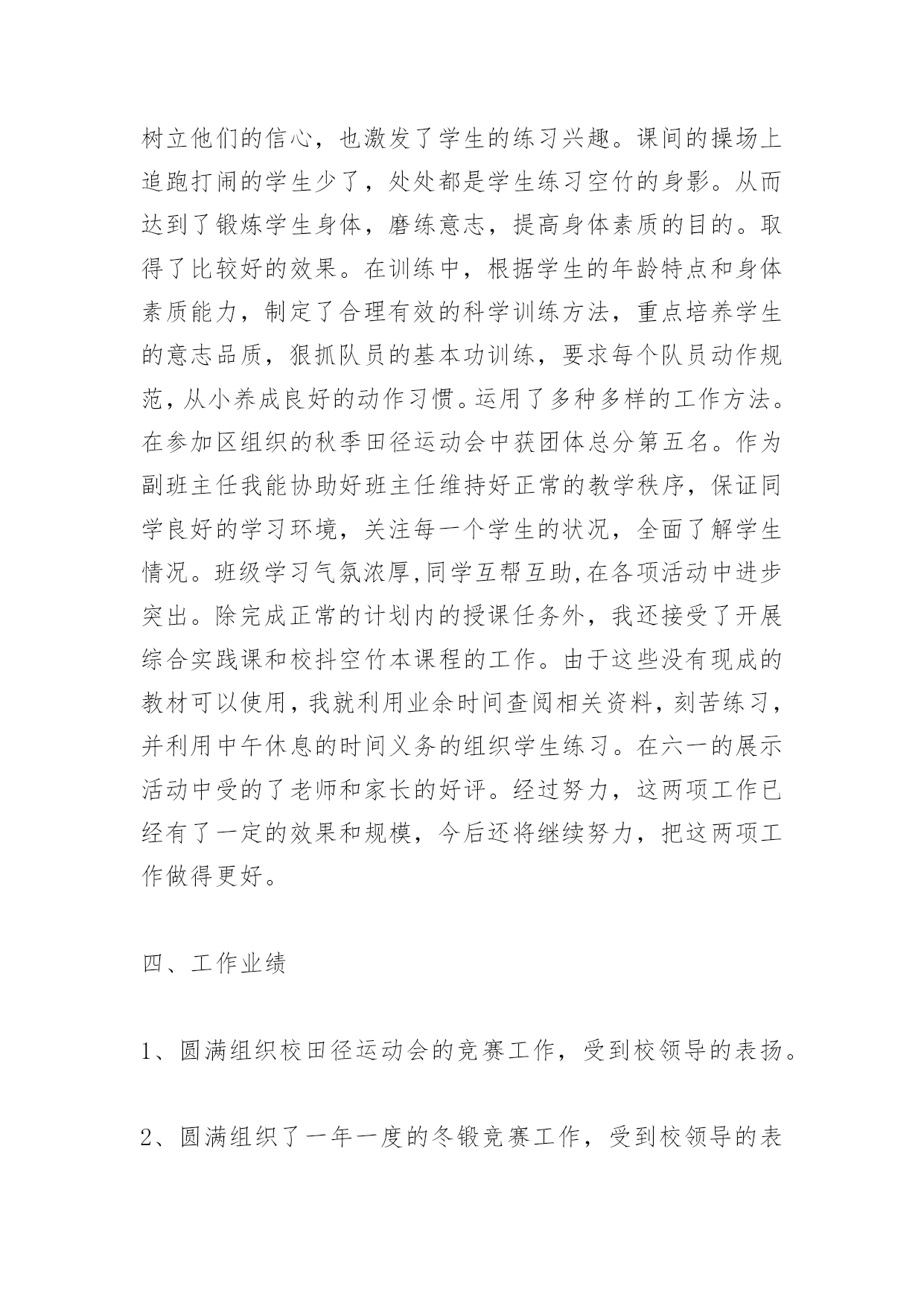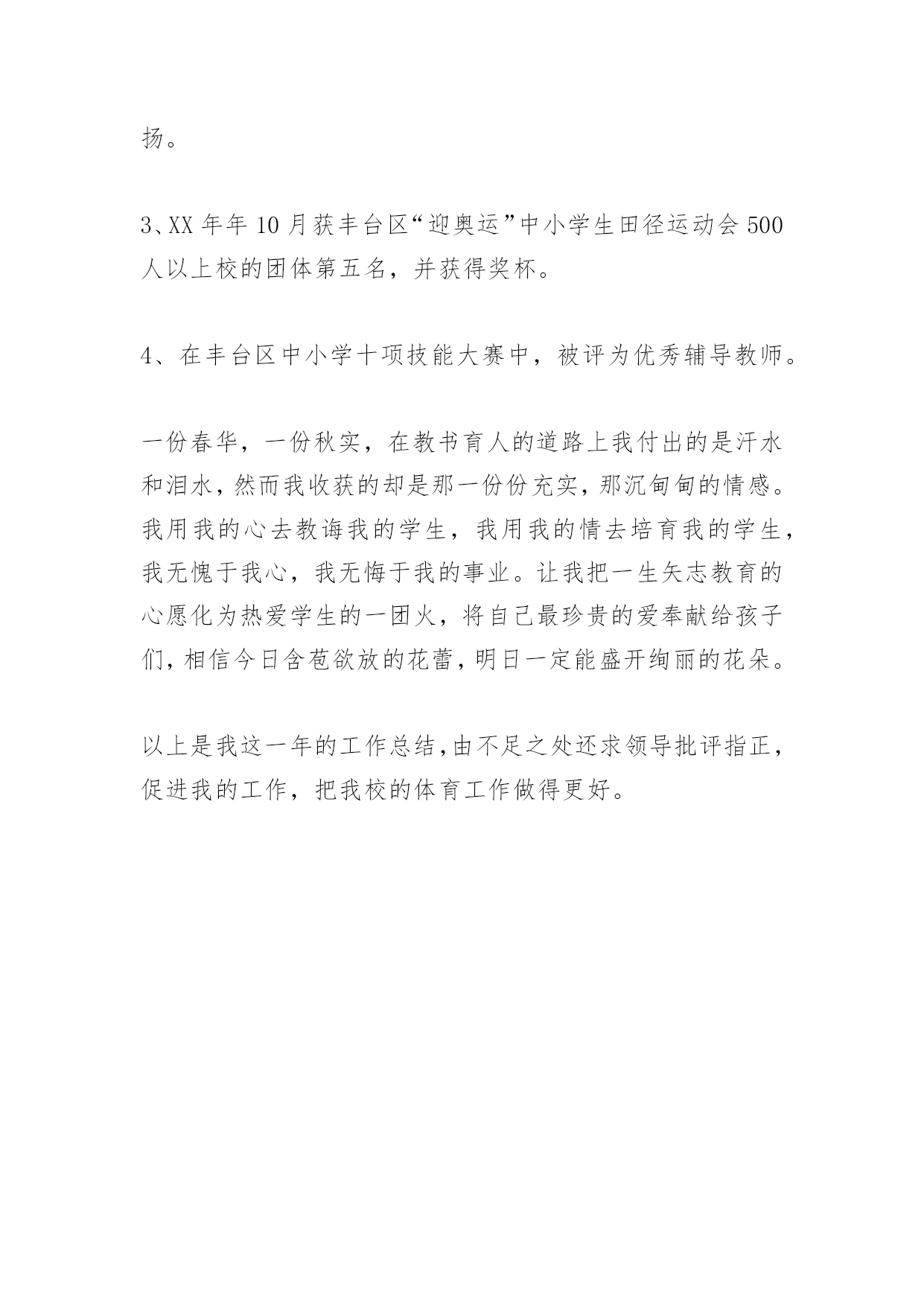 -教师工作总结2009年—2010学年度工作将要结束了,在这一年中我较好的完成了体育教学任务和领导交付的各项工作。现在我将本学期的工作情况总结如下。一、政治思想:认真参加学校组织的各项政治理论学习,关心时事政策,在工作和学习中认真践行“三个代表”和“八荣八耻”重要思想,自觉与党中央保持高度一致,严格执行教育方针,尽职尽责,教书育人;同时面向全体学生,热爱、尊重、了解和严格要求学生,不歧视、挖苦他们,循循善诱,诲人不倦;要求学生做到的,自己首先做到,以身作则,为人师表。牢固地树立了爱岗敬业思想。在工作中,始终保持饱满的工作热情,克服困难,与体育组的同事团结协作,积极搞好体育教学和训练,模范地履行了一名小学教师的职责和义务。二、工作态度:在工作中,认真学习新大纲、新教材,将教材、教法、学法进可能完美的结合,积极、认真备好每一个教案,上好每一节课,充分发挥课堂40分钟的作用,尽可能减轻学生的课业负担,同时积极学习钻研名师、专家的教育、教学理论,探索适合的教育方法、教育模式。主动向身边的有经验的教师学习,积极参加听课、评课活动,努力提高自己的教育教学水平;在业务上精益求精,积极探索体育教学的新思路;采用灵活多变的方法、形式以及活动内容,调动学生参与体育活动的积极性,提高学生运动技能与身体素质。三、教育教学:刻苦钻研业务技能,努力提高教学工作的质量。XX年,我参加了首都体育学院“体育教育”本科的在职学习今年即将毕业,积极参与分院和教研组组织的教学研究活动,提高了自身业务技能,有力地促进了自己的教学工作。体育课的教、学、练三者是一个有机的整体。俗话说:施教之功,贵在引导。教师的教学艺术在很大程度上就是他引导水平的体现。只有教师正确而巧妙的引导,才能在学生的学习中起到“引爆”作用,实现认知、情感、行为三者的统一,获得教学最佳效果。根据《新课程标准》的内容,结合学生的年龄特征,有针对性地进行教学,充分调动学生的学习兴趣,提高体育运动技能,培养学生顽强拼搏的意志品质。例如抖空竹教学,学生开始的时候什么也不会,对空竹也是知之甚少,为此我制作了空竹的课件,通过多媒体的手段向学生展示空竹的历史,介绍空竹的基本知识与基本的技术,使学生很快地接受了抖空竹这项活动。在教学的过程中采用教师示范学生模仿加互相帮助学习的方法开展抖空竹的练习。多表扬多鼓励,树立他们的信心,也激发了学生的练习兴趣。课间的操场上追跑打闹的学生少了,处处都是学生练习空竹的身影。从而达到了锻炼学生身体,磨练意志,提高身体素质的目的。取得了比较好的效果。在训练中,根据学生的年龄特点和身体素质能力,制定了合理有效的科学训练方法,重点培养学生的意志品质,狠抓队员的基本功训练,要求每个队员动作规范,从小养成良好的动作习惯。运用了多种多样的工作方法。在参加区组织的秋季田径运动会中获团体总分第五名。作为副班主任我能协助好班主任维持好正常的教学秩序,保证同学良好的学习环境,关注每一个学生的状况,全面了解学生情况。班级学习气氛浓厚,同学互帮互助,在各项活动中进步突出。除完成正常的计划内的授课任务外,我还接受了开展综合实践课和校抖空竹本课程的工作。由于这些没有现成的教材可以使用,我就利用业余时间查阅相关资料,刻苦练习,并利用中午休息的时间义务的组织学生练习。在六一的展示活动中受的了老师和家长的好评。经过努力,这两项工作已经有了一定的效果和规模,今后还将继续努力,把这两项工作做得更好。四、工作业绩1、圆满组织校田径运动会的竞赛工作,受到校领导的表扬。2、圆满组织了一年一度的冬锻竞赛工作,受到校领导的表扬。3、XX年年10月获丰台区“迎奥运”中小学生田径运动会500人以上校的团体第五名,并获得奖杯。4、在丰台区中小学十项技能大赛中,被评为优秀辅导教师。一份春华,一份秋实,在教书育人的道路上我付出的是汗水和泪水,然而我收获的却是那一份份充实,那沉甸甸的情感。我用我的心去教诲我的学生,我用我的情去培育我的学生,我无愧于我心,我无悔于我的事业。让我把一生矢志教育的心愿化为热爱学生的一团火,将自己最珍贵的爱奉献给孩子们,相信今日含苞欲放的花蕾,明日一定能盛开绚丽的花朵。以上是我这一年的工作总结,由不足之处还求领导批评指正,促进我的工作,把我校的体育工作做得更好。