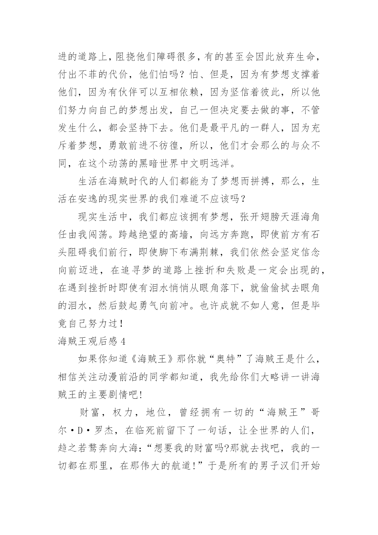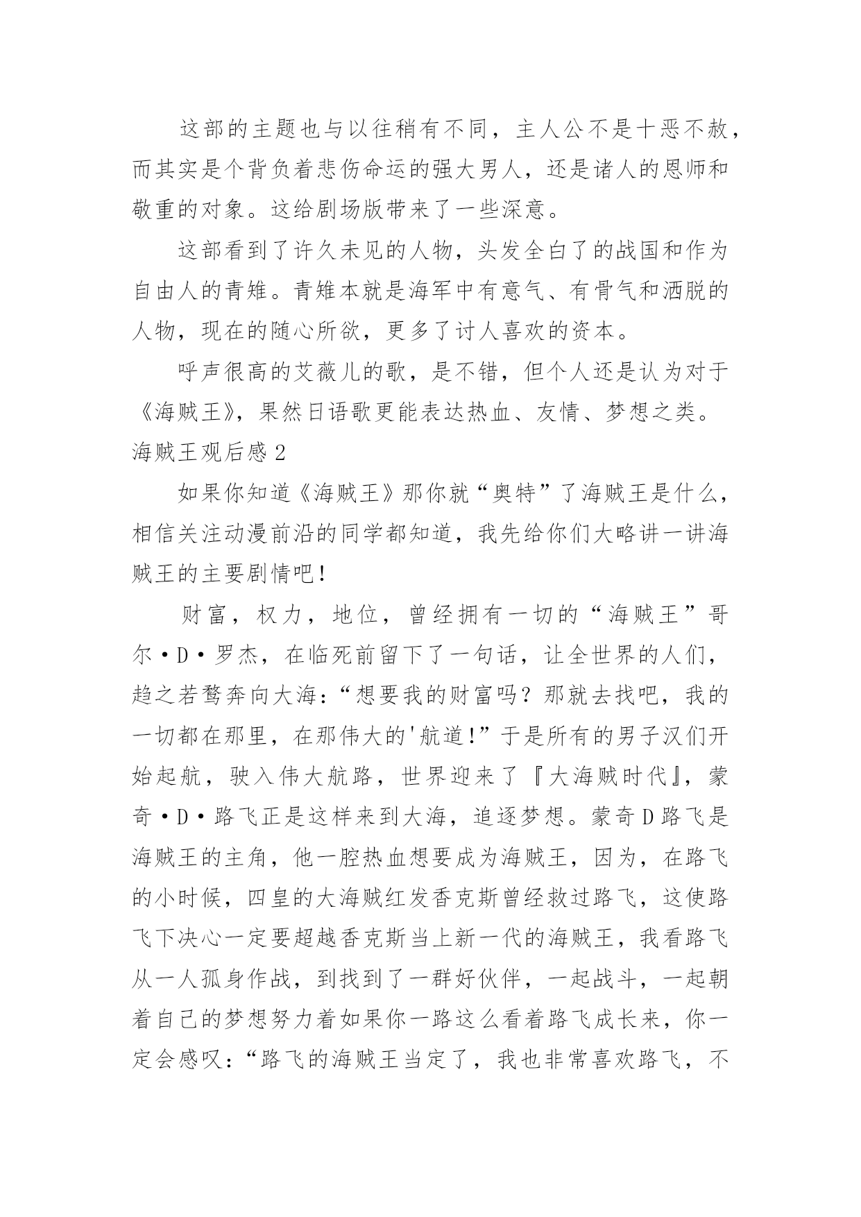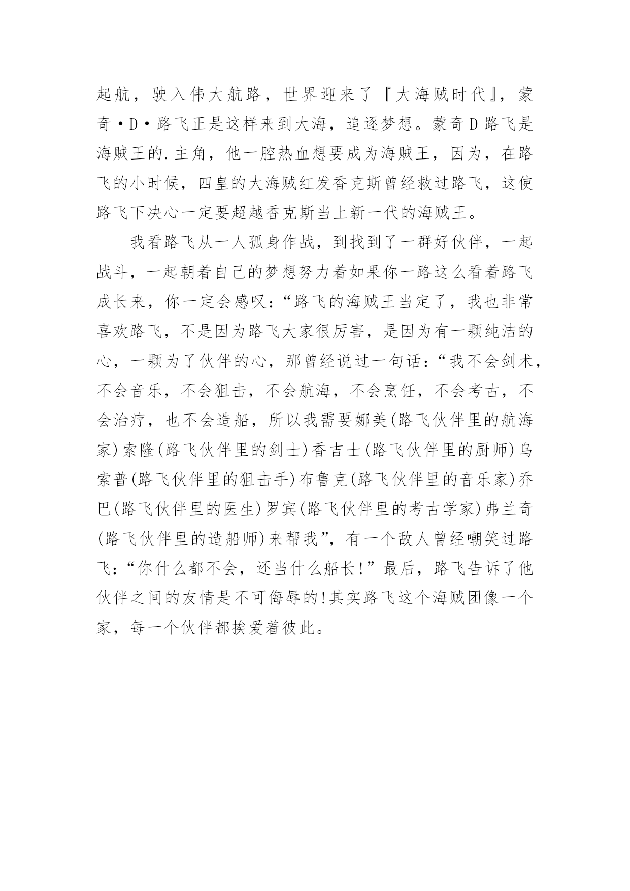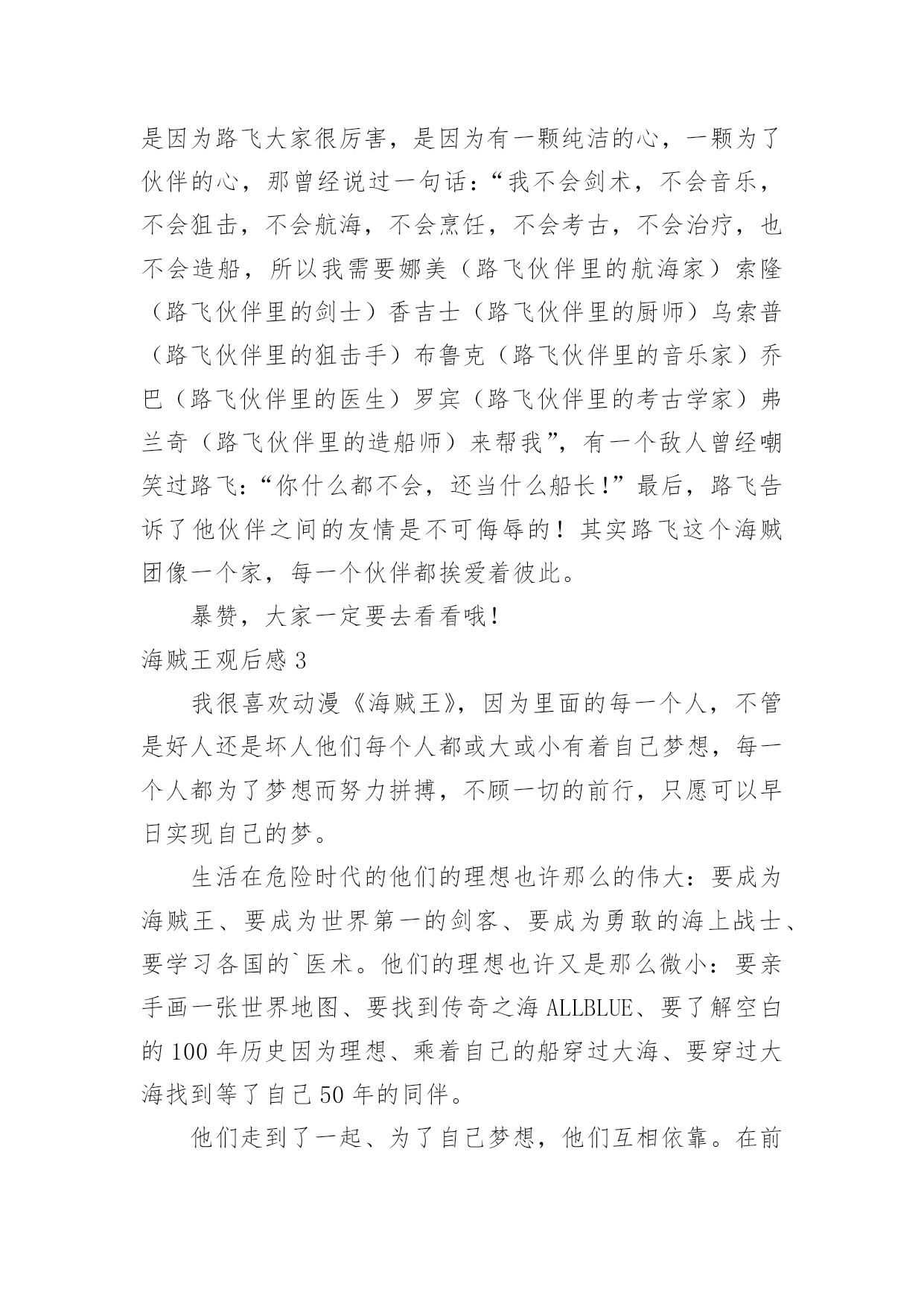 海贼王观后感海贼王观后感看完一部作品以后,相信大家有很多值得分享的东西吧,很多人观看之后都有不一样的心情。那么你真的会写观后感吗?下面是小编为大家整理的海贼王观后感,欢迎大家借鉴与参考,希望对大家有所帮助。海贼王观后感1在“Z”上映之前,通过海报和不多的宣传,就对这部剧场版充满了期待。帅气而繁复的人物造型,使我在未看之前,已经拥有了这部剧场版设定的很多手办。为了向这部伟大的剧场版致敬,特地煮了20xx世界排名第十的方便面,开始了“Z”之旅。虽然剧场版的剧情大致雷同,就是LUFFYたち遇到了相当強い敌人,刚开始千打万打打不过,最后集体帅气亮相,迅速把敌人打飞。但是,这部中的人物造型实在太好看了!无论是集体战斗服的かっこいい,还是便服的おしゃれ,一套又一套,不断赞叹。印象最深的是青雉、路飞、索隆、香吉和布鲁克泡完汤出来,镜头先定格在一个个人的腰间,再逐渐扩大到全身。这每个人的`搭配都焕然一新,但又有个人特色,是值得骷髅先生得意一番了。路飞的夹克竟然还是A┃X的!这部的主题也与以往稍有不同,主人公不是十恶不赦,而其实是个背负着悲伤命运的强大男人,还是诸人的恩师和敬重的对象。这给剧场版带来了一些深意。这部看到了许久未见的人物,头发全白了的战国和作为自由人的青雉。青雉本就是海军中有意气、有骨气和洒脱的人物,现在的随心所欲,更多了讨人喜欢的资本。呼声很高的艾薇儿的歌,是不错,但个人还是认为对于《海贼王》,果然日语歌更能表达热血、友情、梦想之类。海贼王观后感2如果你知道《海贼王》那你就“奥特”了海贼王是什么,相信关注动漫前沿的同学都知道,我先给你们大略讲一讲海贼王的主要剧情吧!财富,权力,地位,曾经拥有一切的“海贼王”哥尔·D·罗杰,在临死前留下了一句话,让全世界的人们,趋之若鹜奔向大海:“想要我的财富吗?那就去找吧,我的一切都在那里,在那伟大的'航道!”于是所有的男子汉们开始起航,驶入伟大航路,世界迎来了『大海贼时代』,蒙奇·D·路飞正是这样来到大海,追逐梦想。蒙奇D路飞是海贼王的主角,他一腔热血想要成为海贼王,因为,在路飞的小时候,四皇的大海贼红发香克斯曾经救过路飞,这使路飞下决心一定要超越香克斯当上新一代的海贼王,我看路飞从一人孤身作战,到找到了一群好伙伴,一起战斗,一起朝着自己的梦想努力着如果你一路这么看着路飞成长来,你一定会感叹:“路飞的海贼王当定了,我也非常喜欢路飞,不是因为路飞大家很厉害,是因为有一颗纯洁的心,一颗为了伙伴的心,那曾经说过一句话:“我不会剑术,不会音乐,不会狙击,不会航海,不会烹饪,不会考古,不会治疗,也不会造船,所以我需要娜美(路飞伙伴里的航海家)索隆(路飞伙伴里的剑士)香吉士(路飞伙伴里的厨师)乌索普(路飞伙伴里的狙击手)布鲁克(路飞伙伴里的音乐家)乔巴(路飞伙伴里的医生)罗宾(路飞伙伴里的考古学家)弗兰奇(路飞伙伴里的造船师)来帮我”,有一个敌人曾经嘲笑过路飞:“你什么都不会,还当什么船长!”最后,路飞告诉了他伙伴之间的友情是不可侮辱的!其实路飞这个海贼团像一个家,每一个伙伴都挨爱着彼此。暴赞,大家一定要去看看哦!海贼王观后感3我很喜欢动漫《海贼王》,因为里面的每一个人,不管是好人还是坏人他们每个人都或大或小有着自己梦想,每一个人都为了梦想而努力拼搏,不顾一切的前行,只愿可以早日实现自己的梦。生活在危险时代的他们的理想也许那么的伟大:要成为海贼王、要成为世界第一的剑客、要成为勇敢的海上战士、要学习各国的`医术。他们的理想也许又是那么微小:要亲手画一张世界地图、要找到传奇之海ALLBLUE、要了解空白的100年历史因为理想、乘着自己的船穿过大海、要穿过大海找到等了自己50年的同伴。他们走到了一起、为了自己梦想,他们互相依靠。在前进的道路上,阻挠他们障碍很多,有的甚至会因此放弃生命,付出不菲的代价,他们怕吗?怕、但是,因为有梦想支撑着他们,因为有伙伴可以互相依赖,因为坚信着彼此,所以他们努力向自己的梦想出发,自己一但决定要去做的事,不管发生什么,都会坚持下去。他们是最平凡的一群人,因为充斥着梦想,勇敢前进不彷徨,所以,他们才会那么的与众不同,在这个动荡的黑暗世界中文明远洋。生活在海贼时代的人们都能为了梦想而拼搏,那么,生活在安逸的现实世界的我们难道不应该吗?现实生活中,我们都应该拥有梦想,张开翅膀天涯海角任由我闯荡。跨越绝望的高墙,向远方奔跑,即使前方有石头阻碍我们前行,即使脚下布满荆棘,我们依然会坚定信念向前迈进,在追寻梦的道路上挫折和失败是一定会出现的,在遇到挫折时即使有泪水悄悄从眼角落下,就偷偷拭去眼角的泪水,然后鼓起勇气向前冲。也许成就不如人意,但是毕竟自己努力过!海贼王观后感4如果你知道《海贼王》那你就“奥特”了海贼王是什么,相信关注动漫前沿的同学都知道,我先给你们大略讲一讲海贼王的主要剧情吧!
