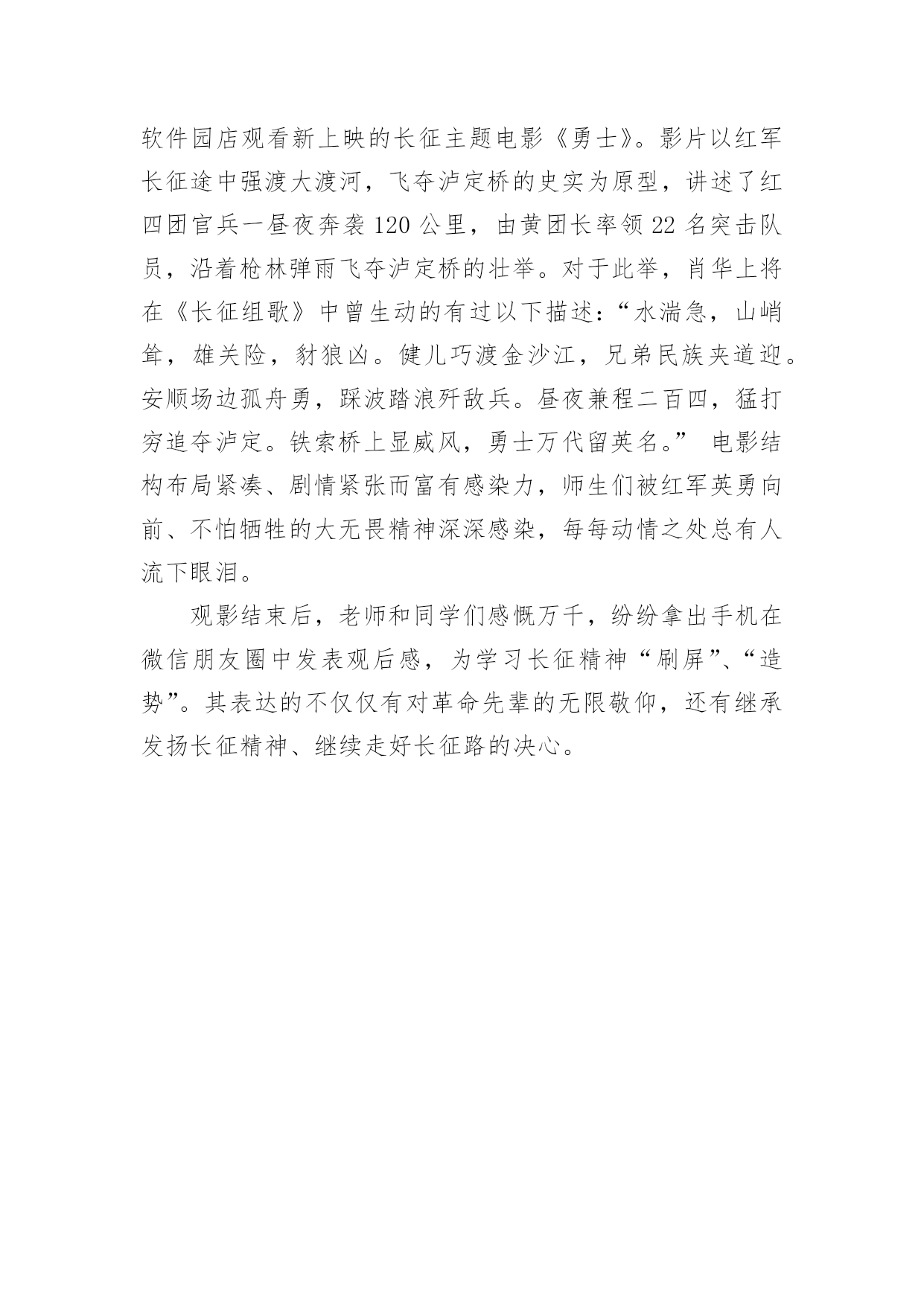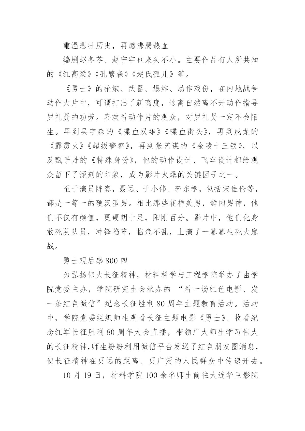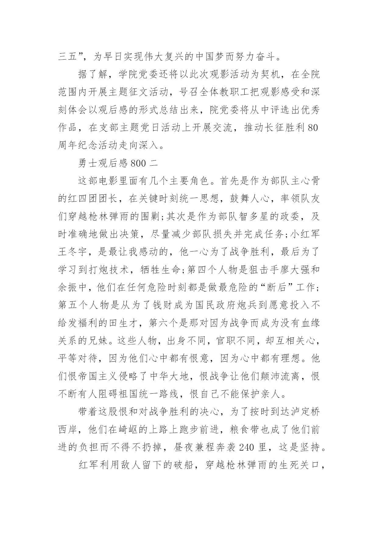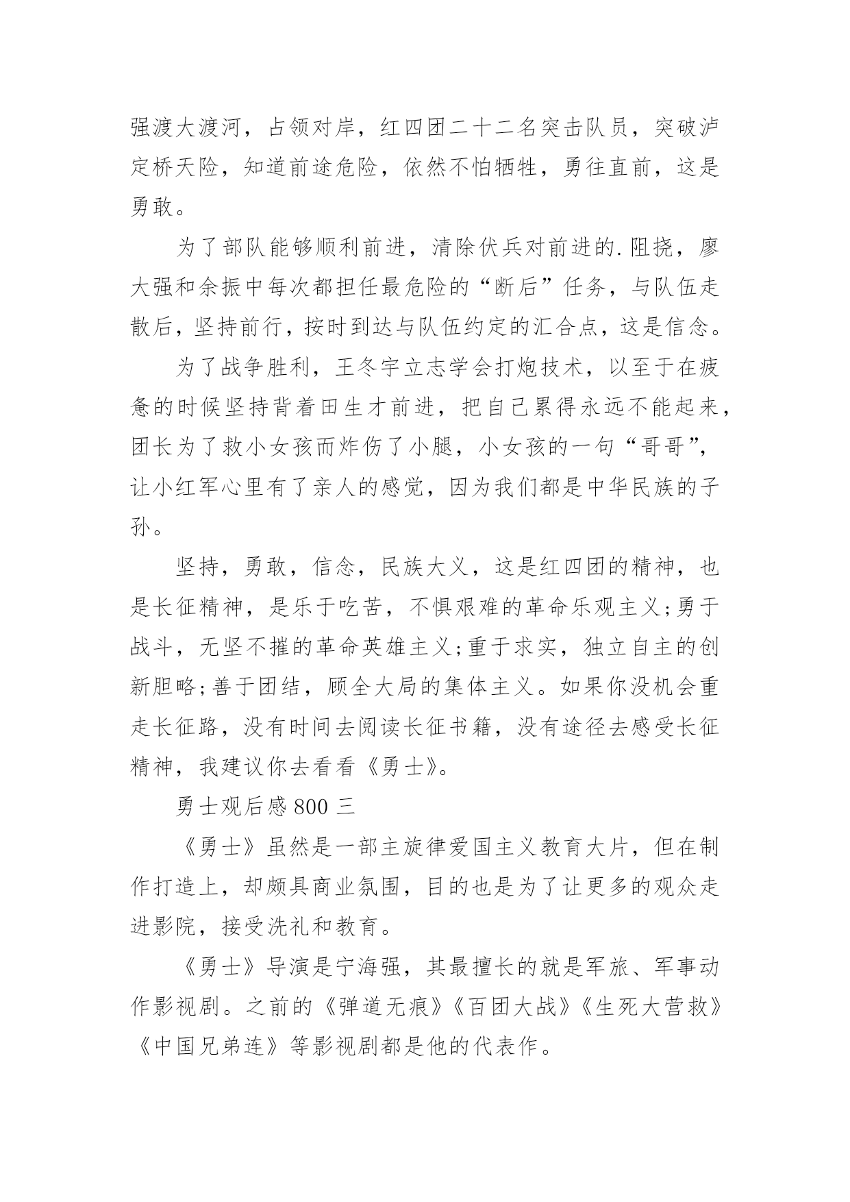勇士观后感800电影《勇士》再现了红军长征途中强渡大渡河、飞夺泸定桥的历史。下面由yjbys小编为大家整理的《勇士》观后感,欢迎大家阅读与借鉴。希望能帮助到大家!勇士观后感800一为引导广大党员进一步弘扬和传承伟大的长征精神和民族精神,10月20日,外国语学院党委组织学院全体教职工党员和党外人士开展长征胜利主题观影活动,集体观看长征主题电影《勇士》,感悟革命先辈不怕牺牲、前赴后继,勇往直前、坚韧不拔,众志成城、团结互助,百折不挠的长征精神。电影《勇士》以中国工农红军长征途中强渡大渡河,飞夺泸定桥的英雄史实为原型,展现了红军将士在敌人的围追堵截中大智大勇,穿越枪林弹雨,以非凡的毅力,不屈的精神,突破天险,以血肉之躯粉碎国民政府的阴谋,谱写了中国革命史上不朽的华章。观影结束后,参加活动的教职工分别在QQ群、微信群等网络平台上进行了热烈讨论,分享自己的观影感受。大家纷纷表示,此次主题活动开展的意义深远,教育深刻,效果明显,整个观看电影的过程是一次心灵洗涤的过程,是一次深刻的革命再教育历程,活动进一步增强了自己对国家民族建设发展的社会责任感和使命感,要在今后的工作中,努力继承和弘扬长征精神,进一步坚定理想信念,努力建功“十三五”,为早日实现伟大复兴的中国梦而努力奋斗。据了解,学院党委还将以此次观影活动为契机,在全院范围内开展主题征文活动,号召全体教职工把观影感受和深刻体会以观后感的形式总结出来,院党委将从中评选出优秀作品,在支部主题党日活动上开展交流,推动长征胜利80周年纪念活动走向深入。勇士观后感800二这部电影里面有几个主要角色。首先是作为部队主心骨的红四团团长,在关键时刻统一思想,鼓舞人心,率领队友们穿越枪林弹雨的围剿;其次是作为部队智多星的政委,及时准确地做出决策,尽量减少部队损失并完成任务;小红军王冬宇,是最让我感动的,他一心为了战争胜利,最后为了学习到打炮技术,牺牲生命;第四个人物是狙击手廖大强和余振中,他们在任何危险时刻都是做最危险的“断后”工作;第五个人物是从为了钱财成为国民政府炮兵到愿意投入不给发福利的田生才,第六个是那对因为战争而成为没有血缘关系的兄妹。这些人物,出身不同,官职不同,却互相关心,平等对待,因为他们心中都有恨意,因为心中都有理想。他们恨帝国主义侵略了中华大地,恨战争让他们颠沛流离,恨不断有人阻碍祖国统一路线,恨自己不能保护亲人。带着这股恨和对战争胜利的决心,为了按时到达泸定桥西岸,他们在崎岖的上路上跑步前进,粮食带也成了他们前进的负担而不得不扔掉,昼夜兼程奔袭240里,这是坚持。红军利用敌人留下的破船,穿越枪林弹雨的生死关口,强渡大渡河,占领对岸,红四团二十二名突击队员,突破泸定桥天险,知道前途危险,依然不怕牺牲,勇往直前,这是勇敢。为了部队能够顺利前进,清除伏兵对前进的.阻挠,廖大强和余振中每次都担任最危险的“断后”任务,与队伍走散后,坚持前行,按时到达与队伍约定的汇合点,这是信念。为了战争胜利,王冬宇立志学会打炮技术,以至于在疲惫的时候坚持背着田生才前进,把自己累得永远不能起来,团长为了救小女孩而炸伤了小腿,小女孩的一句“哥哥”,让小红军心里有了亲人的感觉,因为我们都是中华民族的子孙。坚持,勇敢,信念,民族大义,这是红四团的精神,也是长征精神,是乐于吃苦,不惧艰难的革命乐观主义;勇于战斗,无坚不摧的革命英雄主义;重于求实,独立自主的创新胆略;善于团结,顾全大局的集体主义。如果你没机会重走长征路,没有时间去阅读长征书籍,没有途径去感受长征精神,我建议你去看看《勇士》。勇士观后感800三《勇士》虽然是一部主旋律爱国主义教育大片,但在制作打造上,却颇具商业氛围,目的也是为了让更多的观众走进影院,接受洗礼和教育。《勇士》导演是宁海强,其最擅长的就是军旅、军事动作影视剧。之前的《弹道无痕》《百团大战》《生死大营救》《中国兄弟连》等影视剧都是他的代表作。重温悲壮历史,再燃沸腾热血编剧赵冬苓、赵宁宇也来头不小。主要作品有人所共知的《红高粱》《孔繁森》《赵氏孤儿》等。《勇士》的枪炮、武器、爆炸、动作戏份,在内地战争动作大片中,可谓打出了新高度,这离自然离不开动作指导罗礼贤的功劳。喜欢看动作片的观众,对罗礼贤一定不会陌生。早到吴宇森的《喋血双雄》《喋血街头》,再到成龙的《霹雳火》《超级警察》,再到张艺谋的《金陵十三钗》,以及甄子丹的《特殊身份》,他的动作设计、飞车设计都给观众留下了深刻的印象,成为影片火爆的关键因子之一。至于演员阵容,聂远、于小伟、李东学,包括宋佳伦等,都是一等一的硬汉型男。相比那些花样美男,鲜肉男神,他们不仅有颜值,更硬朗十足,阳刚百分。影片中,他们化身敢死队队员,冲锋陷阵,临危不乱,上演了一幕幕生死大鏖战。勇士观后感800四为弘扬伟大长征精神,材料科学与工程学院举办了由学院党委主办,学院研究