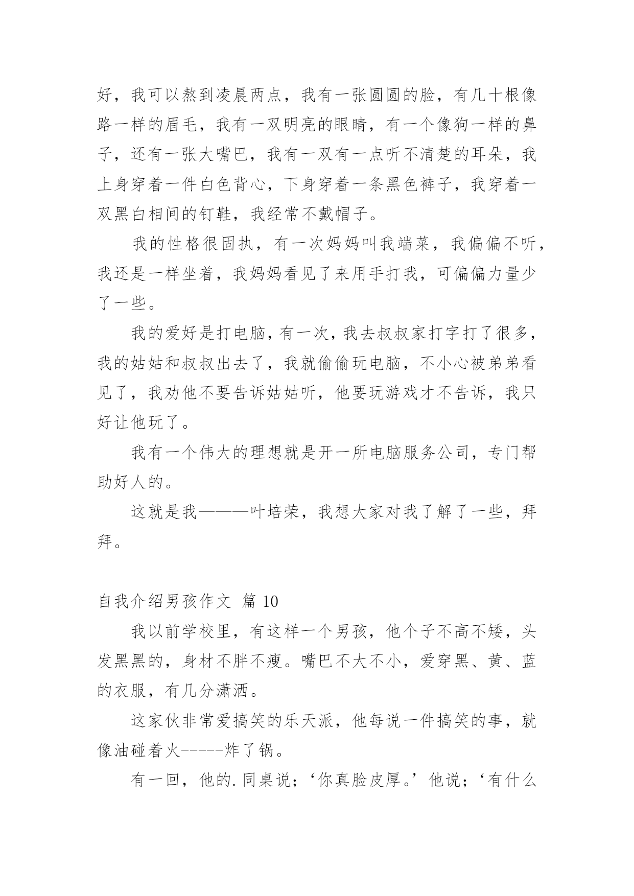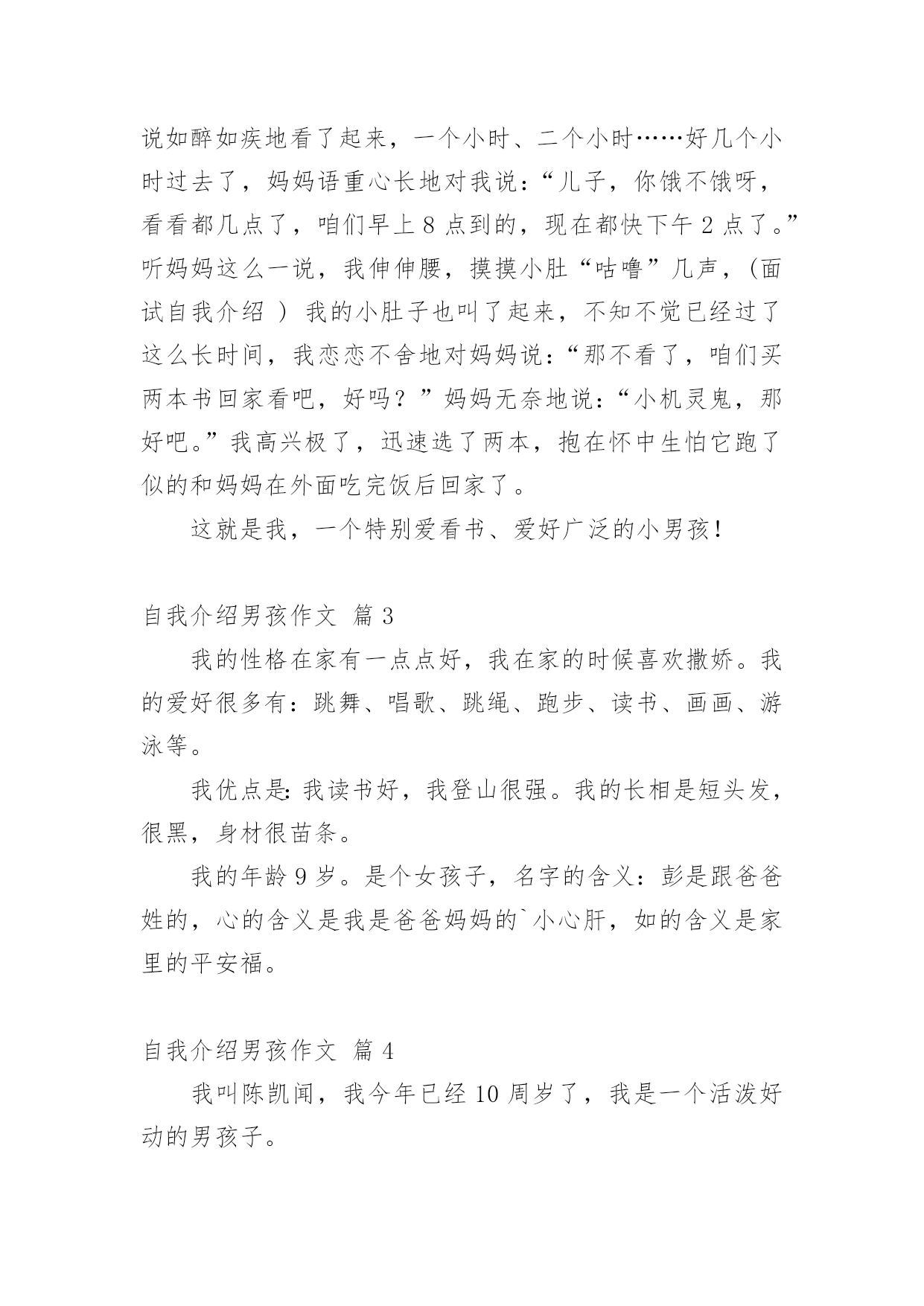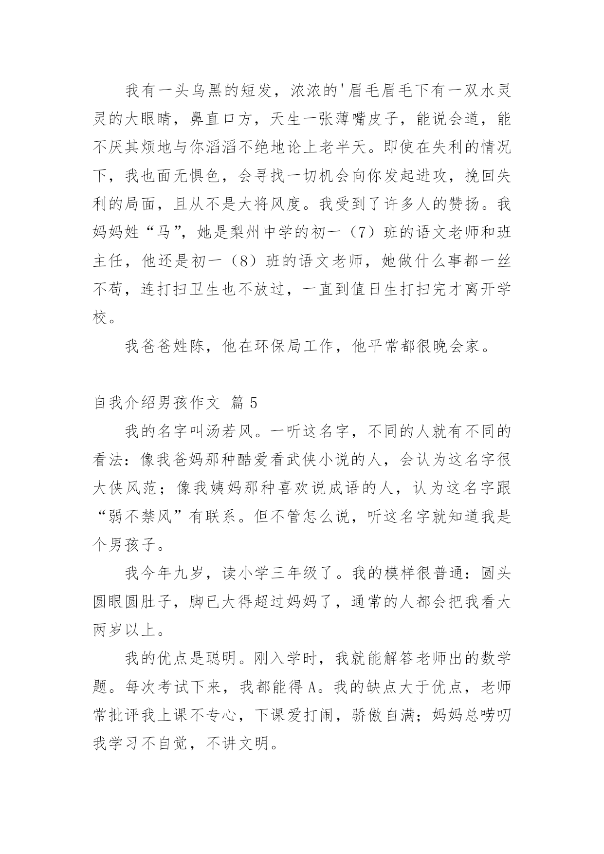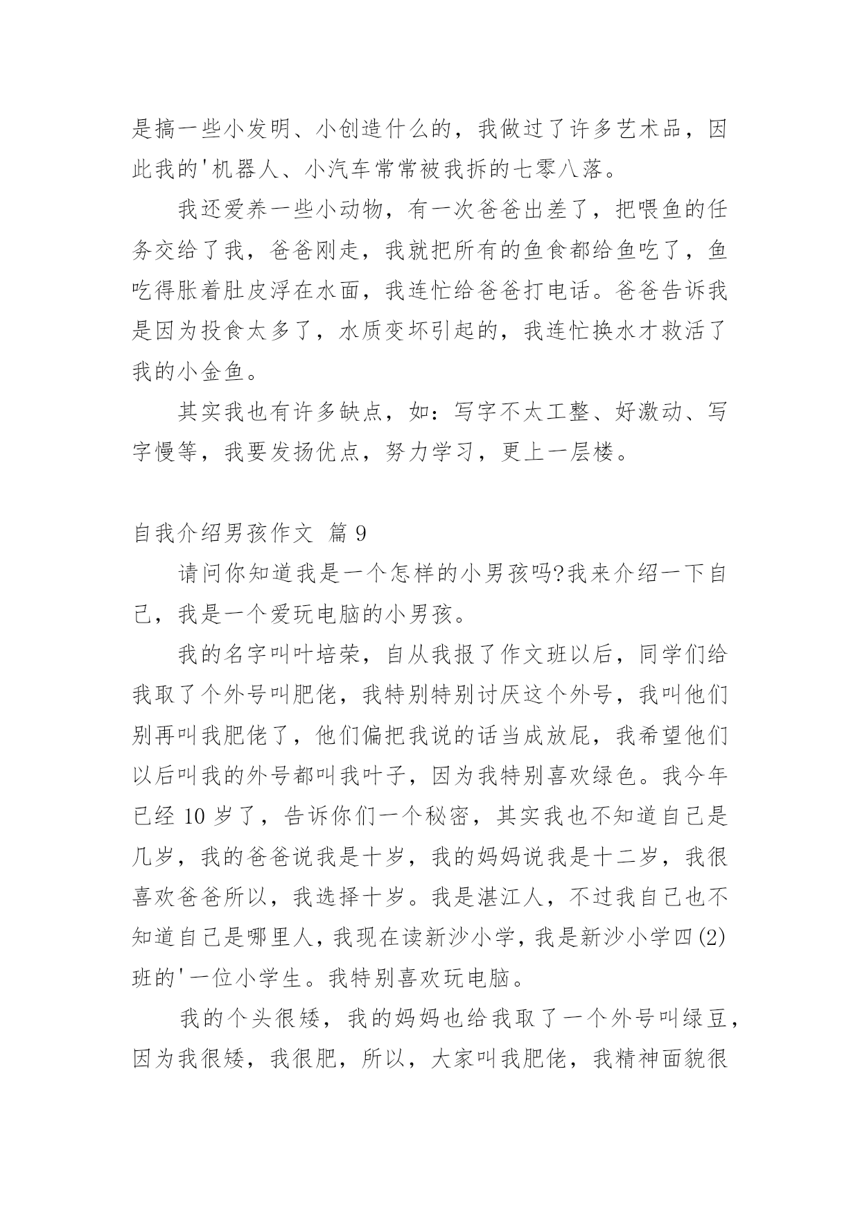 自我介绍男孩作文有关自我介绍男孩作文十篇无论是身处学校还是步入社会,大家都尝试过写作文吧,写作文是培养人们的观察力、联想力、想象力、思考力和记忆力的重要手段。那要怎么写好作文呢?下面是小编整理的自我介绍男孩作文10篇,欢迎大家分享。自我介绍男孩作文篇1我姓x,名xx,顾名思义我的名字就是渊博广大四通八达之意,是我妈妈给我取的名字,好听吧!我今年9岁,是xx街三年级的学生。大家一定还不熟悉我吧,那我就介绍一个自己吧!我的模样没什么特殊,就是个子不太高。一头乌黑的`头发,一张稚气的瓜子脸,有一双明亮的眼睛,秀气的小嘴,穿着细细的裤子,一个十足的小帅哥。在学校里,是个积极发言,学习认真,受老师表扬的好学生;而在家里却像调皮的小猴子。我的爱好是:一是喜欢学习,特别是数学;二是好画画;三是练书法。我最大的优点就是刻苦努力,上学的路上,妈妈总是给我出二十道计算题考我,要算不出来决不罢休,而且我每天都练口算,一定坚持到成功。学习滑冰的时候,我从不怕摔倒,摔倒了再爬起来,继续练习,靠着这种毅力,最后我成了一个滑冰高手。我的优点虽然很可贵,但是我也有缺点。我的缺点是慢,不改掉这年毛病,永远没有出息。上学走的非常慢,总是让妈妈催,吃饭的时候也让妈妈催……这就是我,你们喜欢我吗?喜欢就说出来。自我介绍男孩作文篇2我的名字叫韦智凡,听妈妈说:“我原本有两个名字,一个叫韦智凡,另一个韦博大。当我呱呱落地的时候,妈妈便打我给我起了韦博大这个名字,寓意我将来会成为一个博学多才的孩子。可是当妈妈早上上班把这个名字说给她们同事时,我的名字被妈妈的同事叫成了‘尾巴大’,妈妈心想:这可不行,将来会有人取笑我儿子的,于是我的名字就变成了韦智凡,它代表着智慧超凡的意思。”从此,我的名字就这样诞生了。我是一个性格开朗、爱好广泛的小男孩,滑旱冰、读书、打羽毛球、乒乓球、篮球、玩电脑等都是我的爱好。但是,我最大的爱好还是读书。记得今年“六一儿童节”那天早上,妈妈笑盈盈的对我说:“儿子,你还有一个儿童节了,小学生活就结束了,今年六一儿童节妈妈带你出去好好玩一玩好不好?”听妈妈这么说,我也毫不犹豫地对妈妈说:“妈妈,那咱们去书店看书吧!”于是我和妈妈来到了重庆路书店,我来到收就就急急忙忙地上来三楼,拿起一本我最喜欢看的'科幻类儿童小说如醉如疾地看了起来,一个小时、二个小时……好几个小时过去了,妈妈语重心长地对我说:“儿子,你饿不饿呀,看看都几点了,咱们早上8点到的,现在都快下午2点了。”听妈妈这么一说,我伸伸腰,摸摸小肚“咕噜”几声,(面试自我介绍)我的小肚子也叫了起来,不知不觉已经过了这么长时间,我恋恋不舍地对妈妈说:“那不看了,咱们买两本书回家看吧,好吗?”妈妈无奈地说:“小机灵鬼,那好吧。”我高兴极了,迅速选了两本,抱在怀中生怕它跑了似的和妈妈在外面吃完饭后回家了。这就是我,一个特别爱看书、爱好广泛的小男孩!自我介绍男孩作文篇3我的性格在家有一点点好,我在家的时候喜欢撒娇。我的爱好很多有:跳舞、唱歌、跳绳、跑步、读书、画画、游泳等。我优点是:我读书好,我登山很强。我的长相是短头发,很黑,身材很苗条。我的年龄9岁。是个女孩子,名字的含义:彭是跟爸爸姓的,心的含义是我是爸爸妈妈的`小心肝,如的含义是家里的平安福。自我介绍男孩作文篇4我叫陈凯闻,我今年已经10周岁了,我是一个活泼好动的男孩子。我有一头乌黑的短发,浓浓的'眉毛眉毛下有一双水灵灵的大眼睛,鼻直口方,天生一张薄嘴皮子,能说会道,能不厌其烦地与你滔滔不绝地论上老半天。即使在失利的情况下,我也面无惧色,会寻找一切机会向你发起进攻,挽回失利的局面,且从不是大将风度。我受到了许多人的赞扬。我妈妈姓“马”,她是梨州中学的初一(7)班的语文老师和班主任,他还是初一(8)班的语文老师,她做什么事都一丝不苟,连打扫卫生也不放过,一直到值日生打扫完才离开学校。我爸爸姓陈,他在环保局工作,他平常都很晚会家。自我介绍男孩作文篇5我的名字叫汤若风。一听这名字,不同的人就有不同的看法:像我爸妈那种酷爱看武侠小说的人,会认为这名字很大侠风范;像我姨妈那种喜欢说成语的人,认为这名字跟“弱不禁风”有联系。但不管怎么说,听这名字就知道我是个男孩子。我今年九岁,读小学三年级了。我的模样很普通:圆头圆眼圆肚子,脚已大得超过妈妈了,通常的人都会把我看大两岁以上。我的优点是聪明。刚入学时,我就能解答老师出的数学题。每次考试下来,我都能得A。我的缺点大于优点,老师常批评我上课不专心,下课爱打闹,骄傲自满;妈妈总唠叨我学习不自觉,不讲文明。我的爱好众多,男孩子喜欢的玩电脑、踢球、打架??我一个不落下。这就是我,一个独特的男孩子。我有信心早日改正自己的缺点,光大自己的优点,做一个超人!点评:这篇习作的开头从名字写起,点出不同的'人对名字的不同看法。小作者没有具