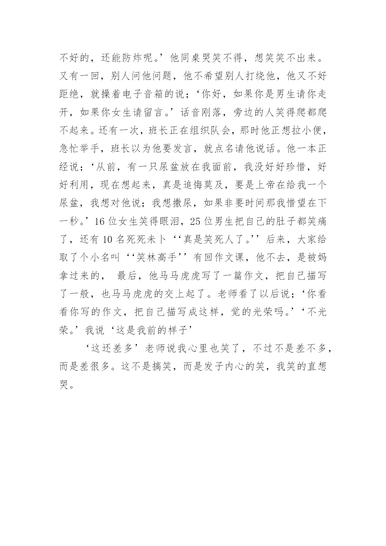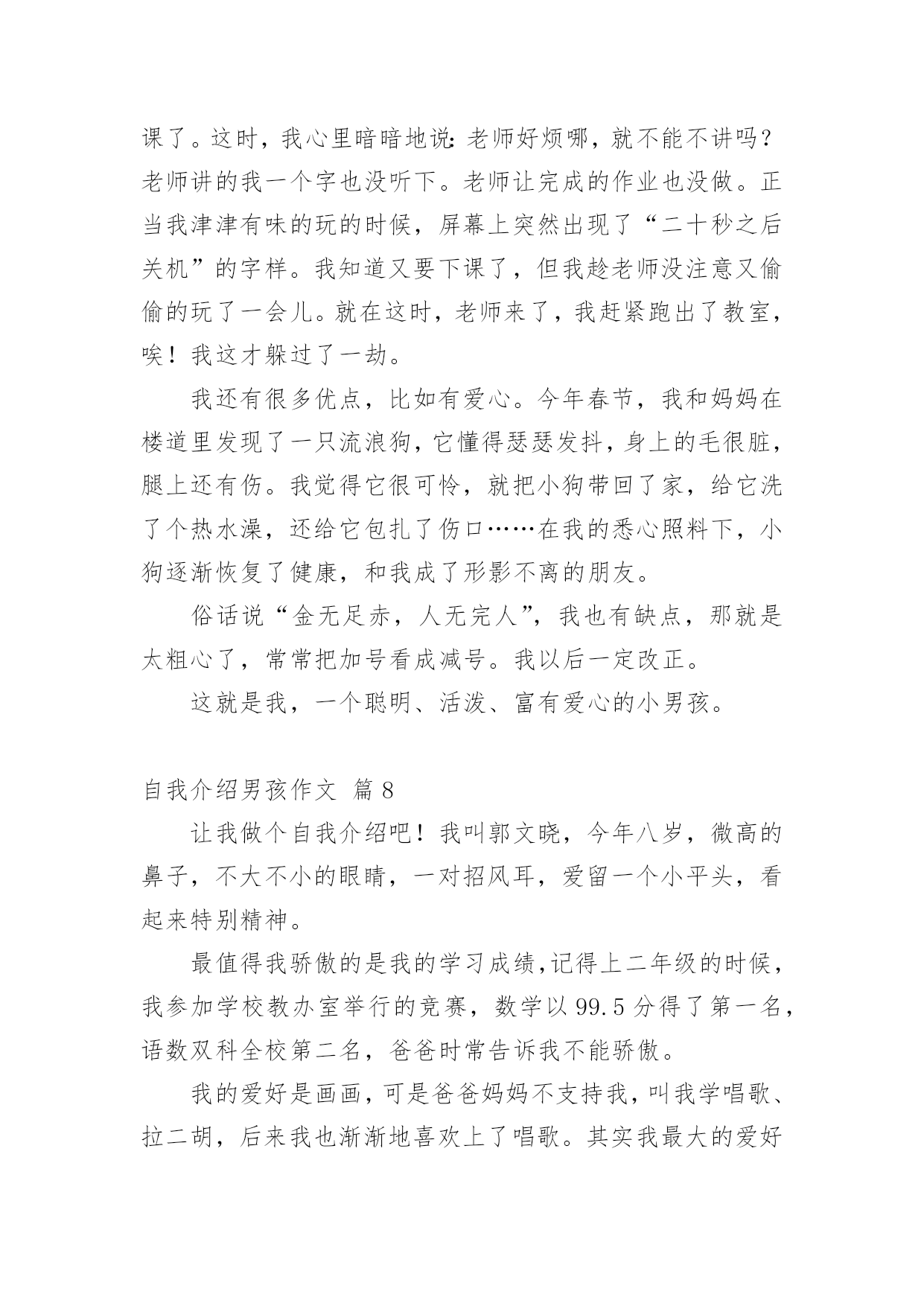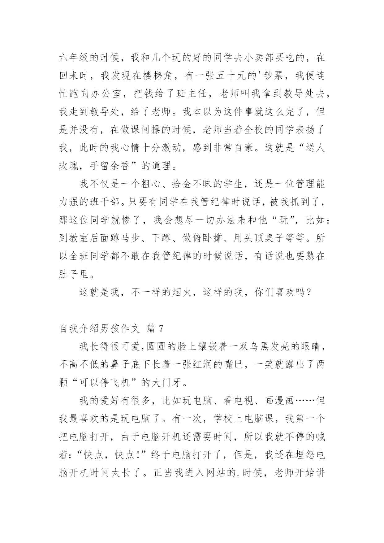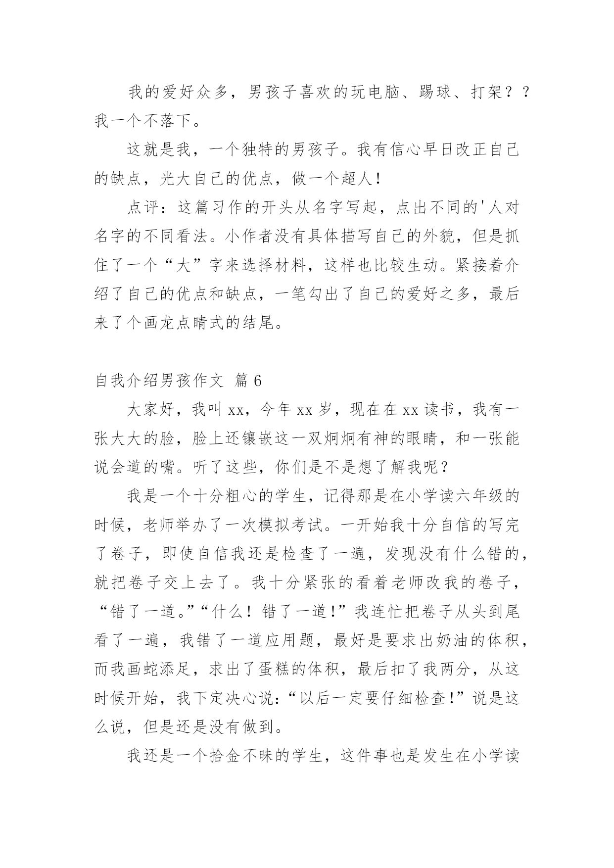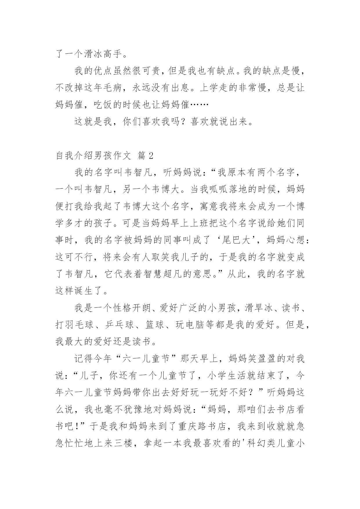自我介绍男孩作文有关自我介绍男孩作文十篇无论是身处学校还是步入社会,大家都尝试过写作文吧,写作文是培养人们的观察力、联想力、想象力、思考力和记忆力的重要手段。那要怎么写好作文呢?下面是小编整理的自我介绍男孩作文10篇,欢迎大家分享。自我介绍男孩作文篇1我姓x,名xx,顾名思义我的名字就是渊博广大四通八达之意,是我妈妈给我取的名字,好听吧!我今年9岁,是xx街三年级的学生。大家一定还不熟悉我吧,那我就介绍一个自己吧!我的模样没什么特殊,就是个子不太高。一头乌黑的`头发,一张稚气的瓜子脸,有一双明亮的眼睛,秀气的小嘴,穿着细细的裤子,一个十足的小帅哥。在学校里,是个积极发言,学习认真,受老师表扬的好学生;而在家里却像调皮的小猴子。我的爱好是:一是喜欢学习,特别是数学;二是好画画;三是练书法。我最大的优点就是刻苦努力,上学的路上,妈妈总是给我出二十道计算题考我,要算不出来决不罢休,而且我每天都练口算,一定坚持到成功。学习滑冰的时候,我从不怕摔倒,摔倒了再爬起来,继续练习,靠着这种毅力,最后我成了一个滑冰高手。我的优点虽然很可贵,但是我也有缺点。我的缺点是慢,不改掉这年毛病,永远没有出息。上学走的非常慢,总是让妈妈催,吃饭的时候也让妈妈催……这就是我,你们喜欢我吗?喜欢就说出来。自我介绍男孩作文篇2我的名字叫韦智凡,听妈妈说:“我原本有两个名字,一个叫韦智凡,另一个韦博大。当我呱呱落地的时候,妈妈便打我给我起了韦博大这个名字,寓意我将来会成为一个博学多才的孩子。可是当妈妈早上上班把这个名字说给她们同事时,我的名字被妈妈的同事叫成了‘尾巴大’,妈妈心想:这可不行,将来会有人取笑我儿子的,于是我的名字就变成了韦智凡,它代表着智慧超凡的意思。”从此,我的名字就这样诞生了。我是一个性格开朗、爱好广泛的小男孩,滑旱冰、读书、打羽毛球、乒乓球、篮球、玩电脑等都是我的爱好。但是,我最大的爱好还是读书。记得今年“六一儿童节”那天早上,妈妈笑盈盈的对我说:“儿子,你还有一个儿童节了,小学生活就结束了,今年六一儿童节妈妈带你出去好好玩一玩好不好?”听妈妈这么说,我也毫不犹豫地对妈妈说:“妈妈,那咱们去书店看书吧!”于是我和妈妈来到了重庆路书店,我来到收就就急急忙忙地上来三楼,拿起一本我最喜欢看的'科幻类儿童小说如醉如疾地看了起来,一个小时、二个小时……好几个小时过去了,妈妈语重心长地对我说:“儿子,你饿不饿呀,看看都几点了,咱们早上8点到的,现在都快下午2点了。”听妈妈这么一说,我伸伸腰,摸摸小肚“咕噜”几声,(面试自我介绍)我的小肚子也叫了起来,不知不觉已经过了这么长时间,我恋恋不舍地对妈妈说:“那不看了,咱们买两本书回家看吧,好吗?”妈妈无奈地说:“小机灵鬼,那好吧。”我高兴极了,迅速选了两本,抱在怀中生怕它跑了似的和妈妈在外面吃完饭后回家了。这就是我,一个特别爱看书、爱好广泛的小男孩!自我介绍男孩作文篇3我的性格在家有一点点好,我在家的时候喜欢撒娇。我的爱好很多有:跳舞、唱歌、跳绳、跑步、读书、画画、游泳等。我优点是:我读书好,我登山很强。我的长相是短头发,很黑,身材很苗条。我的年龄9岁。是个女孩子,名字的含义:彭是跟爸爸姓的,心的含义是我是爸爸妈妈的`小心肝,如的含义是家里的平安福。自我介绍男孩作文篇4我叫陈凯闻,我今年已经10周岁了,我是一个活泼好动的男孩子。我有一头乌黑的短发,浓浓的'眉毛眉毛下有一双水灵灵的大眼睛,鼻直口方,天生一张薄嘴皮子,能说会道,能不厌其烦地与你滔滔不绝地论上老半天。即使在失利的情况下,我也面无惧色,会寻找一切机会向你发起进攻,挽回失利的局面,且从不是大将风度。我受到了许多人的赞扬。我妈妈姓“马”,她是梨州中学的初一(7)班的语文老师和班主任,他还是初一(8)班的语文老师,她做什么事都一丝不苟,连打扫卫生也不放过,一直到值日生打扫完才离开学校。我爸爸姓陈,他在环保局工作,他平常都很晚会家。自我介绍男孩作文篇5我的名字叫汤若风。一听这名字,不同的人就有不同的看法:像我爸妈那种酷爱看武侠小说的人,会认为这名字很大侠风范;像我姨妈那种喜欢说成语的人,认为这名字跟“弱不禁风”有联系。但不管怎么说,听这名字就知道我是个男孩子。我今年九岁,读小学三年级了。我的模样很普通:圆头圆眼圆肚子,脚已大得超过妈妈了,通常的人都会把我看大两岁以上。我的优点是聪明。刚入学时,我就能解答老师出的数学题。每次考试下来,我都能得A。我的缺点大于优点,老师常批评我上课不专心,下课爱打闹,骄傲自满;妈妈总唠叨我学习不自觉,不讲文明。我的爱好众多,男孩子喜欢的玩电脑、踢球、打架??我一个不落下。这就是我,一个独特的男孩子。我有信心早日改正自己的缺点,光大自己的优点,做一个超人!点评:这篇习作的开头从名字写起,点出不同的'人对名字的不同看法。小作者没有具