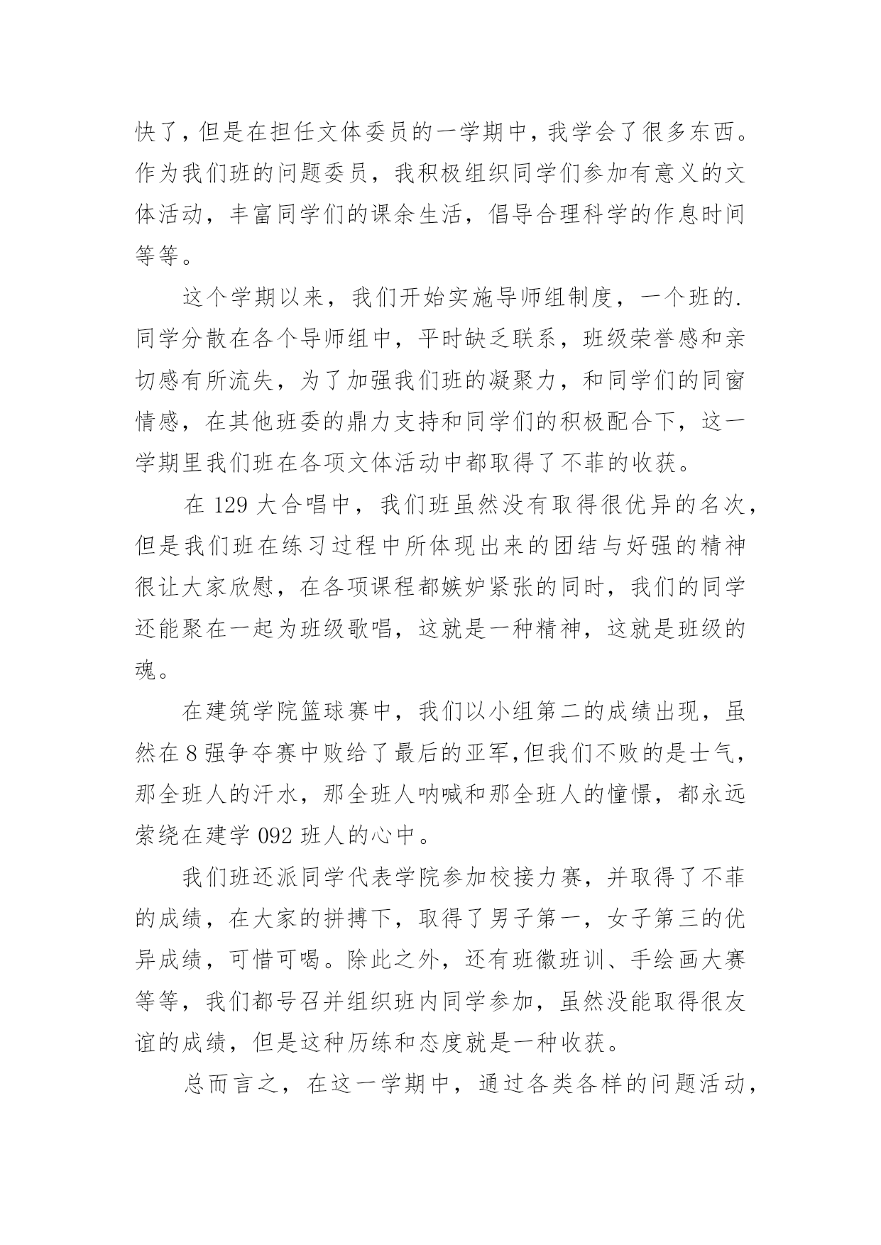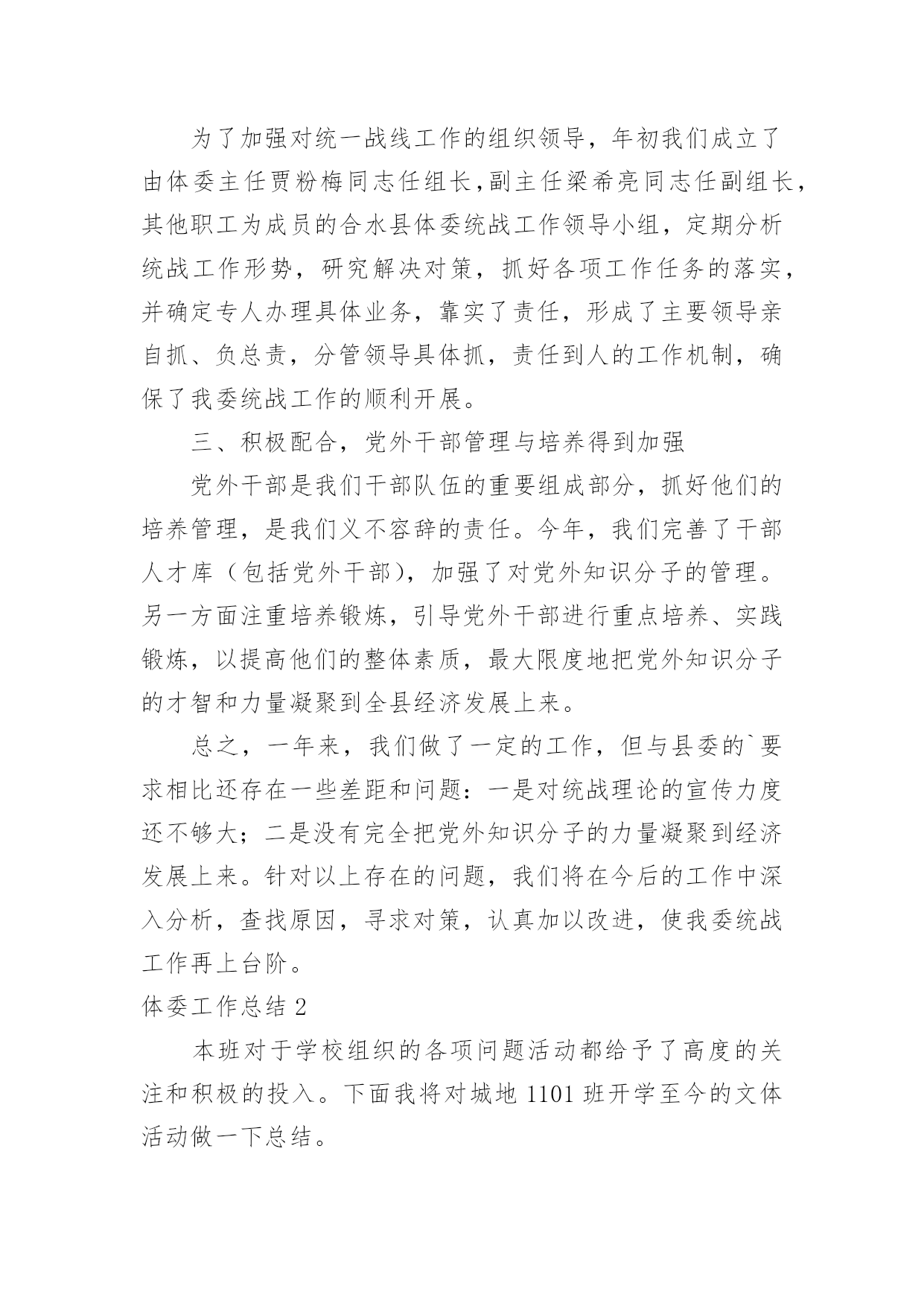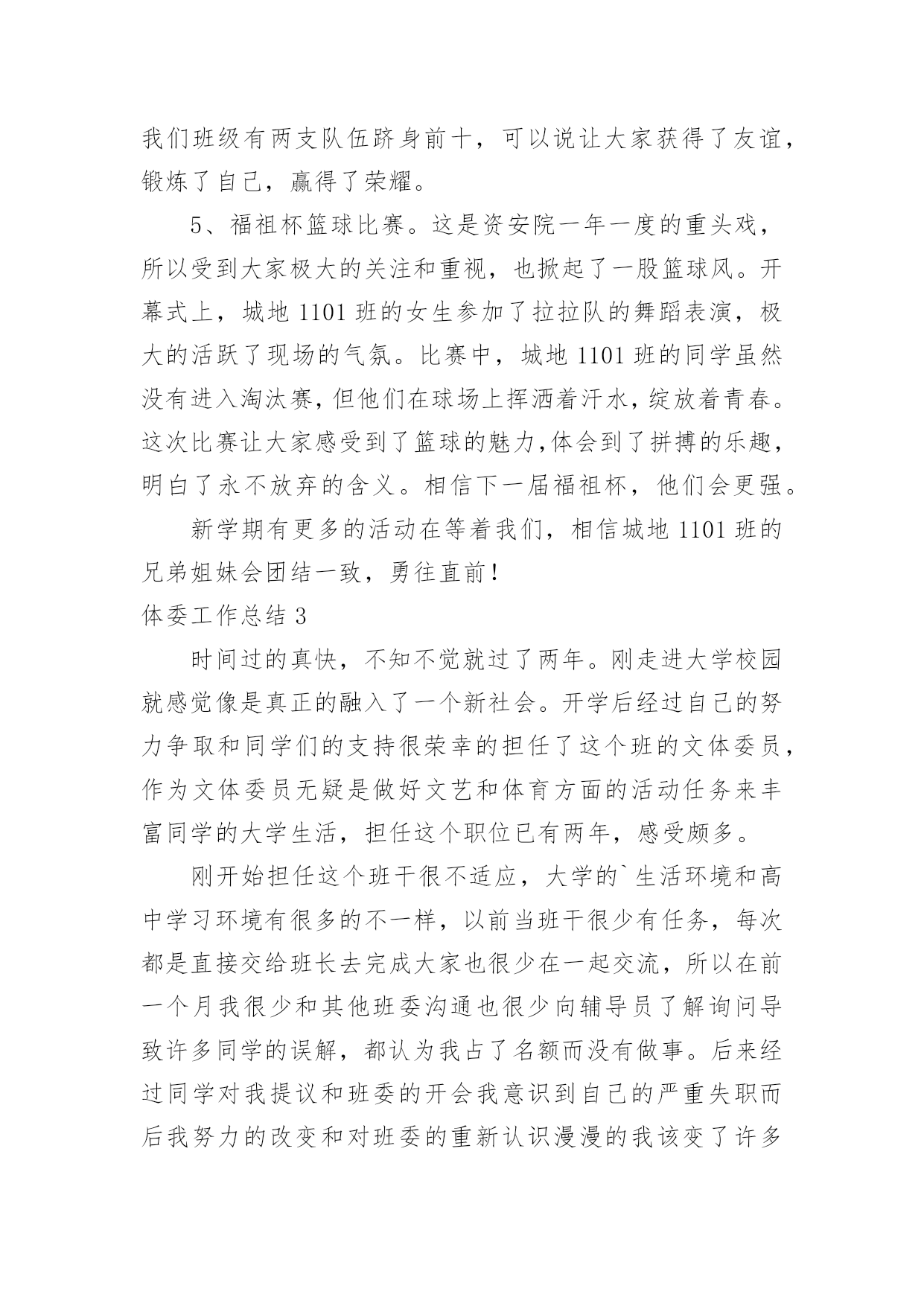体委工作总结体委工作总结总结是对取得的成绩、存在的问题及得到的经验和教训等方面情况进行评价与描述的一种书面材料,它可以给我们下一阶段的学习和工作生活做指导,让我们抽出时间写写总结吧。你所见过的总结应该是什么样的?下面是小编收集整理的体委工作总结,欢迎大家分享。体委工作总结120xx年,我委统战工作在县委的正确领导下,在县委统战部的具体指导下,按照全县统战工作的总体部署和要求,我们紧密结合体育工作实际,精心组织、周密部署、狠抓落实,较好地完成了各项工作任务。现总结如下:一、认真学习,政策知晓率不断提高以“争先创优”主题活动为契机,把统战理论政策的学习作为一项政治任务来抓。充分利用每周二的集体学习时间,集中学习统战理论政策方针,紧密联系体育工作实际和思想实际开展学习,真正做到为加快发展大局服务,为团结稳定鼓劲。据统计,集体学习统战有关文件精神12次,观看光碟6次,记学习笔记2万字。通过深入学习,使全体干部职工对统战政策和知识有一定了解,提高了认识,进一步增强了做好统战工作的自觉性。二、加强领导,工作责任进一步明确为了加强对统一战线工作的组织领导,年初我们成立了由体委主任贾粉梅同志任组长,副主任梁希亮同志任副组长,其他职工为成员的合水县体委统战工作领导小组,定期分析统战工作形势,研究解决对策,抓好各项工作任务的落实,并确定专人办理具体业务,靠实了责任,形成了主要领导亲自抓、负总责,分管领导具体抓,责任到人的工作机制,确保了我委统战工作的顺利开展。三、积极配合,党外干部管理与培养得到加强党外干部是我们干部队伍的重要组成部分,抓好他们的培养管理,是我们义不容辞的责任。今年,我们完善了干部人才库(包括党外干部),加强了对党外知识分子的管理。另一方面注重培养锻炼,引导党外干部进行重点培养、实践锻炼,以提高他们的整体素质,最大限度地把党外知识分子的才智和力量凝聚到全县经济发展上来。总之,一年来,我们做了一定的工作,但与县委的`要求相比还存在一些差距和问题:一是对统战理论的宣传力度还不够大;二是没有完全把党外知识分子的力量凝聚到经济发展上来。针对以上存在的问题,我们将在今后的工作中深入分析,查找原因,寻求对策,认真加以改进,使我委统战工作再上台阶。体委工作总结2本班对于学校组织的各项问题活动都给予了高度的关注和积极的投入。下面我将对城地1101班开学至今的文体活动做一下总结。1.在开学的军训中,城地1101班表现出了强大的凝聚力,展示出了蓬勃的朝气与活力。班上同学除了个别同学有伤病外,全部参与其中,他们克服了炎热的天气的考验,用汗水铸就出了军人的铮铮铁骨。城地1101班的同学们很好的完成了大学的第一课,通过军训,大家也对彼此有了相互的了解,为今后同学间的交往打下了基础。2、在学校举办的一年一度的运动会上,城地1101班所有的同学都有参赛项目。运动会上,男生们全部加入了入场方阵,女生们参与了海报和横幅的制作。这次活动增强了我们的凝聚力,也展示了大家在运动场上的风采。运动员矫健的步伐和幕后的准备工作体现出了大家的体育天赋以及艺术灵感。跳绳,接力等集体项目也让大家变得更加团结一致。这是入学以来第一个大型活动,锻炼了大家的能力,也让同学们懂得了要为城地1101班的集体荣耀而奋斗。3、在红小鬼漫画征集活动中。虽然大部分同学都没有学过绘画,但是大家交上来的作品无论是数量还是质量都堪称完美,震惊了别人,也震惊了自己。一些优秀的作品更是受到了文艺部的青睐。这一次活动极大的增强了大家的`自信心,相信以后碰见的那些看似不可能完成的任务在大家的努力下也会被轻松解决。4、在资安院与文学院举办的越野比赛中,我们班级以热情饱满的态度投入其中,男生报名人数过半,女生全部参加。虽然是随机分组,但是面对原本不熟悉的同学,城地1101班的各位同学还是能团结在一起,向着终点前进。这次比赛我们班级有两支队伍跻身前十,可以说让大家获得了友谊,锻炼了自己,赢得了荣耀。5、福祖杯篮球比赛。这是资安院一年一度的重头戏,所以受到大家极大的关注和重视,也掀起了一股篮球风。开幕式上,城地1101班的女生参加了拉拉队的舞蹈表演,极大的活跃了现场的气氛。比赛中,城地1101班的同学虽然没有进入淘汰赛,但他们在球场上挥洒着汗水,绽放着青春。这次比赛让大家感受到了篮球的魅力,体会到了拼搏的乐趣,明白了永不放弃的含义。相信下一届福祖杯,他们会更强。新学期有更多的活动在等着我们,相信城地1101班的兄弟姐妹会团结一致,勇往直前!体委工作总结3时间过的真快,不知不觉就过了两年。刚走进大学校园就感觉像是真正的融入了一个新社会。开学后经过自己的努力争取和同学们的支持很荣幸的担任了这个班的文体委员,作为文体委员无疑是做好文艺和体育方面的活动任务来丰富同学的大学生活,担任这个职位已有两年,感受颇多。刚开始担任这个班