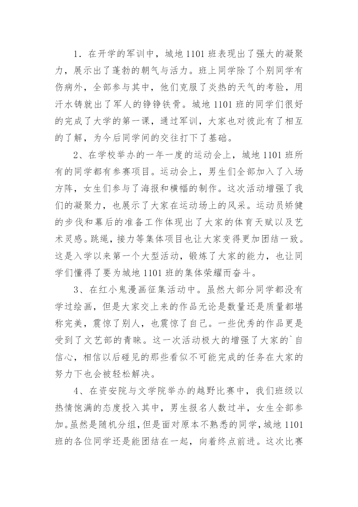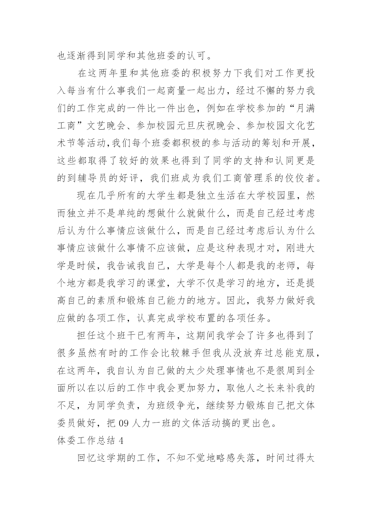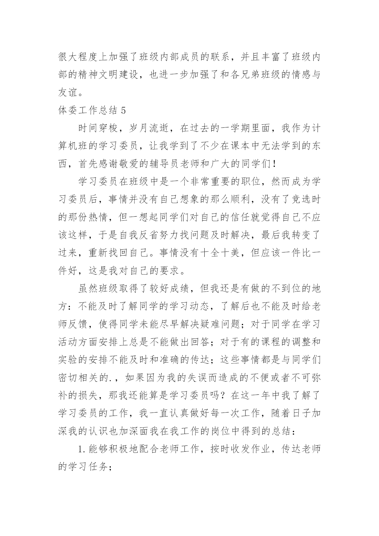 体委工作总结体委工作总结总结是对取得的成绩、存在的问题及得到的经验和教训等方面情况进行评价与描述的一种书面材料,它可以给我们下一阶段的学习和工作生活做指导,让我们抽出时间写写总结吧。你所见过的总结应该是什么样的?下面是小编收集整理的体委工作总结,欢迎大家分享。体委工作总结120xx年,我委统战工作在县委的正确领导下,在县委统战部的具体指导下,按照全县统战工作的总体部署和要求,我们紧密结合体育工作实际,精心组织、周密部署、狠抓落实,较好地完成了各项工作任务。现总结如下:一、认真学习,政策知晓率不断提高以“争先创优”主题活动为契机,把统战理论政策的学习作为一项政治任务来抓。充分利用每周二的集体学习时间,集中学习统战理论政策方针,紧密联系体育工作实际和思想实际开展学习,真正做到为加快发展大局服务,为团结稳定鼓劲。据统计,集体学习统战有关文件精神12次,观看光碟6次,记学习笔记2万字。通过深入学习,使全体干部职工对统战政策和知识有一定了解,提高了认识,进一步增强了做好统战工作的自觉性。二、加强领导,工作责任进一步明确为了加强对统一战线工作的组织领导,年初我们成立了由体委主任贾粉梅同志任组长,副主任梁希亮同志任副组长,其他职工为成员的合水县体委统战工作领导小组,定期分析统战工作形势,研究解决对策,抓好各项工作任务的落实,并确定专人办理具体业务,靠实了责任,形成了主要领导亲自抓、负总责,分管领导具体抓,责任到人的工作机制,确保了我委统战工作的顺利开展。三、积极配合,党外干部管理与培养得到加强党外干部是我们干部队伍的重要组成部分,抓好他们的培养管理,是我们义不容辞的责任。今年,我们完善了干部人才库(包括党外干部),加强了对党外知识分子的管理。另一方面注重培养锻炼,引导党外干部进行重点培养、实践锻炼,以提高他们的整体素质,最大限度地把党外知识分子的才智和力量凝聚到全县经济发展上来。总之,一年来,我们做了一定的工作,但与县委的`要求相比还存在一些差距和问题:一是对统战理论的宣传力度还不够大;二是没有完全把党外知识分子的力量凝聚到经济发展上来。针对以上存在的问题,我们将在今后的工作中深入分析,查找原因,寻求对策,认真加以改进,使我委统战工作再上台阶。体委工作总结2本班对于学校组织的各项问题活动都给予了高度的关注和积极的投入。下面我将对城地1101班开学至今的文体活动做一下总结。1.在开学的军训中,城地1101班表现出了强大的凝聚力,展示出了蓬勃的朝气与活力。班上同学除了个别同学有伤病外,全部参与其中,他们克服了炎热的天气的考验,用汗水铸就出了军人的铮铮铁骨。城地1101班的同学们很好的完成了大学的第一课,通过军训,大家也对彼此有了相互的了解,为今后同学间的交往打下了基础。2、在学校举办的一年一度的运动会上,城地1101班所有的同学都有参赛项目。运动会上,男生们全部加入了入场方阵,女生们参与了海报和横幅的制作。这次活动增强了我们的凝聚力,也展示了大家在运动场上的风采。运动员矫健的步伐和幕后的准备工作体现出了大家的体育天赋以及艺术灵感。跳绳,接力等集体项目也让大家变得更加团结一致。这是入学以来第一个大型活动,锻炼了大家的能力,也让同学们懂得了要为城地1101班的集体荣耀而奋斗。3、在红小鬼漫画征集活动中。虽然大部分同学都没有学过绘画,但是大家交上来的作品无论是数量还是质量都堪称完美,震惊了别人,也震惊了自己。一些优秀的作品更是受到了文艺部的青睐。这一次活动极大的增强了大家的`自信心,相信以后碰见的那些看似不可能完成的任务在大家的努力下也会被轻松解决。4、在资安院与文学院举办的越野比赛中,我们班级以热情饱满的态度投入其中,男生报名人数过半,女生全部参加。虽然是随机分组,但是面对原本不熟悉的同学,城地1101班的各位同学还是能团结在一起,向着终点前进。这次比赛我们班级有两支队伍跻身前十,可以说让大家获得了友谊,锻炼了自己,赢得了荣耀。5、福祖杯篮球比赛。这是资安院一年一度的重头戏,所以受到大家极大的关注和重视,也掀起了一股篮球风。开幕式上,城地1101班的女生参加了拉拉队的舞蹈表演,极大的活跃了现场的气氛。比赛中,城地1101班的同学虽然没有进入淘汰赛,但他们在球场上挥洒着汗水,绽放着青春。这次比赛让大家感受到了篮球的魅力,体会到了拼搏的乐趣,明白了永不放弃的含义。相信下一届福祖杯,他们会更强。新学期有更多的活动在等着我们,相信城地1101班的兄弟姐妹会团结一致,勇往直前!体委工作总结3时间过的真快,不知不觉就过了两年。刚走进大学校园就感觉像是真正的融入了一个新社会。开学后经过自己的努力争取和同学们的支持很荣幸的担任了这个班的文体委员,作为文体委员无疑是做好文艺和体育方面的活动任务来丰富同学的大学生活,担任这个职位已有两年,感受颇多。刚开始担任这个班