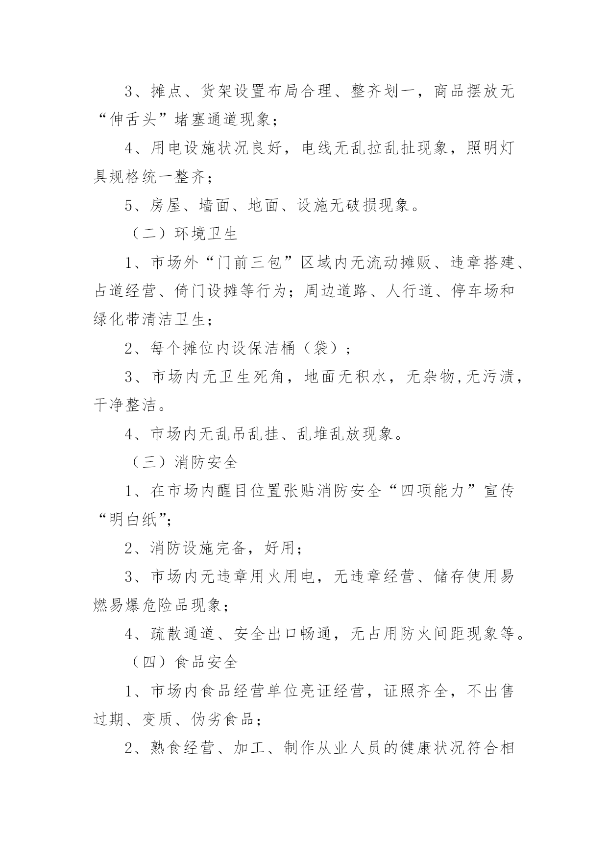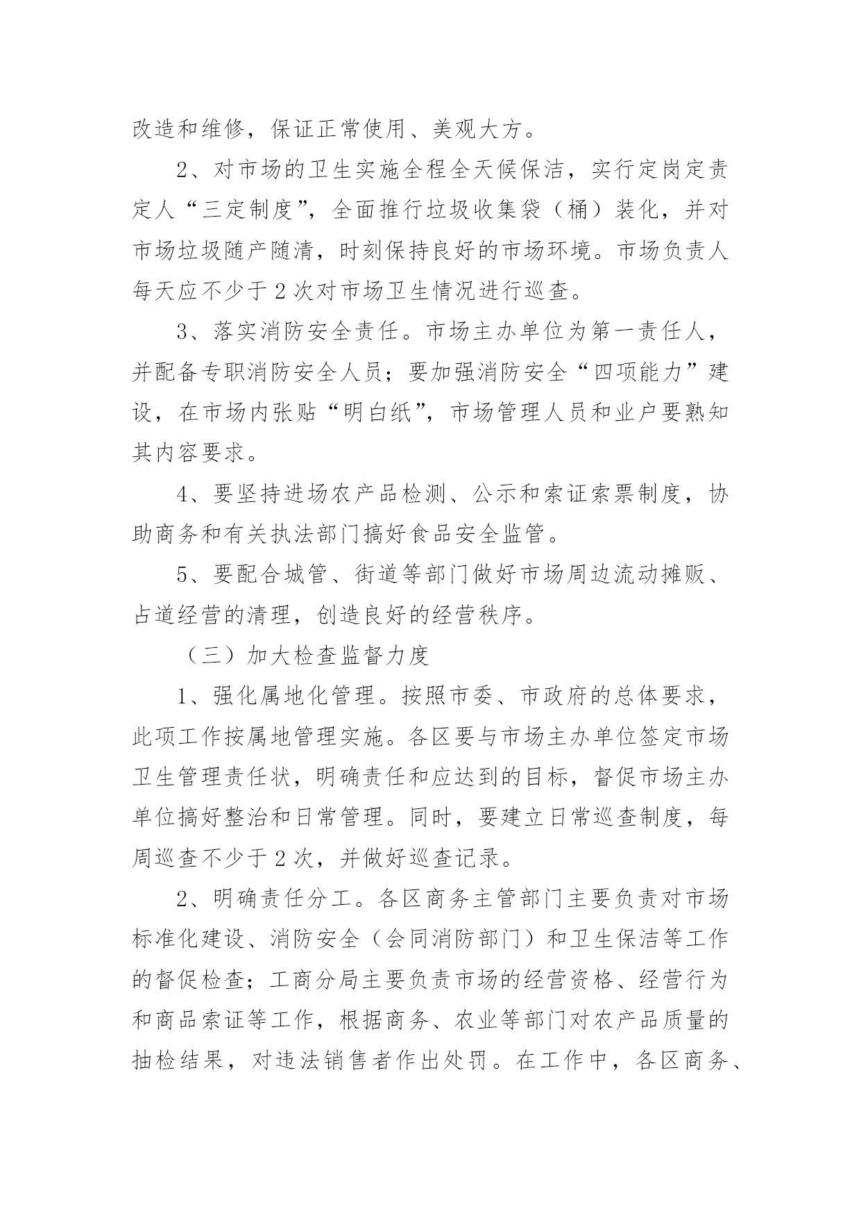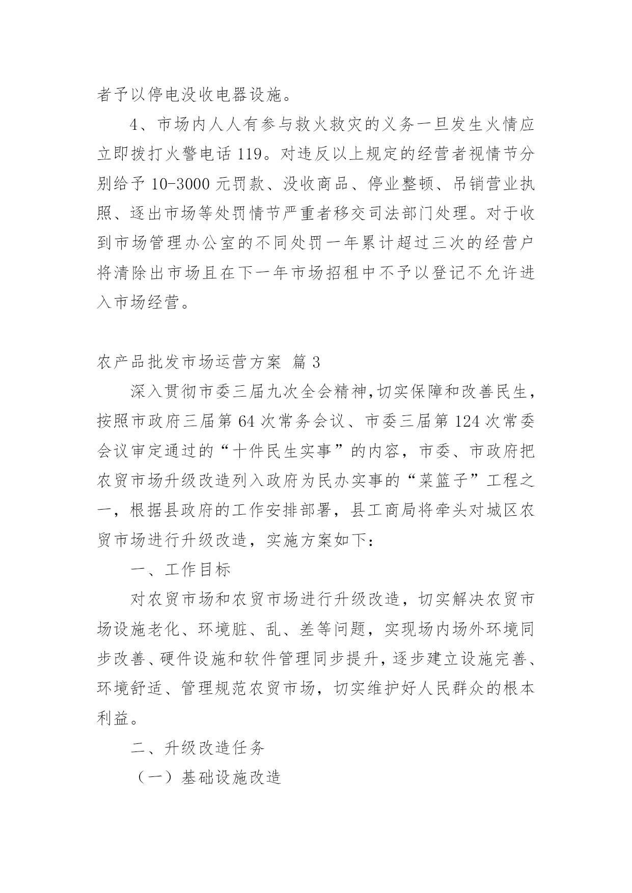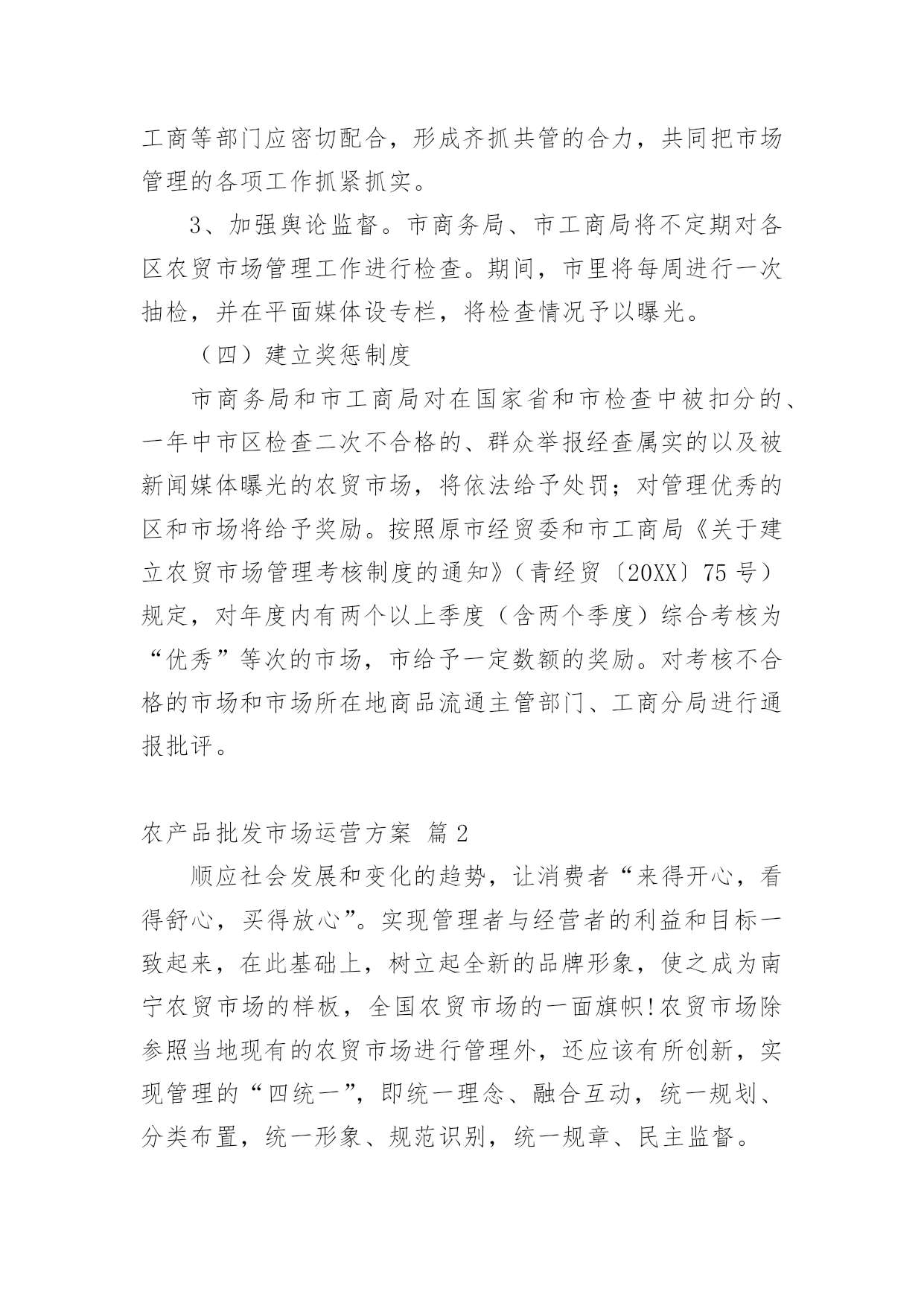 农产品批发市场运营方案农产品批发市场运营方案范文(精选10篇)为了确保事情或工作能无误进行,常常需要提前制定一份优秀的方案,方案是综合考量事情或问题相关的因素后所制定的书面计划。那么问题来了,方案应该怎么写?下面是小编帮大家整理的农产品批发市场运营方案范文,欢迎大家借鉴与参考,希望对大家有所帮助。农产品批发市场运营方案篇1为创建全国文明城市,按照市委市政府关于大干200天,实施市容环境整治的决策部署,大力提升农贸市场建设档次和管理水平,特制定本实施方案。一、目标任务按照创建文明城市的要求,对市区农贸市场的经营设施、环境卫生、消防安全和食品安全进行一次彻底整治,达到“整洁、卫生、安全、文明”的工作目标。通过进一步健全管理制度,完善长效机制,全面提升农贸市场的建设和管理水平,营造良好的消费环境。二、整治标准(一)经营设施1、市场门头统一形象设计,清晰、美观,整齐、大方;2、市场进出口处设立导购图、公示栏、服务台、复秤台;3、摊点、货架设置布局合理、整齐划一,商品摆放无“伸舌头”堵塞通道现象;4、用电设施状况良好,电线无乱拉乱扯现象,照明灯具规格统一整齐;5、房屋、墙面、地面、设施无破损现象。(二)环境卫生1、市场外“门前三包”区域内无流动摊贩、违章搭建、占道经营、倚门设摊等行为;周边道路、人行道、停车场和绿化带清洁卫生;2、每个摊位内设保洁桶(袋);3、市场内无卫生死角,地面无积水,无杂物,无污渍,干净整洁。4、市场内无乱吊乱挂、乱堆乱放现象。(三)消防安全1、在市场内醒目位置张贴消防安全“四项能力”宣传“明白纸”;2、消防设施完备,好用;3、市场内无违章用火用电,无违章经营、储存使用易燃易爆危险品现象;4、疏散通道、安全出口畅通,无占用防火间距现象等。(四)食品安全1、市场内食品经营单位亮证经营,证照齐全,不出售过期、变质、伪劣食品;2、熟食经营、加工、制作从业人员的健康状况符合相关要求,食品容器、生产经营设备、设施及包装袋符合食品安全相关要求,直接入口食品加盖加罩;3、食用农产品按规定进行检测,并将检测结果及时在公示栏公布;4、蔬菜、畜禽、肉类、豆制品、卤味等商品实行准入管理,出证、索证等手续齐备,台帐登记完整;5、市场内熟食摊位、营业房设有防蝇、防尘、防腐“三防”及洗手、消毒等设施。完成时限:整治阶段20XX年6月;巩固阶段:7-8月。责任单位:各农贸市场主办单位。督查部门:市、区商务主管部门,工商部门。三、工作措施(一)继续推进农贸市场标准化改造各区要按照市商务局年初下达的标准化农贸市场改造计划,加快推进工作进度,年内争取再改造标准化农贸市场6-8处,使市区农贸市场达标率达到70%左右。(二)明确责任主体按照《青岛市集贸市场管理办法》、《青岛市农产品交易市场管理规范》和《青岛市农村集贸市场管理规范》的有关规定,市场主办者应履行市场经营、服务和安全、卫生设施建设、维修及日常管理职责,是第一责任人。对此,各市场主办单位要对照标准和“缺什么补什么”的原则,迅速行动起来,开展整治活动。1、应加大投入,对经营、环境、消防等硬件设施进行改造和维修,保证正常使用、美观大方。2、对市场的卫生实施全程全天候保洁,实行定岗定责定人“三定制度”,全面推行垃圾收集袋(桶)装化,并对市场垃圾随产随清,时刻保持良好的市场环境。市场负责人每天应不少于2次对市场卫生情况进行巡查。3、落实消防安全责任。市场主办单位为第一责任人,并配备专职消防安全人员;要加强消防安全“四项能力”建设,在市场内张贴“明白纸”,市场管理人员和业户要熟知其内容要求。4、要坚持进场农产品检测、公示和索证索票制度,协助商务和有关执法部门搞好食品安全监管。5、要配合城管、街道等部门做好市场周边流动摊贩、占道经营的清理,创造良好的经营秩序。(三)加大检查监督力度1、强化属地化管理。按照市委、市政府的总体要求,此项工作按属地管理实施。各区要与市场主办单位签定市场卫生管理责任状,明确责任和应达到的目标,督促市场主办单位搞好整治和日常管理。同时,要建立日常巡查制度,每周巡查不少于2次,并做好巡查记录。2、明确责任分工。各区商务主管部门主要负责对市场标准化建设、消防安全(会同消防部门)和卫生保洁等工作的督促检查;工商分局主要负责市场的经营资格、经营行为和商品索证等工作,根据商务、农业等部门对农产品质量的抽检结果,对违法销售者作出处罚。在工作中,各区商务、工商等部门应密切配合,形成齐抓共管的合力,共同把市场管理的各项工作抓紧抓实。3、加强舆论监督。市商务局、市工商局将不定期对各区农贸市场管理工作进行检查。期间,市里将每周进行一次抽检,并在平面媒体设专栏,将检查情况予以曝光。(四)建立奖惩制度市商务局和市工商局对在国家省和市检查中被扣分的、一年中市区检查二次不合格的、群众举报经查属实的以及被新闻