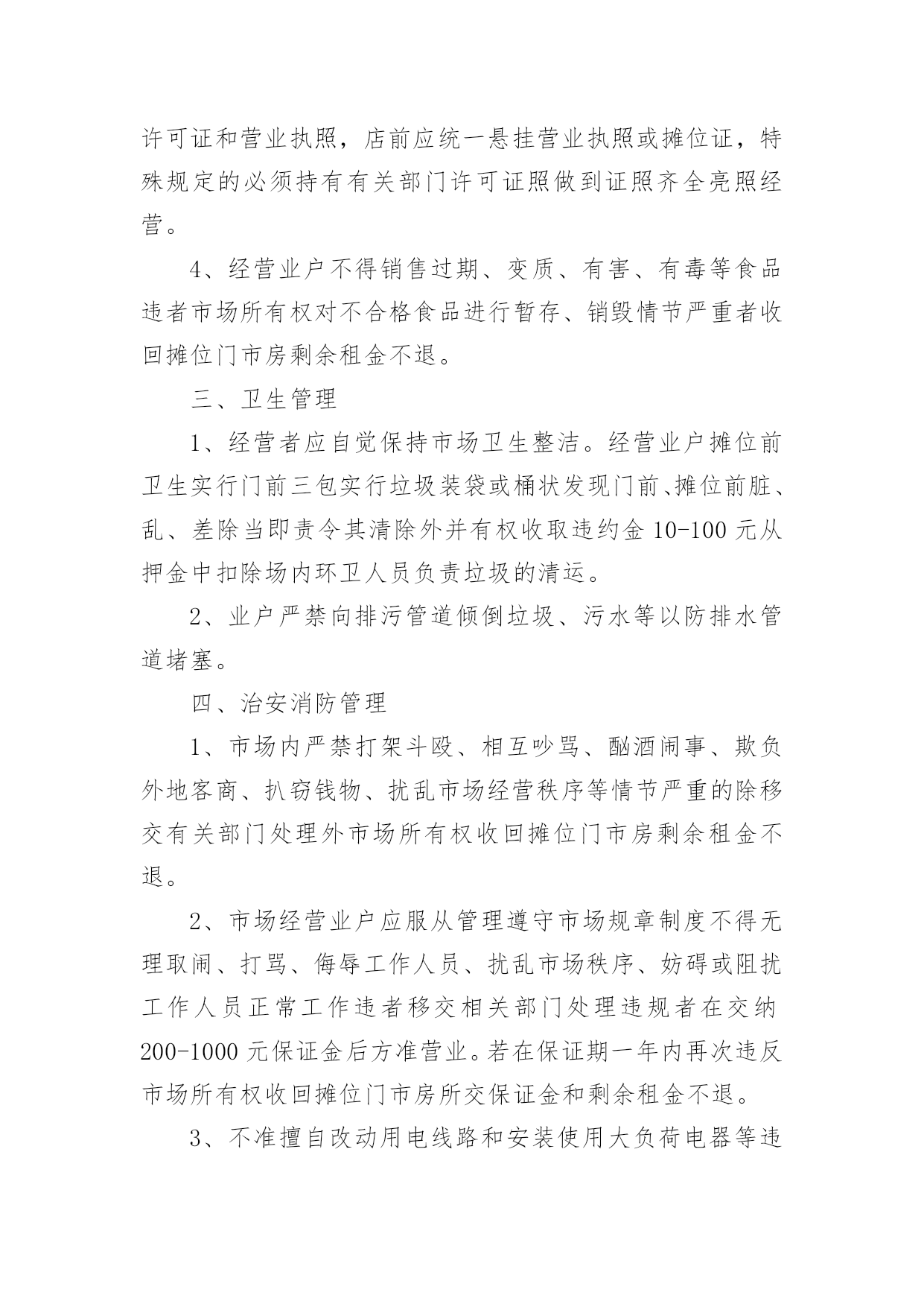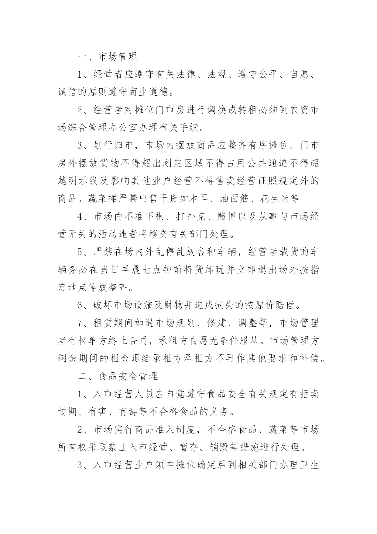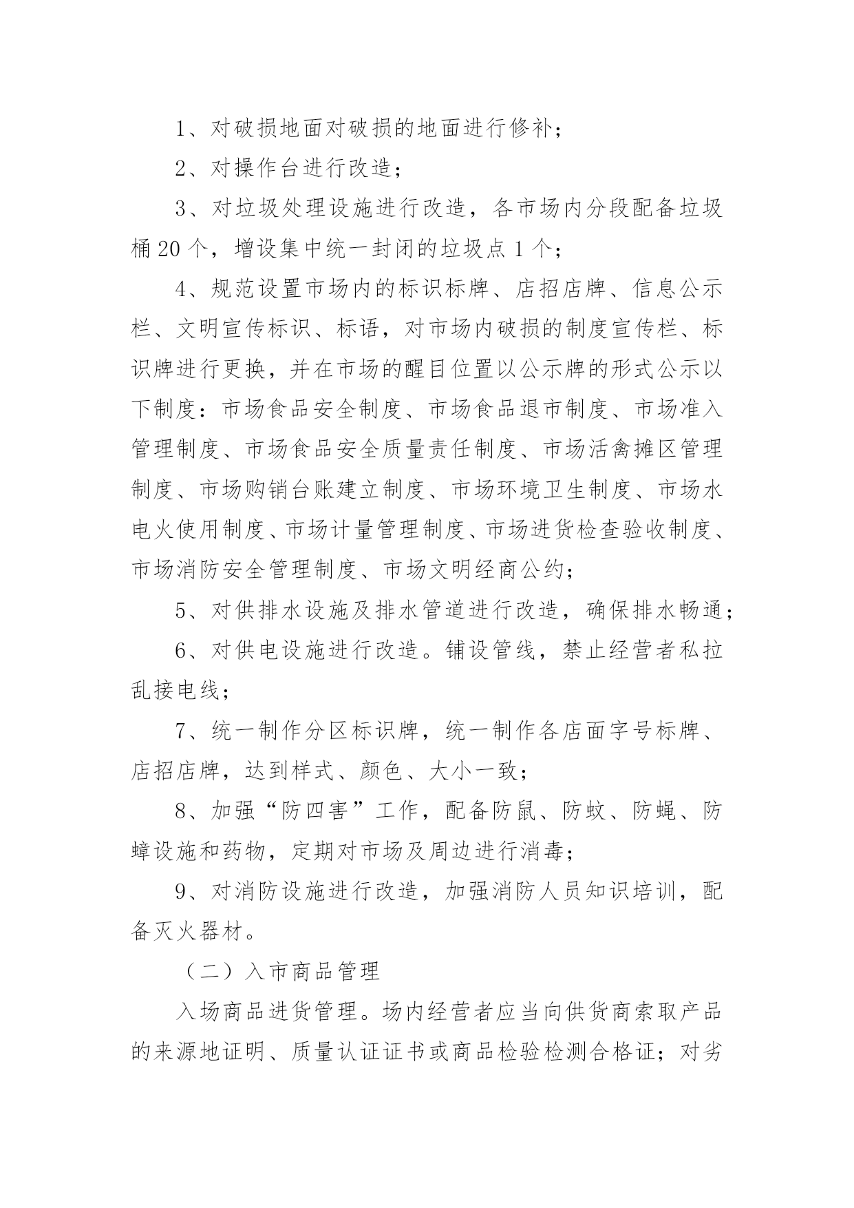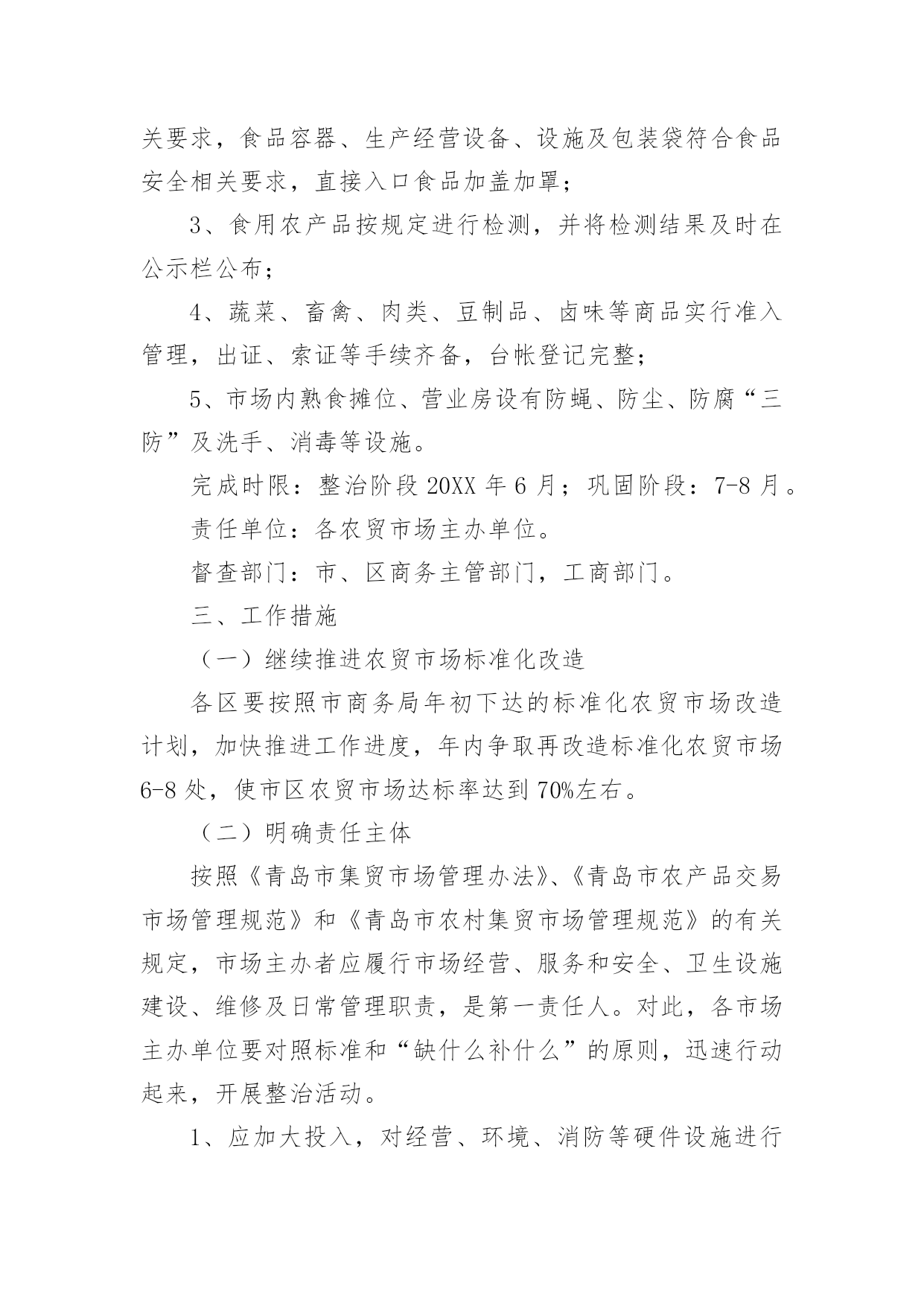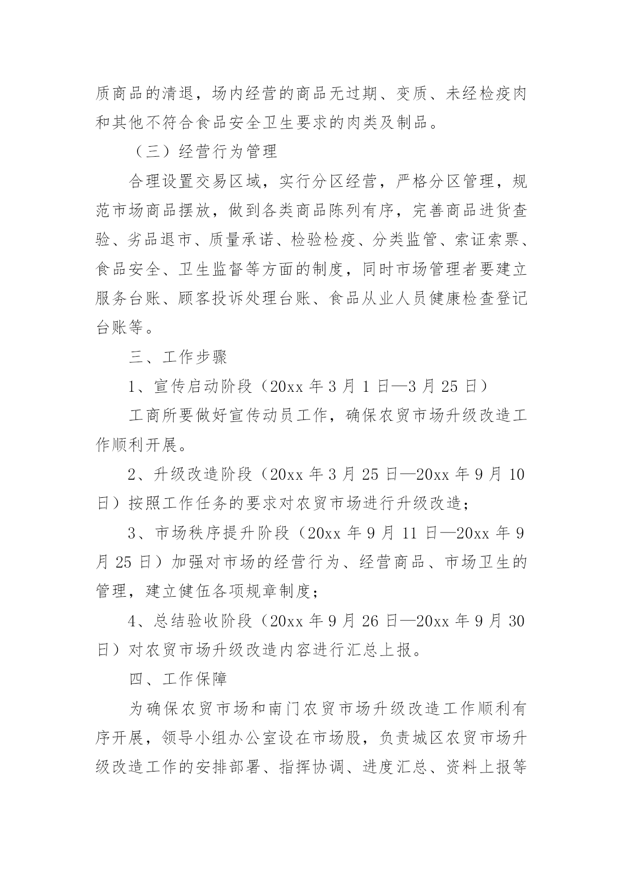 农产品批发市场运营方案农产品批发市场运营方案范文(精选10篇)为了确保事情或工作能无误进行,常常需要提前制定一份优秀的方案,方案是综合考量事情或问题相关的因素后所制定的书面计划。那么问题来了,方案应该怎么写?下面是小编帮大家整理的农产品批发市场运营方案范文,欢迎大家借鉴与参考,希望对大家有所帮助。农产品批发市场运营方案篇1为创建全国文明城市,按照市委市政府关于大干200天,实施市容环境整治的决策部署,大力提升农贸市场建设档次和管理水平,特制定本实施方案。一、目标任务按照创建文明城市的要求,对市区农贸市场的经营设施、环境卫生、消防安全和食品安全进行一次彻底整治,达到“整洁、卫生、安全、文明”的工作目标。通过进一步健全管理制度,完善长效机制,全面提升农贸市场的建设和管理水平,营造良好的消费环境。二、整治标准(一)经营设施1、市场门头统一形象设计,清晰、美观,整齐、大方;2、市场进出口处设立导购图、公示栏、服务台、复秤台;3、摊点、货架设置布局合理、整齐划一,商品摆放无“伸舌头”堵塞通道现象;4、用电设施状况良好,电线无乱拉乱扯现象,照明灯具规格统一整齐;5、房屋、墙面、地面、设施无破损现象。(二)环境卫生1、市场外“门前三包”区域内无流动摊贩、违章搭建、占道经营、倚门设摊等行为;周边道路、人行道、停车场和绿化带清洁卫生;2、每个摊位内设保洁桶(袋);3、市场内无卫生死角,地面无积水,无杂物,无污渍,干净整洁。4、市场内无乱吊乱挂、乱堆乱放现象。(三)消防安全1、在市场内醒目位置张贴消防安全“四项能力”宣传“明白纸”;2、消防设施完备,好用;3、市场内无违章用火用电,无违章经营、储存使用易燃易爆危险品现象;4、疏散通道、安全出口畅通,无占用防火间距现象等。(四)食品安全1、市场内食品经营单位亮证经营,证照齐全,不出售过期、变质、伪劣食品;2、熟食经营、加工、制作从业人员的健康状况符合相关要求,食品容器、生产经营设备、设施及包装袋符合食品安全相关要求,直接入口食品加盖加罩;3、食用农产品按规定进行检测,并将检测结果及时在公示栏公布;4、蔬菜、畜禽、肉类、豆制品、卤味等商品实行准入管理,出证、索证等手续齐备,台帐登记完整;5、市场内熟食摊位、营业房设有防蝇、防尘、防腐“三防”及洗手、消毒等设施。完成时限:整治阶段20XX年6月;巩固阶段:7-8月。责任单位:各农贸市场主办单位。督查部门:市、区商务主管部门,工商部门。三、工作措施(一)继续推进农贸市场标准化改造各区要按照市商务局年初下达的标准化农贸市场改造计划,加快推进工作进度,年内争取再改造标准化农贸市场6-8处,使市区农贸市场达标率达到70%左右。(二)明确责任主体按照《青岛市集贸市场管理办法》、《青岛市农产品交易市场管理规范》和《青岛市农村集贸市场管理规范》的有关规定,市场主办者应履行市场经营、服务和安全、卫生设施建设、维修及日常管理职责,是第一责任人。对此,各市场主办单位要对照标准和“缺什么补什么”的原则,迅速行动起来,开展整治活动。1、应加大投入,对经营、环境、消防等硬件设施进行改造和维修,保证正常使用、美观大方。2、对市场的卫生实施全程全天候保洁,实行定岗定责定人“三定制度”,全面推行垃圾收集袋(桶)装化,并对市场垃圾随产随清,时刻保持良好的市场环境。市场负责人每天应不少于2次对市场卫生情况进行巡查。3、落实消防安全责任。市场主办单位为第一责任人,并配备专职消防安全人员;要加强消防安全“四项能力”建设,在市场内张贴“明白纸”,市场管理人员和业户要熟知其内容要求。4、要坚持进场农产品检测、公示和索证索票制度,协助商务和有关执法部门搞好食品安全监管。5、要配合城管、街道等部门做好市场周边流动摊贩、占道经营的清理,创造良好的经营秩序。(三)加大检查监督力度1、强化属地化管理。按照市委、市政府的总体要求,此项工作按属地管理实施。各区要与市场主办单位签定市场卫生管理责任状,明确责任和应达到的目标,督促市场主办单位搞好整治和日常管理。同时,要建立日常巡查制度,每周巡查不少于2次,并做好巡查记录。2、明确责任分工。各区商务主管部门主要负责对市场标准化建设、消防安全(会同消防部门)和卫生保洁等工作的督促检查;工商分局主要负责市场的经营资格、经营行为和商品索证等工作,根据商务、农业等部门对农产品质量的抽检结果,对违法销售者作出处罚。在工作中,各区商务、工商等部门应密切配合,形成齐抓共管的合力,共同把市场管理的各项工作抓紧抓实。3、加强舆论监督。市商务局、市工商局将不定期对各区农贸市场管理工作进行检查。期间,市里将每周进行一次抽检,并在平面媒体设专栏,将检查情况予以曝光。(四)建立奖惩制度市商务局和市工商局对在国家省和市检查中被扣分的、一年中市区检查二次不合格的、群众举报经查属实的以及被新闻