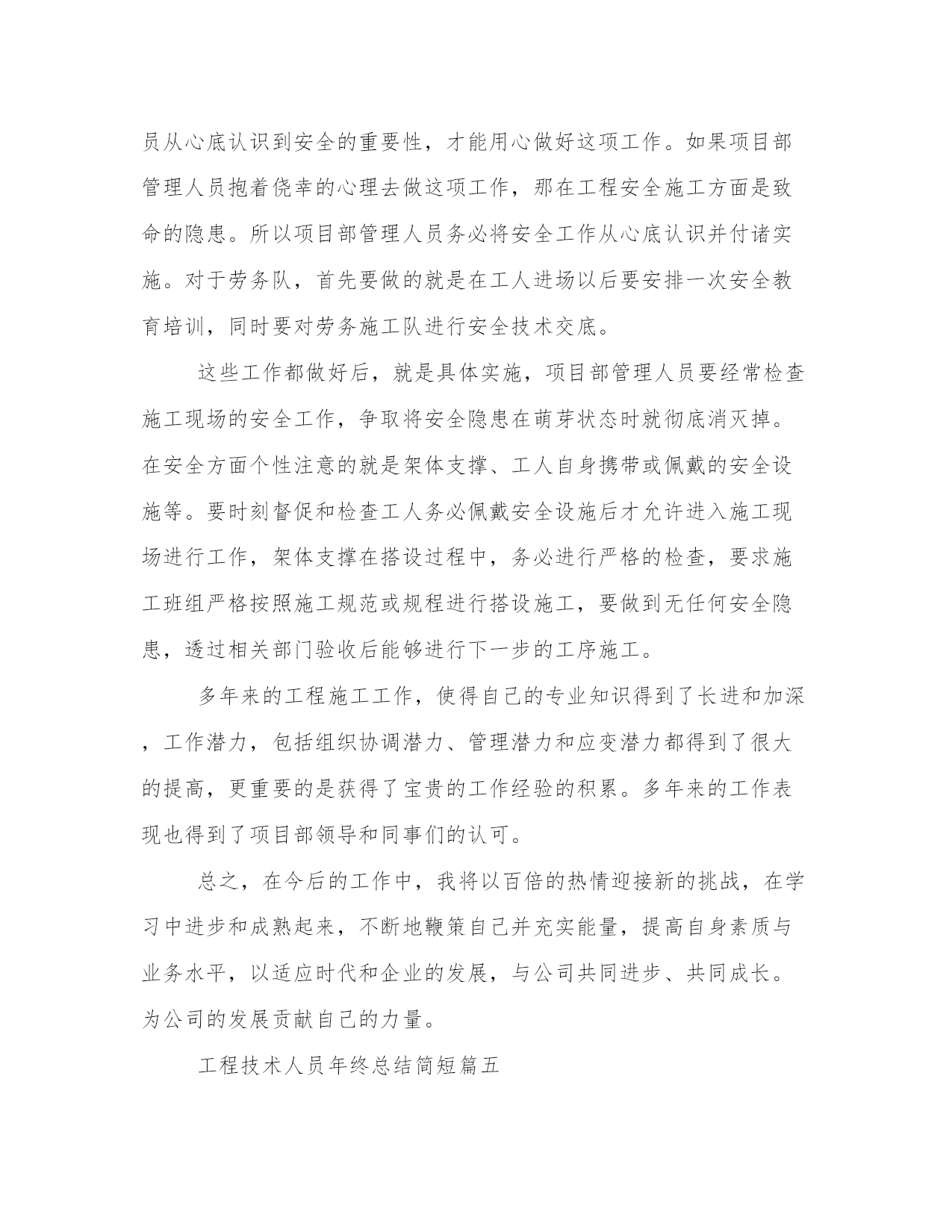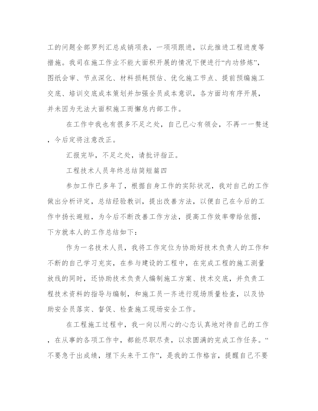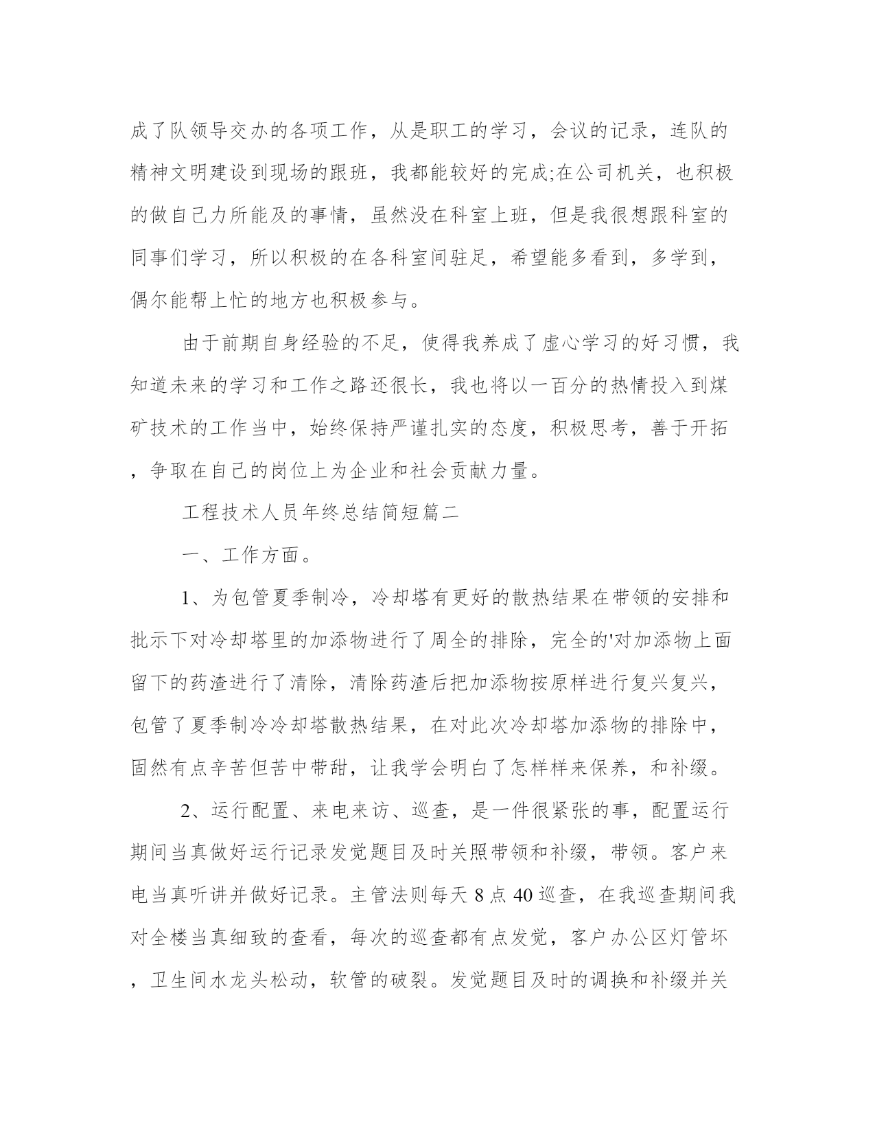 最新工程技术人员年终总结简短(模板9篇)通过总结,我们可以准确地描述和分享我们的经验和见解,帮助他人更好地理解和学习。写总结时,我们可以选择适当的词汇和表达方式,给读者留下深刻的印象。在阅读这些总结范文时,我们可以学习到一些写作技巧和方法,提升我们的写作能力。工程技术人员年终总结简短篇一我从年初开始在__公司工作,已将近一年,在这一年当中,我尽量弥补自身知识的不足之处,熟悉掌握多元的专业业务知识,能够比较得心应手的开展各项工作,这些可以说都受益于各位领导的栽培和各位同事的赐教。下面,我将这一年来的工作总结如下。一、虚心学习,努力进步。工作期间,我清醒的认识到自己在实际工作中的不足之处,缺少实践经验,井下现场经验匮乏,所以在日常工作中,我不断向领导和井下工人学习,加快补充自己的现场实践经验。以严谨的科学态度对待煤矿的每一项工作,争取不断进步,提高自己的专业技术能力。在采煤队工作期间,开始总会遇到很多不懂的事,要做的报表,要填的资料以及要开的连队会议等,都在队领导的悉心指导下慢慢掌握,在井下采煤工作面时,总会看见很多实际应用中才会有的技术问题,这些都是书本上学不到的,所以现场的工人,跟班人员,他们便是我的指导老师,他们使我得到了很大的进步。二、恪守本职,扎实工作。我深知煤矿技术工作的艰难与重要性,所以一开始就要求自己严格一点,来不得半点马虎、出不得半点差错,只有兢兢业业、扎扎实实,才能做到优质高效。为此,我把履行岗位职责、虚心学习作为自己的核心任务。在采煤队工作期间,经常跟随作业人员一起进出井,现场观察、记录作业人员作业的过程,获得了许多重要的一线经验。这些都是不可多的经验和知识,为我以后的工作打下了坚实的基础,也使得自己能够更快的进入角色,干起工作来得心应手。三、朴实诚恳,严格自律。作为一名煤矿的技术人员,我知道应该具有朴实平淡的本色,努力让自己做到朴实不虚妄,热情不虚假,处事不急躁。心中始终要有规章制度,能够准确严谨的处理每一项工作,特别是井下技术工作。在工作方面,不怕困难,始终提醒自己要有顽强的拼搏精神,虽然煤矿的加班比较多,但我深知井下的煤矿工作更没有假期,所以我们不能有怨言。对于难度大的工作,要敢于迎难而上,以自己诚恳的态度和虚心的工作作风赢得了领导的好评。在生活方面,我积极参与公司组织的各项活动,也在公司团委中担任委员,参与组织各种青年职工的活动,这些都使得我保持了比较健康的生活方式。在__公司不知不觉就工作了一年时间,总的来说,这一年是学习的一年,是锻炼的一年,也是收获的一年。在采煤一队,我很好的完成了队领导交办的各项工作,从是职工的学习,会议的记录,连队的精神文明建设到现场的跟班,我都能较好的完成;在公司机关,也积极的做自己力所能及的事情,虽然没在科室上班,但是我很想跟科室的同事们学习,所以积极的在各科室间驻足,希望能多看到,多学到,偶尔能帮上忙的地方也积极参与。由于前期自身经验的不足,使得我养成了虚心学习的好习惯,我知道未来的学习和工作之路还很长,我也将以一百分的热情投入到煤矿技术的工作当中,始终保持严谨扎实的态度,积极思考,善于开拓,争取在自己的岗位上为企业和社会贡献力量。工程技术人员年终总结简短篇二一、工作方面。1、为包管夏季制冷,冷却塔有更好的散热结果在带领的安排和批示下对冷却塔里的加添物进行了周全的排除,完全的'对加添物上面留下的药渣进行了清除,清除药渣后把加添物按原样进行复兴复兴,包管了夏季制冷冷却塔散热结果,在对此次冷却塔加添物的排除中,固然有点辛苦但苦中带甜,让我学会明白了怎样样来保养,和补缀。2、运行配置、来电来访、巡查,是一件很紧张的事,配置运行期间当真做好运行记录发觉题目及时关照带领和补缀,带领。客户来电当真听讲并做好记录。主管法则每天8点40巡查,在我巡查期间我对全楼当真细致的查看,每次的巡查都有点发觉,客户办公区灯管坏,卫生间水龙头松动,软管的破裂。发觉题目及时的调换和补缀并关照主管。别看这小小的题目如果不敷时的调换和补缀就可以风险到人身安定。巡查中固然也有没发觉的处所,今后要连续的总结争强技巧。3、在带领屡次对电。水。电梯。消防安定等培训中我学到了很多也明白了很多特别在此次电梯困人真人练习练习中我本来很紧急生怕甚么处所做错,如碰到突发变乱我就可以把所进修的知识应用到实际工作中去我就可以很冷静的做出精确的判别。二、工作目标。今后我将以极新的精神状况投入到工作傍边,竭力提高文化本质和各种工作技巧,做出应有的贡献。勤勤奋恳办事,时候紧记本身的责任和任务,严厉要求本身,在任甚么时候候都要竭力结束带领交给的任务。服从公司的规章轨制,做好本职工作,向同事进修。取长补短,彼此交换好的工作经验,互助进步。征取更好的工作成绩。工程技术人员年终总结简短篇三我目