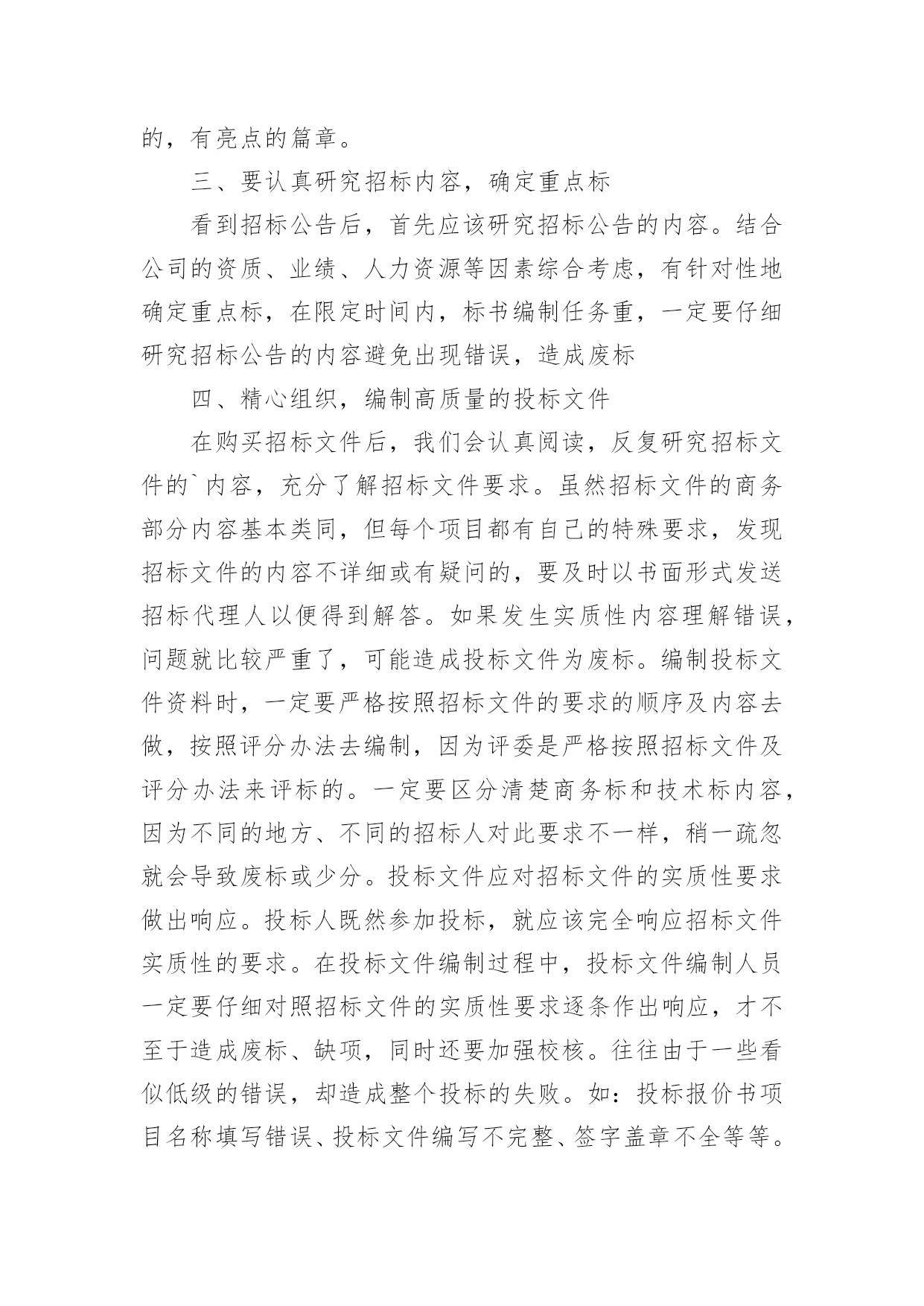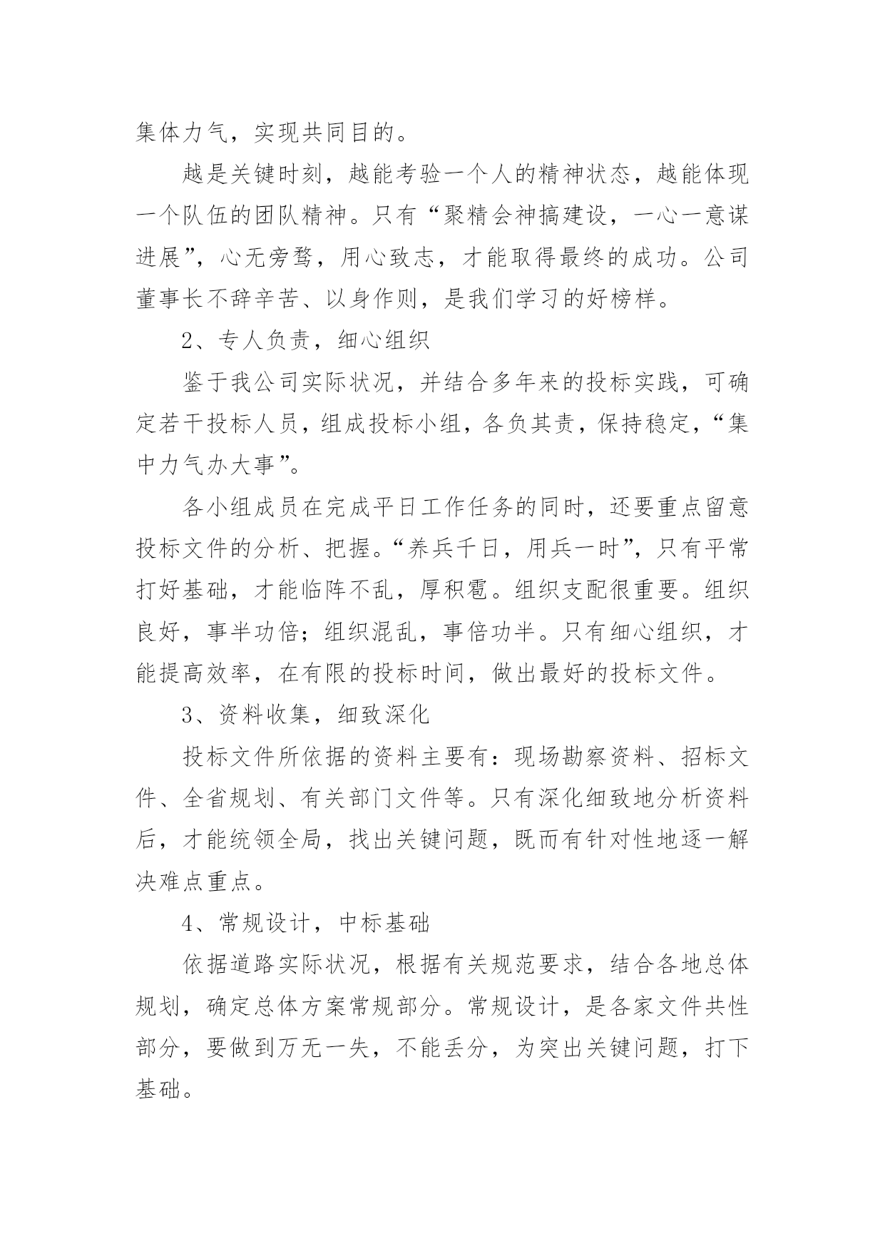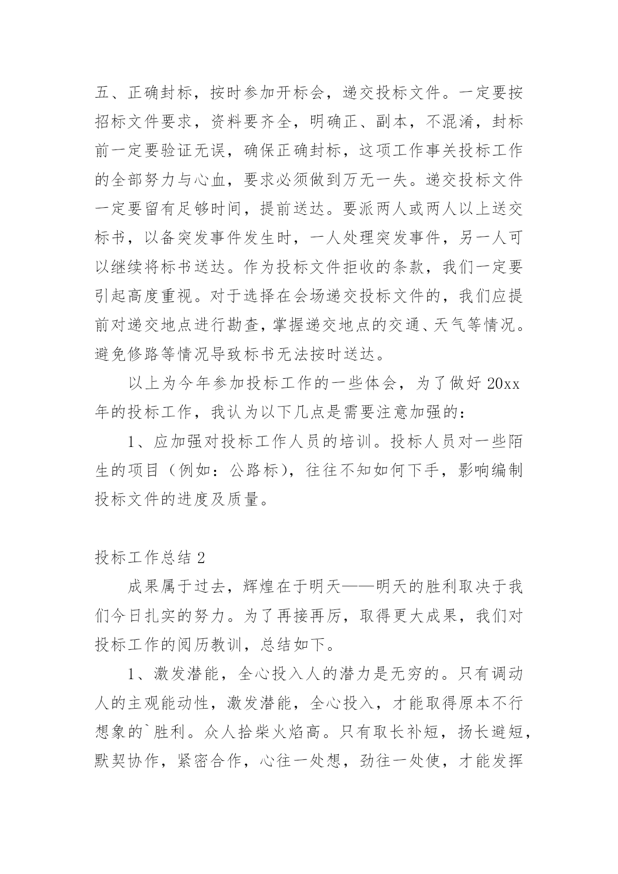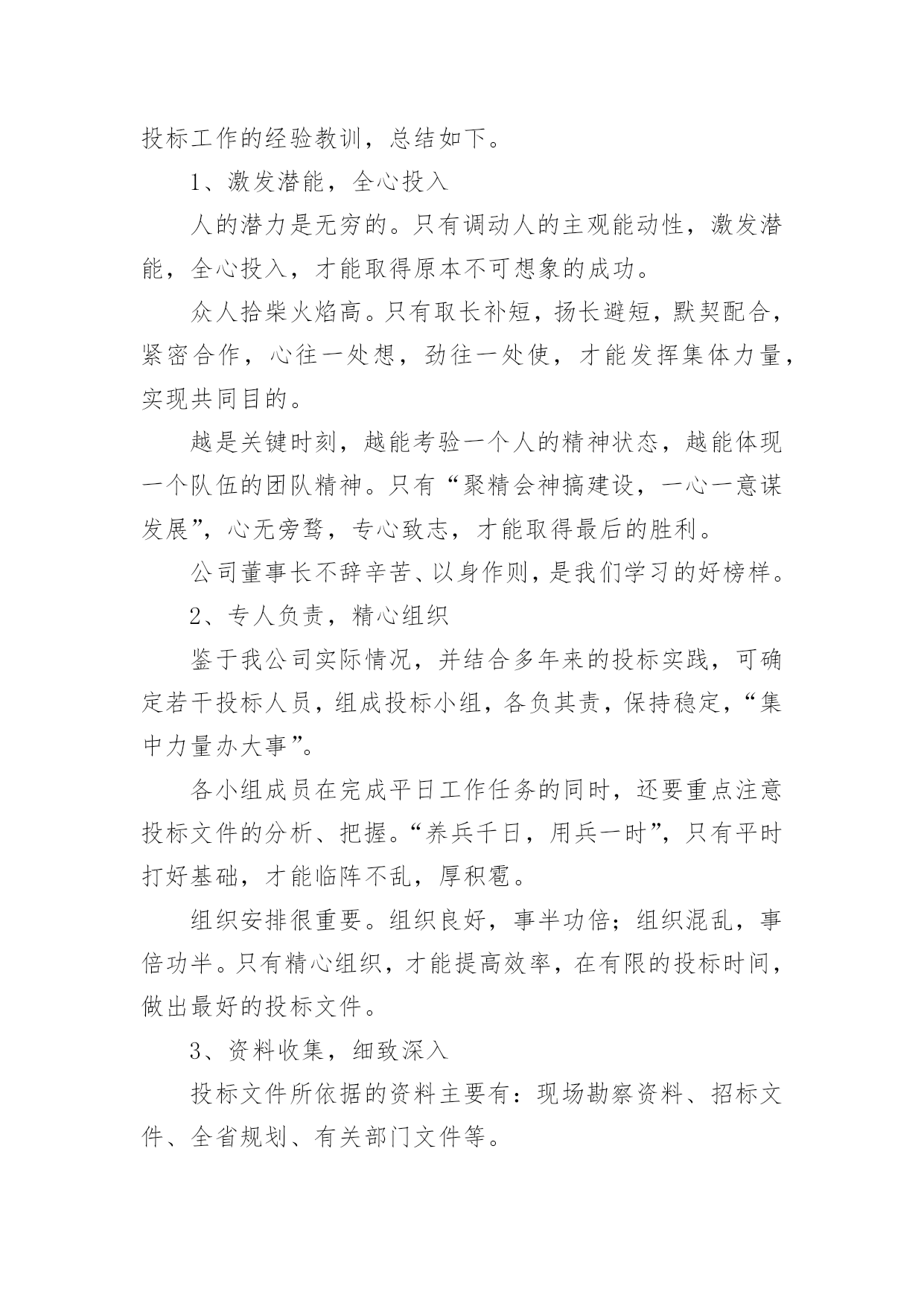 投标工作总结总结是事后对某一时期、某一项目或某些工作进行回顾和分析,从而做出带有规律性的结论,它可以促使我们思考,因此好好准备一份总结吧。那么总结有什么格式呢?以下是小编为大家整理的投标工作总结,欢迎大家借鉴与参考,希望对大家有所帮助。投标工作总结1岁月流转,时光飞逝,转眼间迎来20xx年,我参与了公司的大部分项目投标工作,现就我参与投标工作的一些体会和以下如何做好投标工作总结如下:一、平时多充电学习说到投标,这个概念又可以扩展很广泛,我要做的就是不光制作标书,平时还要做好各方面资料的收集、学习。我们要学习相关法规政策,要有一定的财务知识,要有一定的工程经济的知识,还要有相关的施工技术知识。二、做好公司相关资料的统计汇总1、建好公司资料库:营业执照、资质证书、机构代码证、近三五年最有代表性的业绩资料等等。2、建好人才资料库:建立各类人员的档案资料,如施工员、造价员、预算员等人员的相关资料(含个人简历)。3、收集不同类别的,有影响工程的施工组织设计,便于快速编制施工组织设计,在此基础之上,再增添有针对性的,有亮点的篇章。三、要认真研究招标内容,确定重点标看到招标公告后,首先应该研究招标公告的内容。结合公司的资质、业绩、人力资源等因素综合考虑,有针对性地确定重点标,在限定时间内,标书编制任务重,一定要仔细研究招标公告的内容避免出现错误,造成废标四、精心组织,编制高质量的投标文件在购买招标文件后,我们会认真阅读,反复研究招标文件的`内容,充分了解招标文件要求。虽然招标文件的商务部分内容基本类同,但每个项目都有自己的特殊要求,发现招标文件的内容不详细或有疑问的,要及时以书面形式发送招标代理人以便得到解答。如果发生实质性内容理解错误,问题就比较严重了,可能造成投标文件为废标。编制投标文件资料时,一定要严格按照招标文件的要求的顺序及内容去做,按照评分办法去编制,因为评委是严格按照招标文件及评分办法来评标的。一定要区分清楚商务标和技术标内容,因为不同的地方、不同的招标人对此要求不一样,稍一疏忽就会导致废标或少分。投标文件应对招标文件的实质性要求做出响应。投标人既然参加投标,就应该完全响应招标文件实质性的要求。在投标文件编制过程中,投标文件编制人员一定要仔细对照招标文件的实质性要求逐条作出响应,才不至于造成废标、缺项,同时还要加强校核。往往由于一些看似低级的错误,却造成整个投标的失败。如:投标报价书项目名称填写错误、投标文件编写不完整、签字盖章不全等等。五、正确封标,按时参加开标会,递交投标文件。一定要按招标文件要求,资料要齐全,明确正、副本,不混淆,封标前一定要验证无误,确保正确封标,这项工作事关投标工作的全部努力与心血,要求必须做到万无一失。递交投标文件一定要留有足够时间,提前送达。要派两人或两人以上送交标书,以备突发事件发生时,一人处理突发事件,另一人可以继续将标书送达。作为投标文件拒收的条款,我们一定要引起高度重视。对于选择在会场递交投标文件的,我们应提前对递交地点进行勘查,掌握递交地点的交通、天气等情况。避免修路等情况导致标书无法按时送达。以上为今年参加投标工作的一些体会,为了做好20xx年的投标工作,我认为以下几点是需要注意加强的:1、应加强对投标工作人员的培训。投标人员对一些陌生的项目(例如:公路标),往往不知如何下手,影响编制投标文件的进度及质量。投标工作总结2成果属于过去,辉煌在于明天——明天的胜利取决于我们今日扎实的努力。为了再接再厉,取得更大成果,我们对投标工作的阅历教训,总结如下。1、激发潜能,全心投入人的潜力是无穷的。只有调动人的主观能动性,激发潜能,全心投入,才能取得原本不行想象的`胜利。众人拾柴火焰高。只有取长补短,扬长避短,默契协作,紧密合作,心往一处想,劲往一处使,才能发挥集体力气,实现共同目的。越是关键时刻,越能考验一个人的精神状态,越能体现一个队伍的团队精神。只有“聚精会神搞建设,一心一意谋进展”,心无旁骛,用心致志,才能取得最终的成功。公司董事长不辞辛苦、以身作则,是我们学习的好榜样。2、专人负责,细心组织鉴于我公司实际状况,并结合多年来的投标实践,可确定若干投标人员,组成投标小组,各负其责,保持稳定,“集中力气办大事”。各小组成员在完成平日工作任务的同时,还要重点留意投标文件的分析、把握。“养兵千日,用兵一时”,只有平常打好基础,才能临阵不乱,厚积雹。组织支配很重要。组织良好,事半功倍;组织混乱,事倍功半。只有细心组织,才能提高效率,在有限的投标时间,做出最好的投标文件。3、资料收集,细致深化投标文件所依据的资料主要有:现场勘察资料、招标文件、全省规划、有关部门文件等。只有深化细致地分析资料后,才能统领全局,找出关键问题,既而有针对性地逐一解决难点重点。4、常规设计,中标基础依据道路实际状况,根据