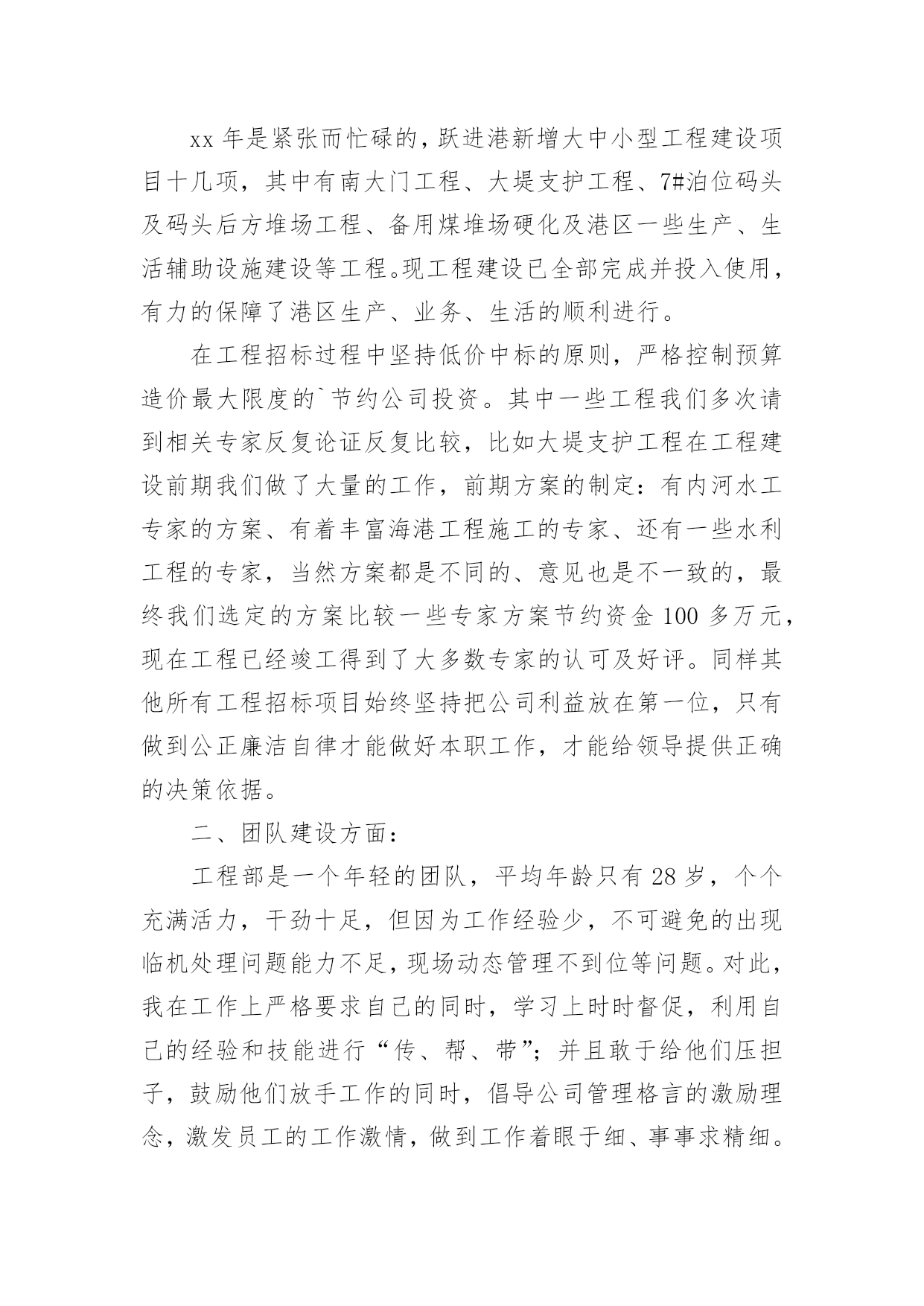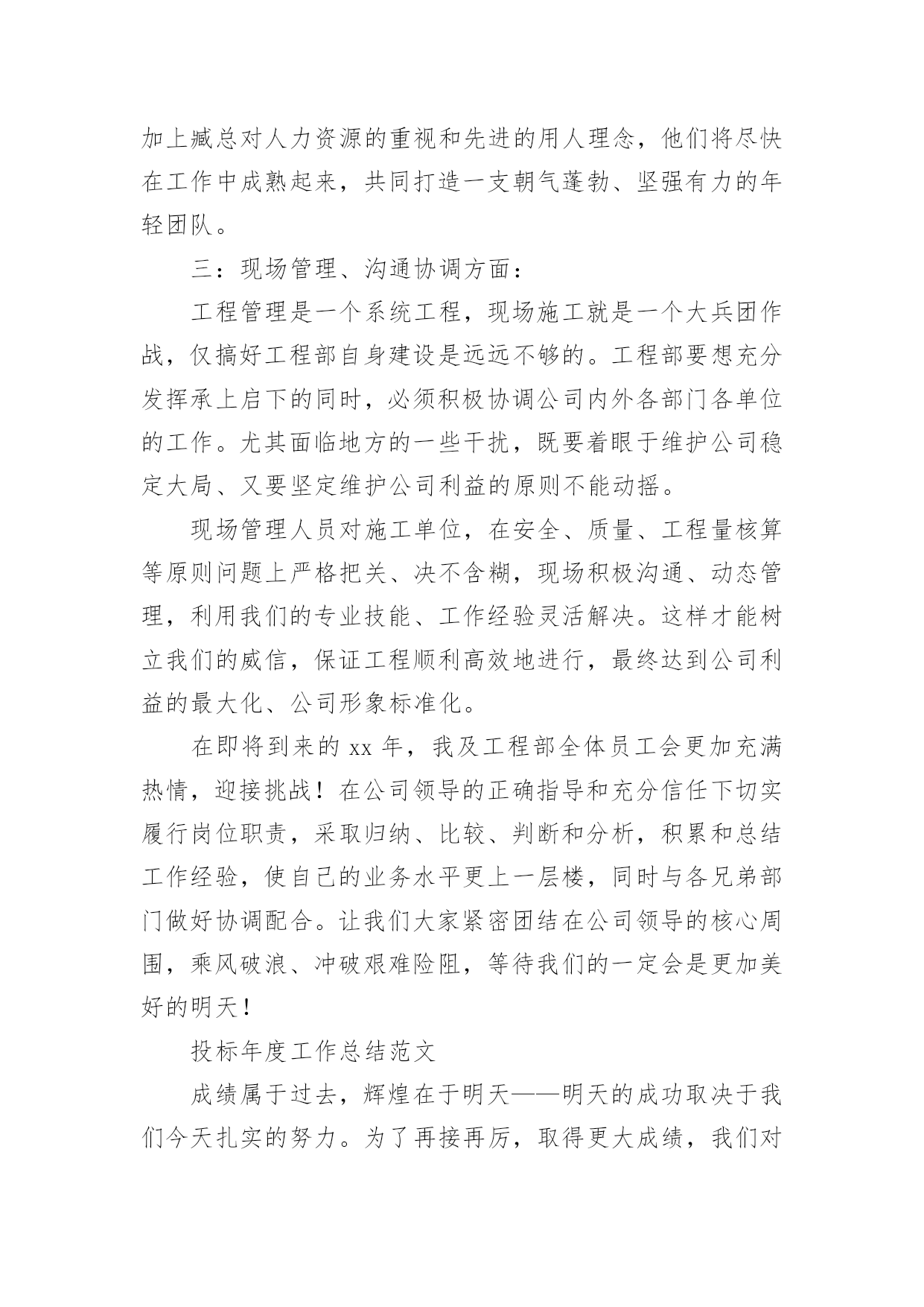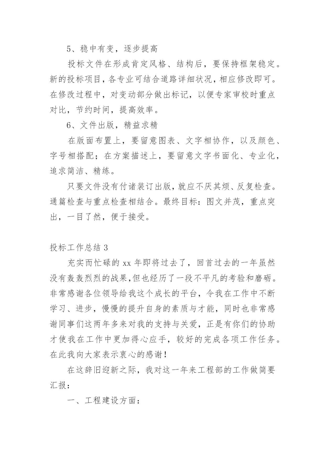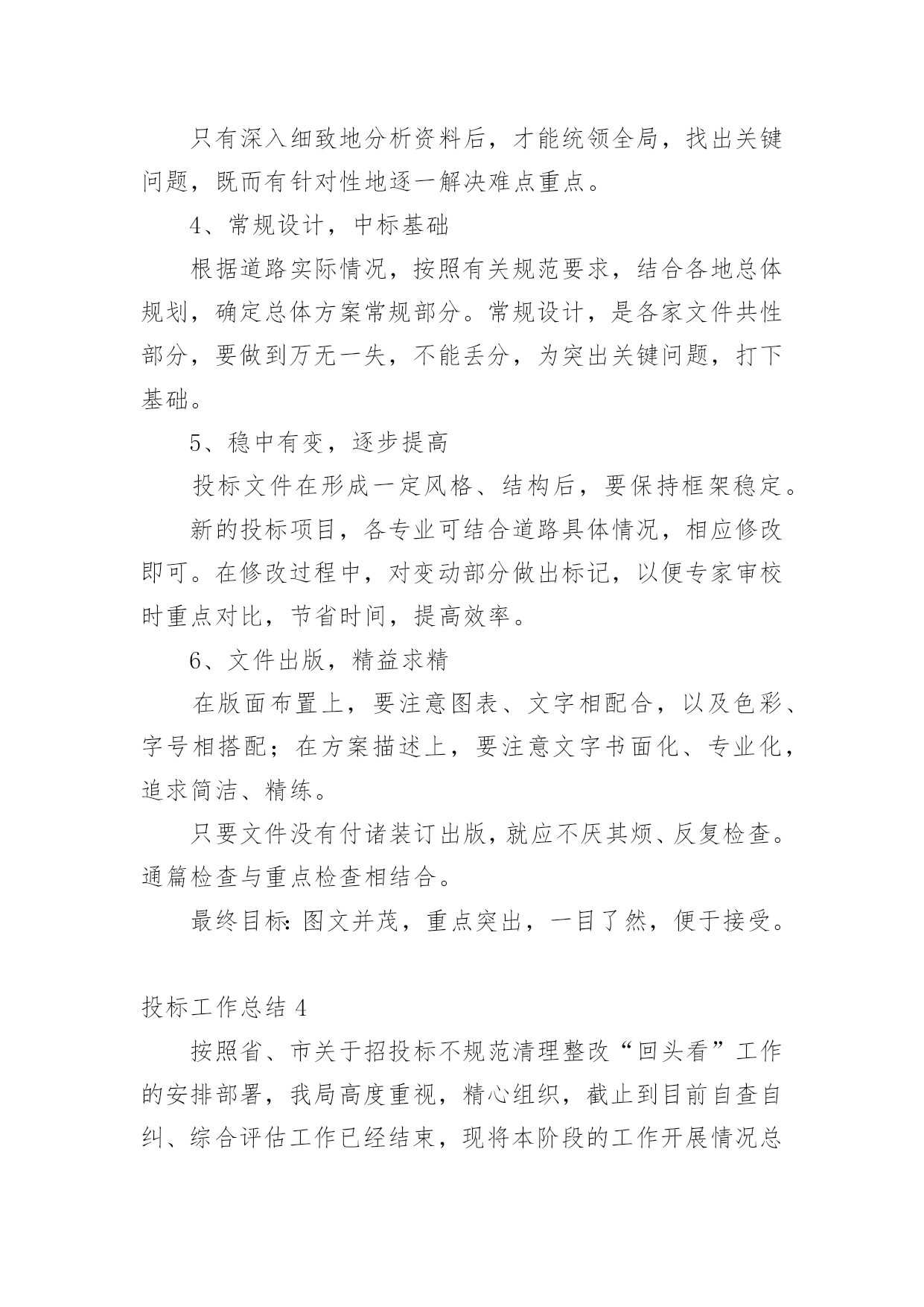 投标工作总结总结是事后对某一时期、某一项目或某些工作进行回顾和分析,从而做出带有规律性的结论,它可以促使我们思考,因此好好准备一份总结吧。那么总结有什么格式呢?以下是小编为大家整理的投标工作总结,欢迎大家借鉴与参考,希望对大家有所帮助。投标工作总结1岁月流转,时光飞逝,转眼间迎来20xx年,我参与了公司的大部分项目投标工作,现就我参与投标工作的一些体会和以下如何做好投标工作总结如下:一、平时多充电学习说到投标,这个概念又可以扩展很广泛,我要做的就是不光制作标书,平时还要做好各方面资料的收集、学习。我们要学习相关法规政策,要有一定的财务知识,要有一定的工程经济的知识,还要有相关的施工技术知识。二、做好公司相关资料的统计汇总1、建好公司资料库:营业执照、资质证书、机构代码证、近三五年最有代表性的业绩资料等等。2、建好人才资料库:建立各类人员的档案资料,如施工员、造价员、预算员等人员的相关资料(含个人简历)。3、收集不同类别的,有影响工程的施工组织设计,便于快速编制施工组织设计,在此基础之上,再增添有针对性的,有亮点的篇章。三、要认真研究招标内容,确定重点标看到招标公告后,首先应该研究招标公告的内容。结合公司的资质、业绩、人力资源等因素综合考虑,有针对性地确定重点标,在限定时间内,标书编制任务重,一定要仔细研究招标公告的内容避免出现错误,造成废标四、精心组织,编制高质量的投标文件在购买招标文件后,我们会认真阅读,反复研究招标文件的`内容,充分了解招标文件要求。虽然招标文件的商务部分内容基本类同,但每个项目都有自己的特殊要求,发现招标文件的内容不详细或有疑问的,要及时以书面形式发送招标代理人以便得到解答。如果发生实质性内容理解错误,问题就比较严重了,可能造成投标文件为废标。编制投标文件资料时,一定要严格按照招标文件的要求的顺序及内容去做,按照评分办法去编制,因为评委是严格按照招标文件及评分办法来评标的。一定要区分清楚商务标和技术标内容,因为不同的地方、不同的招标人对此要求不一样,稍一疏忽就会导致废标或少分。投标文件应对招标文件的实质性要求做出响应。投标人既然参加投标,就应该完全响应招标文件实质性的要求。在投标文件编制过程中,投标文件编制人员一定要仔细对照招标文件的实质性要求逐条作出响应,才不至于造成废标、缺项,同时还要加强校核。往往由于一些看似低级的错误,却造成整个投标的失败。如:投标报价书项目名称填写错误、投标文件编写不完整、签字盖章不全等等。五、正确封标,按时参加开标会,递交投标文件。一定要按招标文件要求,资料要齐全,明确正、副本,不混淆,封标前一定要验证无误,确保正确封标,这项工作事关投标工作的全部努力与心血,要求必须做到万无一失。递交投标文件一定要留有足够时间,提前送达。要派两人或两人以上送交标书,以备突发事件发生时,一人处理突发事件,另一人可以继续将标书送达。作为投标文件拒收的条款,我们一定要引起高度重视。对于选择在会场递交投标文件的,我们应提前对递交地点进行勘查,掌握递交地点的交通、天气等情况。避免修路等情况导致标书无法按时送达。以上为今年参加投标工作的一些体会,为了做好20xx年的投标工作,我认为以下几点是需要注意加强的:1、应加强对投标工作人员的培训。投标人员对一些陌生的项目(例如:公路标),往往不知如何下手,影响编制投标文件的进度及质量。投标工作总结2成果属于过去,辉煌在于明天——明天的胜利取决于我们今日扎实的努力。为了再接再厉,取得更大成果,我们对投标工作的阅历教训,总结如下。1、激发潜能,全心投入人的潜力是无穷的。只有调动人的主观能动性,激发潜能,全心投入,才能取得原本不行想象的`胜利。众人拾柴火焰高。只有取长补短,扬长避短,默契协作,紧密合作,心往一处想,劲往一处使,才能发挥集体力气,实现共同目的。越是关键时刻,越能考验一个人的精神状态,越能体现一个队伍的团队精神。只有“聚精会神搞建设,一心一意谋进展”,心无旁骛,用心致志,才能取得最终的成功。公司董事长不辞辛苦、以身作则,是我们学习的好榜样。2、专人负责,细心组织鉴于我公司实际状况,并结合多年来的投标实践,可确定若干投标人员,组成投标小组,各负其责,保持稳定,“集中力气办大事”。各小组成员在完成平日工作任务的同时,还要重点留意投标文件的分析、把握。“养兵千日,用兵一时”,只有平常打好基础,才能临阵不乱,厚积雹。组织支配很重要。组织良好,事半功倍;组织混乱,事倍功半。只有细心组织,才能提高效率,在有限的投标时间,做出最好的投标文件。3、资料收集,细致深化投标文件所依据的资料主要有:现场勘察资料、招标文件、全省规划、有关部门文件等。只有深化细致地分析资料后,才能统领全局,找出关键问题,既而有针对性地逐一解决难点重点。4、常规设计,中标基础依据道路实际状况,根据