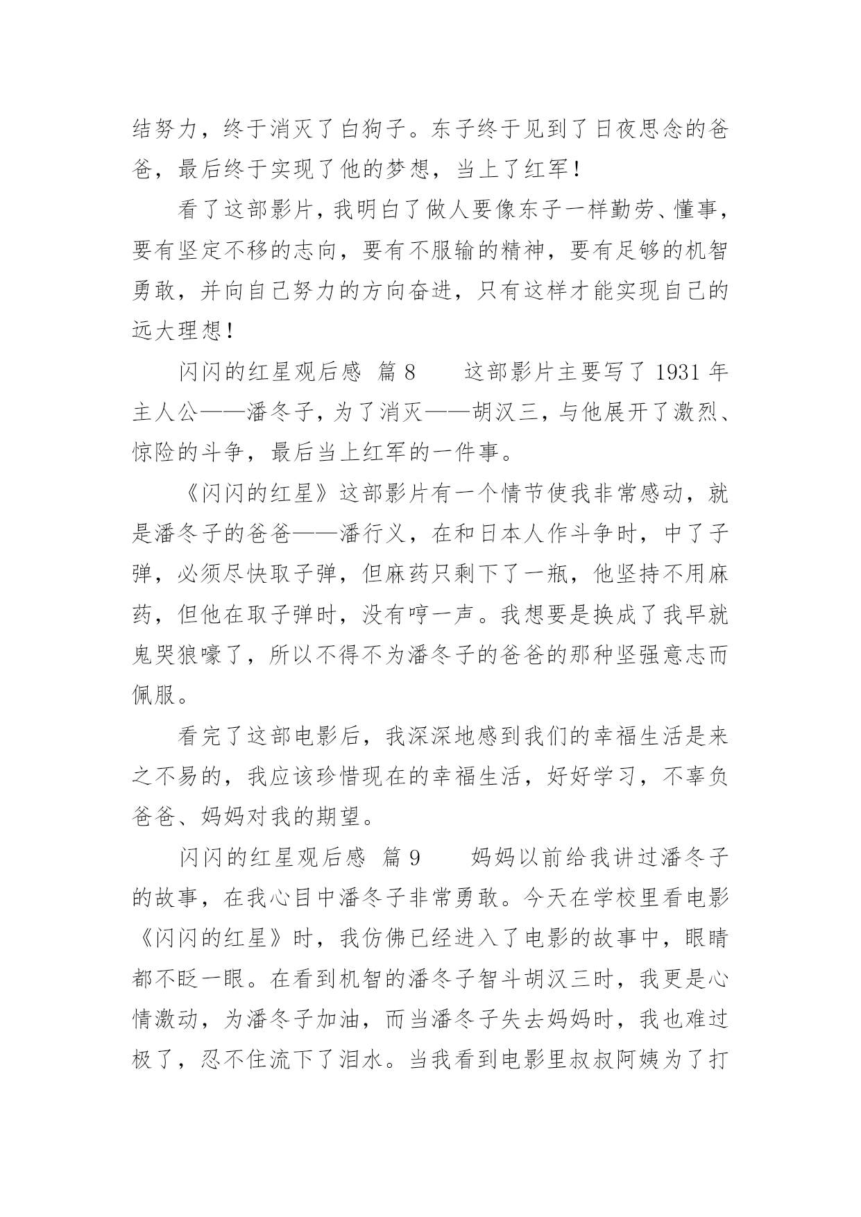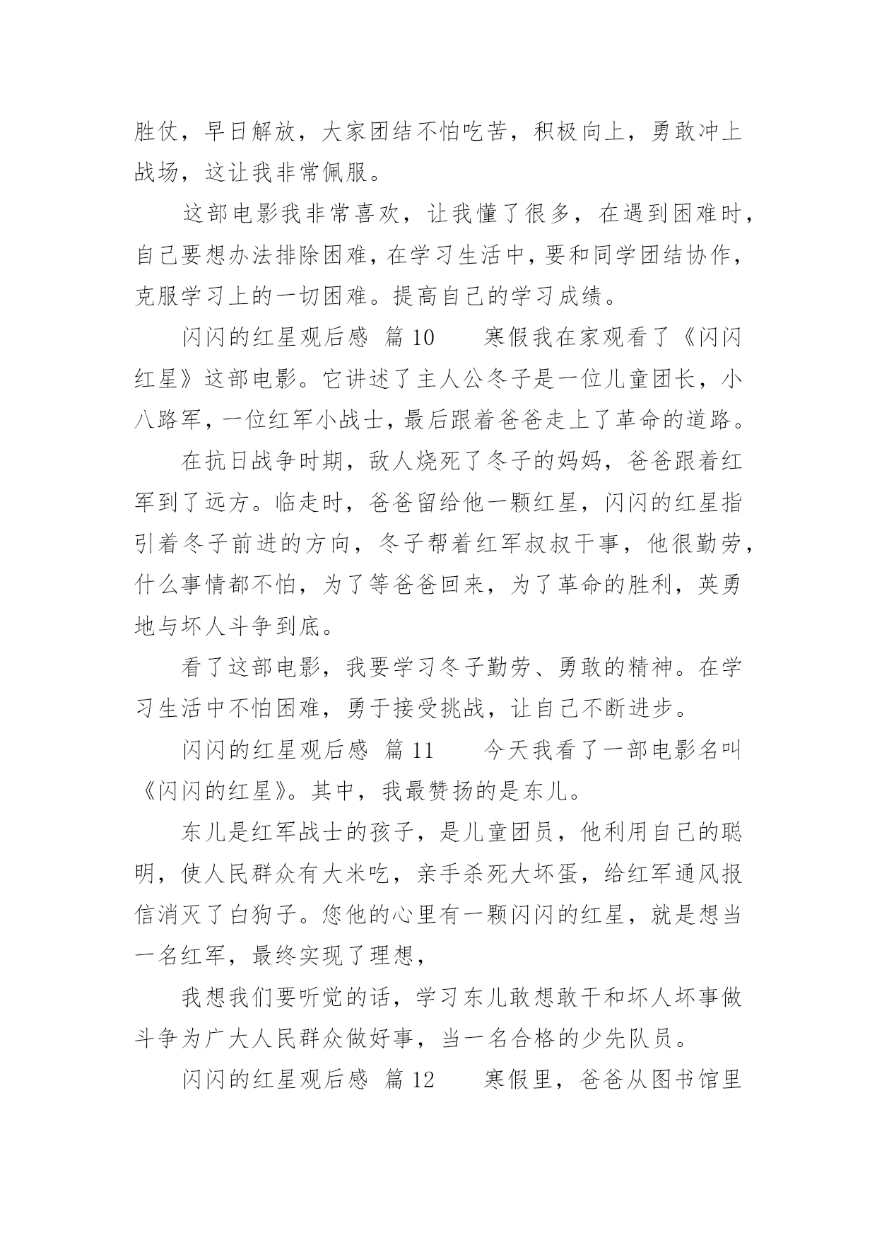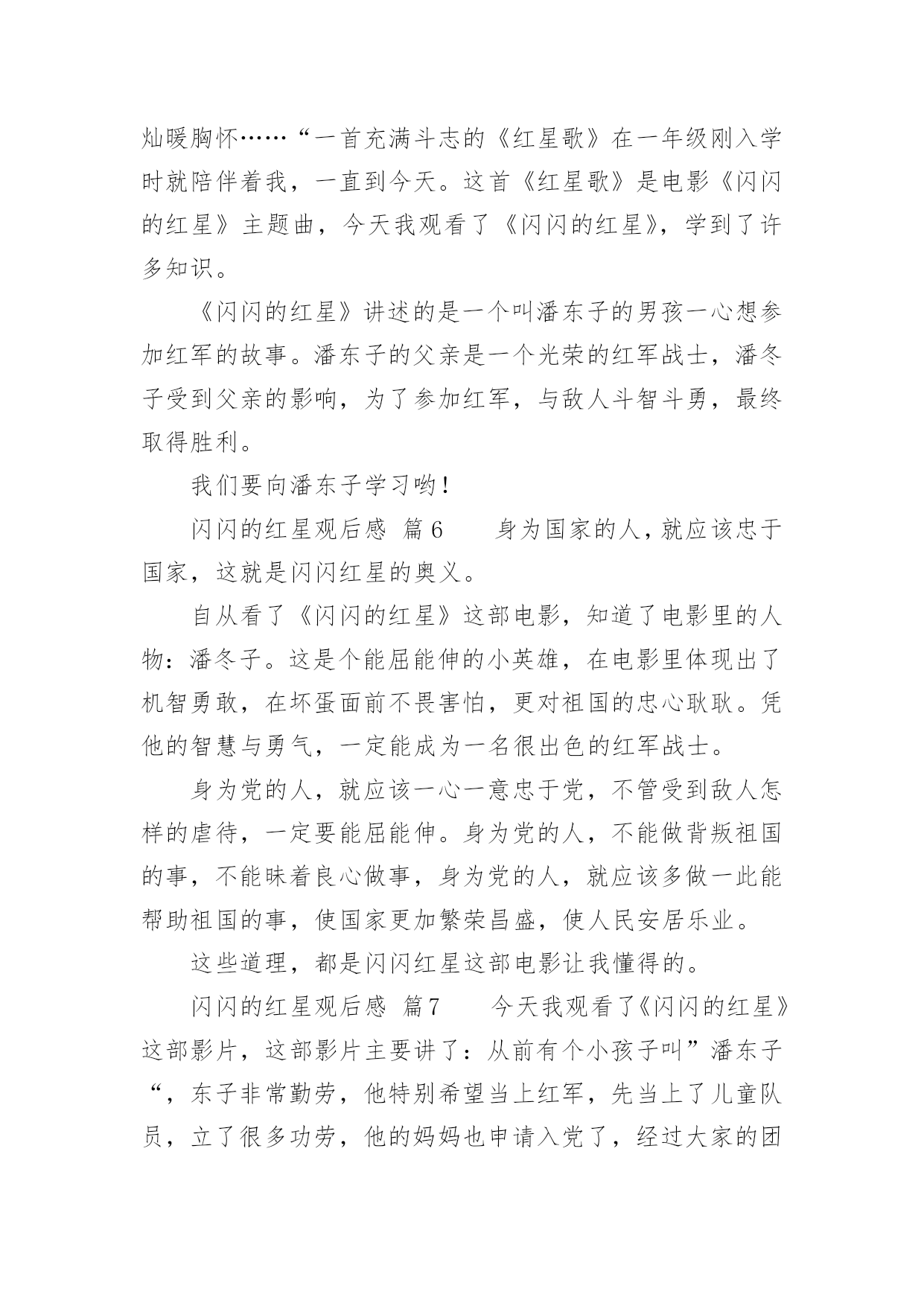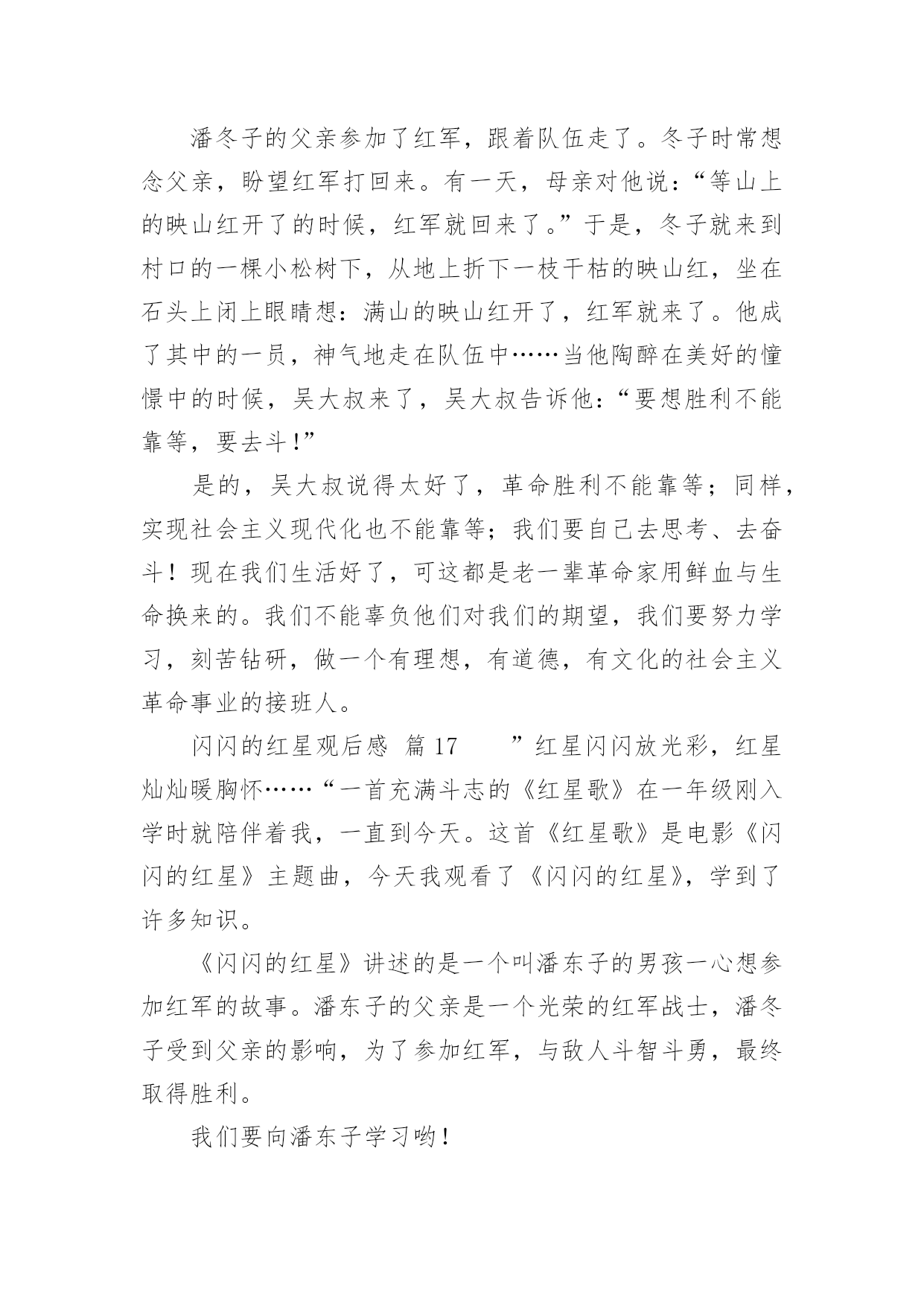 闪闪的红星观后感闪闪的红星观后感(精选29篇)在观看完一部作品以后,相信大家有很多值得分享的东西吧,需要回过头来写一写观后感了。那么你真的会写观后感吗?以下是小编收集整理的闪闪的红星观后感,仅供参考,欢迎大家阅读。闪闪的红星观后感篇1今天,我们观看了一部关于抗战的电影。我觉得这部电影里的主人公潘冬子是一个敢于斗争的人,他在米仓里和坏蛋胡汉三作战。最后,坏蛋胡汉三被米给埋住了。看了《闪闪的红星》以后,我从主人公潘冬子身上学到了勇敢、坚强、自信和乐观去面对生活的这种精神。潘冬子非常坚强,母亲为了保护红军而牺牲了。他虽然很伤心,但是也没有放弃保护家乡的责任。他为了保护自己的家乡可以不顾生命危险,去汉奸胡汉三家里把电报机偷来,潘冬子的勇气感动了我。通过这部电影,我以后要向潘冬子学习。在以后的生活中,我们要学习潘冬子的精神,只要有这样,才能把事情做成功。闪闪的红星观后感篇2我很喜欢《闪闪的红星》这本书,里面讲的是冬子的爸爸潘行义,原来是个赤卫队长。后来跟着红军主力部队转移,留给冬子一颗红星。冬子的妈妈也是个积极分子,常常帮助游击队,还参加了共产党。后来,她为了掩护群众英勇就义。潘冬子在闪闪的红星照耀下,变得很坚强、很勇敢,还亲手杀死了仇人,为妈妈报了仇。看过书后妈妈还给我看电视里的片子。我特别喜欢潘冬子,非常佩服他的勇敢、坚强还有机智。让我深深体会到以后要是碰到困难,一定要向冬子一样机智勇敢。大家有空看看吧!闪闪的红星观后感篇3今天我看了红色电影《闪闪的红星》,里面有个聪明勇敢的孩子叫潘冬子,东子想参加红军,也想帮助红军。有一次东子带着老百姓给红军的盐巴,遇见了半路盘查的坏人,东子灵机一动把盐巴藏在了自己的棉袄里躲过了坏人的盘查。最后东子帮助了红军,也成功的参加了红军。看过这个电影后我从心里佩服东子,佩服东子遇见困难不低头,遇见坏人要勇敢。我以后要向潘冬子学习,他是我的好榜样。闪闪的红星观后感篇4今天班会课上,老师和我们一起观看了电影《闪闪的红星》。电影的主人公是个小男孩,叫潘冬子,他的爸爸妈妈都是共产党员。后来,妈妈为了掩护群众被凶狠的敌人活活地烧死,小冬子却非常坚强勇敢,用自己的聪明才智帮助红军除掉了大汉奸胡汉三的故事。看了这部电影,我深深地体会到:我们现在的美好生活多么来之不易。如果我们不好好学习,怎么对得起为了解放全中国而付出鲜血和生命的革命烈士呢!闪闪的红星观后感篇5”红星闪闪放光彩,红星灿灿暖胸怀……“一首充满斗志的《红星歌》在一年级刚入学时就陪伴着我,一直到今天。这首《红星歌》是电影《闪闪的红星》主题曲,今天我观看了《闪闪的红星》,学到了许多知识。《闪闪的红星》讲述的是一个叫潘东子的男孩一心想参加红军的故事。潘东子的父亲是一个光荣的红军战士,潘冬子受到父亲的影响,为了参加红军,与敌人斗智斗勇,最终取得胜利。我们要向潘东子学习哟!闪闪的红星观后感篇6身为国家的人,就应该忠于国家,这就是闪闪红星的奥义。自从看了《闪闪的红星》这部电影,知道了电影里的人物:潘冬子。这是个能屈能伸的小英雄,在电影里体现出了机智勇敢,在坏蛋面前不畏害怕,更对祖国的忠心耿耿。凭他的智慧与勇气,一定能成为一名很出色的红军战士。身为党的人,就应该一心一意忠于党,不管受到敌人怎样的虐待,一定要能屈能伸。身为党的人,不能做背叛祖国的事,不能昧着良心做事,身为党的人,就应该多做一此能帮助祖国的事,使国家更加繁荣昌盛,使人民安居乐业。这些道理,都是闪闪红星这部电影让我懂得的。闪闪的红星观后感篇7今天我观看了《闪闪的红星》这部影片,这部影片主要讲了:从前有个小孩子叫”潘东子“,东子非常勤劳,他特别希望当上红军,先当上了儿童队员,立了很多功劳,他的妈妈也申请入党了,经过大家的团结努力,终于消灭了白狗子。东子终于见到了日夜思念的爸爸,最后终于实现了他的梦想,当上了红军!看了这部影片,我明白了做人要像东子一样勤劳、懂事,要有坚定不移的志向,要有不服输的精神,要有足够的机智勇敢,并向自己努力的方向奋进,只有这样才能实现自己的远大理想!闪闪的红星观后感篇8这部影片主要写了1931年主人公——潘冬子,为了消灭——胡汉三,与他展开了激烈、惊险的斗争,最后当上红军的一件事。《闪闪的红星》这部影片有一个情节使我非常感动,就是潘冬子的爸爸——潘行义,在和日本人作斗争时,中了子弹,必须尽快取子弹,但麻药只剩下了一瓶,他坚持不用麻药,但他在取子弹时,没有哼一声。我想要是换成了我早就鬼哭狼嚎了,所以不得不为潘冬子的爸爸的那种坚强意志而佩服。看完了这部电影后,我深深地感到我们的幸福生活是来之不易的,我应该珍惜现在的幸福生活,好好学习,不辜负爸爸、妈妈对我的期望。闪闪的红星观后感篇9妈妈以前给我讲过潘冬子的故事,在我心目中潘冬子非常勇敢。今天在学校里看电影《闪闪的红星》时,我仿佛已经进入了电