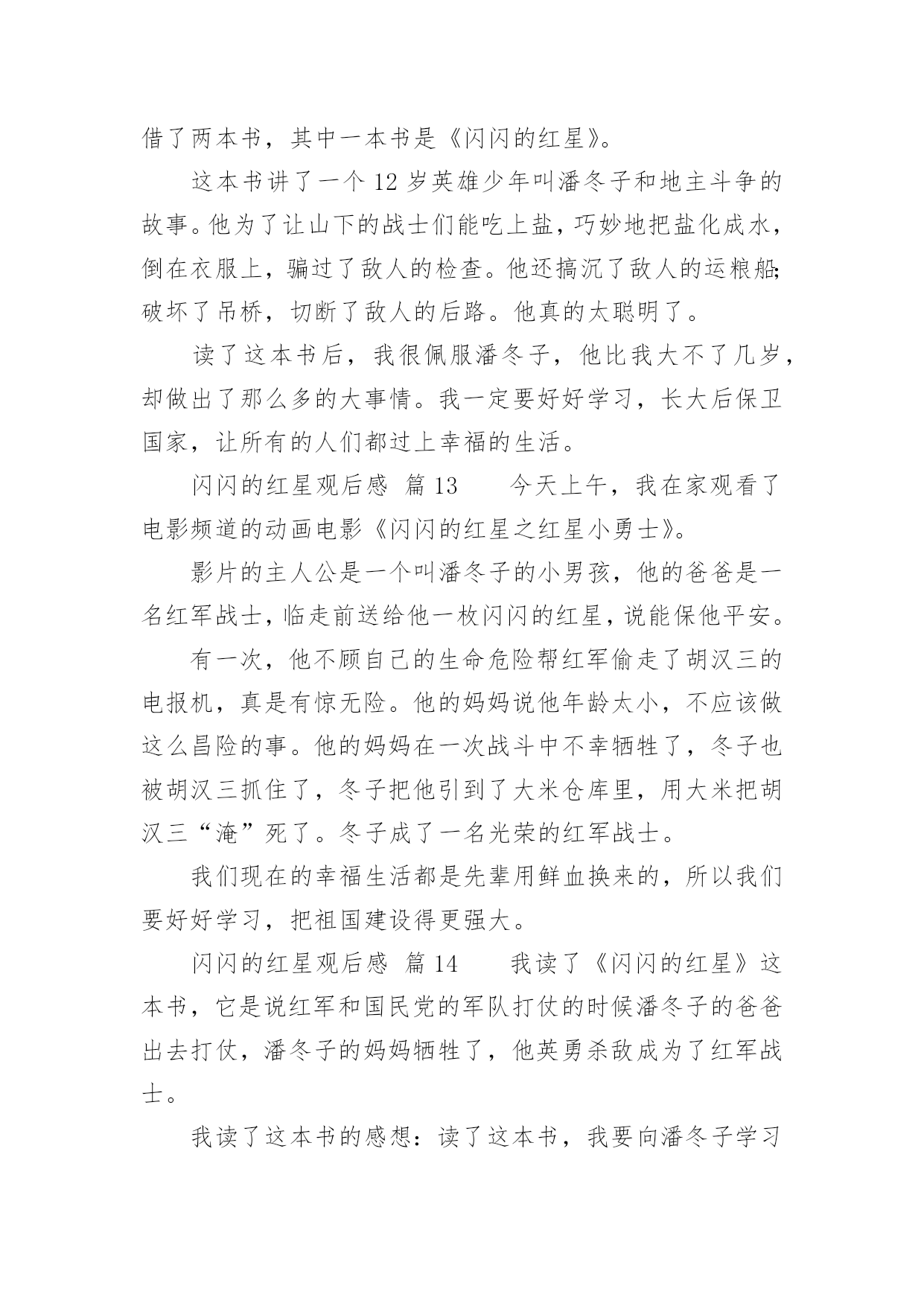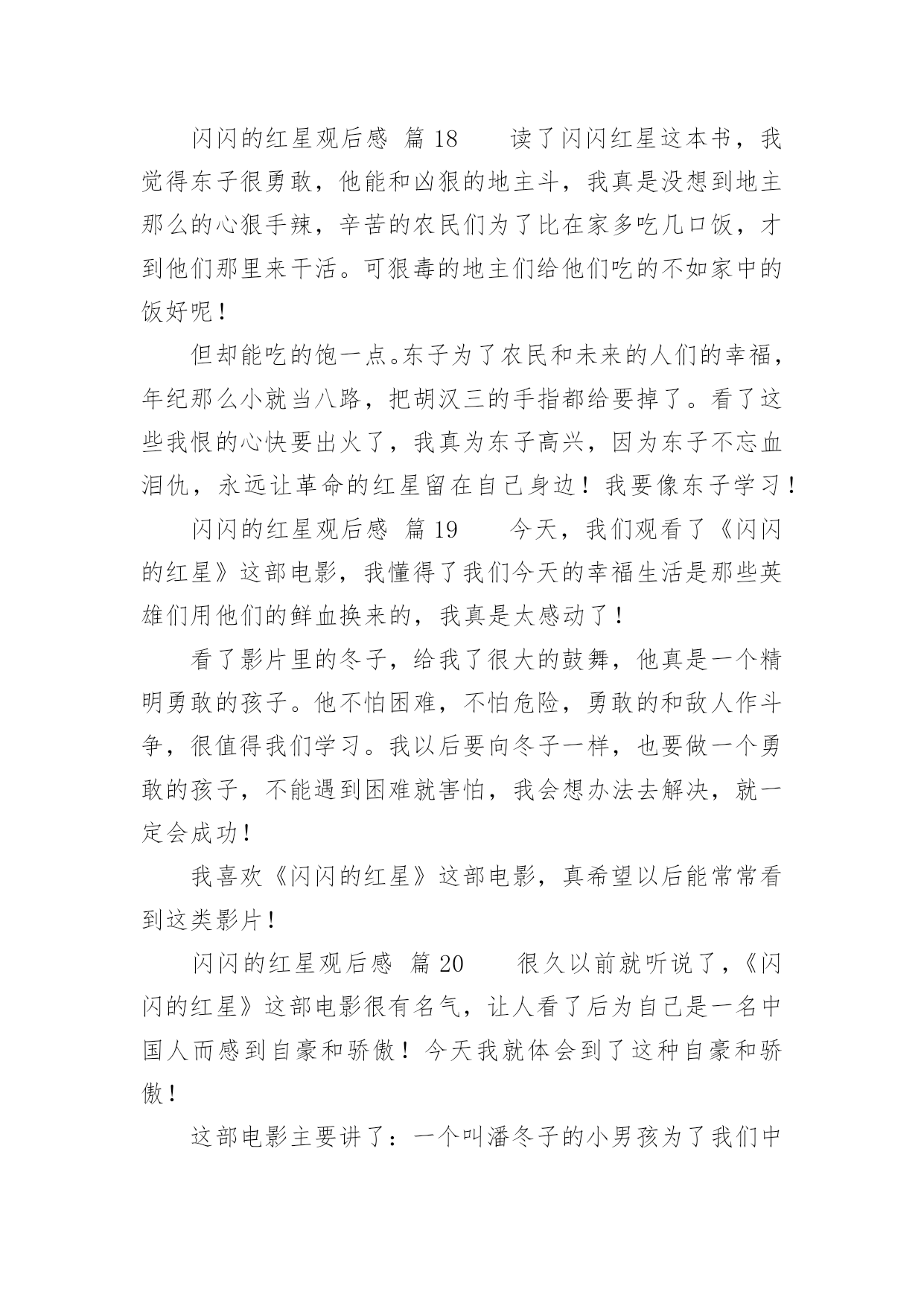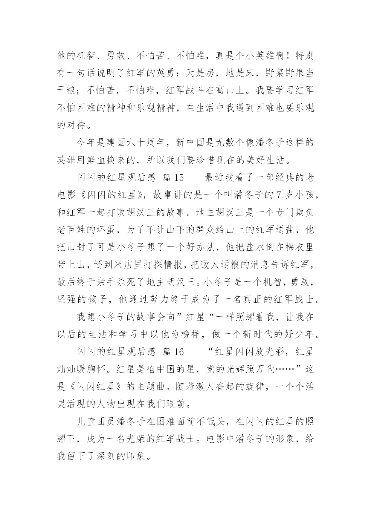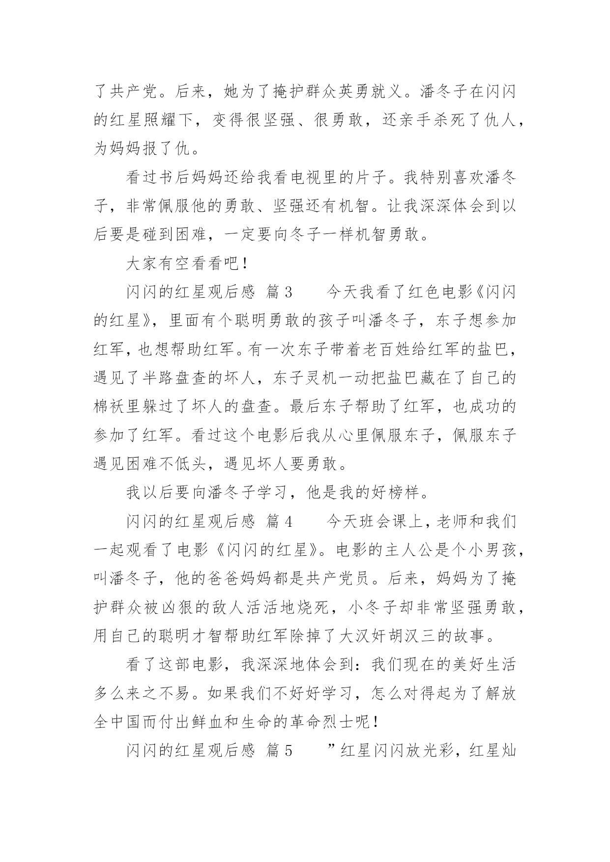 闪闪的红星观后感闪闪的红星观后感(精选29篇)在观看完一部作品以后,相信大家有很多值得分享的东西吧,需要回过头来写一写观后感了。那么你真的会写观后感吗?以下是小编收集整理的闪闪的红星观后感,仅供参考,欢迎大家阅读。闪闪的红星观后感篇1今天,我们观看了一部关于抗战的电影。我觉得这部电影里的主人公潘冬子是一个敢于斗争的人,他在米仓里和坏蛋胡汉三作战。最后,坏蛋胡汉三被米给埋住了。看了《闪闪的红星》以后,我从主人公潘冬子身上学到了勇敢、坚强、自信和乐观去面对生活的这种精神。潘冬子非常坚强,母亲为了保护红军而牺牲了。他虽然很伤心,但是也没有放弃保护家乡的责任。他为了保护自己的家乡可以不顾生命危险,去汉奸胡汉三家里把电报机偷来,潘冬子的勇气感动了我。通过这部电影,我以后要向潘冬子学习。在以后的生活中,我们要学习潘冬子的精神,只要有这样,才能把事情做成功。闪闪的红星观后感篇2我很喜欢《闪闪的红星》这本书,里面讲的是冬子的爸爸潘行义,原来是个赤卫队长。后来跟着红军主力部队转移,留给冬子一颗红星。冬子的妈妈也是个积极分子,常常帮助游击队,还参加了共产党。后来,她为了掩护群众英勇就义。潘冬子在闪闪的红星照耀下,变得很坚强、很勇敢,还亲手杀死了仇人,为妈妈报了仇。看过书后妈妈还给我看电视里的片子。我特别喜欢潘冬子,非常佩服他的勇敢、坚强还有机智。让我深深体会到以后要是碰到困难,一定要向冬子一样机智勇敢。大家有空看看吧!闪闪的红星观后感篇3今天我看了红色电影《闪闪的红星》,里面有个聪明勇敢的孩子叫潘冬子,东子想参加红军,也想帮助红军。有一次东子带着老百姓给红军的盐巴,遇见了半路盘查的坏人,东子灵机一动把盐巴藏在了自己的棉袄里躲过了坏人的盘查。最后东子帮助了红军,也成功的参加了红军。看过这个电影后我从心里佩服东子,佩服东子遇见困难不低头,遇见坏人要勇敢。我以后要向潘冬子学习,他是我的好榜样。闪闪的红星观后感篇4今天班会课上,老师和我们一起观看了电影《闪闪的红星》。电影的主人公是个小男孩,叫潘冬子,他的爸爸妈妈都是共产党员。后来,妈妈为了掩护群众被凶狠的敌人活活地烧死,小冬子却非常坚强勇敢,用自己的聪明才智帮助红军除掉了大汉奸胡汉三的故事。看了这部电影,我深深地体会到:我们现在的美好生活多么来之不易。如果我们不好好学习,怎么对得起为了解放全中国而付出鲜血和生命的革命烈士呢!闪闪的红星观后感篇5”红星闪闪放光彩,红星灿灿暖胸怀……“一首充满斗志的《红星歌》在一年级刚入学时就陪伴着我,一直到今天。这首《红星歌》是电影《闪闪的红星》主题曲,今天我观看了《闪闪的红星》,学到了许多知识。《闪闪的红星》讲述的是一个叫潘东子的男孩一心想参加红军的故事。潘东子的父亲是一个光荣的红军战士,潘冬子受到父亲的影响,为了参加红军,与敌人斗智斗勇,最终取得胜利。我们要向潘东子学习哟!闪闪的红星观后感篇6身为国家的人,就应该忠于国家,这就是闪闪红星的奥义。自从看了《闪闪的红星》这部电影,知道了电影里的人物:潘冬子。这是个能屈能伸的小英雄,在电影里体现出了机智勇敢,在坏蛋面前不畏害怕,更对祖国的忠心耿耿。凭他的智慧与勇气,一定能成为一名很出色的红军战士。身为党的人,就应该一心一意忠于党,不管受到敌人怎样的虐待,一定要能屈能伸。身为党的人,不能做背叛祖国的事,不能昧着良心做事,身为党的人,就应该多做一此能帮助祖国的事,使国家更加繁荣昌盛,使人民安居乐业。这些道理,都是闪闪红星这部电影让我懂得的。闪闪的红星观后感篇7今天我观看了《闪闪的红星》这部影片,这部影片主要讲了:从前有个小孩子叫”潘东子“,东子非常勤劳,他特别希望当上红军,先当上了儿童队员,立了很多功劳,他的妈妈也申请入党了,经过大家的团结努力,终于消灭了白狗子。东子终于见到了日夜思念的爸爸,最后终于实现了他的梦想,当上了红军!看了这部影片,我明白了做人要像东子一样勤劳、懂事,要有坚定不移的志向,要有不服输的精神,要有足够的机智勇敢,并向自己努力的方向奋进,只有这样才能实现自己的远大理想!闪闪的红星观后感篇8这部影片主要写了1931年主人公——潘冬子,为了消灭——胡汉三,与他展开了激烈、惊险的斗争,最后当上红军的一件事。《闪闪的红星》这部影片有一个情节使我非常感动,就是潘冬子的爸爸——潘行义,在和日本人作斗争时,中了子弹,必须尽快取子弹,但麻药只剩下了一瓶,他坚持不用麻药,但他在取子弹时,没有哼一声。我想要是换成了我早就鬼哭狼嚎了,所以不得不为潘冬子的爸爸的那种坚强意志而佩服。看完了这部电影后,我深深地感到我们的幸福生活是来之不易的,我应该珍惜现在的幸福生活,好好学习,不辜负爸爸、妈妈对我的期望。闪闪的红星观后感篇9妈妈以前给我讲过潘冬子的故事,在我心目中潘冬子非常勇敢。今天在学校里看电影《闪闪的红星》时,我仿佛已经进入了电