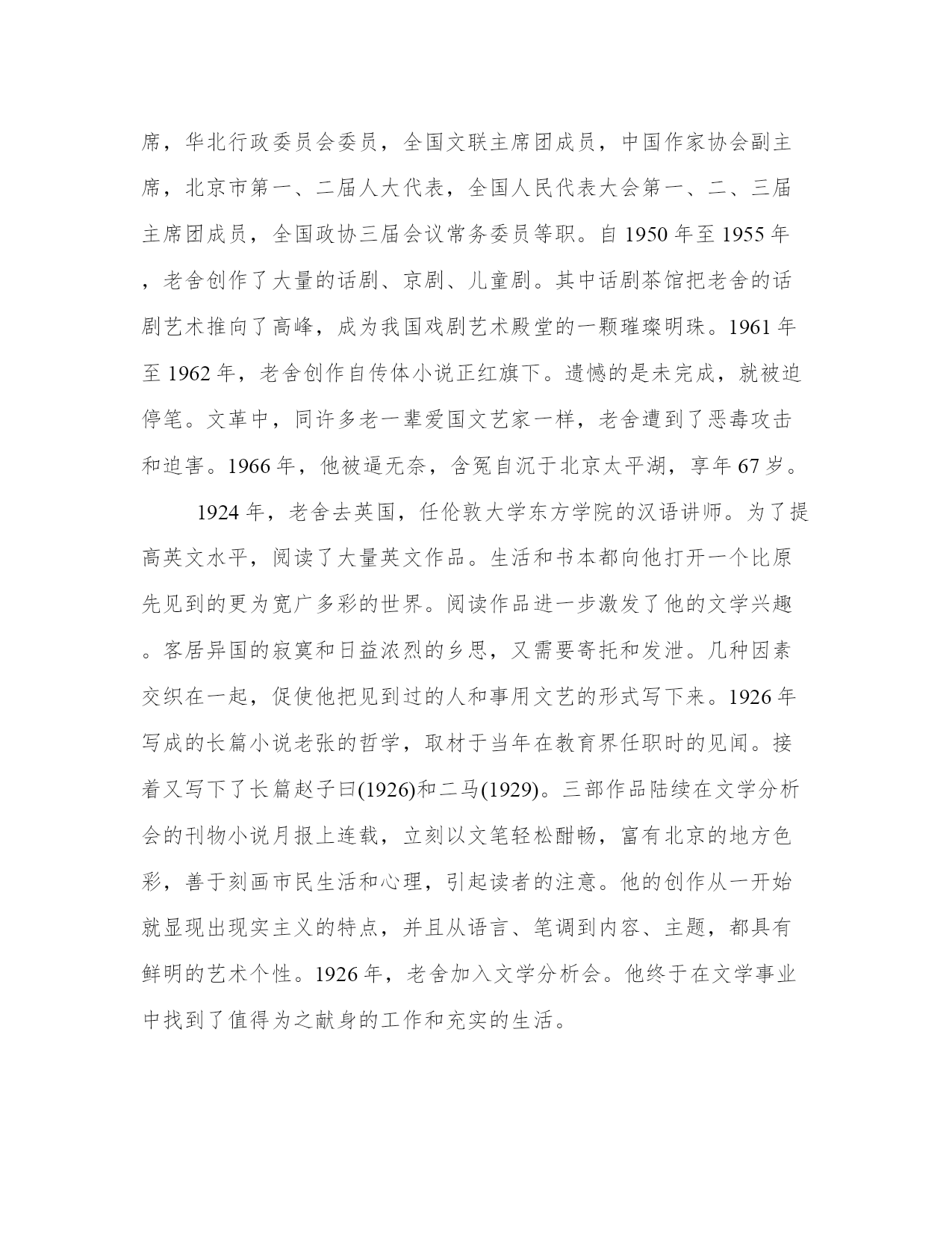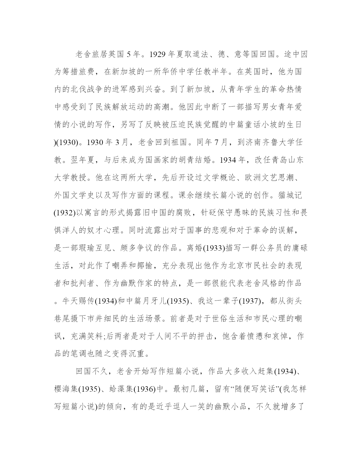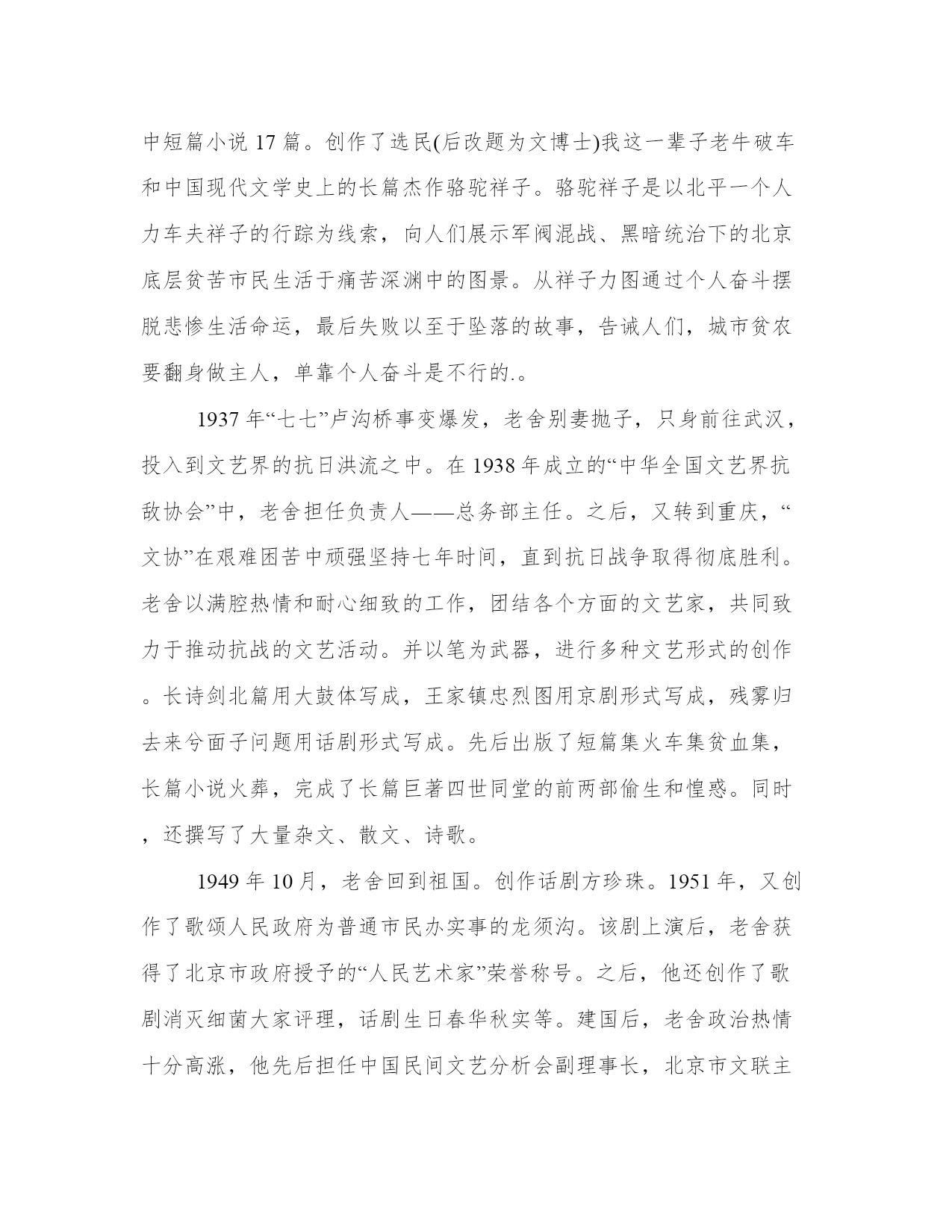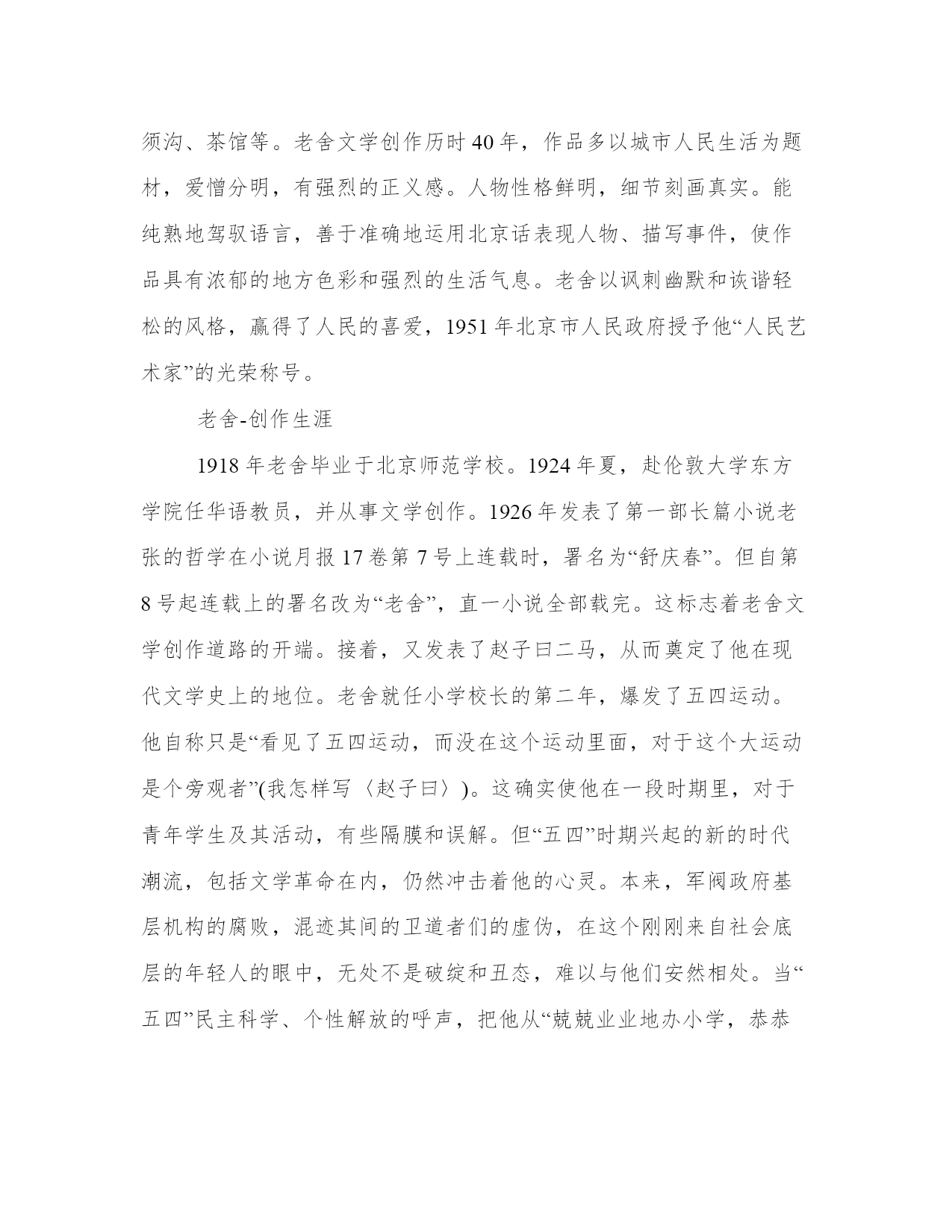 老舍简介资料大全老舍-简介老舍,满族,原名舒庆春,字舍予,生于北京。父亲是一名满族的护军,阵亡在八国联军攻打北京城的炮火中。母亲也是旗人。靠替人洗衣裳做活计维持一家人的生活。1934年夏到青岛山东大学任中国文学系教授。1936年夏辞去教职,专事文学创作。抗日战争爆发后,到武汉、重庆主持中华全国文艺界抗敌协会的工作,任常务理事、总务组长,并组织出版会刊抗战文艺。1946年3月应美国国务院邀请赴美讲学一年,期满后,留美写作。1949年底返回北京。曾任政务院文教委员会委员、政协全国委员会常务委员、中国文联副主席、中国作家协会副主席及书记处书记、中国民间文艺分析会副主席、中国剧协和中国曲协理事、北京市文联主席等职。1966年被“四人帮”迫害致死。老舍一生勤奋笔耕,创作甚丰,20世纪30年代就成为最有成就的作家之一,著有长篇小说小坡的生日、猫城记、离婚、牛天赐传、骆驼祥子等,短篇小说集赶集等。其骆驼祥子问世后蜚声文坛,曾先后被译成十几种外文。40年代的作品有:长篇小说火葬、四世同堂等,中篇小说我这一辈子,短篇小说集贫血集、月牙集,以及通俗文艺作品集三四一等。中华人民共和国建立后的作品,主要有长篇小说正红旗下,长篇报告文学无名高地有了名,散文杂文集福星集,剧本龙须沟、茶馆等。老舍文学创作历时40年,作品多以城市人民生活为题材,爱憎分明,有强烈的正义感。人物性格鲜明,细节刻画真实。能纯熟地驾驭语言,善于准确地运用北京话表现人物、描写事件,使作品具有浓郁的地方色彩和强烈的生活气息。老舍以讽刺幽默和诙谐轻松的风格,赢得了人民的喜爱,1951年北京市人民政府授予他“人民艺术家”的光荣称号。老舍-创作生涯1918年老舍毕业于北京师范学校。1924年夏,赴伦敦大学东方学院任华语教员,并从事文学创作。1926年发表了第一部长篇小说老张的哲学在小说月报17卷第7号上连载时,署名为“舒庆春”。但自第8号起连载上的署名改为“老舍”,直一小说全部载完。这标志着老舍文学创作道路的开端。接着,又发表了赵子曰二马,从而奠定了他在现代文学史上的地位。老舍就任小学校长的第二年,爆发了五四运动。他自称只是“看见了五四运动,而没在这个运动里面,对于这个大运动是个旁观者”(我怎样写〈赵子曰〉)。这确实使他在一段时期里,对于青年学生及其活动,有些隔膜和误解。但“五四”时期兴起的新的时代潮流,包括文学革命在内,仍然冲击着他的心灵。本来,军阀政府基层机构的腐败,混迹其间的卫道者们的虚伪,在这个刚刚来自社会底层的年轻人的眼中,无处不是破绽和丑态,难以与他们安然相处。当“五四”民主科学、个性解放的呼声,把他从“兢兢业业地办小学,恭恭顺顺地侍奉老母,规规矩矩地结婚生子,如是而已”的人生信条中惊醒,他作出了新的抉择。1922年9月,老舍辞去所有职务,到以开明新派著称的天津南开学校中学部任国文教员,在那里写下了第一篇新文学习作小铃儿。在这以前,还坚决退掉母亲包办的婚约。次年回到北京,任顾孟余主持的北京教育会的文书,同时在第一中学兼课,业余时间到燕京大学旁听英文。一度还信仰过基督教。虽然道路不无曲折,但“五四”推动他进一步挣脱了封建的、世俗的羁绊,去寻求一种比他已经得到的更有意义的生活。1929年,老舍取道新加坡回国。在新加坡写了中篇小说小坡的生日,这是一部儿童文学作品,描写了生活在新加坡的华侨少年与各被压迫民族的小伙伴一起,反对强权奴役的故事,体现了团结奋斗、强国救民的思想境界。1930-1936年,老舍先后在山东济南齐鲁大学和青岛山东大学任教。此间,他看到第一次国内革命战争失败后日本帝国主义的肆意侵略和国民党反动派的卖国行径,创作了长篇小说大明湖,为济南人民以及所有蒙受侵略之苦的祖国人民抒发愤慨。在这部小说里,他第一次描写了共产党人的形象。此后四年,他先后创作了长篇小说猫城记、离婚、牛天赐传。还出版了包括黑白李微神等15部短篇小说在内的短篇小说集赶集以及幽默诗文集老舍幽默诗文集。1936年老舍辞职,从事专业写作。在青岛工作和生活的这段时期,是他一生中创作的旺盛期之一。他先后编了两个短篇集樱海集蛤藻集,收入中短篇小说17篇。创作了选民(后改题为文博士)我这一辈子老牛破车和中国现代文学史上的长篇杰作骆驼祥子。骆驼祥子是以北平一个人力车夫祥子的行踪为线索,向人们展示军阀混战、黑暗统治下的北京底层贫苦市民生活于痛苦深渊中的图景。从祥子力图通过个人奋斗摆脱悲惨生活命运,最后失败以至于坠落的故事,告诫人们,城市贫农要翻身做主人,单靠个人奋斗是不行的.。1937年“七七”卢沟桥事变爆发,老舍别妻抛子,只身前往武汉,投入到文艺界的抗日洪流之中。在1938年成立的“中华全国文艺界抗敌协会”中,老舍担任负责人――总务部主任。之后,又转到重庆,“文协”在艰难困苦中顽强坚持七年时间,直到抗日战