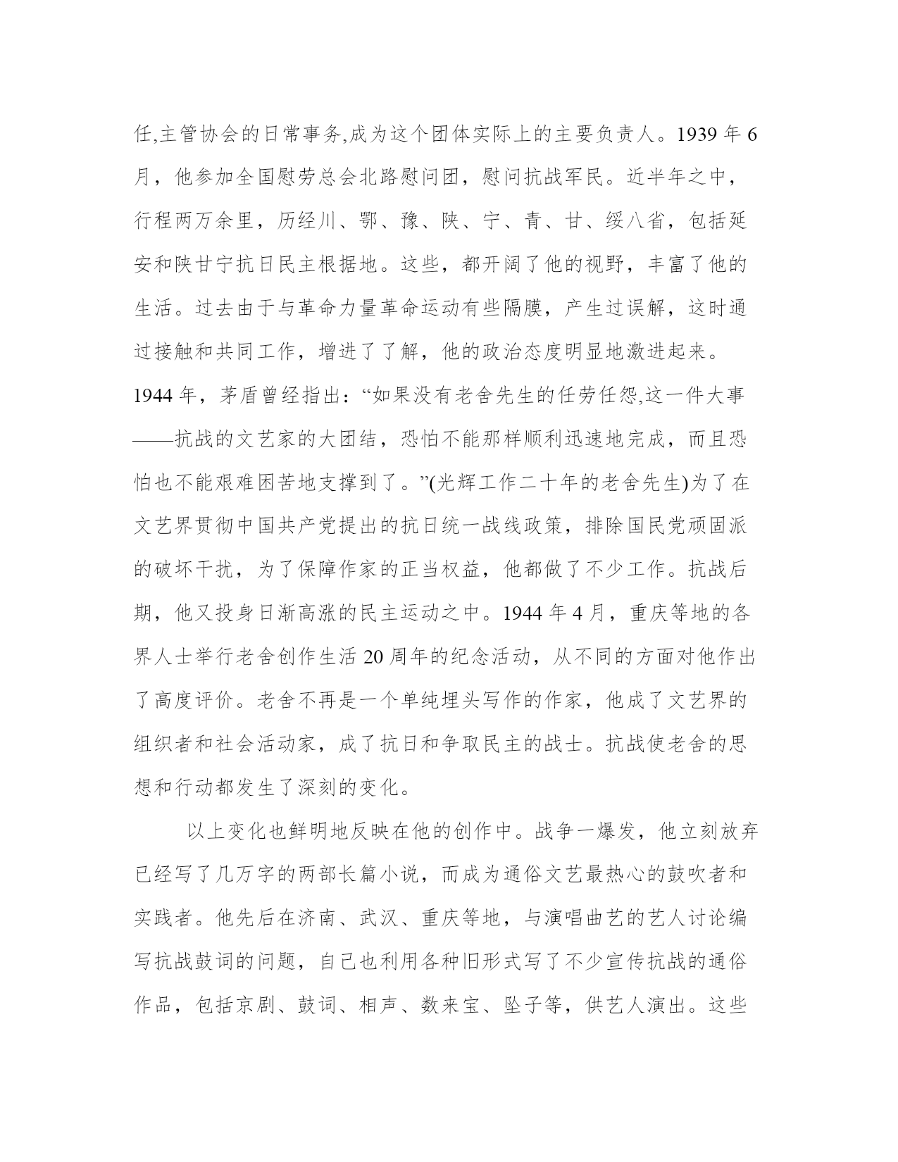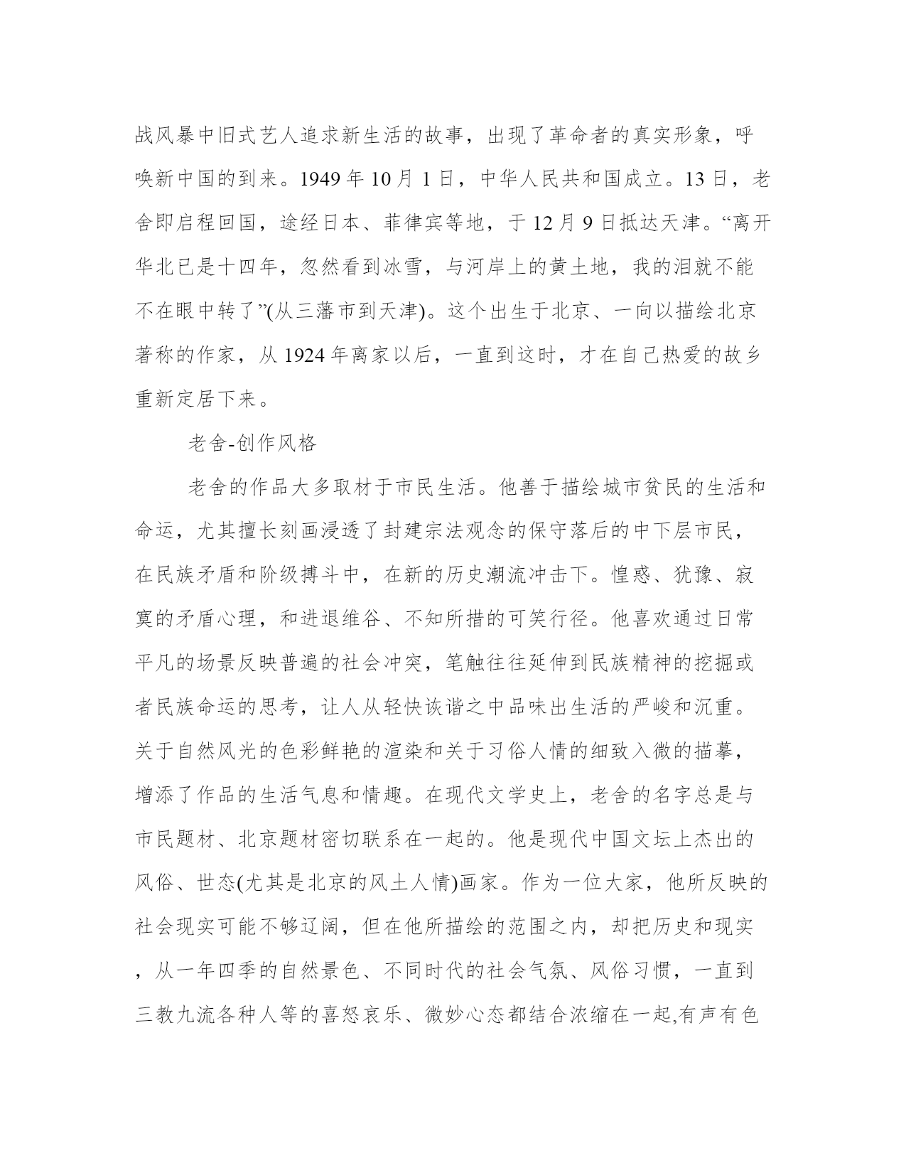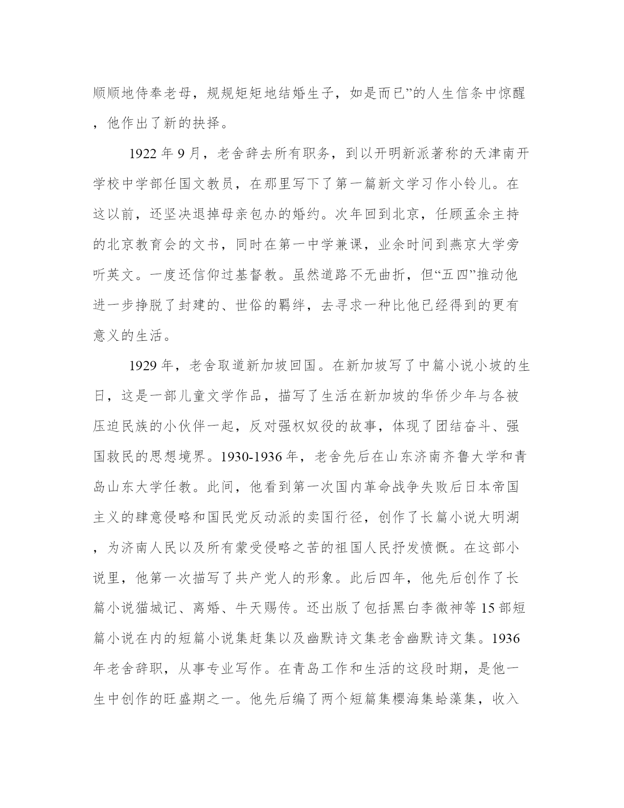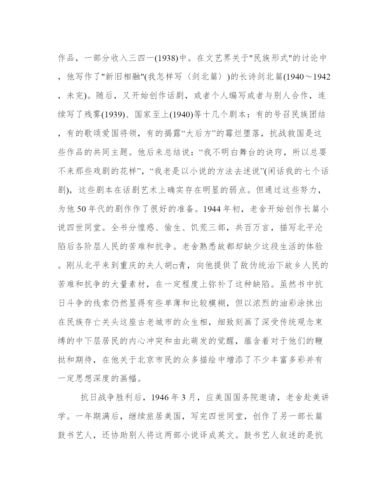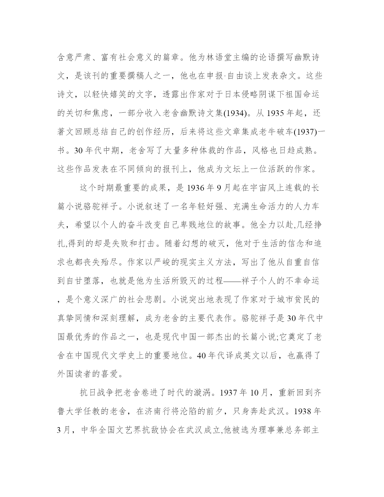 老舍简介资料大全老舍-简介老舍,满族,原名舒庆春,字舍予,生于北京。父亲是一名满族的护军,阵亡在八国联军攻打北京城的炮火中。母亲也是旗人。靠替人洗衣裳做活计维持一家人的生活。1934年夏到青岛山东大学任中国文学系教授。1936年夏辞去教职,专事文学创作。抗日战争爆发后,到武汉、重庆主持中华全国文艺界抗敌协会的工作,任常务理事、总务组长,并组织出版会刊抗战文艺。1946年3月应美国国务院邀请赴美讲学一年,期满后,留美写作。1949年底返回北京。曾任政务院文教委员会委员、政协全国委员会常务委员、中国文联副主席、中国作家协会副主席及书记处书记、中国民间文艺分析会副主席、中国剧协和中国曲协理事、北京市文联主席等职。1966年被“四人帮”迫害致死。老舍一生勤奋笔耕,创作甚丰,20世纪30年代就成为最有成就的作家之一,著有长篇小说小坡的生日、猫城记、离婚、牛天赐传、骆驼祥子等,短篇小说集赶集等。其骆驼祥子问世后蜚声文坛,曾先后被译成十几种外文。40年代的作品有:长篇小说火葬、四世同堂等,中篇小说我这一辈子,短篇小说集贫血集、月牙集,以及通俗文艺作品集三四一等。中华人民共和国建立后的作品,主要有长篇小说正红旗下,长篇报告文学无名高地有了名,散文杂文集福星集,剧本龙须沟、茶馆等。老舍文学创作历时40年,作品多以城市人民生活为题材,爱憎分明,有强烈的正义感。人物性格鲜明,细节刻画真实。能纯熟地驾驭语言,善于准确地运用北京话表现人物、描写事件,使作品具有浓郁的地方色彩和强烈的生活气息。老舍以讽刺幽默和诙谐轻松的风格,赢得了人民的喜爱,1951年北京市人民政府授予他“人民艺术家”的光荣称号。老舍-创作生涯1918年老舍毕业于北京师范学校。1924年夏,赴伦敦大学东方学院任华语教员,并从事文学创作。1926年发表了第一部长篇小说老张的哲学在小说月报17卷第7号上连载时,署名为“舒庆春”。但自第8号起连载上的署名改为“老舍”,直一小说全部载完。这标志着老舍文学创作道路的开端。接着,又发表了赵子曰二马,从而奠定了他在现代文学史上的地位。老舍就任小学校长的第二年,爆发了五四运动。他自称只是“看见了五四运动,而没在这个运动里面,对于这个大运动是个旁观者”(我怎样写〈赵子曰〉)。这确实使他在一段时期里,对于青年学生及其活动,有些隔膜和误解。但“五四”时期兴起的新的时代潮流,包括文学革命在内,仍然冲击着他的心灵。本来,军阀政府基层机构的腐败,混迹其间的卫道者们的虚伪,在这个刚刚来自社会底层的年轻人的眼中,无处不是破绽和丑态,难以与他们安然相处。当“五四”民主科学、个性解放的呼声,把他从“兢兢业业地办小学,恭恭顺顺地侍奉老母,规规矩矩地结婚生子,如是而已”的人生信条中惊醒,他作出了新的抉择。1922年9月,老舍辞去所有职务,到以开明新派著称的天津南开学校中学部任国文教员,在那里写下了第一篇新文学习作小铃儿。在这以前,还坚决退掉母亲包办的婚约。次年回到北京,任顾孟余主持的北京教育会的文书,同时在第一中学兼课,业余时间到燕京大学旁听英文。一度还信仰过基督教。虽然道路不无曲折,但“五四”推动他进一步挣脱了封建的、世俗的羁绊,去寻求一种比他已经得到的更有意义的生活。1929年,老舍取道新加坡回国。在新加坡写了中篇小说小坡的生日,这是一部儿童文学作品,描写了生活在新加坡的华侨少年与各被压迫民族的小伙伴一起,反对强权奴役的故事,体现了团结奋斗、强国救民的思想境界。1930-1936年,老舍先后在山东济南齐鲁大学和青岛山东大学任教。此间,他看到第一次国内革命战争失败后日本帝国主义的肆意侵略和国民党反动派的卖国行径,创作了长篇小说大明湖,为济南人民以及所有蒙受侵略之苦的祖国人民抒发愤慨。在这部小说里,他第一次描写了共产党人的形象。此后四年,他先后创作了长篇小说猫城记、离婚、牛天赐传。还出版了包括黑白李微神等15部短篇小说在内的短篇小说集赶集以及幽默诗文集老舍幽默诗文集。1936年老舍辞职,从事专业写作。在青岛工作和生活的这段时期,是他一生中创作的旺盛期之一。他先后编了两个短篇集樱海集蛤藻集,收入中短篇小说17篇。创作了选民(后改题为文博士)我这一辈子老牛破车和中国现代文学史上的长篇杰作骆驼祥子。骆驼祥子是以北平一个人力车夫祥子的行踪为线索,向人们展示军阀混战、黑暗统治下的北京底层贫苦市民生活于痛苦深渊中的图景。从祥子力图通过个人奋斗摆脱悲惨生活命运,最后失败以至于坠落的故事,告诫人们,城市贫农要翻身做主人,单靠个人奋斗是不行的.。1937年“七七”卢沟桥事变爆发,老舍别妻抛子,只身前往武汉,投入到文艺界的抗日洪流之中。在1938年成立的“中华全国文艺界抗敌协会”中,老舍担任负责人――总务部主任。之后,又转到重庆,“文协”在艰难困苦中顽强坚持七年时间,直到抗日战