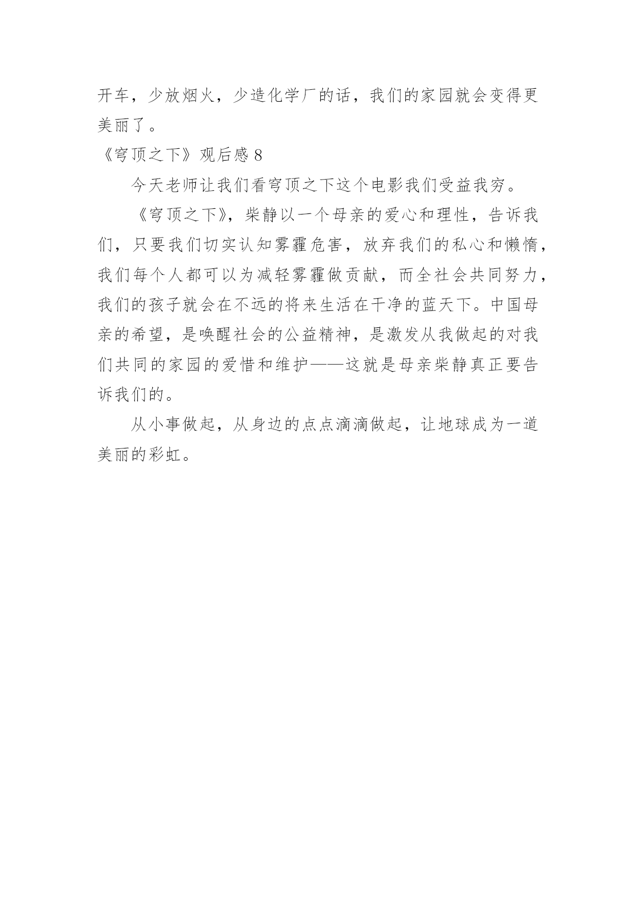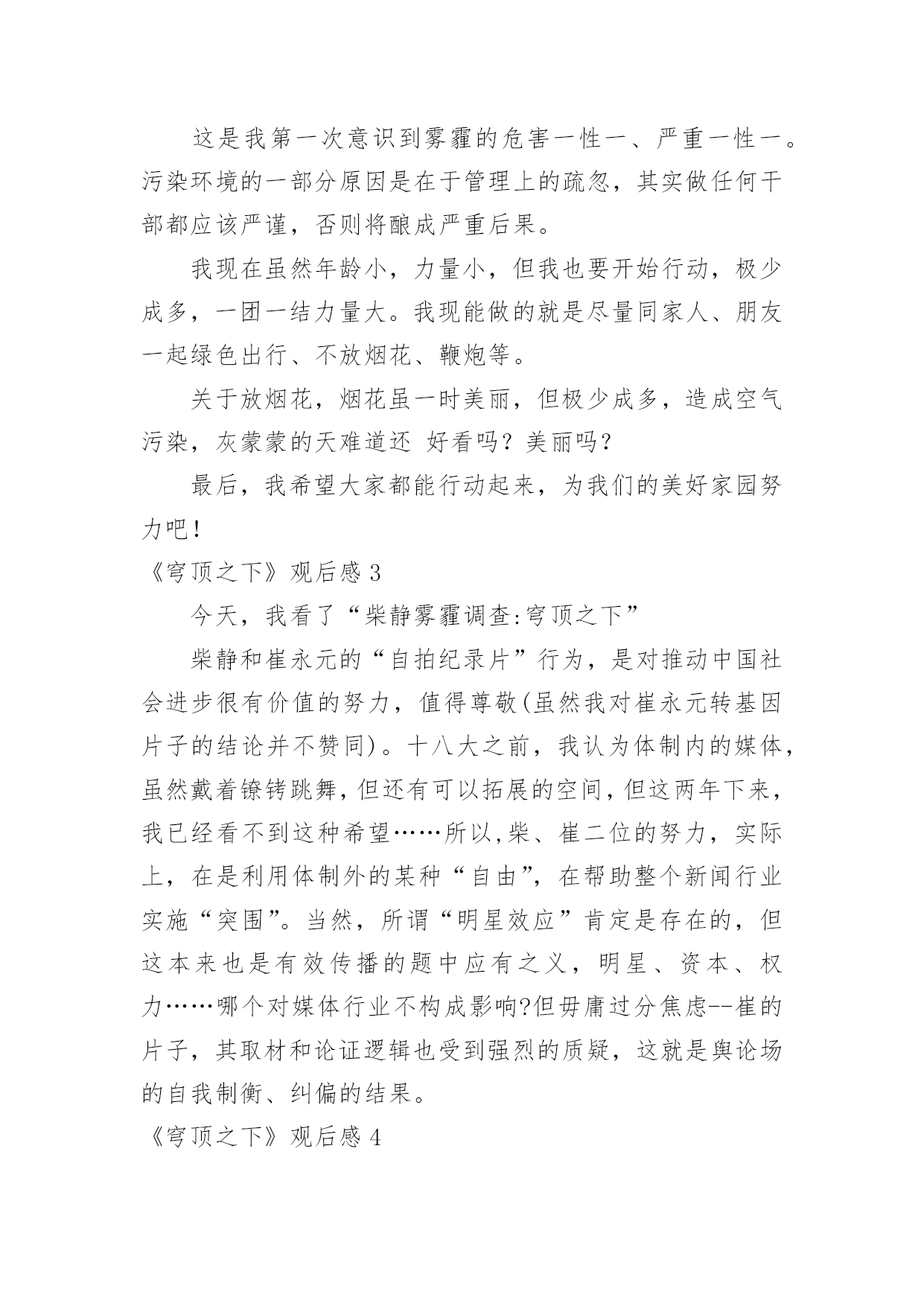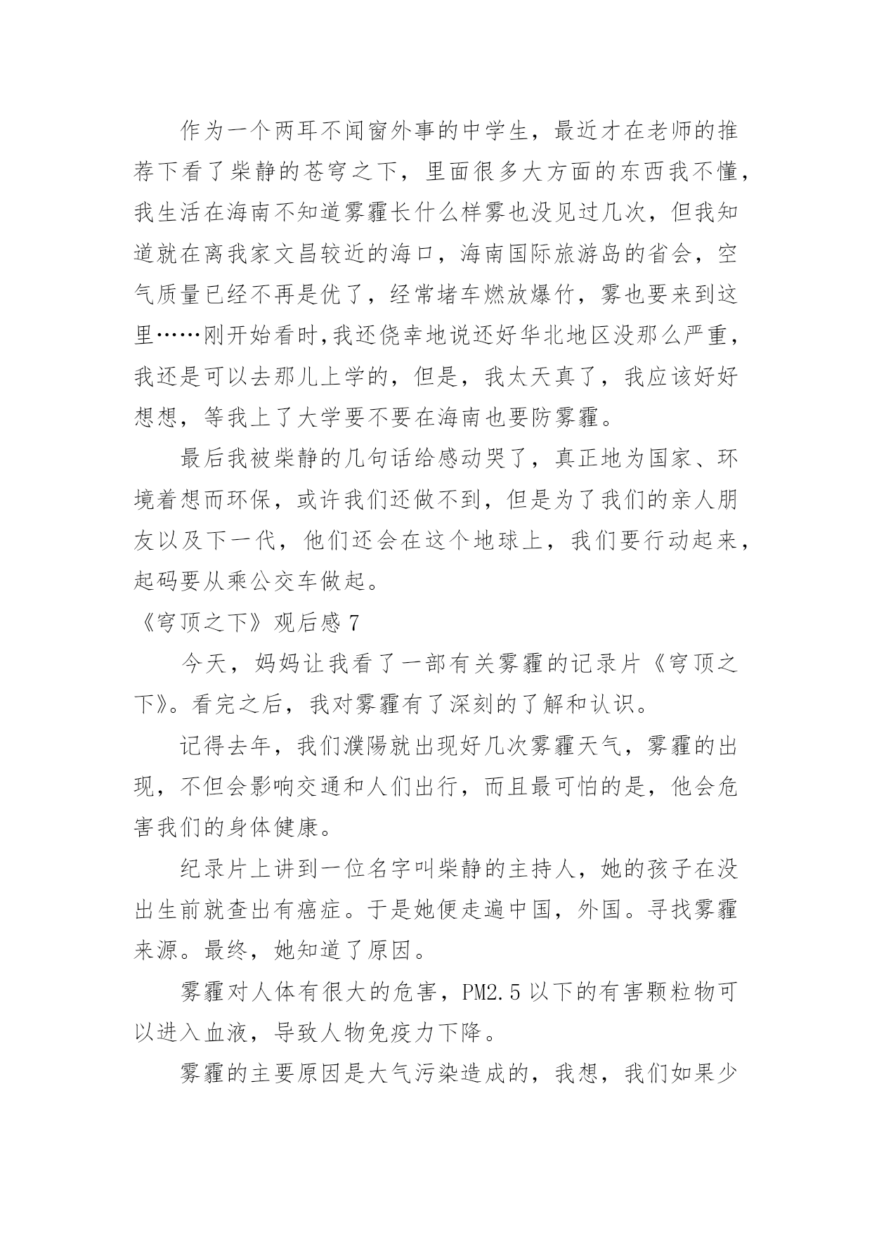 《穹顶之下》观后感《穹顶之下》观后感认真品味一部作品后,从中我们收获新的思想,让我们好好写份观后感,把你的收获感想写下来吧。观后感你想好怎么写了吗?以下是小编为大家整理的《穹顶之下》观后感,仅供参考,大家一起来看看吧。《穹顶之下》观后感1雾霾是这几年才出现在我们的眼帘中的,几乎成为了生活常态,可,这样正常吗?不正常!因为这是以我们生命健康为代价的!每次发生雾霾时我都在默默祈祷着来一阵风将霾吹走,但是,吹跑了一次还会有下一次,因为雾霾已不是个偶发事件了,它依然会频频发生,而且,这还只是一个开始。我作为一个普通的人,一个普通的山东居民,一个普通的中国人民,我希望我们能够生活在蓝天白云之下,能够自由的散步、呼吸,我无法为治理雾霾做更多的事情,但是我希望有更多的人看到这个片子,我一人的力量很薄弱,那十几亿人的力量呢?《穹顶之下》观后感2我看了后觉得很惊讶,我们中国竟然如此污染严重,我们每天生活在雾霾中,却浑然不知。这是我第一次意识到雾霾的危害一性一、严重一性一。污染环境的一部分原因是在于管理上的疏忽,其实做任何干部都应该严谨,否则将酿成严重后果。我现在虽然年龄小,力量小,但我也要开始行动,极少成多,一团一结力量大。我现能做的就是尽量同家人、朋友一起绿色出行、不放烟花、鞭炮等。关于放烟花,烟花虽一时美丽,但极少成多,造成空气污染,灰蒙蒙的天难道还好看吗?美丽吗?最后,我希望大家都能行动起来,为我们的美好家园努力吧!《穹顶之下》观后感3今天,我看了“柴静雾霾调查:穹顶之下”柴静和崔永元的“自拍纪录片”行为,是对推动中国社会进步很有价值的努力,值得尊敬(虽然我对崔永元转基因片子的结论并不赞同)。十八大之前,我认为体制内的媒体,虽然戴着镣铐跳舞,但还有可以拓展的空间,但这两年下来,我已经看不到这种希望……所以,柴、崔二位的努力,实际上,在是利用体制外的某种“自由”,在帮助整个新闻行业实施“突围”。当然,所谓“明星效应”肯定是存在的,但这本来也是有效传播的题中应有之义,明星、资本、权力……哪个对媒体行业不构成影响?但毋庸过分焦虑--崔的片子,其取材和论证逻辑也受到强烈的质疑,这就是舆论场的自我制衡、纠偏的结果。《穹顶之下》观后感4国务院,部委,局,司,处,科员。庞大冗杂的公务体制,有那么多的官员。清华北大社科院那么多的专家学者。还是有那么多的良心群众,在为我们的环境保护做出研究和贡献,向所有有良知的官员和学者表示致敬。国家这么大,每一项制度的出台背后都颇有深意和调研决策,希望国泰民安。或许有一天我也会有我的孩子,那个时候我会给他我的全部,给他全世界。可我能不能做到,此时,此刻,此地,此身,就从现在做起。同呼吸,共命运。从自我做起,节能减排。《穹顶之下》观后感5今天,我们看了穹顶之下,我们知道了我们生活在病菌的环境里。在pm2.5中至少有15种致癌物,他们会慢慢到人的肺部,这时pm2.5遇到了敌人一肺泡,一个人的肺泡有3亿多个但是,pm2.5被肺泡‘’吃‘’掉后,会把肺泡爆了。因肺癌死去的人一年有1万2千人,每一pm2.5就有305.91微克,我国每年造煤36亿吨,其中3亿吨在河北,在煤的排行榜事这样的'中国第一,河北第二,唐山第三,美国第四,到了冬季大气中的致癌物是夏季的25倍,在哈尔滨,每6小时亿吨。听了这么多惊人的报告,我们也头涔涔而泪潸潸了,所以大家一定要创造更蓝的明天。《穹顶之下》观后感6作为一个两耳不闻窗外事的中学生,最近才在老师的推荐下看了柴静的苍穹之下,里面很多大方面的东西我不懂,我生活在海南不知道雾霾长什么样雾也没见过几次,但我知道就在离我家文昌较近的海口,海南国际旅游岛的省会,空气质量已经不再是优了,经常堵车燃放爆竹,雾也要来到这里……刚开始看时,我还侥幸地说还好华北地区没那么严重,我还是可以去那儿上学的,但是,我太天真了,我应该好好想想,等我上了大学要不要在海南也要防雾霾。最后我被柴静的几句话给感动哭了,真正地为国家、环境着想而环保,或许我们还做不到,但是为了我们的亲人朋友以及下一代,他们还会在这个地球上,我们要行动起来,起码要从乘公交车做起。《穹顶之下》观后感7今天,妈妈让我看了一部有关雾霾的记录片《穹顶之下》。看完之后,我对雾霾有了深刻的了解和认识。记得去年,我们濮陽就出现好几次雾霾天气,雾霾的出现,不但会影响交通和人们出行,而且最可怕的是,他会危害我们的身体健康。纪录片上讲到一位名字叫柴静的主持人,她的孩子在没出生前就查出有癌症。于是她便走遍中国,外国。寻找雾霾来源。最终,她知道了原因。雾霾对人体有很大的危害,PM2.5以下的有害颗粒物可以进入血液,导致人物免疫力下降。雾霾的主要原因是大气污染造成的,我想,我们如果少开车,少放烟火,少造化学厂的话,我们的家园就会变得更美丽了。《穹顶之下》观后感8今天老师让我们看穹顶