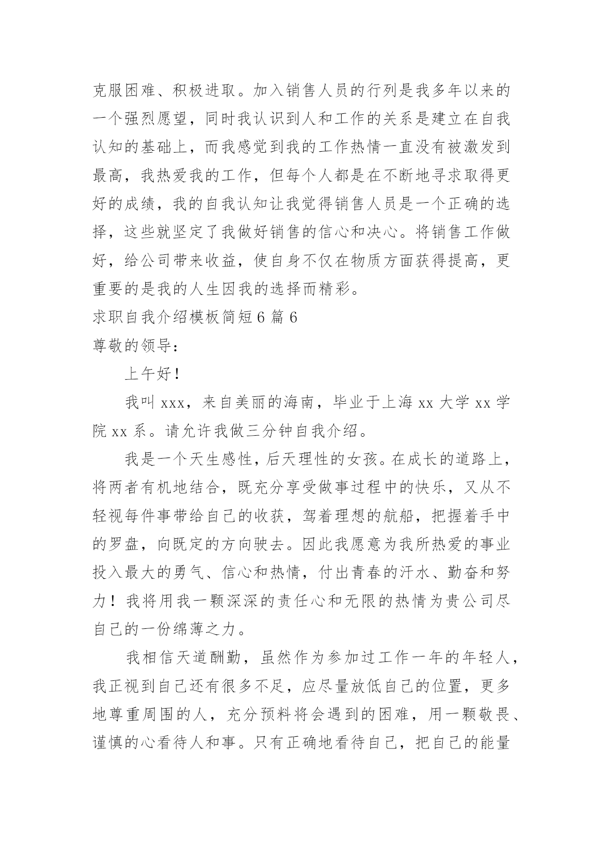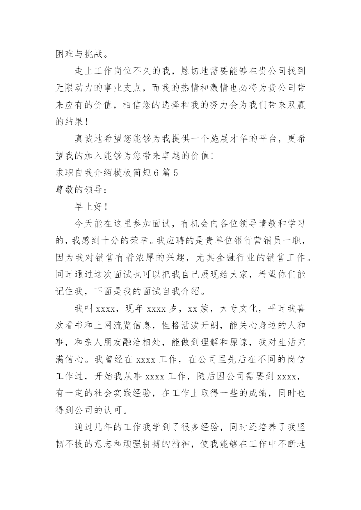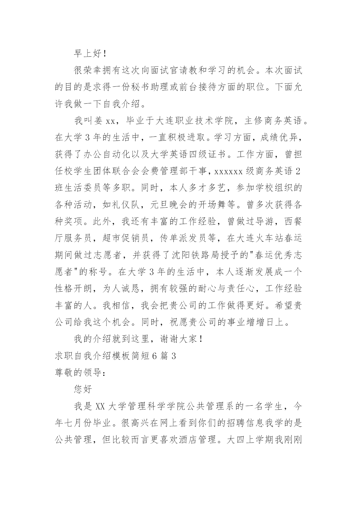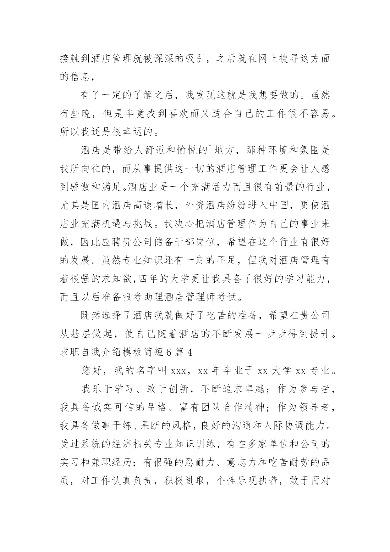 求职自我介绍简短求职自我介绍模板简短6篇当碰到陌生人时候,时常需要用到自我介绍,自我介绍可以拉近我们与陌生人的关系。那要怎么写好自我介绍呢?下面是小编整理的求职自我介绍模板简短6篇,欢迎大家借鉴与参考,希望对大家有所帮助。求职自我介绍模板简短6篇1我的名字叫xxx,今年27岁,毕业于xxx学校,我出生于风景秀美的边陲小城--临江,x20xx年我以优异的成绩考入了吉林工业大学经济管理学院,从此翻开了我人生新的篇章.入学以来我一向担任班级的团支书,繁忙的工作不仅仅培养和锻炼了我的工作潜力,更加锻炼了我解决问题的潜力我的专业是会计,本科学历,大学四年我已经顺利透过英语四级考试,取得了会计电算化和会计从业资格证书,努力学习关于财务的每门学科,能熟练运用计算机,在过去的2年中一向就职于xxx公司,从事过出纳、结算会计等工作,对财务管理流程及纳税申报工作有相当丰富的经验,熟练掌握各种财务软件,对工作充满热情,一向坚持专业知识的学习,并打算在今年内一次性透过会计中级考试。求职自我介绍模板简短6篇2尊敬的各位领导,各位面试官:早上好!很荣幸拥有这次向面试官请教和学习的机会。本次面试的目的是求得一份秘书助理或前台接待方面的职位。下面允许我做一下自我介绍。我叫姜xx,毕业于大连职业技术学院,主修商务英语。在大学3年的生活中,一直积极进取。学习方面,成绩优异,获得了办公自动化以及大学英语四级证书。工作方面,曾担任校学生团体联合会会费管理部干事,xxxxxx级商务英语2班生活委员等多职。同时,本人多才多艺,参加学校组织的各种活动,如礼仪队,元旦晚会的开场舞等。曾多次获得各种奖项。此外,我还有丰富的工作经验,曾做过导游,西餐厅服务员,超市促销员,传单派发员等,在大连火车站春运期间做过志愿者,并获得了沈阳铁路局授予的"春运优秀志愿者"的称号。在大学3年的生活中,本人逐渐发展成一个性格开朗,为人诚恳,拥有较强的耐心与责任心,工作经验丰富的人。我相信,我会把贵公司的工作做得更好。希望贵公司给我这个机会。同时,祝愿贵公司的事业增增日上。我的介绍就到这里,谢谢大家!求职自我介绍模板简短6篇3尊敬的领导:您好我是XX大学管理科学学院公共管理系的一名学生,今年七月份毕业。很高兴在网上看到你们的招聘信息我学的是公共管理,但比较而言更喜欢酒店管理。大四上学期我刚刚接触到酒店管理就被深深的吸引,之后就在网上搜寻这方面的信息,有了一定的了解之后,我发现这就是我想要做的。虽然有些晚,但是毕竟找到喜欢而又适合自己的工作很不容易。所以我还是很幸运的。酒店是带给人舒适和愉悦的`地方,那种环境和氛围是我所向往的,而从事提供这一切的酒店管理工作更会让人感到骄傲和满足。酒店业是一个充满活力而且很有前景的行业,尤其是国内酒店高速增长,外资酒店纷纷进入中国,更使酒店业充满机遇与挑战。我决心把酒店管理作为自己的事业来做,因此应聘贵公司储备干部岗位,希望在这个行业有很好的发展。虽然专业知识还有一定的不足,但我对酒店管理有着很强的求知欲,四年的大学更让我具备了很好的学习能力,而且以后准备报考助理酒店管理师考试。既然选择了酒店我就做好了吃苦的准备,希望在贵公司从基层做起,使自己随着酒店的不断发展一步步得到提升。求职自我介绍模板简短6篇4您好,我的名字叫xxx,xx年毕业于xx大学xx专业。我乐于学习、敢于创新,不断追求卓越;作为参与者,我具备诚实可信的品格、富有团队合作精神;作为领导者,我具备做事干练、果断的风格,良好的沟通和人际协调能力。受过系统的经济相关专业知识训练,有在多家单位和公司的实习和兼职经历;有很强的忍耐力、意志力和吃苦耐劳的品质,对工作认真负责,积极进取,个性乐观执着,敢于面对困难与挑战。走上工作岗位不久的我,恳切地需要能够在贵公司找到无限动力的事业支点,而我的热情和激情也必将为贵公司带来应有的价值,相信您的选择和我的努力会为我们带来双赢的结果!真诚地希望您能够为我提供一个施展才华的平台,更希望我的加入能够为您带来卓越的价值!求职自我介绍模板简短6篇5尊敬的领导:早上好!今天能在这里参加面试,有机会向各位领导请教和学习的,我感到十分的荣幸。我应聘的是贵单位银行营销员一职,因为我对销售有着浓厚的兴趣,尤其金融行业的销售工作。同时通过这次面试也可以把我自己展现给大家,希望你们能记住我,下面是我的面试自我介绍。我叫xxxx,现年xxxx岁,xx族,大专文化,平时我喜欢看书和上网流览信息,性格活泼开朗,能关心身边的人和事,和亲人朋友融洽相处,能做到理解和原谅,我对生活充满信心。我曾经在xxxx工作,在公司里先后在不同的岗位工作过,开始我从事xxxx工作,随后因公司需要到xxxx,有一定的社会实践经验,在工作上取得一些的成绩,同时也得到公司的认可。通过几年的工作我学到了很多经验,同时还培养