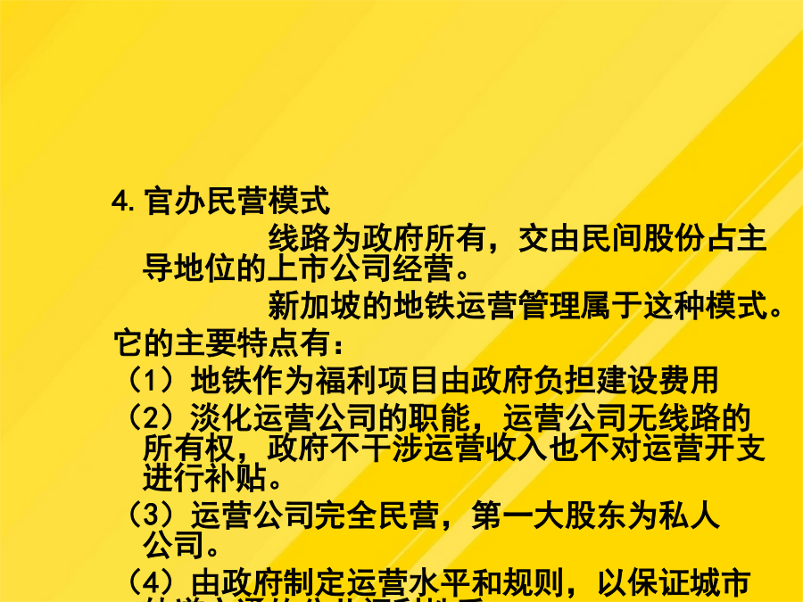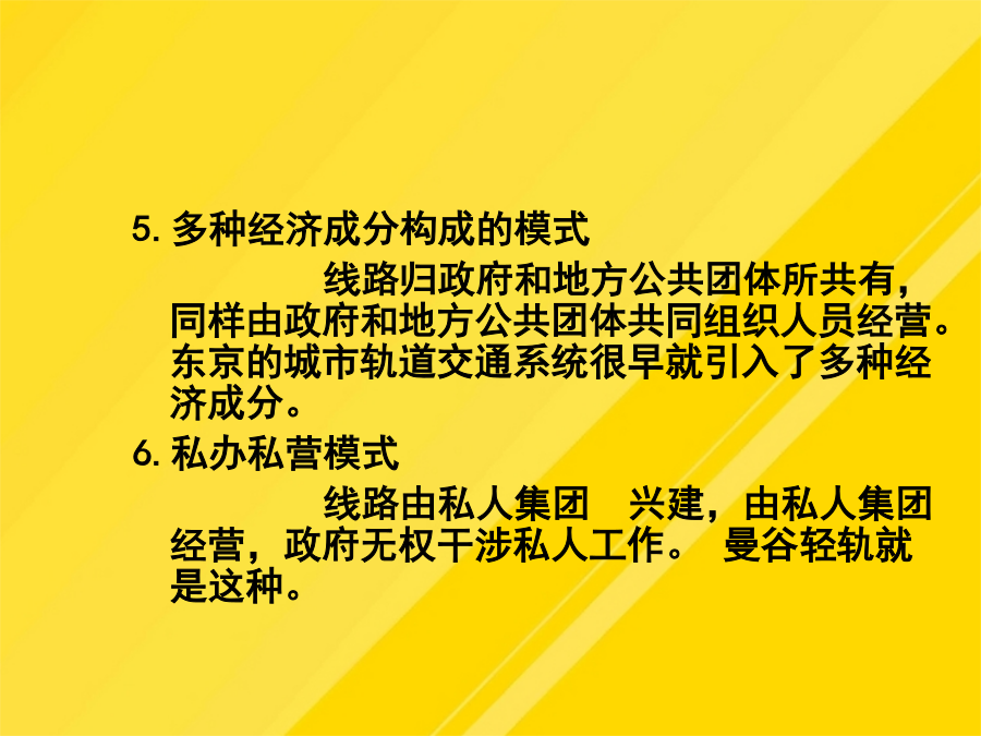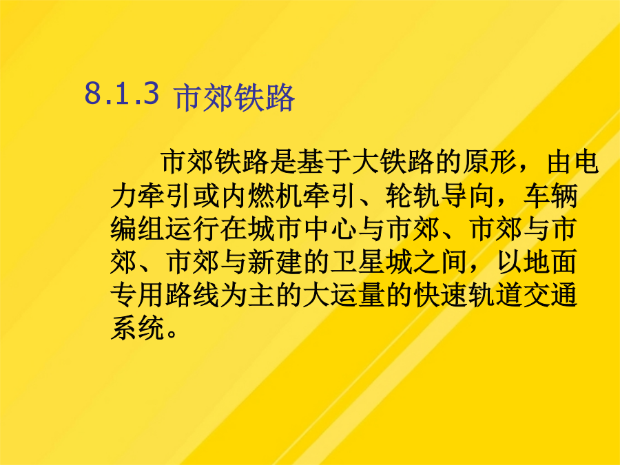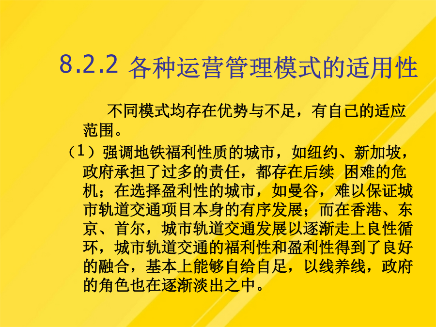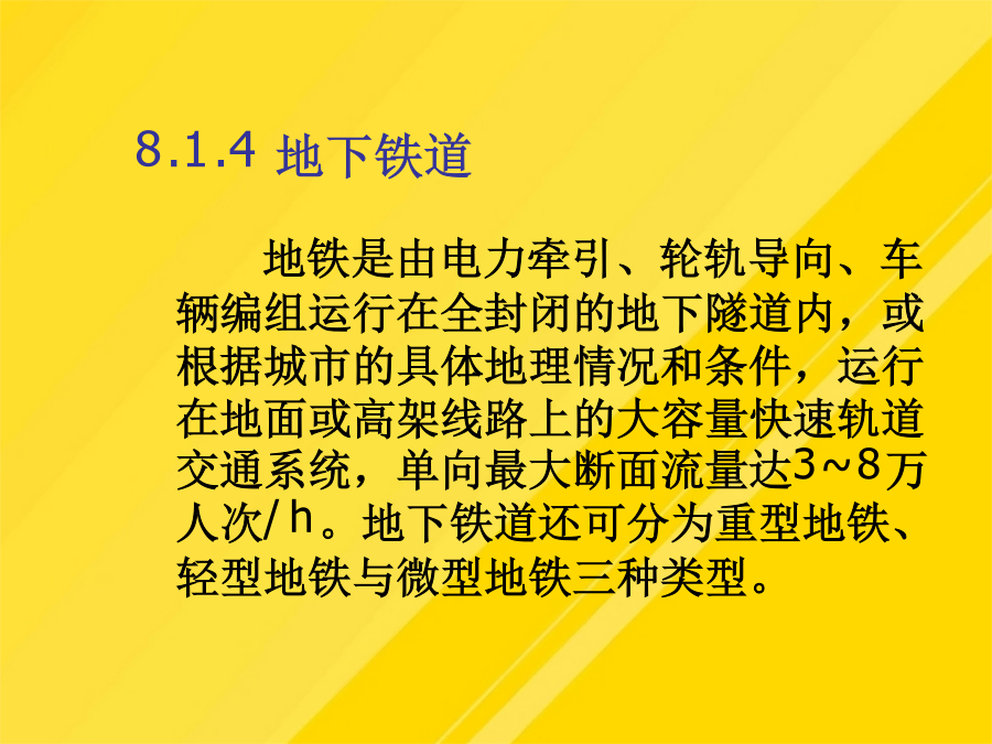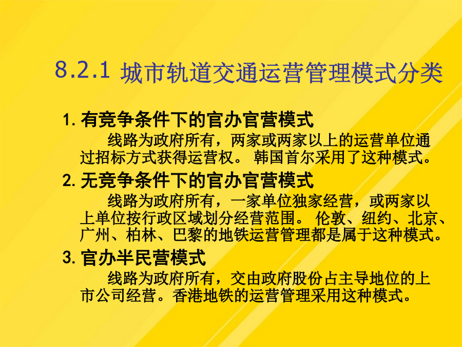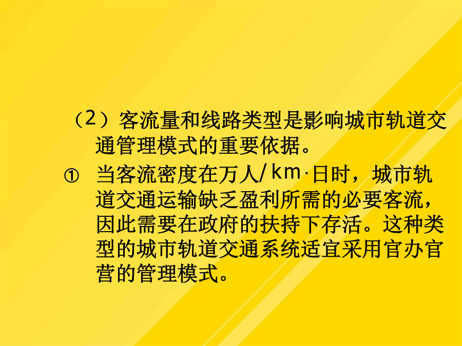 9.1城市轨道交通的基本形式轻轨的涵义是指车辆对轨道施加的荷载而言,轻轨车辆与市郊列车或地下铁道车辆比较相对较轻。轻轨交通是由电力牵引、轮轨导向、车辆编组运行在专用行车道上的中运量的城市轨道交通系统。8.1.3市郊铁路8.1.4地下铁道3城市轨道交通运营方案(1)售票、检票位置与出入口、楼梯应保持一定距离。(4)施工列车应按闭塞方式运行。(2)接触式IC卡型自动售检票系统。(8)换乘站能力使用计划。部分列车跨多站停车方案示意图(10)列车交路计划,指存在长短交路配合时的情况。这时,基本闭塞方法为自动闭塞法,通常还采用列车自动保护(ATP)和列车自动运行(ATO)子系统,三个子系统构成列车自动控制系统(ATC),ATC系统具有列车运行自动化和行车指挥自动化功能。考虑到地铁车辆有时是以动车组形式编组,此时动车组可用下式计算(1)符合客流的空间分布特征是列车交路方案选用的前提条件或必要条件。区段停车在长短交路情况下采用,长交路列车在短交路区段外每站停车,单在短交路区段内部不停车通过;列车在始发站发车早点不应超过1min。(1)行车调度员应认真核对当夜施工计划,对施工内容、地点和方法做到心中有数。人工售票、检票系统是单一的采用纸质车票作为介质,通过人工出售、人工检验票、人工统计的一种售票、检票系统。快速列车只在线路上的主要客流集散站停车。列车交路方案规定了列车的运行区段和折返车站;8.2.1城市轨道交通运营管理模式分类4.官办民营模式线路为政府所有,交由民间股份占主导地位的上市公司经营。新加坡的地铁运营管理属于这种模式。它的主要特点有:(1)地铁作为福利项目由政府负担建设费用(2)淡化运营公司的职能,运营公司无线路的所有权,政府不干涉运营收入也不对运营开支进行补贴。(3)运营公司完全民营,第一大股东为私人公司。(4)由政府制定运营水平和规则,以保证城市轨道交通的公共福利性质。5.多种经济成分构成的模式线路归政府和地方公共团体所共有,同样由政府和地方公共团体共同组织人员经营。东京的城市轨道交通系统很早就引入了多种经济成分。6.私办私营模式线路由私人集团兴建,由私人集团经营,政府无权干涉私人工作。曼谷轻轨就是这种。8.2.2各种运营管理模式的适用性当客流密度在万人/km·日时城市轨道交通运输系统基本具备维持运营成本所需的客流且能略有盈利,可考虑采用有竞争条件下的官办官营、公私合营、官办半民营的模式。当客流密度达到万人/km·日以上,可采用官办半民营、官办民营的模式。8.2.3城市轨道交通运营方案8.3列车开行计划8.3.1全日行车计划2.计算分时发车间隔3.最终确定全日行车计划一般为了保证轨道交通的客运服务水平,发车间隔在非高峰运营时间的9:00~21:00不宜大于6min,在其他非高峰运营时间不宜大于10min。8.3.2列车开行方案1.列车编组方案(1)大编组方案指在运营时间内列车编组车辆数固定且相对较多。(2)小编组方案指在运营时间内列车编组车数固定且相对较少。(3)大小编组方案指在运营时间内列车编组车数不固定。大小编组有两种情形,一种是在客流非高峰时段编组车辆数相对较少,在高峰时段编组车辆数相对较多。另一种是在全日运营时间内采用大小编组。在进行列车编组方案选择时,通常需要考虑客流需求、服务水平、车辆运用经济性和运营组织复杂性因素。2.列车交路方案列车交路可分为长交路、短交路及混合交路3种类型。长交路是指列车在全线各站间运行,为全线提供运输服务,列车到达折返线(站)后返回。短交路是指列车在某一区段内运行,在指定站折返,它可为某一段旅客提供服务。混合交路则指线路上长短交路并存的情形,也叫长短交路。(1)符合客流的空间分布特征是列车交路方案选用的前提条件或必要条件。(2)行车条件决定了列车交路计划实现的可能性(3)客运组织是列车交路确定的必要条件。列车交路类型3.列车停站方案通常城市轨道交通的列车运行采用站站停车的方式。从优化列车运行组织、提高列车旅行速度,节约乘客出行时间出发,根据具体线路的客流特点,也可采取一些非站站停车的列车运行方案。可采取的非站站停车方案主要有以下三种:(1)区段停车。区段停车在长短交路情况下采用,长交路列车在短交路区段外每站停车,单在短交路区段内部不停车通过;而短交路列车则在短交路区段内每站停车,短交路列车的中间折返站同时又是乘客换乘站。(2)跨站停车跨站停车时在长交路的情况下采用的停车方式。A类列车在甲、丙类车站停车,在乙类车站通过;B类列车在乙、丙类车站停车,在甲类车站通过。(3)部分列车跨多站停车部分列车跨多站停车是指线路上开行两类长交路列车,即普速列车(站站停车)和快速类车(跨多站停车)。快速列车只在