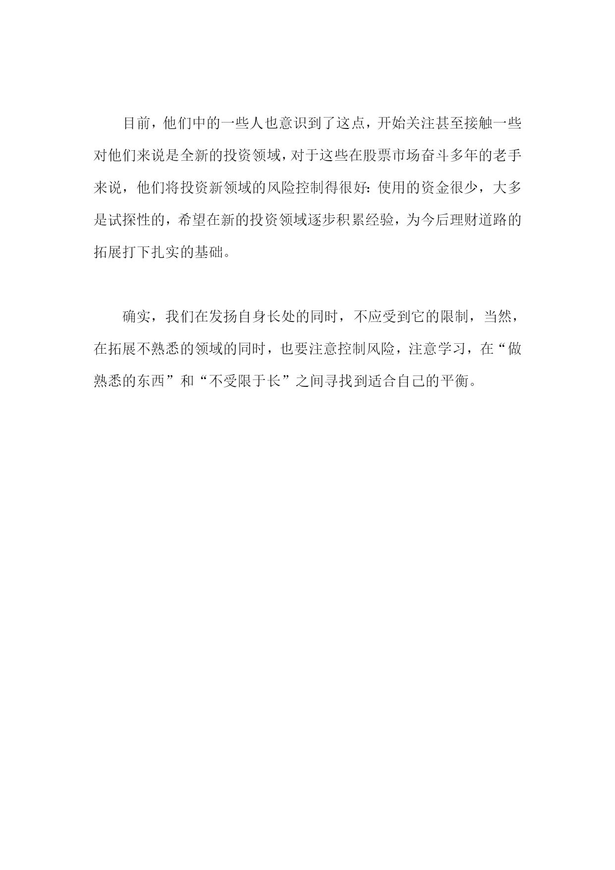 投资理财应扬长而不受限于长HYPERLINK"http://www.yuehua99.com"悦华黄金外汇交易培训http://www.yuehua99.com扬长避短在大家看来已经习以为常,而且许多朋友一定执行得不错。不过,在“扬长”的同时,可能也有不少人受限于自己的长处而不自知,这有可能会让人错失一些机会,同时也限制了个人的发展。还是谈在投资理财当中,身边有许多朋友确实十分擅长某一领域的投资理财,有些朋友做股票很厉害,在前两年的牛市中利润达到十几倍甚至近二十倍,在近半年来A股市场的暴跌中,他们的损失也非常有限,但是,他们的厉害也仅限于股票市场,在当前通胀水平高企而股市信心缺失、机会匮乏的情况下,他们也难以跑赢通胀。其实这正是“受限于长”的体现。从投资理财或者资产管理的角度来说,在不同时间、不同阶段,需要有不同的大类资产配置的概念,比如在担心通胀水平越来越高、上市公司盈利因上游成本增高而受到侵蚀的情况下,可以适当寻找在商品市场的中长期投资机会,并以专业的判断来进行适当的配置。他们因为不熟悉而担心介入新事物的风险,而选择固守自己最为擅长的领域,投资圈子确实有这样一句话——做自己最熟悉的东西,不过,如果长时间受限于自己的长处,而不去做一些新的拓展和尝试,则可能失去一些机会,也限制了投资理财这条路的宽度。目前,他们中的一些人也意识到了这点,开始关注甚至接触一些对他们来说是全新的投资领域,对于这些在股票市场奋斗多年的老手来说,他们将投资新领域的风险控制得很好:使用的资金很少,大多是试探性的,希望在新的投资领域逐步积累经验,为今后理财道路的拓展打下扎实的基础。确实,我们在发扬自身长处的同时,不应受到它的限制,当然,在拓展不熟悉的领域的同时,也要注意控制风险,注意学习,在“做熟悉的东西”和“不受限于长”之间寻找到适合自己的平衡。