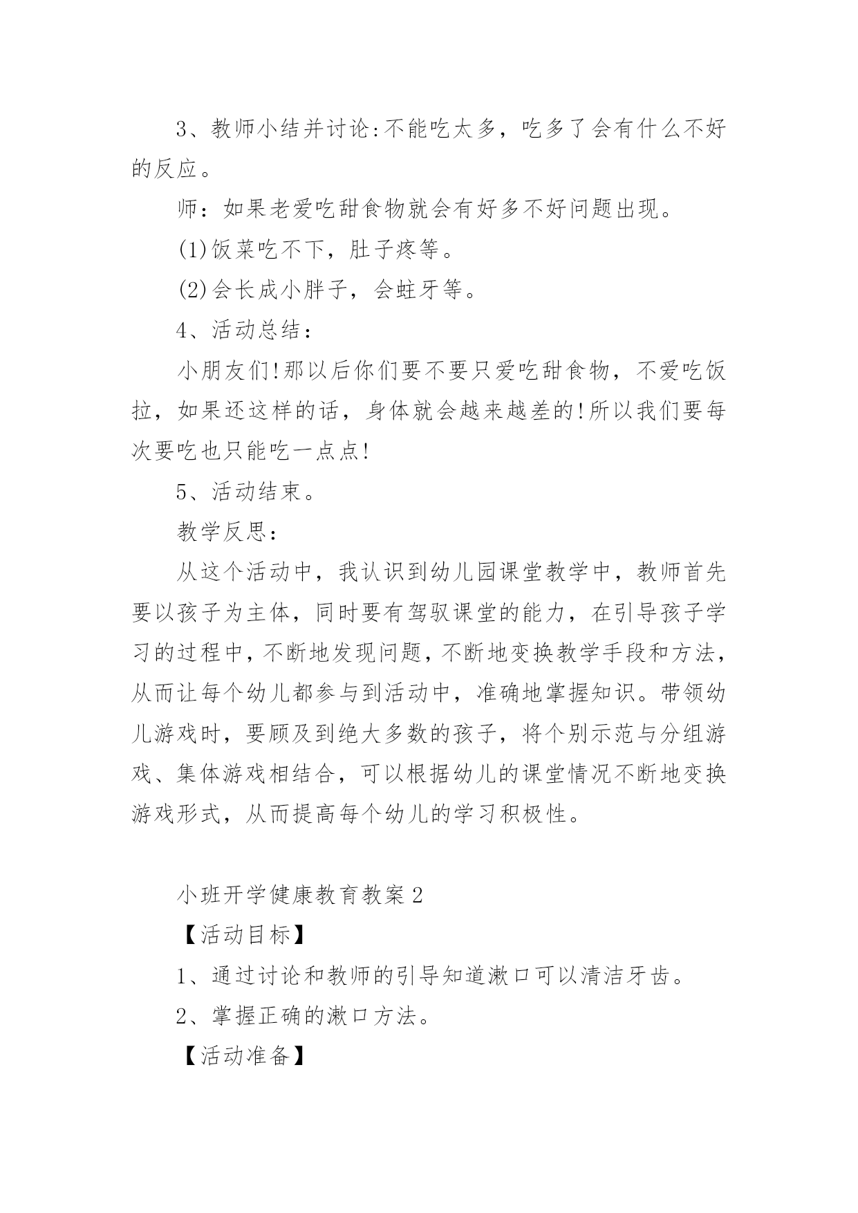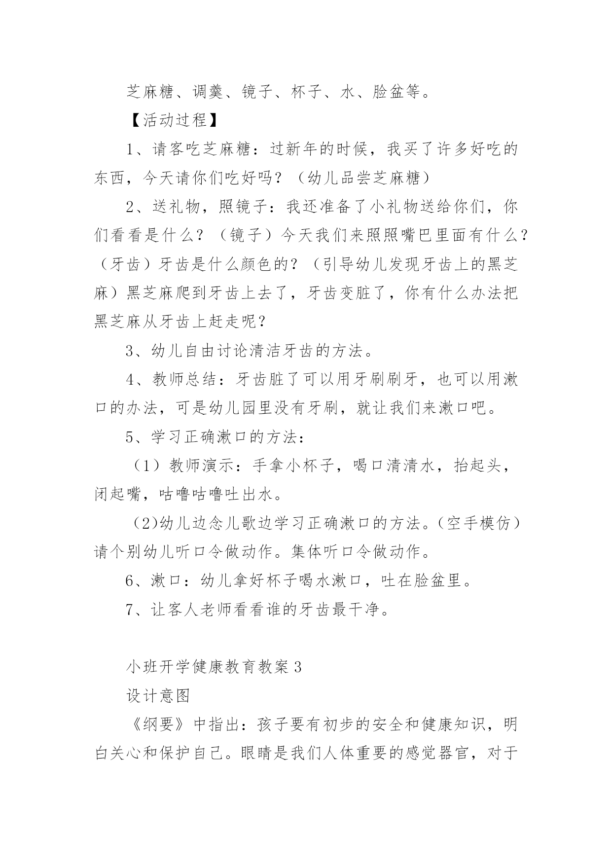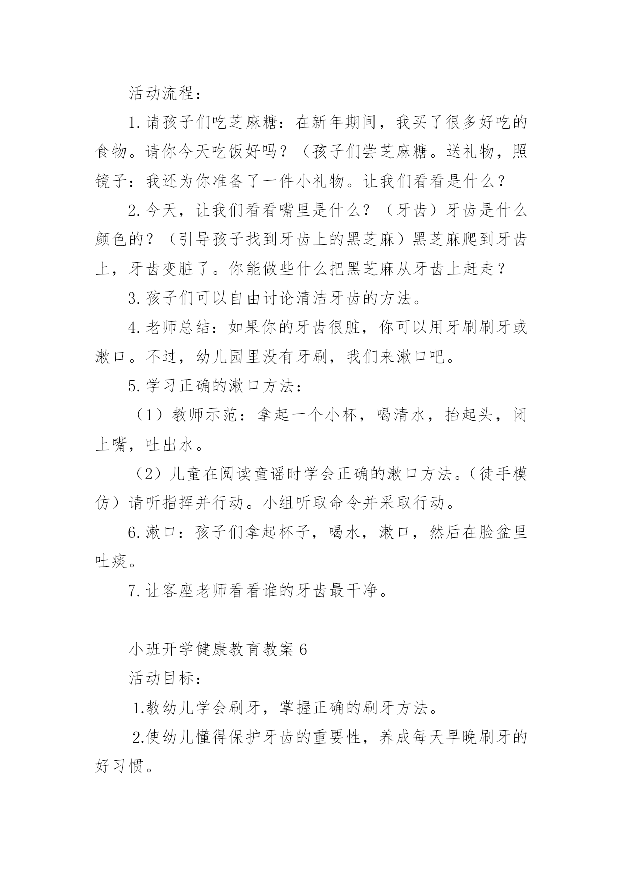 小班开学健康教育教案小班开学健康教育教案模板(精选8篇)作为一名专为他人授业解惑的人民教师,很有必要精心设计一份教案,教案是教学活动的依据,有着重要的地位。如何把教案做到重点突出呢?以下是小编为大家收集的小班开学健康教育教案模板(精选8篇),欢迎阅读与收藏。小班开学健康教育教案1活动目标:1、知道吃了太多甜食物会影响身体健康。2、知道爱吃什么有助于健康。3、初步了解健康的小常识。4、培养良好的饮食习惯。活动准备:PPT课件、糖果实物活动过程:1、教师出示糖果或甜食品后讲述故事导入课题。师:小朋友!老师手里拿了一些什么啊?(糖果、饼干等)那小朋友们爱吃吗?(爱)。2、教师讲述故事《不吃太多甜食》,幼儿倾听。师:小朋友们一起来听一听这个故事。听一听到听到了什么?3、教师小结并讨论:不能吃太多,吃多了会有什么不好的反应。师:如果老爱吃甜食物就会有好多不好问题出现。(1)饭菜吃不下,肚子疼等。(2)会长成小胖子,会蛀牙等。4、活动总结:小朋友们!那以后你们要不要只爱吃甜食物,不爱吃饭拉,如果还这样的话,身体就会越来越差的!所以我们要每次要吃也只能吃一点点!5、活动结束。教学反思:从这个活动中,我认识到幼儿园课堂教学中,教师首先要以孩子为主体,同时要有驾驭课堂的能力,在引导孩子学习的过程中,不断地发现问题,不断地变换教学手段和方法,从而让每个幼儿都参与到活动中,准确地掌握知识。带领幼儿游戏时,要顾及到绝大多数的孩子,将个别示范与分组游戏、集体游戏相结合,可以根据幼儿的课堂情况不断地变换游戏形式,从而提高每个幼儿的学习积极性。小班开学健康教育教案2【活动目标】1、通过讨论和教师的引导知道漱口可以清洁牙齿。2、掌握正确的漱口方法。【活动准备】芝麻糖、调羹、镜子、杯子、水、脸盆等。【活动过程】1、请客吃芝麻糖:过新年的时候,我买了许多好吃的东西,今天请你们吃好吗?(幼儿品尝芝麻糖)2、送礼物,照镜子:我还准备了小礼物送给你们,你们看看是什么?(镜子)今天我们来照照嘴巴里面有什么?(牙齿)牙齿是什么颜色的?(引导幼儿发现牙齿上的黑芝麻)黑芝麻爬到牙齿上去了,牙齿变脏了,你有什么办法把黑芝麻从牙齿上赶走呢?3、幼儿自由讨论清洁牙齿的方法。4、教师总结:牙齿脏了可以用牙刷刷牙,也可以用漱口的办法,可是幼儿园里没有牙刷,就让我们来漱口吧。5、学习正确漱口的方法:(1)教师演示:手拿小杯子,喝口清清水,抬起头,闭起嘴,咕噜咕噜吐出水。(2)幼儿边念儿歌边学习正确漱口的方法。(空手模仿)请个别幼儿听口令做动作。集体听口令做动作。6、漱口:幼儿拿好杯子喝水漱口,吐在脸盆里。7、让客人老师看看谁的牙齿最干净。小班开学健康教育教案3设计意图《纲要》中指出:孩子要有初步的安全和健康知识,明白关心和保护自己。眼睛是我们人体重要的感觉器官,对于我们的生活、工作、学习都十分重要。由于幼儿在日常生活中看书、画画、看电视等一些姿势的不正确,严重影响了眼睛的健康。为了让幼儿能了解眼睛,并在此基础上树立正确保护眼睛的意识和方法,我设计了“眼睛的秘密”教学活动。活动目标1、了解眼睛的作用以及眼睛各部分的名称。2、创编“眼保健操”,体验大胆表达的成功感。3、懂得保护眼睛的重要性,掌握更多保护眼睛(视力)的知识。活动准备1、每人一面小镜子。2、眼睛的结构图,对视力有益的食物图片,挂图《眼睛生病了》。3、每人一副自制的太阳镜。上面贴满胶带:幼儿自制的小老鼠指偶人手一个。4、经验准备:活动前带幼儿玩《捉迷藏》的游戏。活动过程一、黑暗体验,感受眼睛的重要性幼儿戴上自制的眼镜,体验看不见东西时的感受。认识眼睛在生活中的重要性。二、初步了解眼睛的功能1、谈谈眼睛被蒙住的感受。师:在捉迷藏的.时候,眼睛被蒙住你有什么感受2、师:我们的眼睛能够看到哪些东西(拓展幼儿的思维空间)教师小结:我们的眼睛真了不起,能让我们看到很多很多的东西。但是你们了解自己的眼睛吗三、了解眼睛各部分的名称1、先让幼儿用镜子观察自己的眼睛:眼睛的上面有什么眼睫毛有什么用处眼睛里面像黑葡萄的是什么眼睛最中间的小黑点是什么2、出示眼睛结构图,引导幼儿观察。教师小结:眼睫毛对眼睛有保护作用,能遮住眼睛不被强光照射,也可防止尘土落入眼内。眼睛里面像黑葡萄的是眼珠,眼珠最中间的小黑点叫瞳孔。四、讨论学习保护眼睛的方法1、师:认识了眼睛,明白了眼睛的用处,我们就就应好好地来保护眼睛,就应怎样保护呢2、出示挂图《眼睛生病了》,提问:这个小朋友为什么要揉眼睛他的眼睛怎样了眼睛会生什么病呢(近视眼、红眼病、沙眼、结膜炎、麦粒肿等。)3、讨论:眼睛为什么会生病(如用脏手帕擦眼睛,用脏手揉眼睛,看书或看电视时间太长、坐姿不端正等。)4、讨论:日常生活中X我们应怎样保护眼睛A看电视时,距离电视2米以上,看电视时间不能过长:看书时身体要坐正,