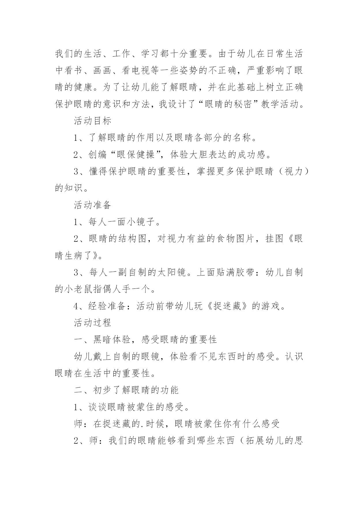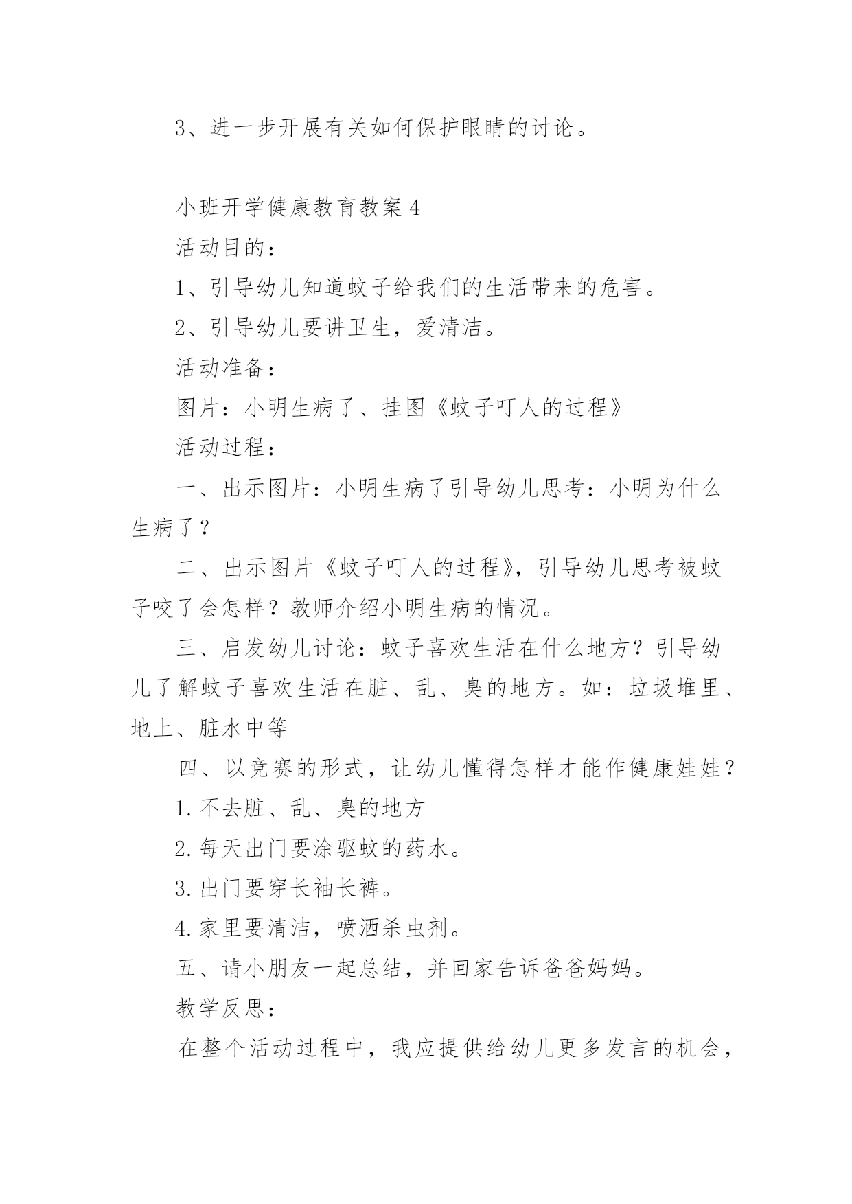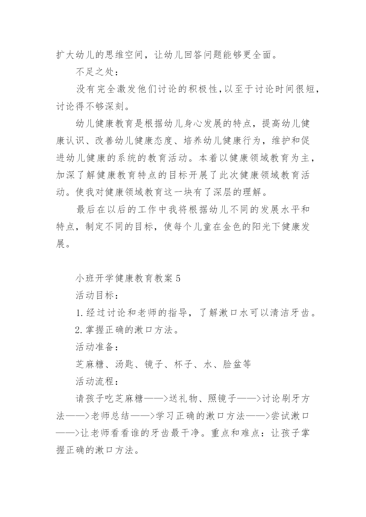 小班开学健康教育教案小班开学健康教育教案模板(精选8篇)作为一名专为他人授业解惑的人民教师,很有必要精心设计一份教案,教案是教学活动的依据,有着重要的地位。如何把教案做到重点突出呢?以下是小编为大家收集的小班开学健康教育教案模板(精选8篇),欢迎阅读与收藏。小班开学健康教育教案1活动目标:1、知道吃了太多甜食物会影响身体健康。2、知道爱吃什么有助于健康。3、初步了解健康的小常识。4、培养良好的饮食习惯。活动准备:PPT课件、糖果实物活动过程:1、教师出示糖果或甜食品后讲述故事导入课题。师:小朋友!老师手里拿了一些什么啊?(糖果、饼干等)那小朋友们爱吃吗?(爱)。2、教师讲述故事《不吃太多甜食》,幼儿倾听。师:小朋友们一起来听一听这个故事。听一听到听到了什么?3、教师小结并讨论:不能吃太多,吃多了会有什么不好的反应。师:如果老爱吃甜食物就会有好多不好问题出现。(1)饭菜吃不下,肚子疼等。(2)会长成小胖子,会蛀牙等。4、活动总结:小朋友们!那以后你们要不要只爱吃甜食物,不爱吃饭拉,如果还这样的话,身体就会越来越差的!所以我们要每次要吃也只能吃一点点!5、活动结束。教学反思:从这个活动中,我认识到幼儿园课堂教学中,教师首先要以孩子为主体,同时要有驾驭课堂的能力,在引导孩子学习的过程中,不断地发现问题,不断地变换教学手段和方法,从而让每个幼儿都参与到活动中,准确地掌握知识。带领幼儿游戏时,要顾及到绝大多数的孩子,将个别示范与分组游戏、集体游戏相结合,可以根据幼儿的课堂情况不断地变换游戏形式,从而提高每个幼儿的学习积极性。小班开学健康教育教案2【活动目标】1、通过讨论和教师的引导知道漱口可以清洁牙齿。2、掌握正确的漱口方法。【活动准备】芝麻糖、调羹、镜子、杯子、水、脸盆等。【活动过程】1、请客吃芝麻糖:过新年的时候,我买了许多好吃的东西,今天请你们吃好吗?(幼儿品尝芝麻糖)2、送礼物,照镜子:我还准备了小礼物送给你们,你们看看是什么?(镜子)今天我们来照照嘴巴里面有什么?(牙齿)牙齿是什么颜色的?(引导幼儿发现牙齿上的黑芝麻)黑芝麻爬到牙齿上去了,牙齿变脏了,你有什么办法把黑芝麻从牙齿上赶走呢?3、幼儿自由讨论清洁牙齿的方法。4、教师总结:牙齿脏了可以用牙刷刷牙,也可以用漱口的办法,可是幼儿园里没有牙刷,就让我们来漱口吧。5、学习正确漱口的方法:(1)教师演示:手拿小杯子,喝口清清水,抬起头,闭起嘴,咕噜咕噜吐出水。(2)幼儿边念儿歌边学习正确漱口的方法。(空手模仿)请个别幼儿听口令做动作。集体听口令做动作。6、漱口:幼儿拿好杯子喝水漱口,吐在脸盆里。7、让客人老师看看谁的牙齿最干净。小班开学健康教育教案3设计意图《纲要》中指出:孩子要有初步的安全和健康知识,明白关心和保护自己。眼睛是我们人体重要的感觉器官,对于我们的生活、工作、学习都十分重要。由于幼儿在日常生活中看书、画画、看电视等一些姿势的不正确,严重影响了眼睛的健康。为了让幼儿能了解眼睛,并在此基础上树立正确保护眼睛的意识和方法,我设计了“眼睛的秘密”教学活动。活动目标1、了解眼睛的作用以及眼睛各部分的名称。2、创编“眼保健操”,体验大胆表达的成功感。3、懂得保护眼睛的重要性,掌握更多保护眼睛(视力)的知识。活动准备1、每人一面小镜子。2、眼睛的结构图,对视力有益的食物图片,挂图《眼睛生病了》。3、每人一副自制的太阳镜。上面贴满胶带:幼儿自制的小老鼠指偶人手一个。4、经验准备:活动前带幼儿玩《捉迷藏》的游戏。活动过程一、黑暗体验,感受眼睛的重要性幼儿戴上自制的眼镜,体验看不见东西时的感受。认识眼睛在生活中的重要性。二、初步了解眼睛的功能1、谈谈眼睛被蒙住的感受。师:在捉迷藏的.时候,眼睛被蒙住你有什么感受2、师:我们的眼睛能够看到哪些东西(拓展幼儿的思维空间)教师小结:我们的眼睛真了不起,能让我们看到很多很多的东西。但是你们了解自己的眼睛吗三、了解眼睛各部分的名称1、先让幼儿用镜子观察自己的眼睛:眼睛的上面有什么眼睫毛有什么用处眼睛里面像黑葡萄的是什么眼睛最中间的小黑点是什么2、出示眼睛结构图,引导幼儿观察。教师小结:眼睫毛对眼睛有保护作用,能遮住眼睛不被强光照射,也可防止尘土落入眼内。眼睛里面像黑葡萄的是眼珠,眼珠最中间的小黑点叫瞳孔。四、讨论学习保护眼睛的方法1、师:认识了眼睛,明白了眼睛的用处,我们就就应好好地来保护眼睛,就应怎样保护呢2、出示挂图《眼睛生病了》,提问:这个小朋友为什么要揉眼睛他的眼睛怎样了眼睛会生什么病呢(近视眼、红眼病、沙眼、结膜炎、麦粒肿等。)3、讨论:眼睛为什么会生病(如用脏手帕擦眼睛,用脏手揉眼睛,看书或看电视时间太长、坐姿不端正等。)4、讨论:日常生活中X我们应怎样保护眼睛A看电视时,距离电视2米以上,看电视时间不能过长:看书时身体要坐正,