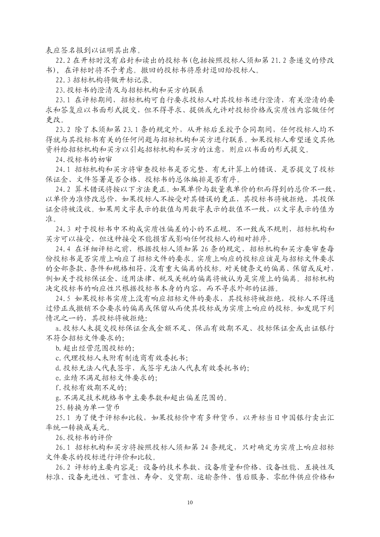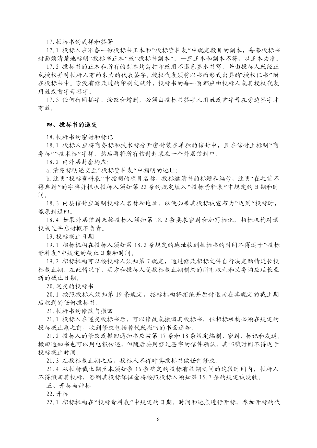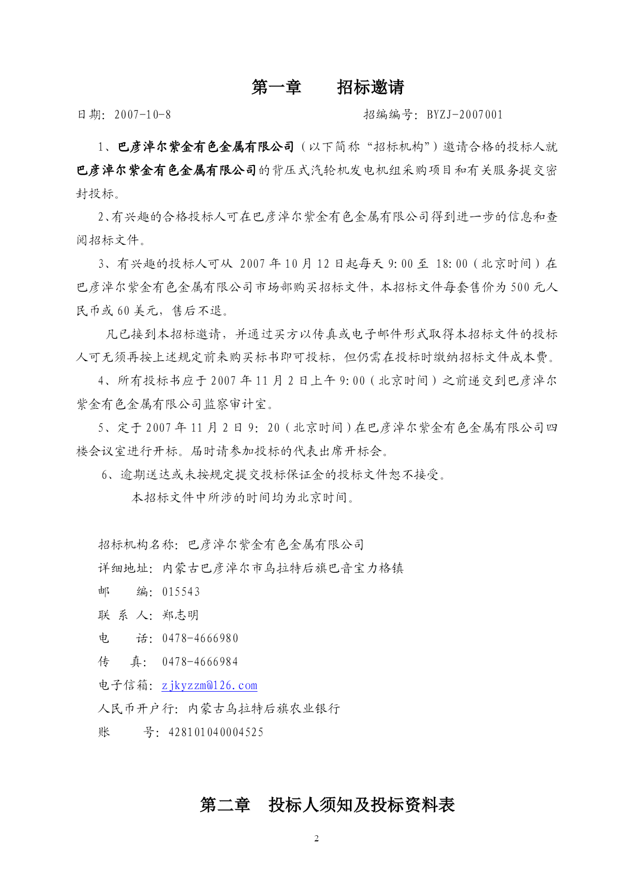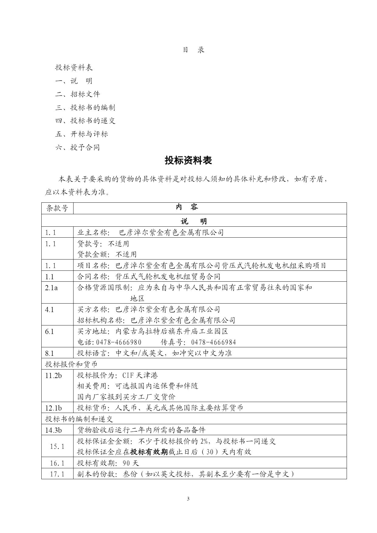 PAGEPAGE45机电产品采购国际竞争性招标文件招标编号:BYZJ-2007001招标项目名称:巴彦淖尔紫金有色金属有限公司:背压式汽轮机发电机组巴彦淖尔紫金有色金属有限公司二00七年十月第一章招标邀请日期:2007-10-8招编编号:BYZJ-20070011、巴彦淖尔紫金有色金属有限公司(以下简称“招标机构”)邀请合格的投标人就巴彦淖尔紫金有色金属有限公司的背压式汽轮机发电机组采购项目和有关服务提交密封投标。2、有兴趣的合格投标人可在巴彦淖尔紫金有色金属有限公司得到进一步的信息和查阅招标文件。3、有兴趣的投标人可从2007年10月12日起每天9:00至18:00(北京时间)在巴彦淖尔紫金有色金属有限公司市场部购买招标文件,本招标文件每套售价为500元人民币或60美元,售后不退。凡已接到本招标邀请,并通过买方以传真或电子邮件形式取得本招标文件的投标人可无须再按上述规定前来购买标书即可投标,但仍需在投标时缴纳招标文件成本费。4、所有投标书应于2007年11月2日上午9:00(北京时间)之前递交到巴彦淖尔紫金有色金属有限公司监察审计室。5、定于2007年11月2日9:20(北京时间)在巴彦淖尔紫金有色金属有限公司四楼会议室进行开标。届时请参加投标的代表出席开标会。6、逾期送达或未按规定提交投标保证金的投标文件恕不接受。本招标文件中所涉的时间均为北京时间。招标机构名称:巴彦淖尔紫金有色金属有限公司详细地址:内蒙古巴彦淖尔市乌拉特后旗巴音宝力格镇邮编:015543联系人:郑志明电话:0478-4666980传真:0478-4666984电子信箱:HYPERLINK"mailto:zjkyzzm@126.com"zjkyzzm@126.com人民币开户行:内蒙古乌拉特后旗农业银行账号:428101040004525第二章投标人须知及投标资料表目录投标资料表一、说明二、招标文件三、投标书的编制四、投标书的递交五、开标与评标六、授予合同投标资料表本表关于要采购的货物的具体资料是对投标人须知的具体补充和修改,如有矛盾,应以本资料表为准。条款号内容说明1.1业主名称:巴彦淖尔紫金有色金属有限公司1.1贷款号:不适用贷款金额:不适用1.1项目名称:巴彦淖尔紫金有色金属有限公司背压式汽轮机发电机组采购项目1.1合同名称:背压式气轮机发电机组贸易合同2.1a合格货源国限制:应为来自与中华人民共和国有正常贸易往来的国家和地区4.1买方名称:巴彦淖尔紫金有色金属有限公司招标机构名称:巴彦淖尔紫金有色金属有限公司6.1买方地址:内蒙古乌拉特后旗东升庙工业园区电话:0478-4666980传真号:0478-46669848.1投标语言:中文和/或英文,如冲突以中文为准投标报价和货币11.2b投标报价为:CIF天津港相关费用:可选报国内运保费和伴随国内厂家报到买方工厂交货价12.1b投标货币:人民币、美元或其他国际主要结算货币投标书的编制和递交14.3b货物验收后运行二年内所需的备品备件15.1投标保证金金额:不少于投标报价的2%,与投标书一同递交投标保证金应在投标有效期截止日后(30)天内有效16.1投标有效期:90天17.1副本的份数:叁份(如以英文投标,其副本至少要有一份是中文)18.2a投标书递交至:巴彦淖尔紫金有色金属有限公司18.2b招标邀请标题和编号:巴彦淖尔紫金有色金属有限公司的背压式汽轮机发电机组采购项目项目编号:BYZJ-200700119.1投标截止期:2007年11月2日上午9:00(北京时间)22.1开标日期:2007年11月2日时间:上午9:20(北京时间)地点:巴彦淖尔紫金有色金属有限公司四楼会议室授予合同31.1数量及服务变更引起价格增减变更范围:投标报价15%一、说明1.资金来源1.1“投标资料表”中所述的业主(或借款人)已获得一笔“投标资料表”中所述的资金/贷款,用于支付“投标资料表”中所述项目的费用,业主(或借款人)计划将一部分资金/贷款用于支付本次招标后所签订的合同项下的合格款项。2.合格的投标人2.1除非下文另有规定,凡是来自中华人民共和国国内或是与中华人民共和国有正常贸易往来的国家和地区(以下简称“合格来源国”)的投标人均可投标。投标人不得直接或间接地与买方为采购本次招标的货物进行设计、编制规范和其他文件所委托的咨询公司或其附属机构有任何联系。只有在法律上和财务上独立,按照商业法运作并独立于买方和招标机构的投标人才能参加投标。3.合格的货物和服务3.1合同中提供的所有货物及其有关服务