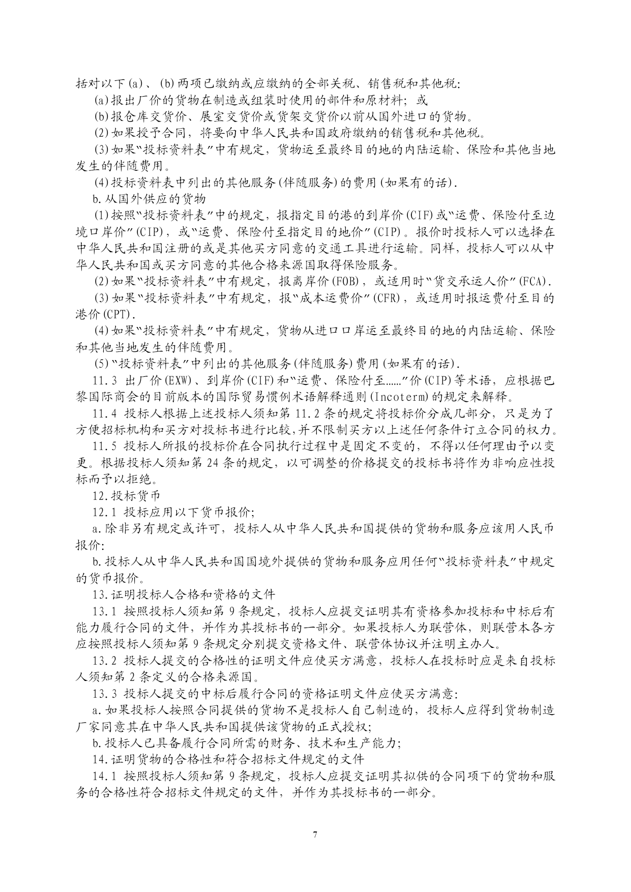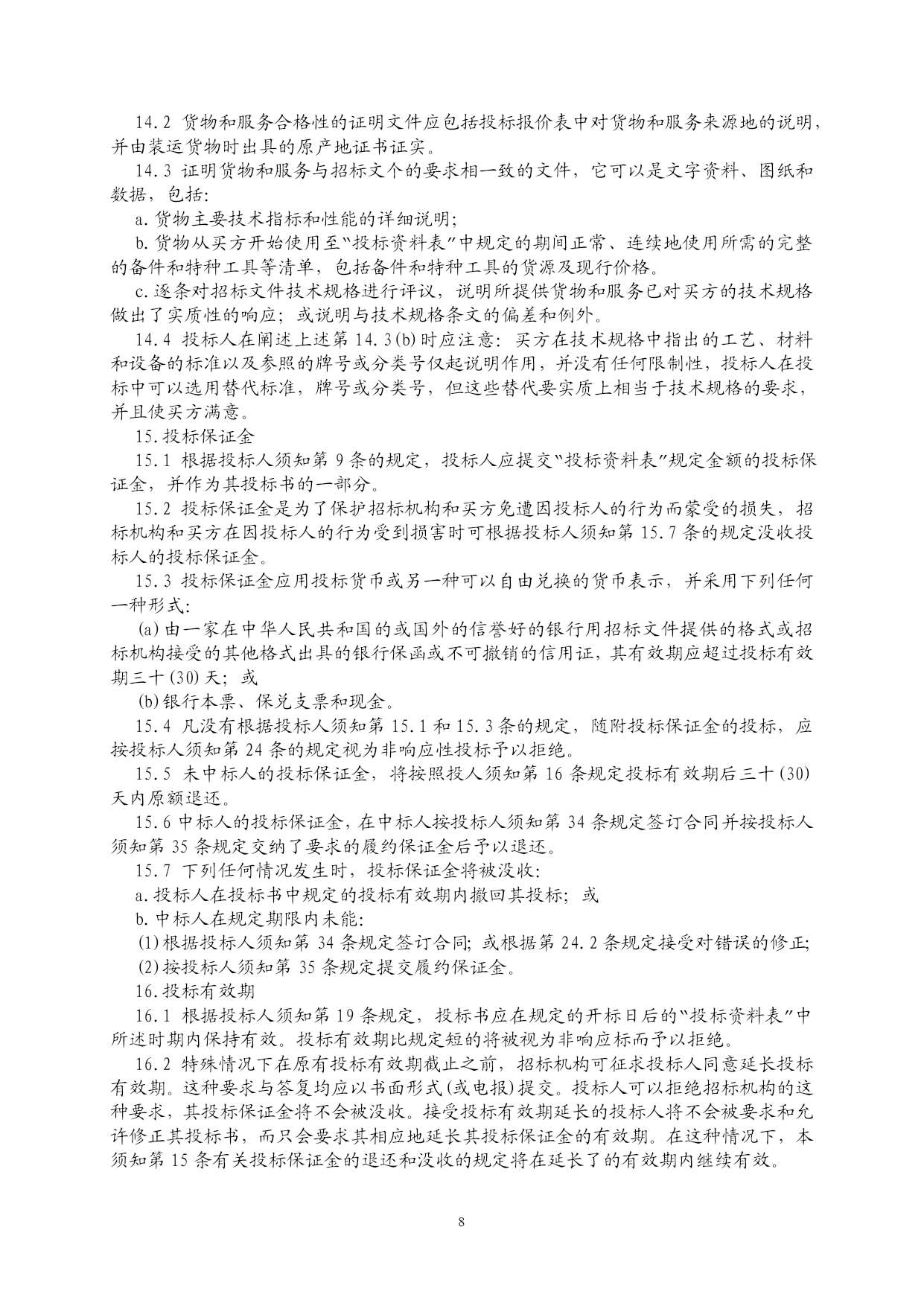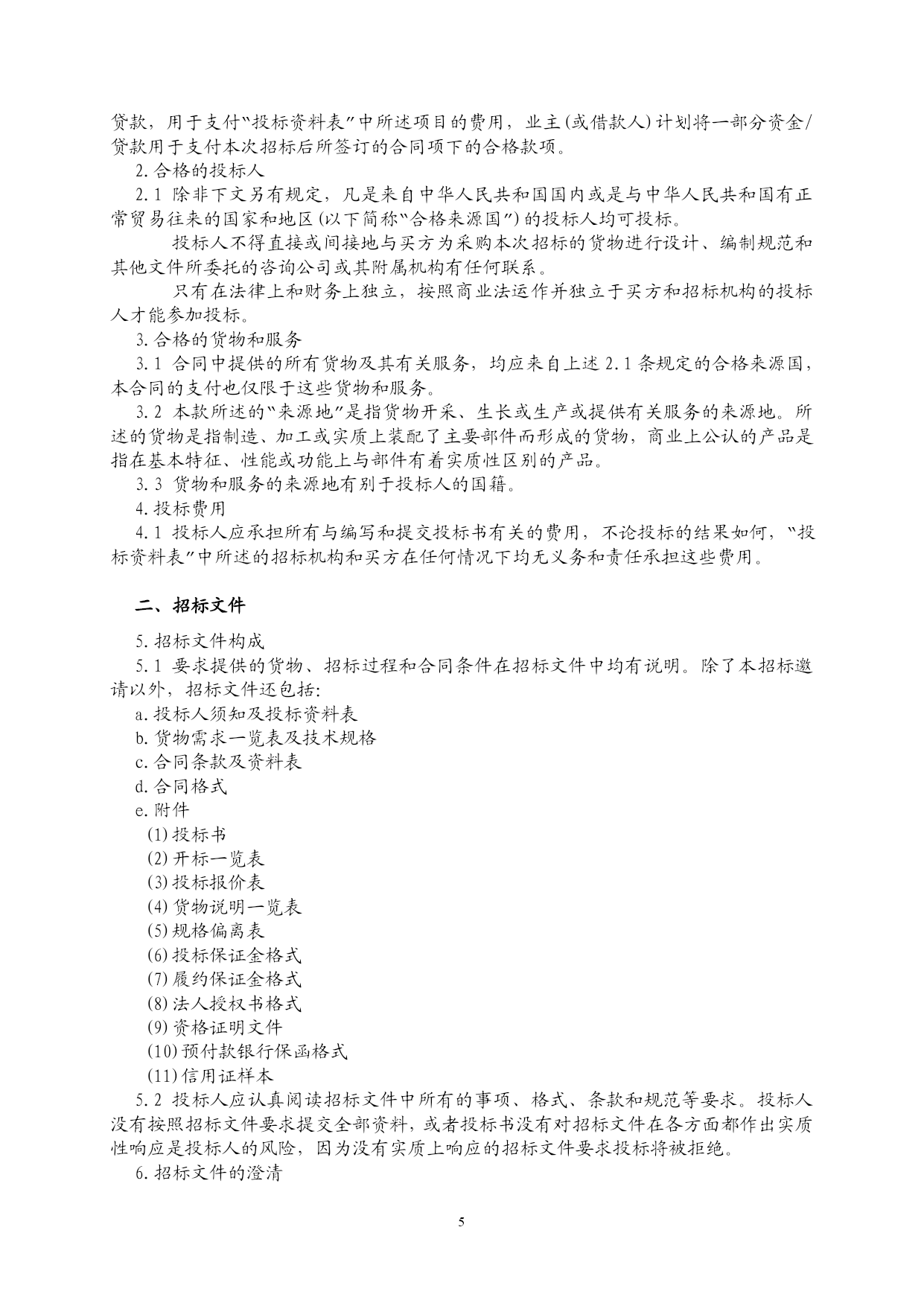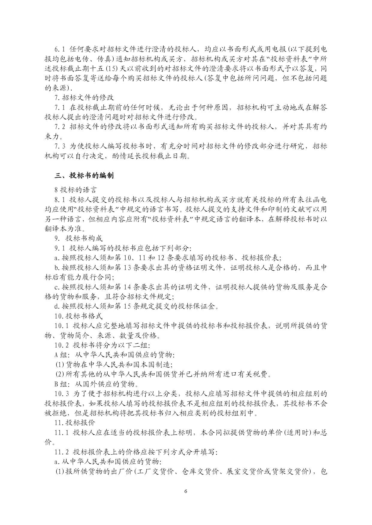 PAGEPAGE45机电产品采购国际竞争性招标文件招标编号:BYZJ-2007001招标项目名称:巴彦淖尔紫金有色金属有限公司:背压式汽轮机发电机组巴彦淖尔紫金有色金属有限公司二00七年十月第一章招标邀请日期:2007-10-8招编编号:BYZJ-20070011、巴彦淖尔紫金有色金属有限公司(以下简称“招标机构”)邀请合格的投标人就巴彦淖尔紫金有色金属有限公司的背压式汽轮机发电机组采购项目和有关服务提交密封投标。2、有兴趣的合格投标人可在巴彦淖尔紫金有色金属有限公司得到进一步的信息和查阅招标文件。3、有兴趣的投标人可从2007年10月12日起每天9:00至18:00(北京时间)在巴彦淖尔紫金有色金属有限公司市场部购买招标文件,本招标文件每套售价为500元人民币或60美元,售后不退。凡已接到本招标邀请,并通过买方以传真或电子邮件形式取得本招标文件的投标人可无须再按上述规定前来购买标书即可投标,但仍需在投标时缴纳招标文件成本费。4、所有投标书应于2007年11月2日上午9:00(北京时间)之前递交到巴彦淖尔紫金有色金属有限公司监察审计室。5、定于2007年11月2日9:20(北京时间)在巴彦淖尔紫金有色金属有限公司四楼会议室进行开标。届时请参加投标的代表出席开标会。6、逾期送达或未按规定提交投标保证金的投标文件恕不接受。本招标文件中所涉的时间均为北京时间。招标机构名称:巴彦淖尔紫金有色金属有限公司详细地址:内蒙古巴彦淖尔市乌拉特后旗巴音宝力格镇邮编:015543联系人:郑志明电话:0478-4666980传真:0478-4666984电子信箱:HYPERLINK"mailto:zjkyzzm@126.com"zjkyzzm@126.com人民币开户行:内蒙古乌拉特后旗农业银行账号:428101040004525第二章投标人须知及投标资料表目录投标资料表一、说明二、招标文件三、投标书的编制四、投标书的递交五、开标与评标六、授予合同投标资料表本表关于要采购的货物的具体资料是对投标人须知的具体补充和修改,如有矛盾,应以本资料表为准。条款号内容说明1.1业主名称:巴彦淖尔紫金有色金属有限公司1.1贷款号:不适用贷款金额:不适用1.1项目名称:巴彦淖尔紫金有色金属有限公司背压式汽轮机发电机组采购项目1.1合同名称:背压式气轮机发电机组贸易合同2.1a合格货源国限制:应为来自与中华人民共和国有正常贸易往来的国家和地区4.1买方名称:巴彦淖尔紫金有色金属有限公司招标机构名称:巴彦淖尔紫金有色金属有限公司6.1买方地址:内蒙古乌拉特后旗东升庙工业园区电话:0478-4666980传真号:0478-46669848.1投标语言:中文和/或英文,如冲突以中文为准投标报价和货币11.2b投标报价为:CIF天津港相关费用:可选报国内运保费和伴随国内厂家报到买方工厂交货价12.1b投标货币:人民币、美元或其他国际主要结算货币投标书的编制和递交14.3b货物验收后运行二年内所需的备品备件15.1投标保证金金额:不少于投标报价的2%,与投标书一同递交投标保证金应在投标有效期截止日后(30)天内有效16.1投标有效期:90天17.1副本的份数:叁份(如以英文投标,其副本至少要有一份是中文)18.2a投标书递交至:巴彦淖尔紫金有色金属有限公司18.2b招标邀请标题和编号:巴彦淖尔紫金有色金属有限公司的背压式汽轮机发电机组采购项目项目编号:BYZJ-200700119.1投标截止期:2007年11月2日上午9:00(北京时间)22.1开标日期:2007年11月2日时间:上午9:20(北京时间)地点:巴彦淖尔紫金有色金属有限公司四楼会议室授予合同31.1数量及服务变更引起价格增减变更范围:投标报价15%一、说明1.资金来源1.1“投标资料表”中所述的业主(或借款人)已获得一笔“投标资料表”中所述的资金/贷款,用于支付“投标资料表”中所述项目的费用,业主(或借款人)计划将一部分资金/贷款用于支付本次招标后所签订的合同项下的合格款项。2.合格的投标人2.1除非下文另有规定,凡是来自中华人民共和国国内或是与中华人民共和国有正常贸易往来的国家和地区(以下简称“合格来源国”)的投标人均可投标。投标人不得直接或间接地与买方为采购本次招标的货物进行设计、编制规范和其他文件所委托的咨询公司或其附属机构有任何联系。只有在法律上和财务上独立,按照商业法运作并独立于买方和招标机构的投标人才能参加投标。3.合格的货物和服务3.1合同中提供的所有货物及其有关服务