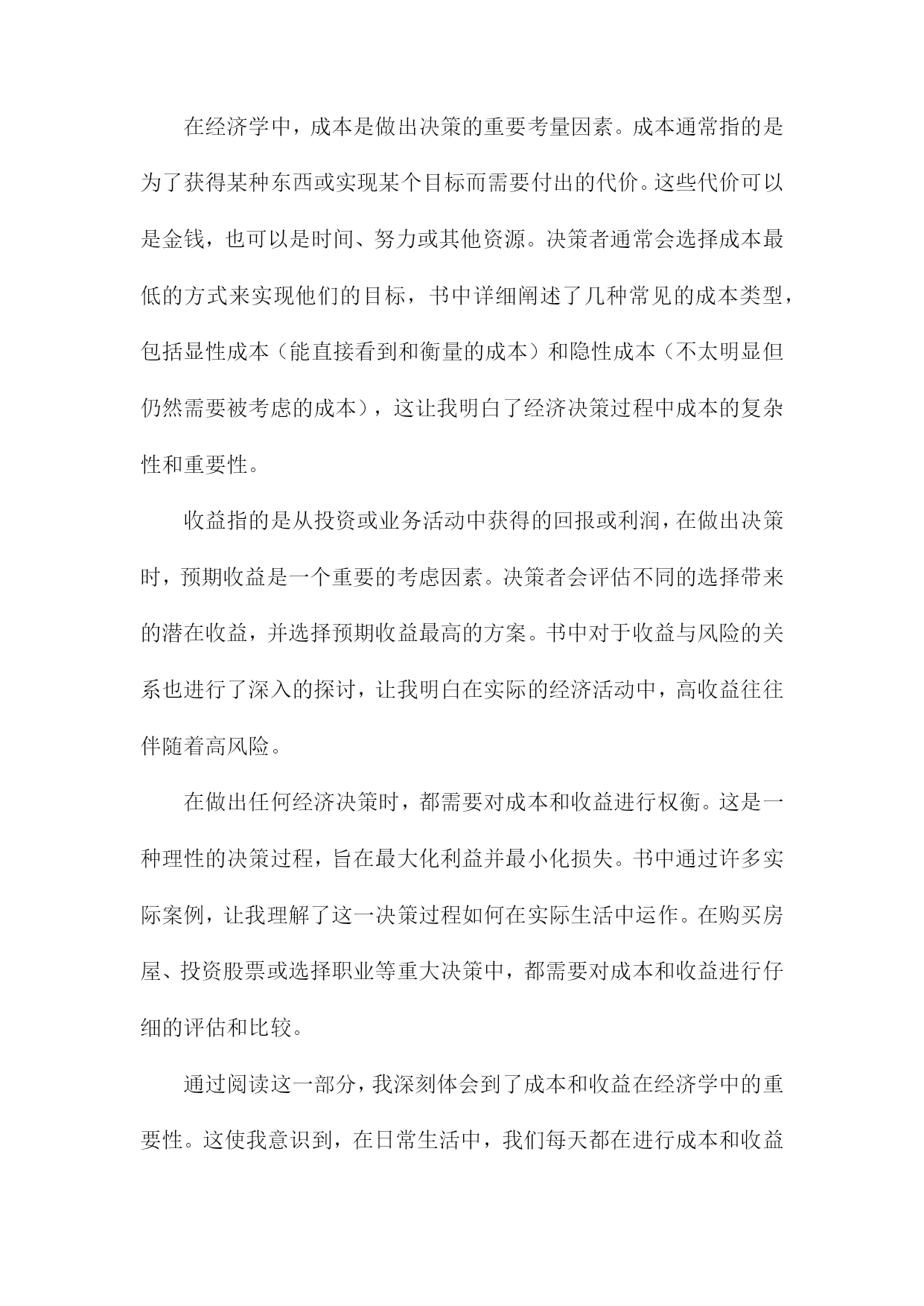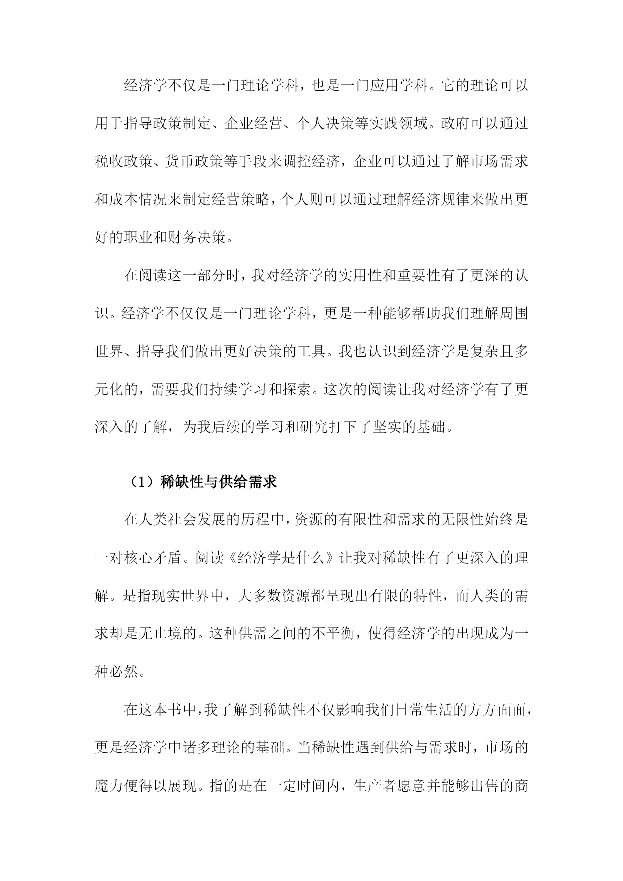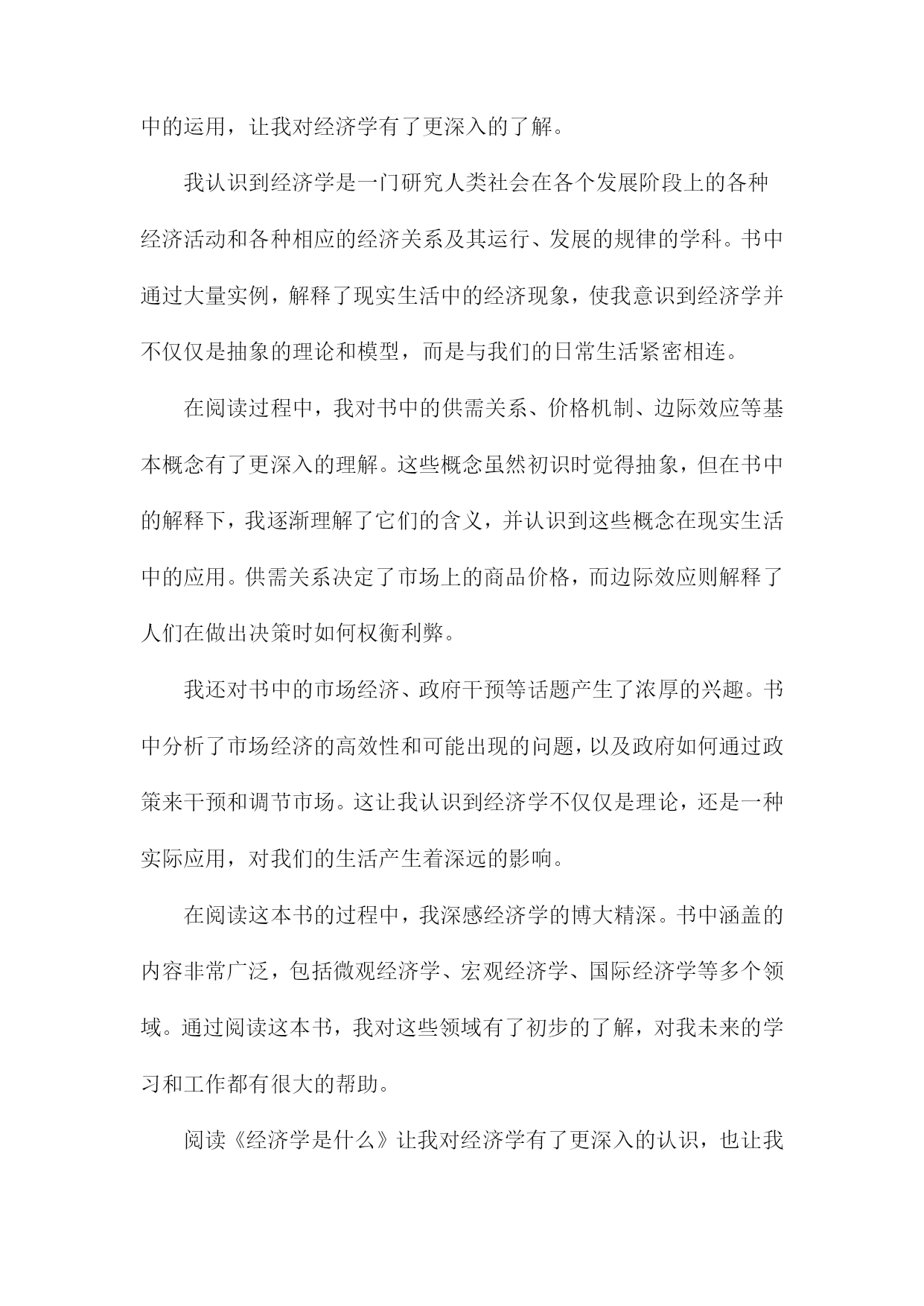 《经济学是什么》读书记录一、书籍简介《经济学是什么》是一本旨在帮助读者理解经济学基本原理和概念的普及性读物。本书通过对经济学的历史发展、基本概念和理论框架进行深入浅出的介绍,帮助读者建立起对经济学的基本认识。这本书既适合对经济学感兴趣的普通读者阅读,也适合作为经济学入门者的学习指南。书中不仅解释了经济学的基本概念,也通过实际案例来展示经济学的应用,使得经济学变得更为生动和实用。这本书的主要内容包括经济学的定义、发展历史、研究方法、基本假设、市场供需原理、宏观经济学与微观经济学的区别等。作者以通俗易懂的语言,将复杂的经济学理论解释得清晰明了,使读者能够更好地理解经济学的本质和内涵。1.作者介绍本书作者为著名经济学家张三(化名),张三教授拥有丰富的经济学研究背景及深厚的学术积累。他毕业于国内外知名大学的经济学院,并在国内外知名大学执教多年,拥有广泛的影响力。张三教授不仅专注于经济学理论的研究,还密切关注全球经济动态,对现实经济问题有独到的见解。张三教授在经济学领域取得了博士学位,并在多个经济学分支领域有所建树。他对于微观经济学、宏观经济学、国际经济学以及发展经济学等领域都有深入的研究。张三教授还曾在多个国际经济学研究机构担任研究员或访问学者,与世界各地的经济学家进行了广泛的学术交流。《经济学是什么》是张三教授的代表作之一。这本书旨在为广大读者提供一个通俗易懂的经济学入门指南,帮助读者理解经济学的基本原理和核心概念。本书结合了现实生活中的经济现象和案例,深入浅出地阐述了经济学的奥秘,使经济学变得不再晦涩难懂。张三教授的写作风格平易近人,他善于用生动的语言和实际的例子来解释复杂的经济学理论。他通过简洁明了的文字,引导读者走进经济学的殿堂,让读者在轻松愉快的阅读中掌握经济学的知识。张三教授在经济学领域的研究成果对学术界产生了深远的影响。他的这本书《经济学是什么》更是为广大民众普及经济学知识,为经济学在社会的普及和推广做出了巨大贡献。通过这本书,许多对经济学不了解的读者开始走进经济学的世界,理解经济学的魅力。2.出版背景在我深入阅读《经济学是什么》对其出版背景产生了深厚的兴趣,下面是我关于此书出版背景的记录:在当今全球化进程中,经济全球化不断加深的大背景下,无论是在社会公共政策的制定上,还是在日常个人生活决策中,经济学都扮演着越来越重要的角色。大众对经济学理论的理解和掌握程度并不均衡,尤其在许多非经济专业的人群中,对经济学的理解还存在误区或是一知半解。这成为了大众迫切需要更简洁、易懂的经济学知识的关键动力来源。在这样的大背景下,《经济学是什么》一书应运而生。该书的出版是对大众需求深度理解的体现,体现了现代社会普及经济学科普知识的迫切性。在经济变革与进步的浪潮中,社会需要对经济理论和市场动态有更加深入的认识和把握。《经济学是什么》通过深入浅出的方式,帮助大众理解经济学的核心概念、原理和方法论,以及其在现实生活中的实际应用。这本书的出版旨在填补大众对经济学知识需求的空白,为普及经济学科普知识开辟一条新的路径。它也反映了当代社会对经济教育的重视和对经济知识的渴求,通过本书的阅读,读者可以更加清晰地理解经济学的本质和魅力,从而更加理性地参与经济生活,作出明智的决策。这也正是该书出版的重要目的和背景所在。3.书籍内容概述《经济学是什么》一书内容全面,深入浅出地介绍了经济学的各个领域和概念。本书首先从历史的角度阐述了经济学的起源和发展,帮助读者了解这门学科的演变过程。从微观经济学入手,介绍了供给与需求的基本原理、市场机制的运行以及价格的形成等核心概念。随后转向宏观经济学,讲解了国民经济运行的规律、经济周期的波动以及政府如何调控经济等问题。书中还涉及了国际经济学的内容,包括国际贸易、汇率制度以及全球经济一体化等议题。书中还对重要的经济学理论和学派进行了介绍和解读,如古典经济学、凯恩斯主义、货币学派等。结合现实生活中的案例和事件,深入浅出地解释了经济学理论在实际中的应用和影响。本书还探讨了经济学与其他社会科学如社会学、心理学等的交叉领域,展示了经济学的多元化和综合性。在阅读过程中,我对经济学的基本理论和概念有了更深入的理解,对于经济现象和经济问题也有了更加全面的认识。这本书不仅让我了解了经济学的知识体系,还激发了我对经济学研究的兴趣。通过书中的案例分析,我更加明白了经济学的实践性和现实意义。也深刻体会到了经济学与社会生活的紧密联系和相互影响。《经济学是什么》一书内容充实,既适合初学者入门,也适合已经有一定基础的读者深入学习和理解经济学的相关知识。二、阅读体会在阅读《经济学是什么》这本书的过程中,我深受启发。这本书以通俗易懂的语言,深入浅出地介绍了经济学的原理及其在现实生活中的运用,让我对经济学有了更深入的了解。我认识到