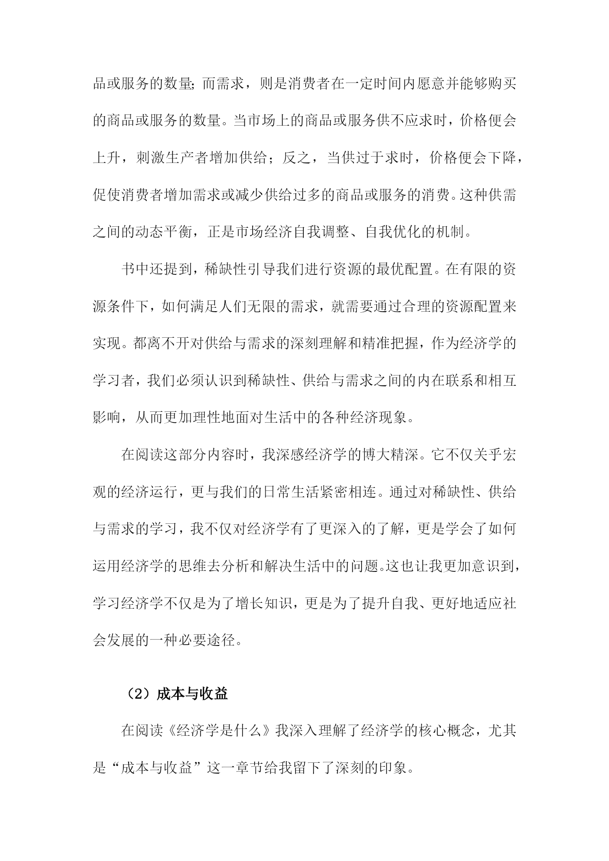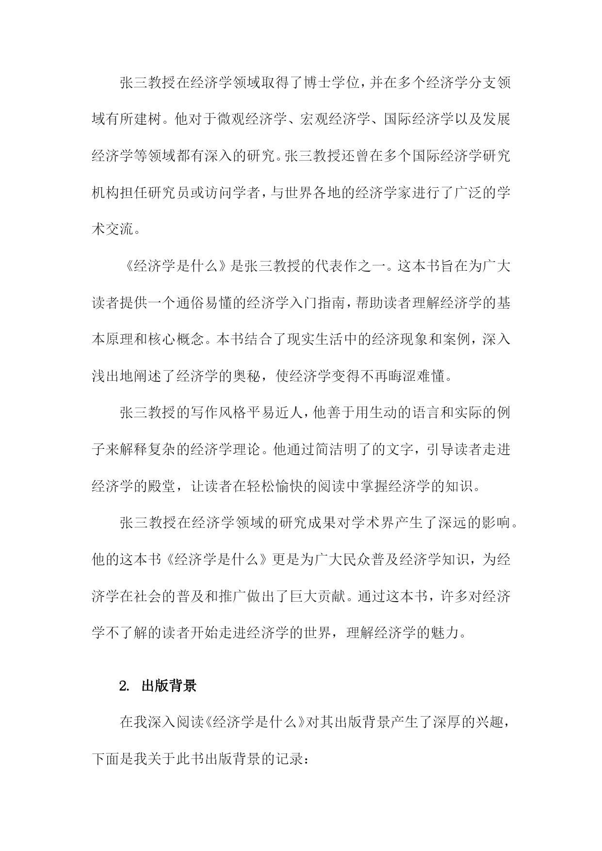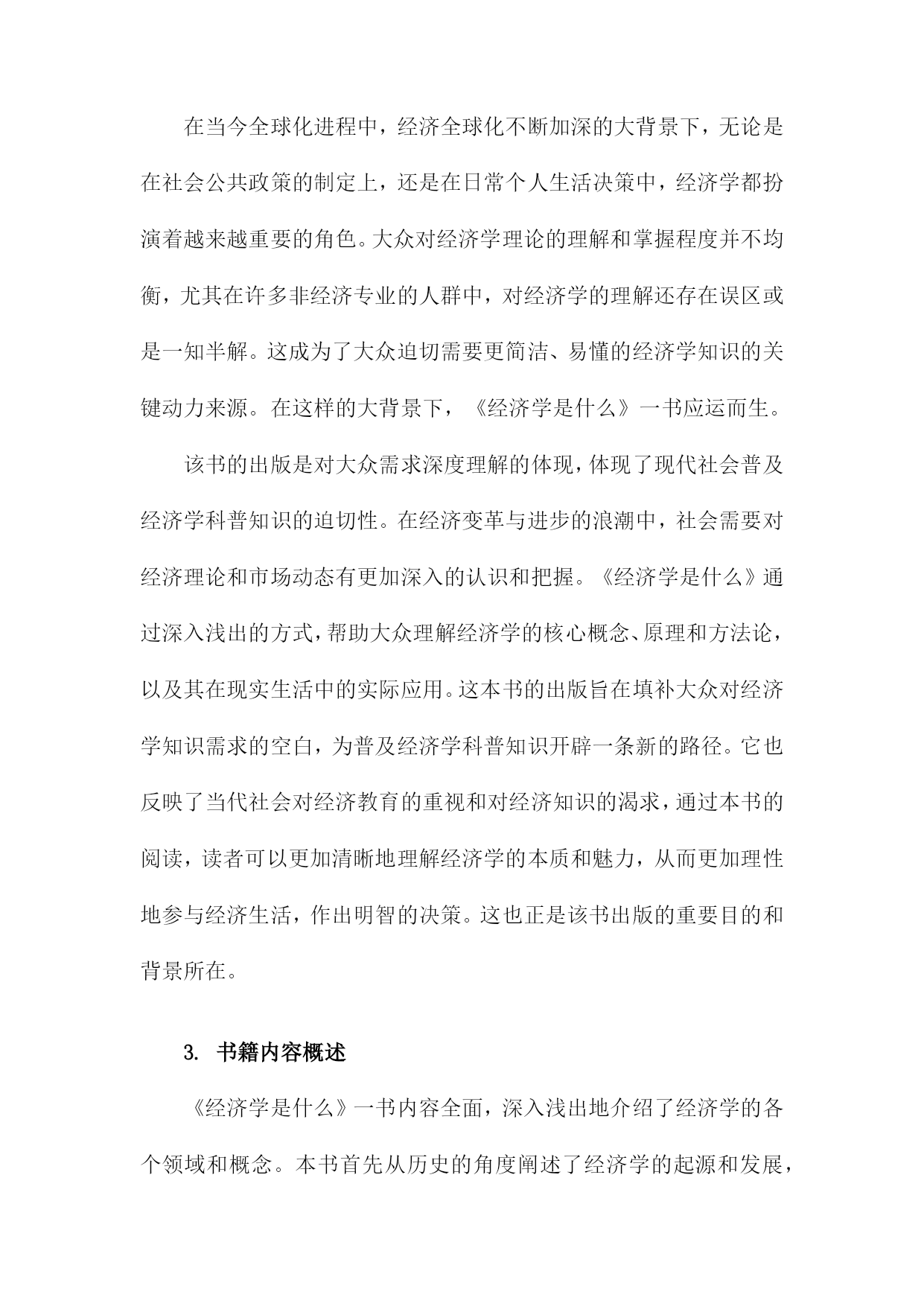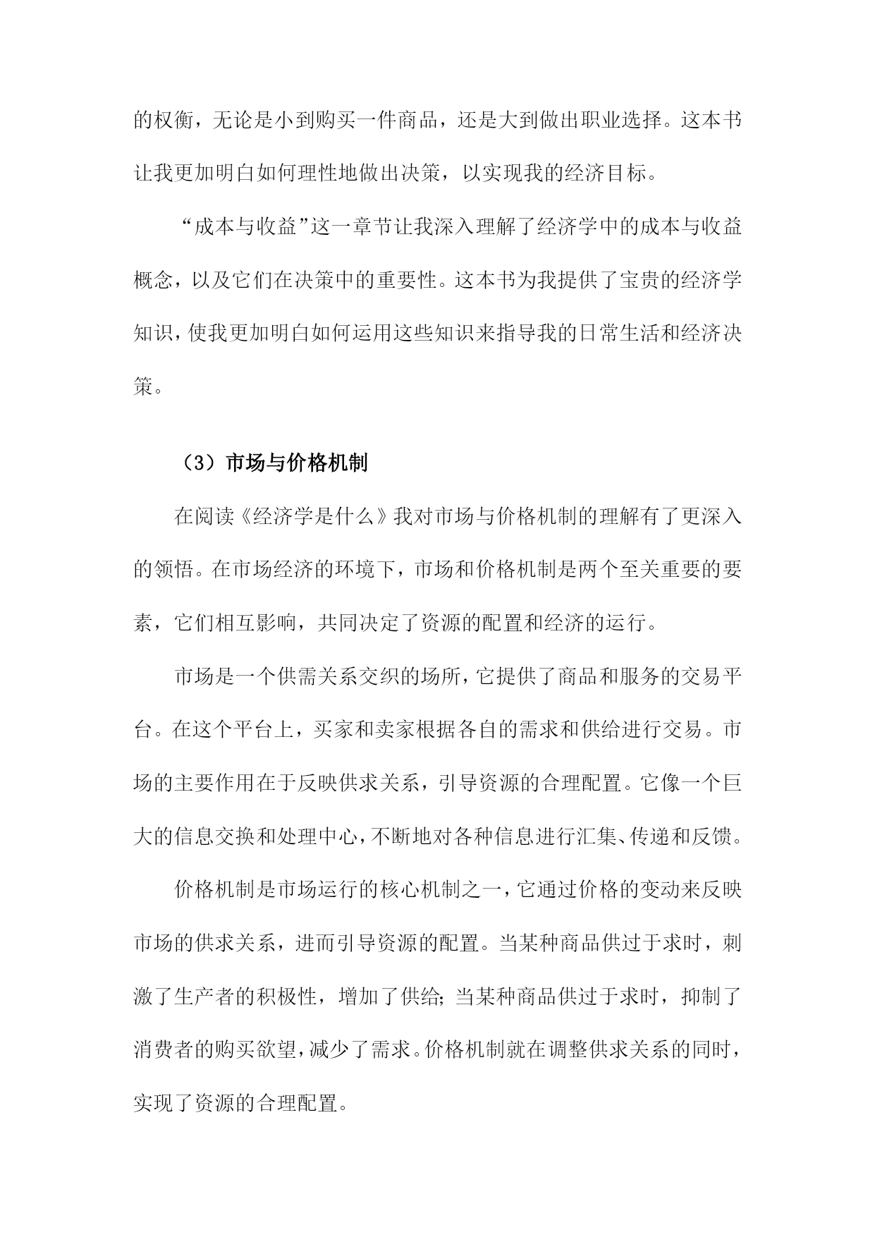 《经济学是什么》读书记录一、书籍简介《经济学是什么》是一本旨在帮助读者理解经济学基本原理和概念的普及性读物。本书通过对经济学的历史发展、基本概念和理论框架进行深入浅出的介绍,帮助读者建立起对经济学的基本认识。这本书既适合对经济学感兴趣的普通读者阅读,也适合作为经济学入门者的学习指南。书中不仅解释了经济学的基本概念,也通过实际案例来展示经济学的应用,使得经济学变得更为生动和实用。这本书的主要内容包括经济学的定义、发展历史、研究方法、基本假设、市场供需原理、宏观经济学与微观经济学的区别等。作者以通俗易懂的语言,将复杂的经济学理论解释得清晰明了,使读者能够更好地理解经济学的本质和内涵。1.作者介绍本书作者为著名经济学家张三(化名),张三教授拥有丰富的经济学研究背景及深厚的学术积累。他毕业于国内外知名大学的经济学院,并在国内外知名大学执教多年,拥有广泛的影响力。张三教授不仅专注于经济学理论的研究,还密切关注全球经济动态,对现实经济问题有独到的见解。张三教授在经济学领域取得了博士学位,并在多个经济学分支领域有所建树。他对于微观经济学、宏观经济学、国际经济学以及发展经济学等领域都有深入的研究。张三教授还曾在多个国际经济学研究机构担任研究员或访问学者,与世界各地的经济学家进行了广泛的学术交流。《经济学是什么》是张三教授的代表作之一。这本书旨在为广大读者提供一个通俗易懂的经济学入门指南,帮助读者理解经济学的基本原理和核心概念。本书结合了现实生活中的经济现象和案例,深入浅出地阐述了经济学的奥秘,使经济学变得不再晦涩难懂。张三教授的写作风格平易近人,他善于用生动的语言和实际的例子来解释复杂的经济学理论。他通过简洁明了的文字,引导读者走进经济学的殿堂,让读者在轻松愉快的阅读中掌握经济学的知识。张三教授在经济学领域的研究成果对学术界产生了深远的影响。他的这本书《经济学是什么》更是为广大民众普及经济学知识,为经济学在社会的普及和推广做出了巨大贡献。通过这本书,许多对经济学不了解的读者开始走进经济学的世界,理解经济学的魅力。2.出版背景在我深入阅读《经济学是什么》对其出版背景产生了深厚的兴趣,下面是我关于此书出版背景的记录:在当今全球化进程中,经济全球化不断加深的大背景下,无论是在社会公共政策的制定上,还是在日常个人生活决策中,经济学都扮演着越来越重要的角色。大众对经济学理论的理解和掌握程度并不均衡,尤其在许多非经济专业的人群中,对经济学的理解还存在误区或是一知半解。这成为了大众迫切需要更简洁、易懂的经济学知识的关键动力来源。在这样的大背景下,《经济学是什么》一书应运而生。该书的出版是对大众需求深度理解的体现,体现了现代社会普及经济学科普知识的迫切性。在经济变革与进步的浪潮中,社会需要对经济理论和市场动态有更加深入的认识和把握。《经济学是什么》通过深入浅出的方式,帮助大众理解经济学的核心概念、原理和方法论,以及其在现实生活中的实际应用。这本书的出版旨在填补大众对经济学知识需求的空白,为普及经济学科普知识开辟一条新的路径。它也反映了当代社会对经济教育的重视和对经济知识的渴求,通过本书的阅读,读者可以更加清晰地理解经济学的本质和魅力,从而更加理性地参与经济生活,作出明智的决策。这也正是该书出版的重要目的和背景所在。3.书籍内容概述《经济学是什么》一书内容全面,深入浅出地介绍了经济学的各个领域和概念。本书首先从历史的角度阐述了经济学的起源和发展,帮助读者了解这门学科的演变过程。从微观经济学入手,介绍了供给与需求的基本原理、市场机制的运行以及价格的形成等核心概念。随后转向宏观经济学,讲解了国民经济运行的规律、经济周期的波动以及政府如何调控经济等问题。书中还涉及了国际经济学的内容,包括国际贸易、汇率制度以及全球经济一体化等议题。书中还对重要的经济学理论和学派进行了介绍和解读,如古典经济学、凯恩斯主义、货币学派等。结合现实生活中的案例和事件,深入浅出地解释了经济学理论在实际中的应用和影响。本书还探讨了经济学与其他社会科学如社会学、心理学等的交叉领域,展示了经济学的多元化和综合性。在阅读过程中,我对经济学的基本理论和概念有了更深入的理解,对于经济现象和经济问题也有了更加全面的认识。这本书不仅让我了解了经济学的知识体系,还激发了我对经济学研究的兴趣。通过书中的案例分析,我更加明白了经济学的实践性和现实意义。也深刻体会到了经济学与社会生活的紧密联系和相互影响。《经济学是什么》一书内容充实,既适合初学者入门,也适合已经有一定基础的读者深入学习和理解经济学的相关知识。二、阅读体会在阅读《经济学是什么》这本书的过程中,我深受启发。这本书以通俗易懂的语言,深入浅出地介绍了经济学的原理及其在现实生活中的运用,让我对经济学有了更深入的了解。我认识到