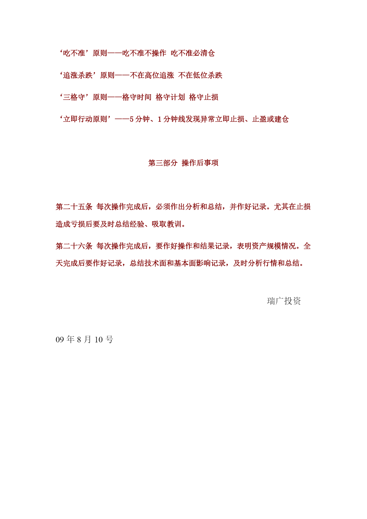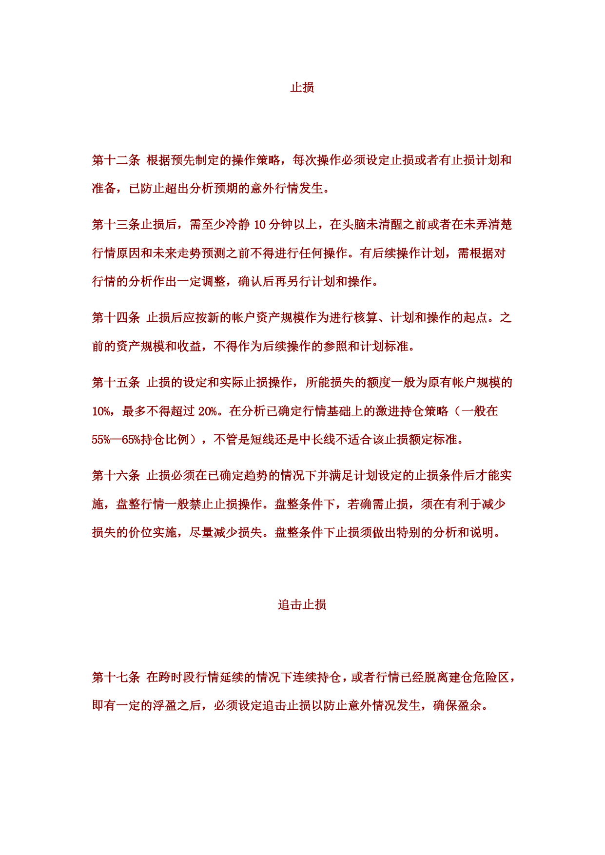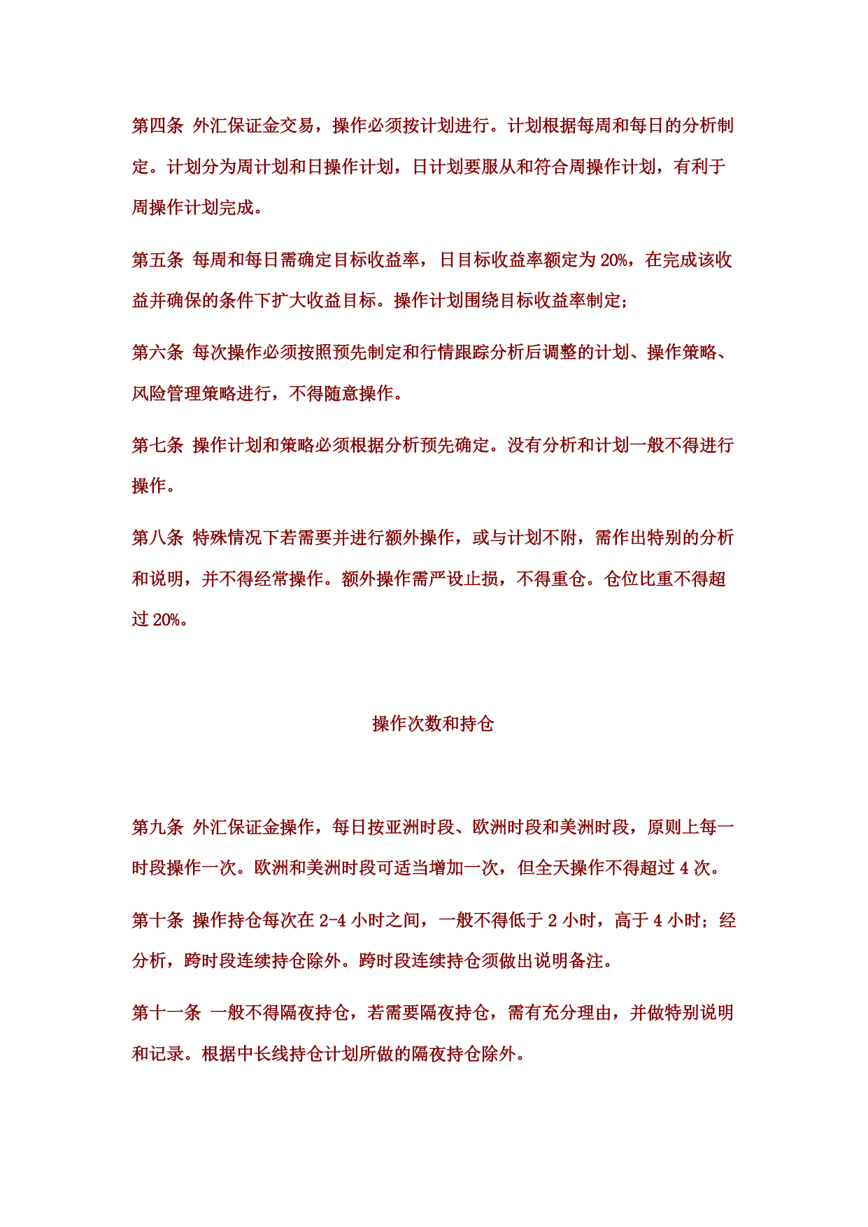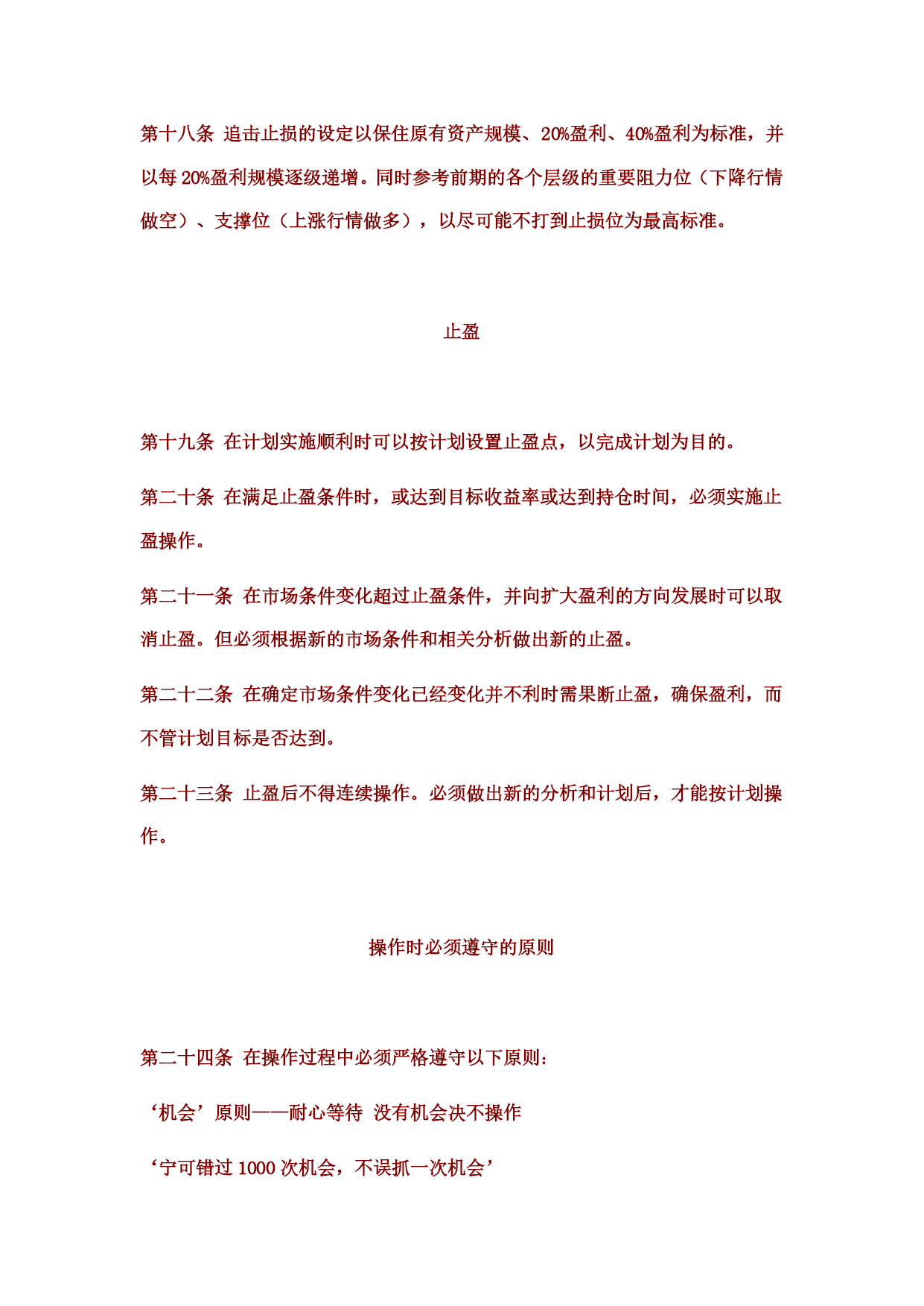 第一部分总则第一条为确保外汇交易成功,实现稳定、持续、长期的盈利,特制定此《规范》,并在交易操作中严格遵守。外汇市场是一个变化无常而极具不确定性的市场,外汇交易也是一个复杂的过程。因此,我们进行外汇交易必须有一个规范、一个纪律,并长期严格遵守,才能获得成功,以不变应万变。第二条外汇市场和外汇保证金交易都有其不同于其他市场和金融工具的特点。尤其是外汇保证金交易,其一个最显著的特点就是,短期内甚至在几分钟内投资人的盈亏就会产生巨大变化,资产规模大幅波动,即风险和收益对外汇行情的波动十分敏感;其次,交易杠杆的选择和仓位比例的大小都会在收益、损失和交易成本方面产生很大的作用;因此,制定交易规范必须紧紧围绕这个主题,顺应外汇市场和保证金交易的特点。第三条外汇交易,分析、计划、策略和操作是必不可少的几个相互联系的环节。交易规范的制定也必须坚持于这几个环节相协调、相统一的原则。操作要做到事前计划、事中监督和事后总结。第二部分主要内容操作的计划性第四条外汇保证金交易,操作必须按计划进行。计划根据每周和每日的分析制定。计划分为周计划和日操作计划,日计划要服从和符合周操作计划,有利于周操作计划完成。第五条每周和每日需确定目标收益率,日目标收益率额定为20%,在完成该收益并确保的条件下扩大收益目标。操作计划围绕目标收益率制定;第六条每次操作必须按照预先制定和行情跟踪分析后调整的计划、操作策略、风险管理策略进行,不得随意操作。第七条操作计划和策略必须根据分析预先确定。没有分析和计划一般不得进行操作。第八条特殊情况下若需要并进行额外操作,或与计划不附,需作出特别的分析和说明,并不得经常操作。额外操作需严设止损,不得重仓。仓位比重不得超过20%。操作次数和持仓第九条外汇保证金操作,每日按亚洲时段、欧洲时段和美洲时段,原则上每一时段操作一次。欧洲和美洲时段可适当增加一次,但全天操作不得超过4次。第十条操作持仓每次在2-4小时之间,一般不得低于2小时,高于4小时;经分析,跨时段连续持仓除外。跨时段连续持仓须做出说明备注。第十一条一般不得隔夜持仓,若需要隔夜持仓,需有充分理由,并做特别说明和记录。根据中长线持仓计划所做的隔夜持仓除外。止损第十二条根据预先制定的操作策略,每次操作必须设定止损或者有止损计划和准备,已防止超出分析预期的意外行情发生。第十三条止损后,需至少冷静10分钟以上,在头脑未清醒之前或者在未弄清楚行情原因和未来走势预测之前不得进行任何操作。有后续操作计划,需根据对行情的分析作出一定调整,确认后再另行计划和操作。第十四条止损后应按新的帐户资产规模作为进行核算、计划和操作的起点。之前的资产规模和收益,不得作为后续操作的参照和计划标准。第十五条止损的设定和实际止损操作,所能损失的额度一般为原有帐户规模的10%,最多不得超过20%。在分析已确定行情基础上的激进持仓策略(一般在55%—65%持仓比例),不管是短线还是中长线不适合该止损额定标准。第十六条止损必须在已确定趋势的情况下并满足计划设定的止损条件后才能实施,盘整行情一般禁止止损操作。盘整条件下,若确需止损,须在有利于减少损失的价位实施,尽量减少损失。盘整条件下止损须做出特别的分析和说明。追击止损第十七条在跨时段行情延续的情况下连续持仓,或者行情已经脱离建仓危险区,即有一定的浮盈之后,必须设定追击止损以防止意外情况发生,确保盈余。第十八条追击止损的设定以保住原有资产规模、20%盈利、40%盈利为标准,并以每20%盈利规模逐级递增。同时参考前期的各个层级的重要阻力位(下降行情做空)、支撑位(上涨行情做多),以尽可能不打到止损位为最高标准。止盈第十九条在计划实施顺利时可以按计划设置止盈点,以完成计划为目的。第二十条在满足止盈条件时,或达到目标收益率或达到持仓时间,必须实施止盈操作。第二十一条在市场条件变化超过止盈条件,并向扩大盈利的方向发展时可以取消止盈。但必须根据新的市场条件和相关分析做出新的止盈。第二十二条在确定市场条件变化已经变化并不利时需果断止盈,确保盈利,而不管计划目标是否达到。第二十三条止盈后不得连续操作。必须做出新的分析和计划后,才能按计划操作。操作时必须遵守的原则第二十四条在操作过程中必须严格遵守以下原则:‘机会’原则——耐心等待没有机会决不操作‘宁可错过1000次机会,不误抓一次机会’‘吃不准’原则——吃不准不操作吃不准必清仓‘追涨杀跌’原则——不在高位追涨不在低位杀跌‘三格守’原则——格守时间格守计划格守止损‘立即行动原则’——5分钟、1分钟线发现异常立即止损、止盈或建仓第三部分操作后事项第二十五条每次操作完成后,必须作出分析和总结,并作好记录。尤其在止损造成亏损后要及时总