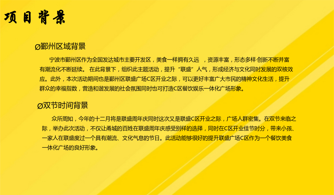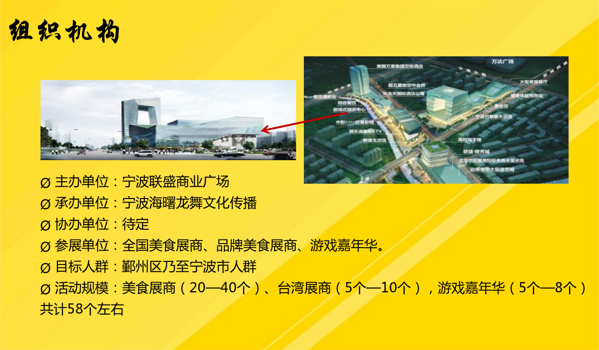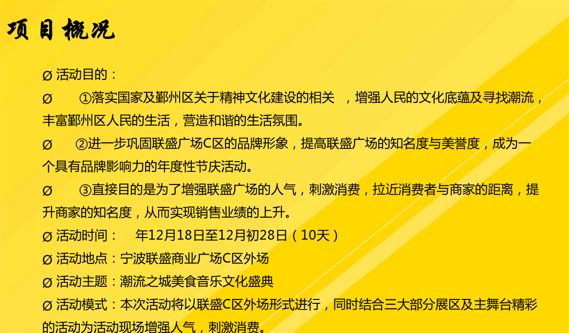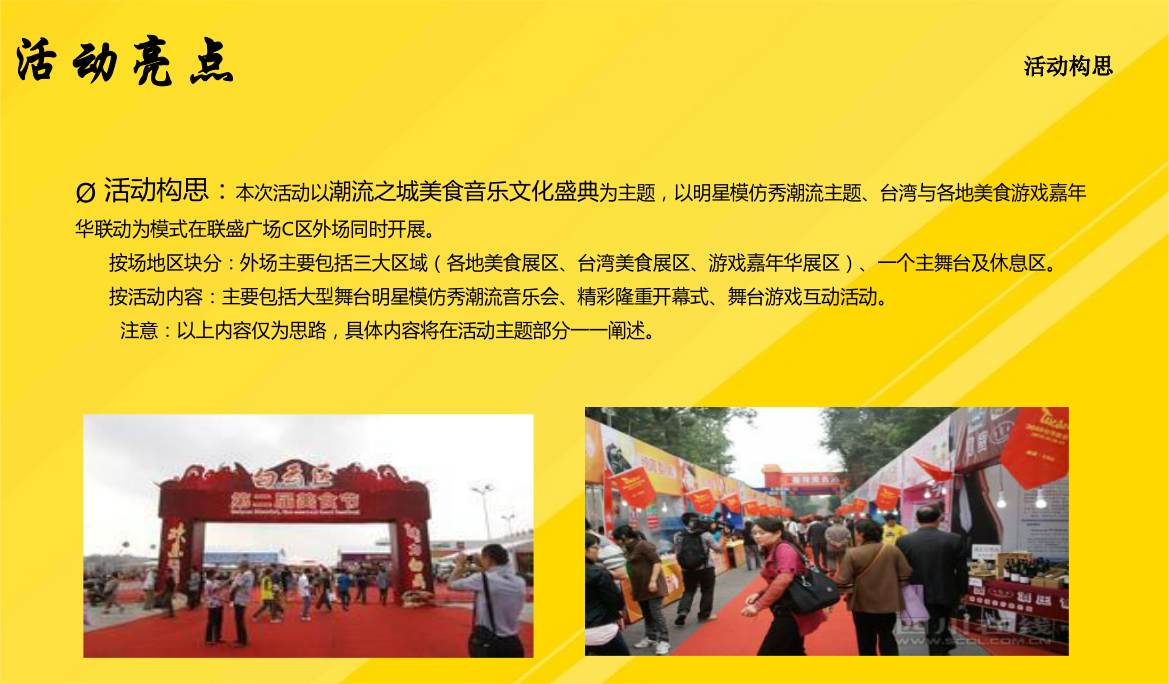 目录项目背景项目背景项目概况组织机构活动亮点活动主体它料重味醇,肉料汤浓,镆筋光滑,香气四溢,食后余味无穹,又有暖胃功能。品尝美味,兼顾吃与喝。②进一步巩固联盛广场C区的品牌形象,提高联盛广场的知名度与美誉度,成为一个具有品牌影响力的年度性节庆活动。挂炉烤鸭是用枣、桃、梨等果木烧烤鸭子。全国的味道,只在这里,在城市广场!承办单位:宁波海曙龙舞文化传播斜面门头有助于防雨功效国庆七天,一起吃遍城市广场!宁波市鄞州区作为全国发达城市主要开发区,美食一样拥有久远,资源丰富,形态多样·创新不断并富有潮流化不断延续。③直接目的是为了增强联盛广场的人气,刺激消费,拉近消费者与商家的距离,提升商家的知名度,从而实现销售业绩的上升。拌以香油、芝麻酱、五香酱菜等配料,更具特色。来宾可在现场填写个人喜好的美食(可多选)进行每日一次的抽奖。主办单位:宁波联盛商业广场围绕潮流之城美食音乐文化盛典的宣传主题,展开一系列宣传活动,融合专业气息,重拳出击再次打响联盛非物质文化艺术的品牌节庆活动。①落实国家及鄞州区关于精神文化建设的相关,增强人民的文化底蕴及寻找潮流,丰富鄞州区人民的生活,营造和谐的生活氛围。展位参展商租用展位的同时将做三包承诺,自行清理展位周边卫生;活动主体活动主体活动主体活动主体活动主体活动主体宣传推广具体费用目录◎活动概述宣传渠道主要媒体推介——诸暨地区各大主流媒体:《诸暨日报》、《诸暨电视台》、《诸暨广播电台》等。全国小吃即将登陆城市广场!纸媒宣传方式②:报广。网络方式:网络门户广告。其他媒体:短信群发主要路口网格架电台投放:在人气调频的时间广播15秒的精准广告。主要推介:诸暨广播电台新媒体方式:新浪微博、活动内容盐水鸭是南京有名的特产,久负盛名,据说至今已有一千多年的。北京比较有名的有天桥的爆肚石,东安市场的爆肚王、后门的爆肚张,其他还有爆肚杨、爆肚冯、爆肚满等。到南京是不能不吃盐水鸭的。环节二:经典形象拜访城市广场另一种是由于人员高度集中,在出现各种意外时相互拥挤、踩踏,造成人员伤亡。分为线上与线下两个部分。全国的味道,只在这里,在城市广场!以迅雷不及掩耳之势展开宣传攻势,封杀视觉界限!!!国庆七天,一起吃遍城市广场!可能出现的紧急事故类型有两种:一种是发生火灾;将活动管理系统化、规范化和科学化扎实极富弹性的面皮,入口瞬间新自然回甘的风味,软弹牙的口感,加上鲜嫩可口的内馅,令人回味无穷。该品素以皮薄、馅多、卤重、味鲜而闻名,是深受国内外顾客欢迎的风味小吃之一。1、大型龙门架,聚焦目光。(3)各展位配备干粉灭火器,严密注意火灾事故;展中:以开幕式的形式正式向外界发声,同时现场将以媒体跟踪报道和微博直播及宣传车全鄞州跑等形式实时传递信息。咸味的有葱油、鲜肉、蟹粉、虾仁等,甜的有白糖、玫瑰、豆沙、枣泥等品种。北京比较有名的有天桥的爆肚石,东安市场的爆肚王、后门的爆肚张,其他还有爆肚杨、爆肚冯、爆肚满等。嘉兴鲜肉粽子栗子糕云南饵块是云南省大理市的特产。饵块为云南特有,是大理市最著名的名特小吃之一,饵块系用优质大米加工制成,一般分为块、丝、片三种。制作方法烧、煮、炒、卤、蒸、炸均可,风味各异,久食不厌。羊肉泡馍是陕西的风味美馆,尤以西安的最享盛名。它料重味醇,肉料汤浓,镆筋光滑,香气四溢,食后余味无穹,又有暖胃功能。在一百多年以前,在天津卫海河西侧,繁华喧闹的小白楼南端,有一条名为十八街的巷子,原来巷子之中有一家小小的麻花铺,字号唤作“桂发祥”。十八街麻花是经过反复探索进行创新,在白条和麻条中间夹一条含有桂花、闵姜、桃仁、瓜条等多种小料的酥馅,使炸出的麻花酥软香甜与众不同,创造出的什锦夹馅大麻花。其特点是香、酥、脆、甜,在干燥通风处放置数月不走味,不绵软、不变质。烧腊是一种菜肴,它包括烧鹅、乳鸽、乳猪、叉烧以及一些卤水菜式。烧腊其实分为“烧”和“腊”两种,但是现在人们总是将“烧腊”连在一起叫,都不太在乎种类了。烧腊一般是先用秘制的酱汁腌制一段时间再放到炉里烤,烧鹅、乳猪皮脆,肥美,口味略带广东人喜爱的甜味。南京盐水鸭千层油糕台湾大鸡排龙抄手白肉血肠荷叶糍粑除上述之外,还有更多期待,一场属于食客饕餮筵席!规格:3m*3m斜面门头有助于防雨功效环节一:我最爱的十大明星小吃环节二:经典形象拜访城市广场环节三:1分钱起拍特色饮品其他环节工作守则为使本活动现场保持良好的专业形象和社会声誉将活动管理系统化、规范化和科学化加强员工素质,劳动纪律;维护现场秩序,提高工作效率保障此次活动的完美举行,特制定本制度现场所有参与的工作人员必须严格遵守。环境保护细则:活动现场甬路每30米设一个分类垃圾桶;每个摊位旁都会设有大垃圾桶;每天白天有环卫工人进行场地清理与维护;展位参展商