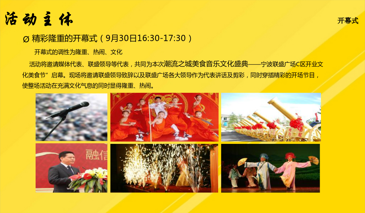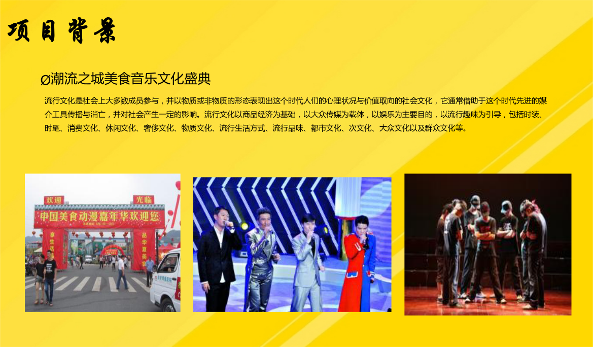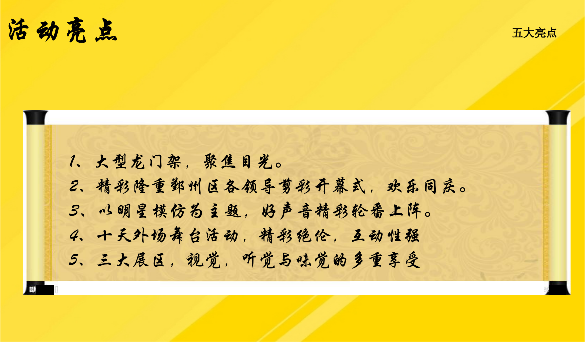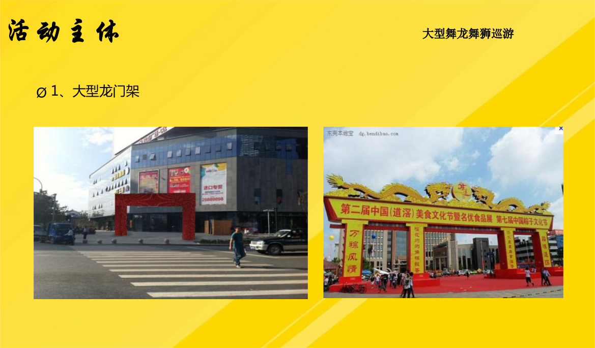目录项目背景项目背景项目概况组织机构活动亮点活动主体它料重味醇,肉料汤浓,镆筋光滑,香气四溢,食后余味无穹,又有暖胃功能。品尝美味,兼顾吃与喝。②进一步巩固联盛广场C区的品牌形象,提高联盛广场的知名度与美誉度,成为一个具有品牌影响力的年度性节庆活动。挂炉烤鸭是用枣、桃、梨等果木烧烤鸭子。全国的味道,只在这里,在城市广场!承办单位:宁波海曙龙舞文化传播斜面门头有助于防雨功效国庆七天,一起吃遍城市广场!宁波市鄞州区作为全国发达城市主要开发区,美食一样拥有久远,资源丰富,形态多样·创新不断并富有潮流化不断延续。③直接目的是为了增强联盛广场的人气,刺激消费,拉近消费者与商家的距离,提升商家的知名度,从而实现销售业绩的上升。拌以香油、芝麻酱、五香酱菜等配料,更具特色。来宾可在现场填写个人喜好的美食(可多选)进行每日一次的抽奖。主办单位:宁波联盛商业广场围绕潮流之城美食音乐文化盛典的宣传主题,展开一系列宣传活动,融合专业气息,重拳出击再次打响联盛非物质文化艺术的品牌节庆活动。①落实国家及鄞州区关于精神文化建设的相关,增强人民的文化底蕴及寻找潮流,丰富鄞州区人民的生活,营造和谐的生活氛围。展位参展商租用展位的同时将做三包承诺,自行清理展位周边卫生;活动主体活动主体活动主体活动主体活动主体活动主体宣传推广具体费用目录◎活动概述宣传渠道主要媒体推介——诸暨地区各大主流媒体:《诸暨日报》、《诸暨电视台》、《诸暨广播电台》等。全国小吃即将登陆城市广场!纸媒宣传方式②:报广。网络方式:网络门户广告。其他媒体:短信群发主要路口网格架电台投放:在人气调频的时间广播15秒的精准广告。主要推介:诸暨广播电台新媒体方式:新浪微博、活动内容盐水鸭是南京有名的特产,久负盛名,据说至今已有一千多年的。北京比较有名的有天桥的爆肚石,东安市场的爆肚王、后门的爆肚张,其他还有爆肚杨、爆肚冯、爆肚满等。到南京是不能不吃盐水鸭的。环节二:经典形象拜访城市广场另一种是由于人员高度集中,在出现各种意外时相互拥挤、踩踏,造成人员伤亡。分为线上与线下两个部分。全国的味道,只在这里,在城市广场!以迅雷不及掩耳之势展开宣传攻势,封杀视觉界限!!!国庆七天,一起吃遍城市广场!可能出现的紧急事故类型有两种:一种是发生火灾;将活动管理系统化、规范化和科学化扎实极富弹性的面皮,入口瞬间新自然回甘的风味,软弹牙的口感,加上鲜嫩可口的内馅,令人回味无穷。该品素以皮薄、馅多、卤重、味鲜而闻名,是深受国内外顾客欢迎的风味小吃之一。1、大型龙门架,聚焦目光。(3)各展位配备干粉灭火器,严密注意火灾事故;展中:以开幕式的形式正式向外界发声,同时现场将以媒体跟踪报道和微博直播及宣传车全鄞州跑等形式实时传递信息。咸味的有葱油、鲜肉、蟹粉、虾仁等,甜的有白糖、玫瑰、豆沙、枣泥等品种。北京比较有名的有天桥的爆肚石,东安市场的爆肚王、后门的爆肚张,其他还有爆肚杨、爆肚冯、爆肚满等。嘉兴鲜肉粽子栗子糕云南饵块是云南省大理市的特产。饵块为云南特有,是大理市最著名的名特小吃之一,饵块系用优质大米加工制成,一般分为块、丝、片三种。制作方法烧、煮、炒、卤、蒸、炸均可,风味各异,久食不厌。羊肉泡馍是陕西的风味美馆,尤以西安的最享盛名。它料重味醇,肉料汤浓,镆筋光滑,香气四溢,食后余味无穹,又有暖胃功能。在一百多年以前,在天津卫海河西侧,繁华喧闹的小白楼南端,有一条名为十八街的巷子,原来巷子之中有一家小小的麻花铺,字号唤作“桂发祥”。十八街麻花是经过反复探索进行创新,在白条和麻条中间夹一条含有桂花、闵姜、桃仁、瓜条等多种小料的酥馅,使炸出的麻花酥软香甜与众不同,创造出的什锦夹馅大麻花。其特点是香、酥、脆、甜,在干燥通风处放置数月不走味,不绵软、不变质。烧腊是一种菜肴,它包括烧鹅、乳鸽、乳猪、叉烧以及一些卤水菜式。烧腊其实分为“烧”和“腊”两种,但是现在人们总是将“烧腊”连在一起叫,都不太在乎种类了。烧腊一般是先用秘制的酱汁腌制一段时间再放到炉里烤,烧鹅、乳猪皮脆,肥美,口味略带广东人喜爱的甜味。南京盐水鸭千层油糕台湾大鸡排龙抄手白肉血肠荷叶糍粑除上述之外,还有更多期待,一场属于食客饕餮筵席!规格:3m*3m斜面门头有助于防雨功效环节一:我最爱的十大明星小吃环节二:经典形象拜访城市广场环节三:1分钱起拍特色饮品其他环节工作守则为使本活动现场保持良好的专业形象和社会声誉将活动管理系统化、规范化和科学化加强员工素质,劳动纪律;维护现场秩序,提高工作效率保障此次活动的完美举行,特制定本制度现场所有参与的工作人员必须严格遵守。环境保护细则:活动现场甬路每30米设一个分类垃圾桶;每个摊位旁都会设有大垃圾桶;每天白天有环卫工人进行场地清理与维护;展位参展商