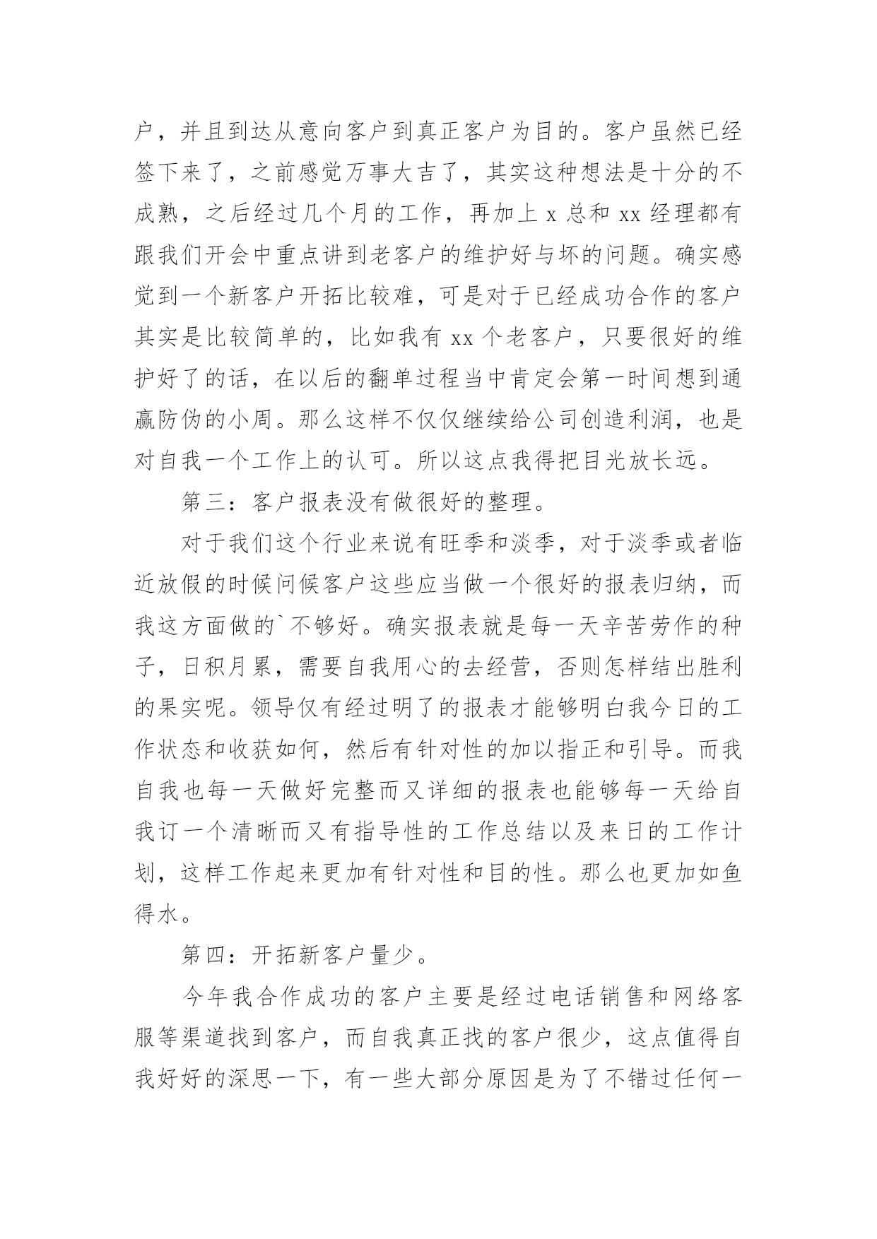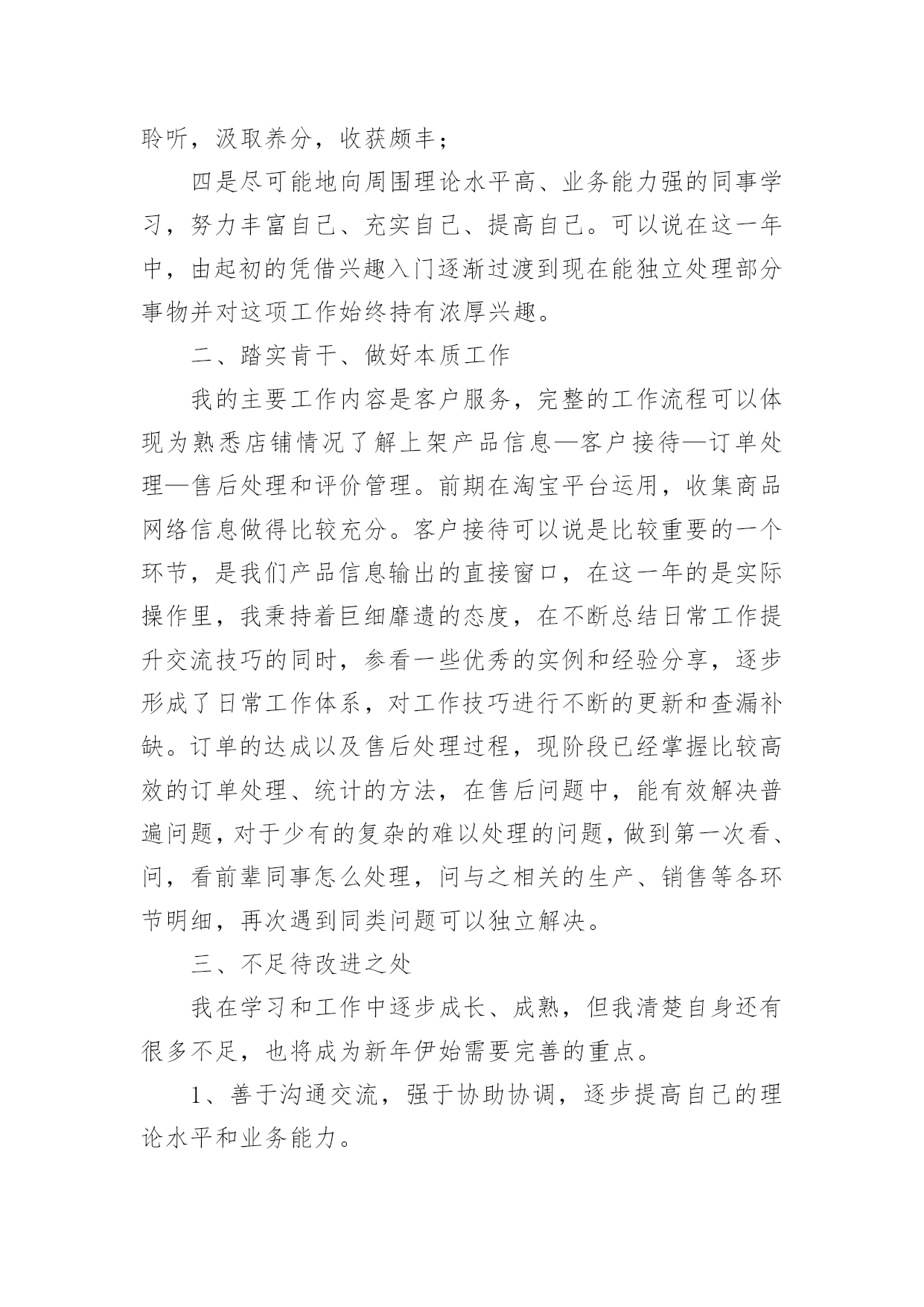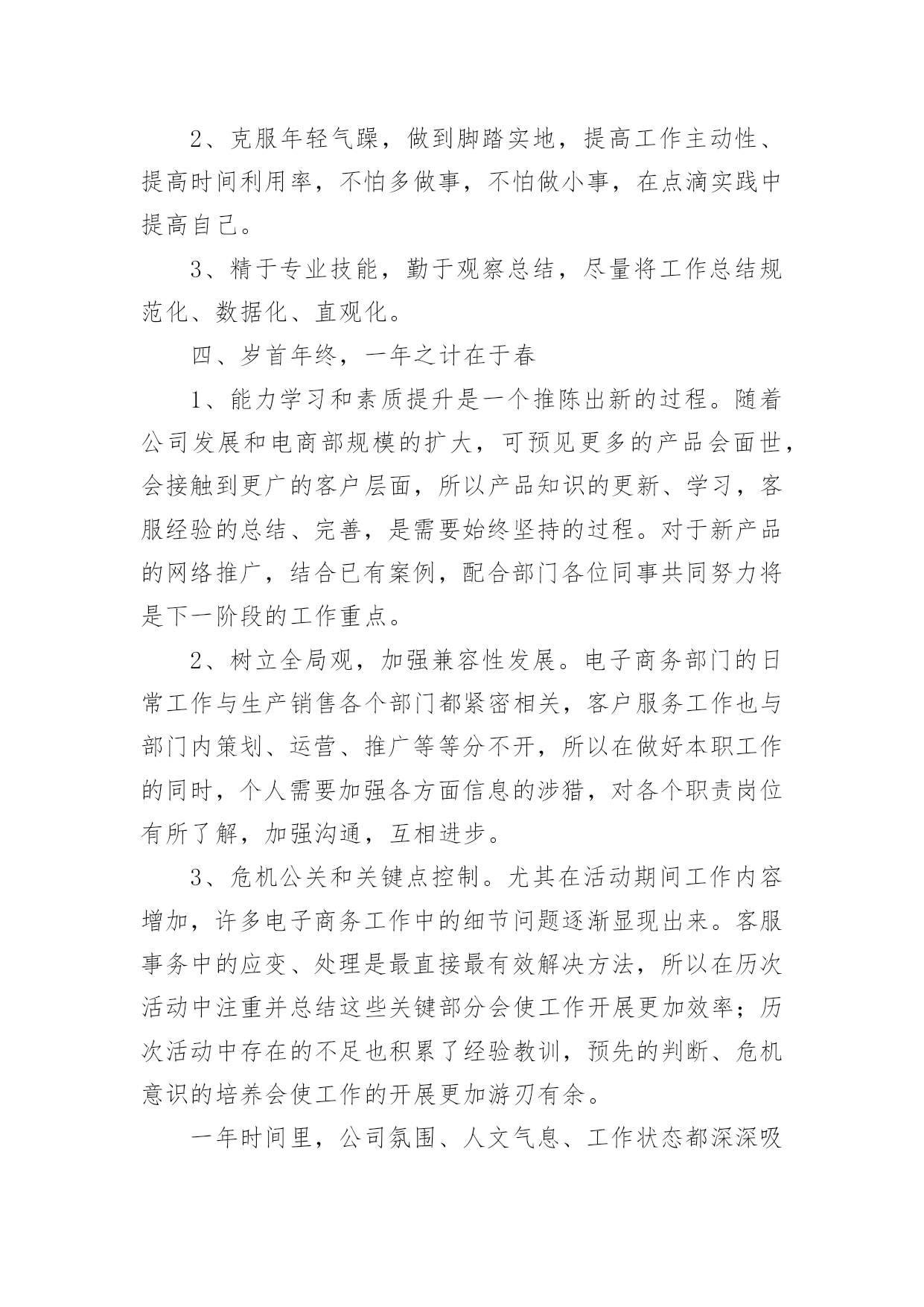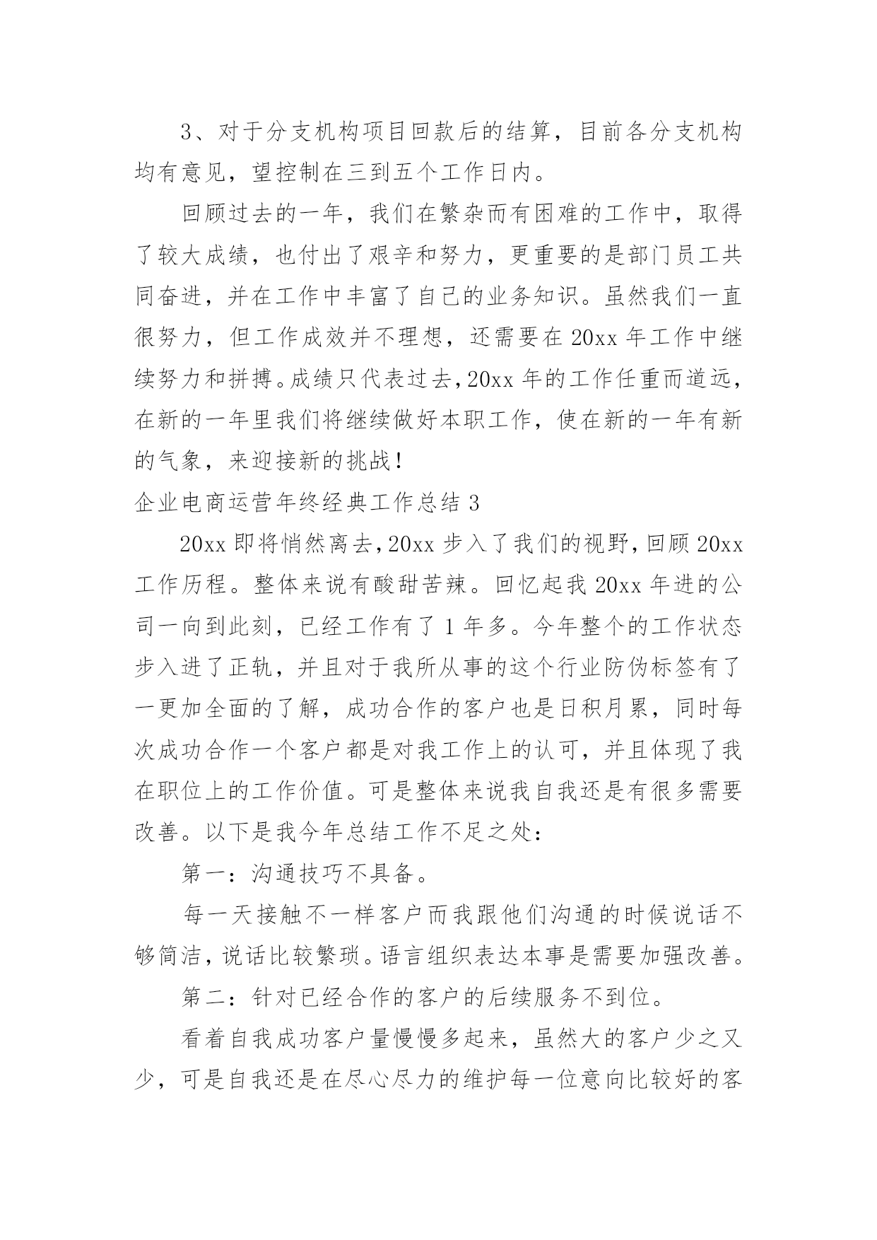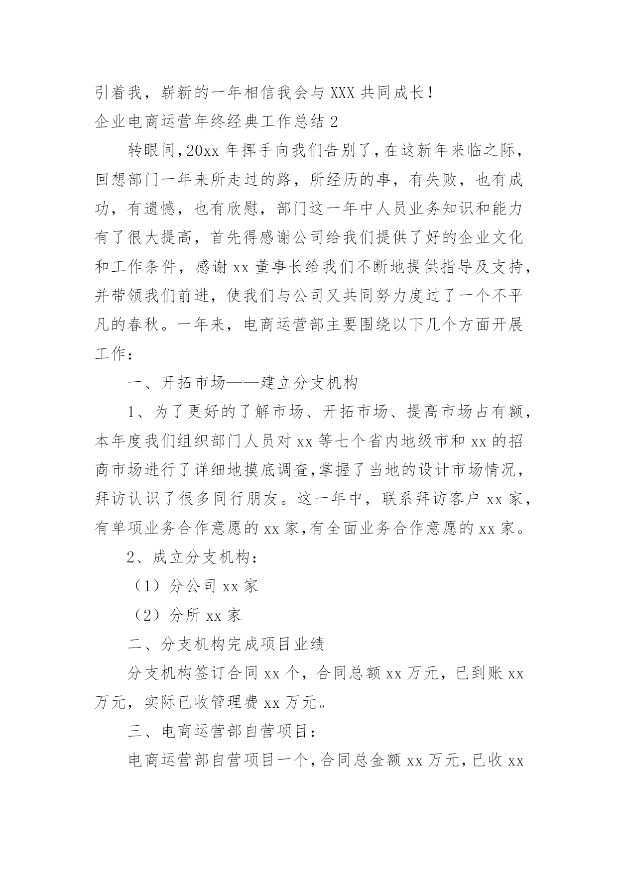 企业电商运营年终经典工作总结企业电商运营年终经典工作总结总结是指社会团体、企业单位和个人对某一阶段的学习、工作或其完成情况加以回顾和分析,得出教训和一些规律性认识的一种书面材料,通过它可以全面地、系统地了解以往的学习和工作情况,因此我们需要回头归纳,写一份总结了。我们该怎么去写总结呢?下面是小编收集整理的企业电商运营年终经典工作总结,希望对大家有所帮助。企业电商运营年终经典工作总结1在过去的一年中很有幸加入到XXX公司来,在领导的悉心关怀下,在同事们的帮助下,通过自身的努力,各方面都取得了一定的进步,较好地完成了自己的本职工作。现将工作情况作简要总结:一、不断加强学习,素质进一步提高。具备良好的产品知识和业务素质是做好本职工作的前提和必要条件。一年以来,始终把学习放在重要位置,努力在提高自身综合素质上下功夫。一是重点学习了产品知识;二是学习了与电子商务部门相关的规章制度;三是在前辈指导下联系实际学习电子商务的工作技巧,注意收集相关信息。对公司领导各次会议中的讲话总是认真聆听,汲取养分,收获颇丰;四是尽可能地向周围理论水平高、业务能力强的同事学习,努力丰富自己、充实自己、提高自己。可以说在这一年中,由起初的凭借兴趣入门逐渐过渡到现在能独立处理部分事物并对这项工作始终持有浓厚兴趣。二、踏实肯干、做好本质工作我的主要工作内容是客户服务,完整的工作流程可以体现为熟悉店铺情况了解上架产品信息—客户接待—订单处理—售后处理和评价管理。前期在淘宝平台运用,收集商品网络信息做得比较充分。客户接待可以说是比较重要的一个环节,是我们产品信息输出的直接窗口,在这一年的是实际操作里,我秉持着巨细靡遗的态度,在不断总结日常工作提升交流技巧的同时,参看一些优秀的实例和经验分享,逐步形成了日常工作体系,对工作技巧进行不断的更新和查漏补缺。订单的达成以及售后处理过程,现阶段已经掌握比较高效的订单处理、统计的方法,在售后问题中,能有效解决普遍问题,对于少有的复杂的难以处理的问题,做到第一次看、问,看前辈同事怎么处理,问与之相关的生产、销售等各环节明细,再次遇到同类问题可以独立解决。三、不足待改进之处我在学习和工作中逐步成长、成熟,但我清楚自身还有很多不足,也将成为新年伊始需要完善的重点。1、善于沟通交流,强于协助协调,逐步提高自己的理论水平和业务能力。2、克服年轻气躁,做到脚踏实地,提高工作主动性、提高时间利用率,不怕多做事,不怕做小事,在点滴实践中提高自己。3、精于专业技能,勤于观察总结,尽量将工作总结规范化、数据化、直观化。四、岁首年终,一年之计在于春1、能力学习和素质提升是一个推陈出新的过程。随着公司发展和电商部规模的扩大,可预见更多的产品会面世,会接触到更广的客户层面,所以产品知识的更新、学习,客服经验的总结、完善,是需要始终坚持的过程。对于新产品的网络推广,结合已有案例,配合部门各位同事共同努力将是下一阶段的工作重点。2、树立全局观,加强兼容性发展。电子商务部门的日常工作与生产销售各个部门都紧密相关,客户服务工作也与部门内策划、运营、推广等等分不开,所以在做好本职工作的同时,个人需要加强各方面信息的涉猎,对各个职责岗位有所了解,加强沟通,互相进步。3、危机公关和关键点控制。尤其在活动期间工作内容增加,许多电子商务工作中的细节问题逐渐显现出来。客服事务中的应变、处理是最直接最有效解决方法,所以在历次活动中注重并总结这些关键部分会使工作开展更加效率;历次活动中存在的不足也积累了经验教训,预先的判断、危机意识的培养会使工作的开展更加游刃有余。一年时间里,公司氛围、人文气息、工作状态都深深吸引着我,崭新的一年相信我会与XXX共同成长!企业电商运营年终经典工作总结2转眼间,20xx年挥手向我们告别了,在这新年来临之际,回想部门一年来所走过的路,所经历的事,有失败,也有成功,有遗憾,也有欣慰,部门这一年中人员业务知识和能力有了很大提高,首先得感谢公司给我们提供了好的企业文化和工作条件,感谢xx董事长给我们不断地提供指导及支持,并带领我们前进,使我们与公司又共同努力度过了一个不平凡的春秋。一年来,电商运营部主要围绕以下几个方面开展工作:一、开拓市场——建立分支机构1、为了更好的了解市场、开拓市场、提高市场占有额,本年度我们组织部门人员对xx等七个省内地级市和xx的招商市场进行了详细地摸底调查,掌握了当地的设计市场情况,拜访认识了很多同行朋友。这一年中,联系拜访客户xx家,有单项业务合作意愿的xx家,有全面业务合作意愿的xx家。2、成立分支机构:(1)分公司xx家(2)分所xx家二、分支机构完成项目业绩分支机构签订合同xx个,合同总额xx万元,已到账xx万元,实际已收管理费xx万元。三、电商运营部自营项目:电商运营部自营项目一个,合同总金额xx万元,已收xx万元