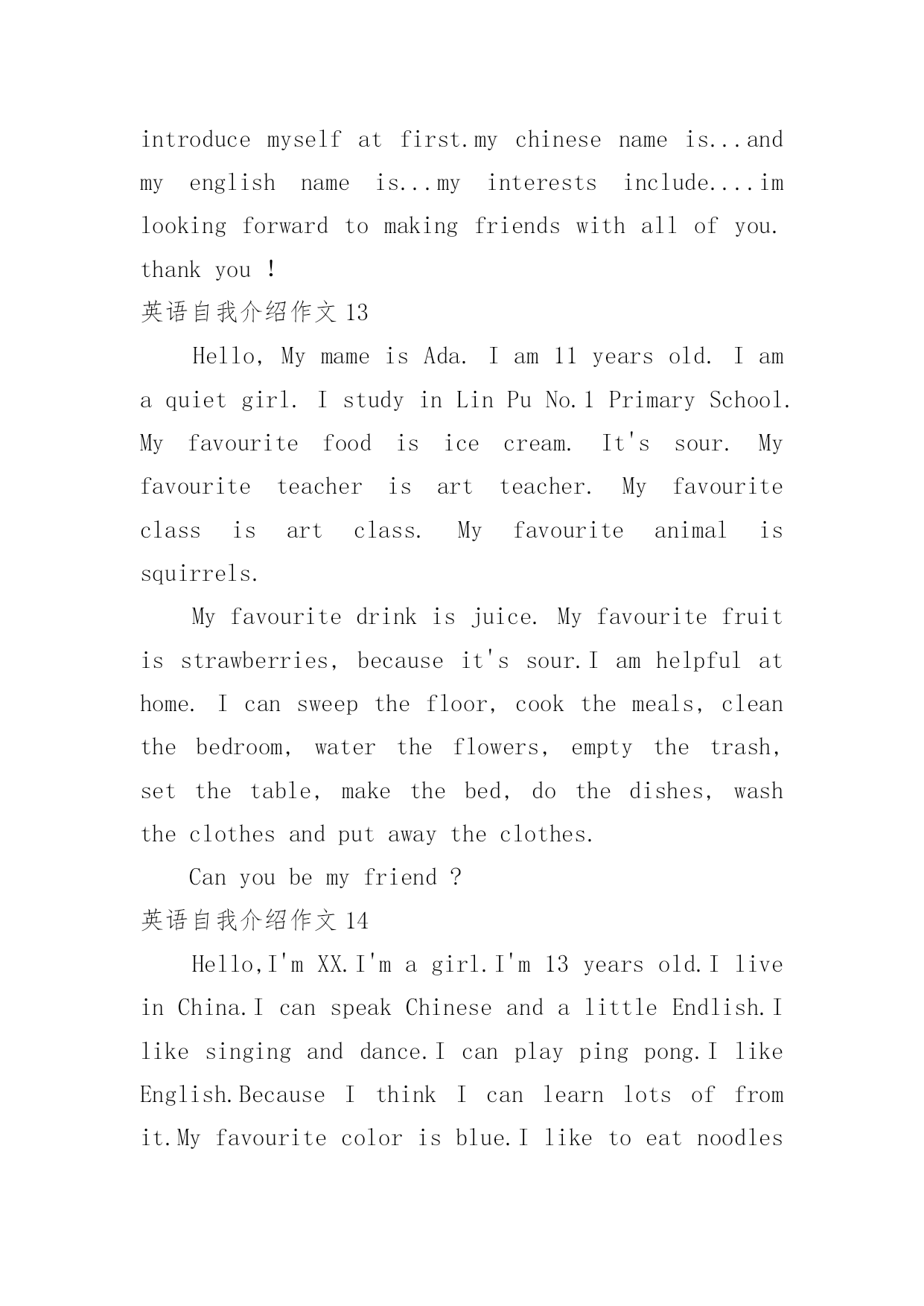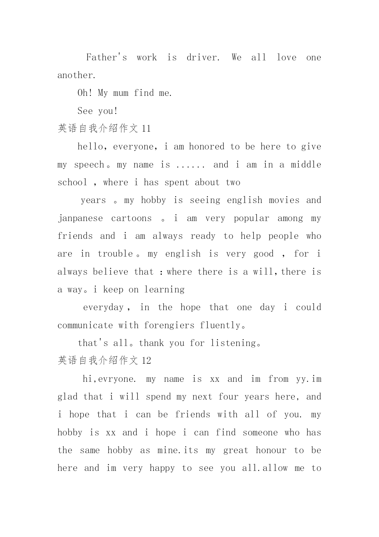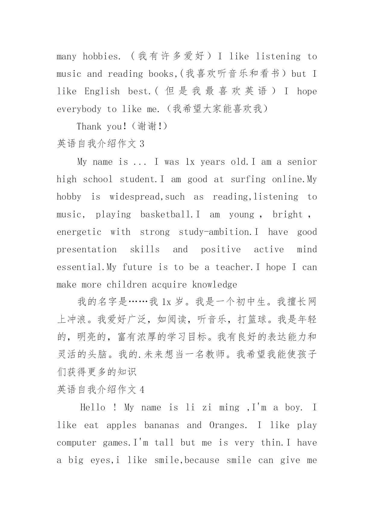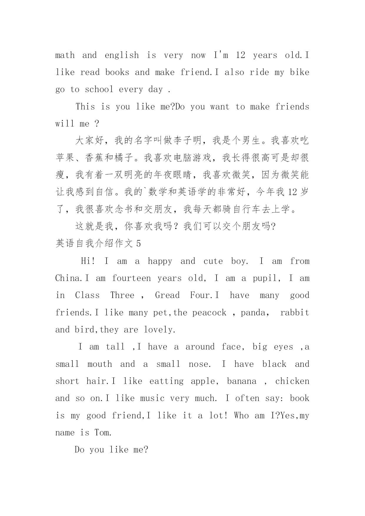 英语自我介绍作文(精)英语自我介绍作文来到一个完全陌生的环境,我们有必要对自己进行适当的介绍,自我介绍可以给陌生人留下一个好的印象。现在你是否对自我介绍一筹莫展呢?以下是小编帮大家整理的英语自我介绍作文,欢迎阅读,希望大家能够喜欢。英语自我介绍作文1IamxxxandIam12yearsold。Myfavoritesportsincludebasketball,swimandfootball。OneofmyfavoritestarsisLiuXiangbecauseheisthefastestrunnerintheworldandaprideofourcountry。Ihavelovefruitslikewatermelon,grapes,banana,andsoforth。WhenIhavetime,IlikewatchingTV,playinggamesonmycomputer,surfingtheweb,andreading。Ihavealotoffriendsandweoftenplayfootballtogether。英语自我介绍作文2Hello,everyone!(大家好!)MynameisDengShengjie.(我的.名字是杜圣洁。)Iam12.(我12岁)Iamaoptimisticgirl.(我是一个开朗的女孩)Mystudyisgood(我成绩优秀),andIamgetalongverywellwithmyclassmates.(并且我同我的同学们相处得很好)Ihavemanyhobbies.(我有许多爱好)Ilikelisteningtomusicandreadingbooks,(我喜欢听音乐和看书)butIlikeEnglishbest.(但是我最喜欢英语)Ihopeeverybodytolikeme.(我希望大家能喜欢我)Thankyou!(谢谢!)英语自我介绍作文3Mynameis...Iwas1xyearsold.Iamaseniorhighschoolstudent.Iamgoodatsurfingonline.Myhobbyiswidespread,suchasreading,listeningtomusic,playingbasketball.Iamyoung,bright,energeticwithstrongstudy-ambition.Ihavegoodpresentationskillsandpositiveactivemindessential.Myfutureistobeateacher.IhopeIcanmakemorechildrenacquireknowledge我的名字是……我1x岁。我是一个初中生。我擅长网上冲浪。我爱好广泛,如阅读,听音乐,打篮球。我是年轻的,明亮的,富有浓厚的学习目标。我有良好的表达能力和灵活的头脑。我的.未来想当一名教师。我希望我能使孩子们获得更多的知识英语自我介绍作文4Hello!Mynameisliziming,I'maboy.IlikeeatapplesbananasandOranges.Ilikeplaycomputergames.I'mtallbutmeisverythin.Ihaveabigeyes,ilikesmile,becausesmilecangivememathandenglishisverynowI'm12yearsold.Ilikereadbooksandmakefriend.Ialsoridemybikegotoschooleveryday.Thisisyoulikeme?Doyouwanttomakefriendswillme?大家好,我的名字叫做李子明,我是个男生。我喜欢吃苹果、香蕉和橘子。我喜欢电脑游戏,我长得很高可是却很瘦,我有着一双明亮的年夜眼睛,我喜欢微笑,因为微笑能让我感到自信。我的`数学和英语学的非常好,今年我12岁了,我很喜欢念书和交朋友,我每天都骑自行车去上学。这就是我,你喜欢我吗?我们可以交个朋友吗?英语自我介绍作文5Hi!Iamahappyandcuteboy.IamfromChina.Iamfourteenyearsold,Iamapupil,IaminClassThree,GreadFour.Ihavemanygoodfriends.Ilikemanypet,thepeacock,panda,rabbitandbird,theyarelovely.Iamtall,Ihaveaaroundface,bigeyes,asmallmouthandasmallnose.Ihaveblackandshorthair.Ilikeeattingapple,banana,chickenandsoon.