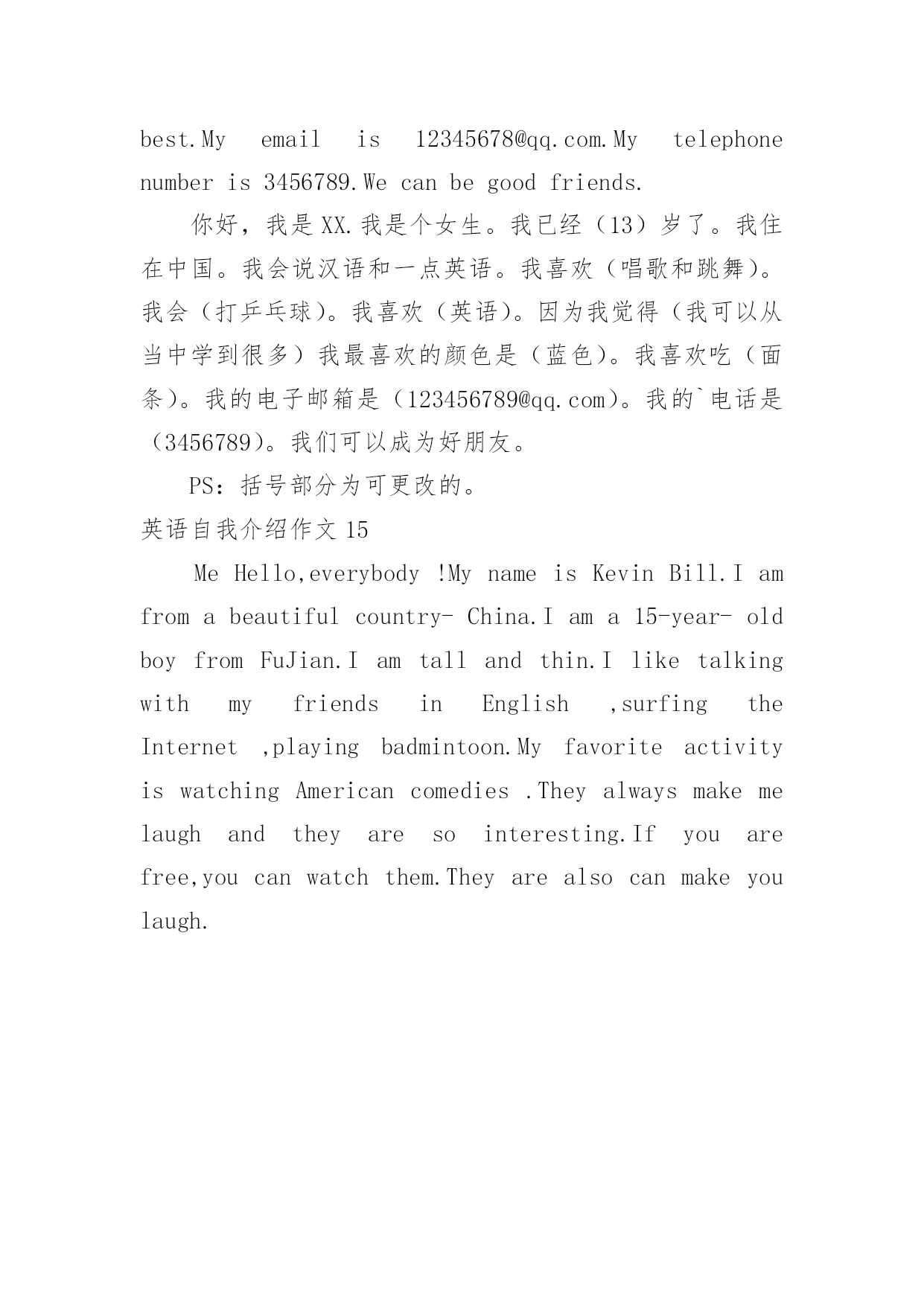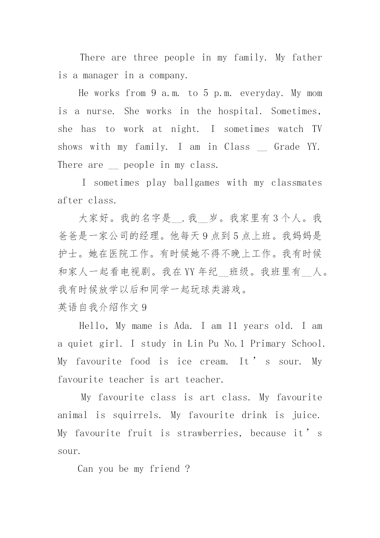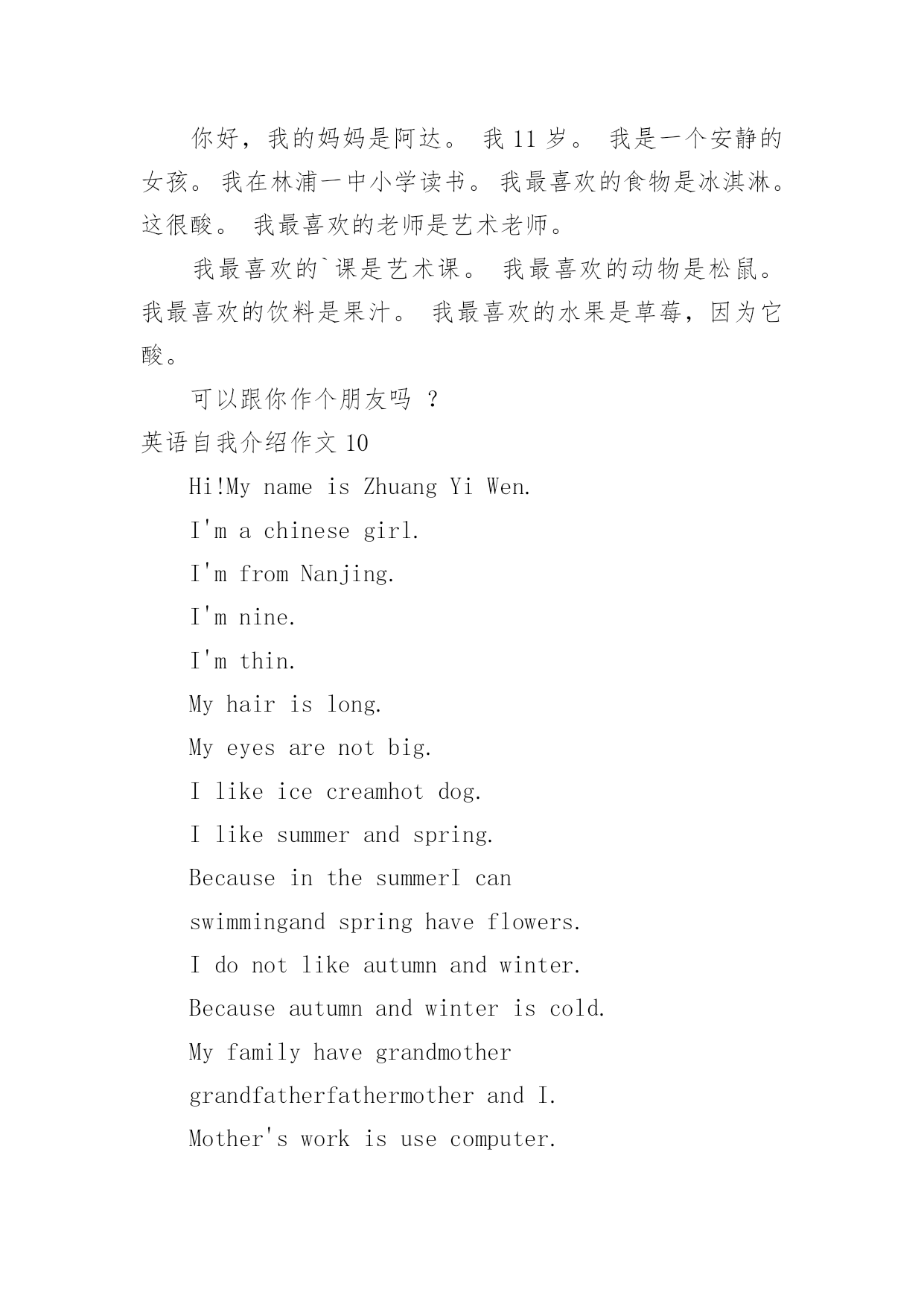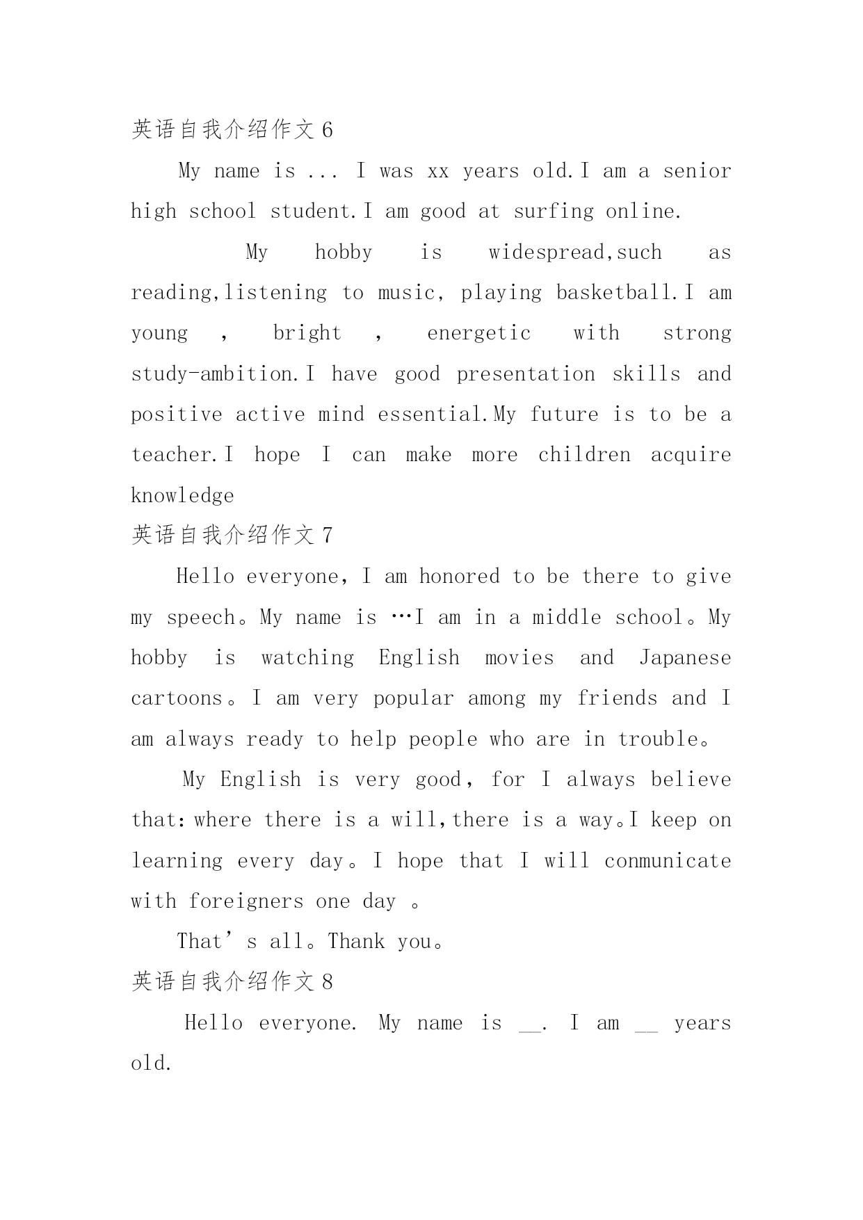 英语自我介绍作文(精)英语自我介绍作文来到一个完全陌生的环境,我们有必要对自己进行适当的介绍,自我介绍可以给陌生人留下一个好的印象。现在你是否对自我介绍一筹莫展呢?以下是小编帮大家整理的英语自我介绍作文,欢迎阅读,希望大家能够喜欢。英语自我介绍作文1IamxxxandIam12yearsold。Myfavoritesportsincludebasketball,swimandfootball。OneofmyfavoritestarsisLiuXiangbecauseheisthefastestrunnerintheworldandaprideofourcountry。Ihavelovefruitslikewatermelon,grapes,banana,andsoforth。WhenIhavetime,IlikewatchingTV,playinggamesonmycomputer,surfingtheweb,andreading。Ihavealotoffriendsandweoftenplayfootballtogether。英语自我介绍作文2Hello,everyone!(大家好!)MynameisDengShengjie.(我的.名字是杜圣洁。)Iam12.(我12岁)Iamaoptimisticgirl.(我是一个开朗的女孩)Mystudyisgood(我成绩优秀),andIamgetalongverywellwithmyclassmates.(并且我同我的同学们相处得很好)Ihavemanyhobbies.(我有许多爱好)Ilikelisteningtomusicandreadingbooks,(我喜欢听音乐和看书)butIlikeEnglishbest.(但是我最喜欢英语)Ihopeeverybodytolikeme.(我希望大家能喜欢我)Thankyou!(谢谢!)英语自我介绍作文3Mynameis...Iwas1xyearsold.Iamaseniorhighschoolstudent.Iamgoodatsurfingonline.Myhobbyiswidespread,suchasreading,listeningtomusic,playingbasketball.Iamyoung,bright,energeticwithstrongstudy-ambition.Ihavegoodpresentationskillsandpositiveactivemindessential.Myfutureistobeateacher.IhopeIcanmakemorechildrenacquireknowledge我的名字是……我1x岁。我是一个初中生。我擅长网上冲浪。我爱好广泛,如阅读,听音乐,打篮球。我是年轻的,明亮的,富有浓厚的学习目标。我有良好的表达能力和灵活的头脑。我的.未来想当一名教师。我希望我能使孩子们获得更多的知识英语自我介绍作文4Hello!Mynameisliziming,I'maboy.IlikeeatapplesbananasandOranges.Ilikeplaycomputergames.I'mtallbutmeisverythin.Ihaveabigeyes,ilikesmile,becausesmilecangivememathandenglishisverynowI'm12yearsold.Ilikereadbooksandmakefriend.Ialsoridemybikegotoschooleveryday.Thisisyoulikeme?Doyouwanttomakefriendswillme?大家好,我的名字叫做李子明,我是个男生。我喜欢吃苹果、香蕉和橘子。我喜欢电脑游戏,我长得很高可是却很瘦,我有着一双明亮的年夜眼睛,我喜欢微笑,因为微笑能让我感到自信。我的`数学和英语学的非常好,今年我12岁了,我很喜欢念书和交朋友,我每天都骑自行车去上学。这就是我,你喜欢我吗?我们可以交个朋友吗?英语自我介绍作文5Hi!Iamahappyandcuteboy.IamfromChina.Iamfourteenyearsold,Iamapupil,IaminClassThree,GreadFour.Ihavemanygoodfriends.Ilikemanypet,thepeacock,panda,rabbitandbird,theyarelovely.Iamtall,Ihaveaaroundface,bigeyes,asmallmouthandasmallnose.Ihaveblackandshorthair.Ilikeeattingapple,banana,chickenandsoon.