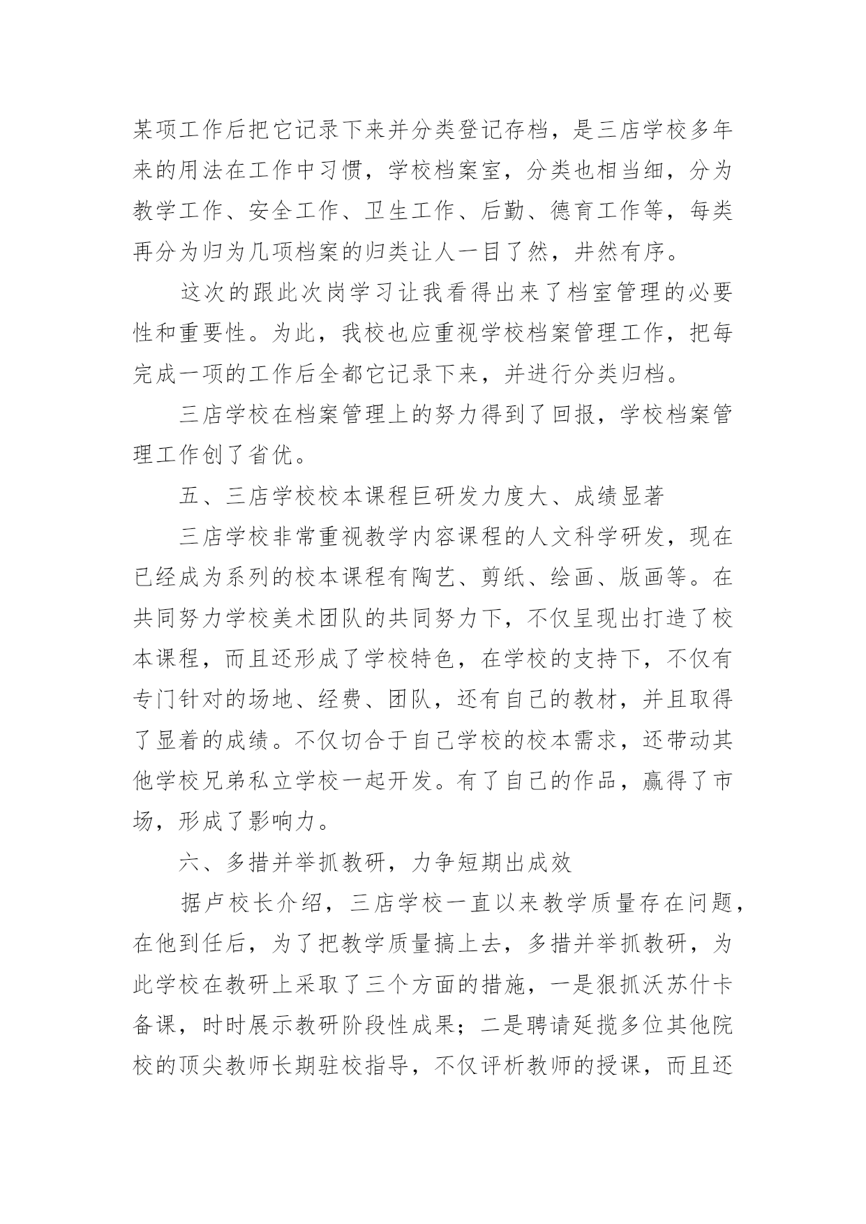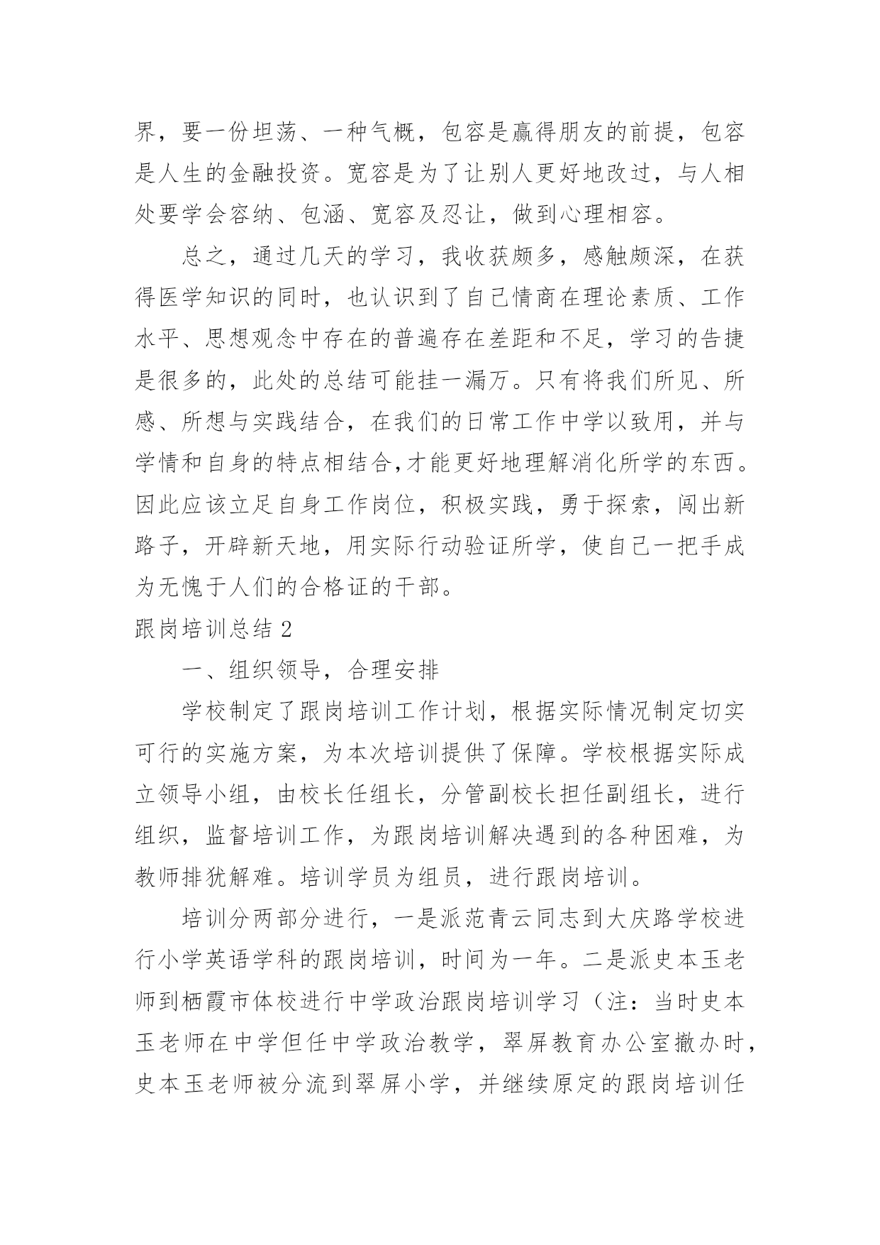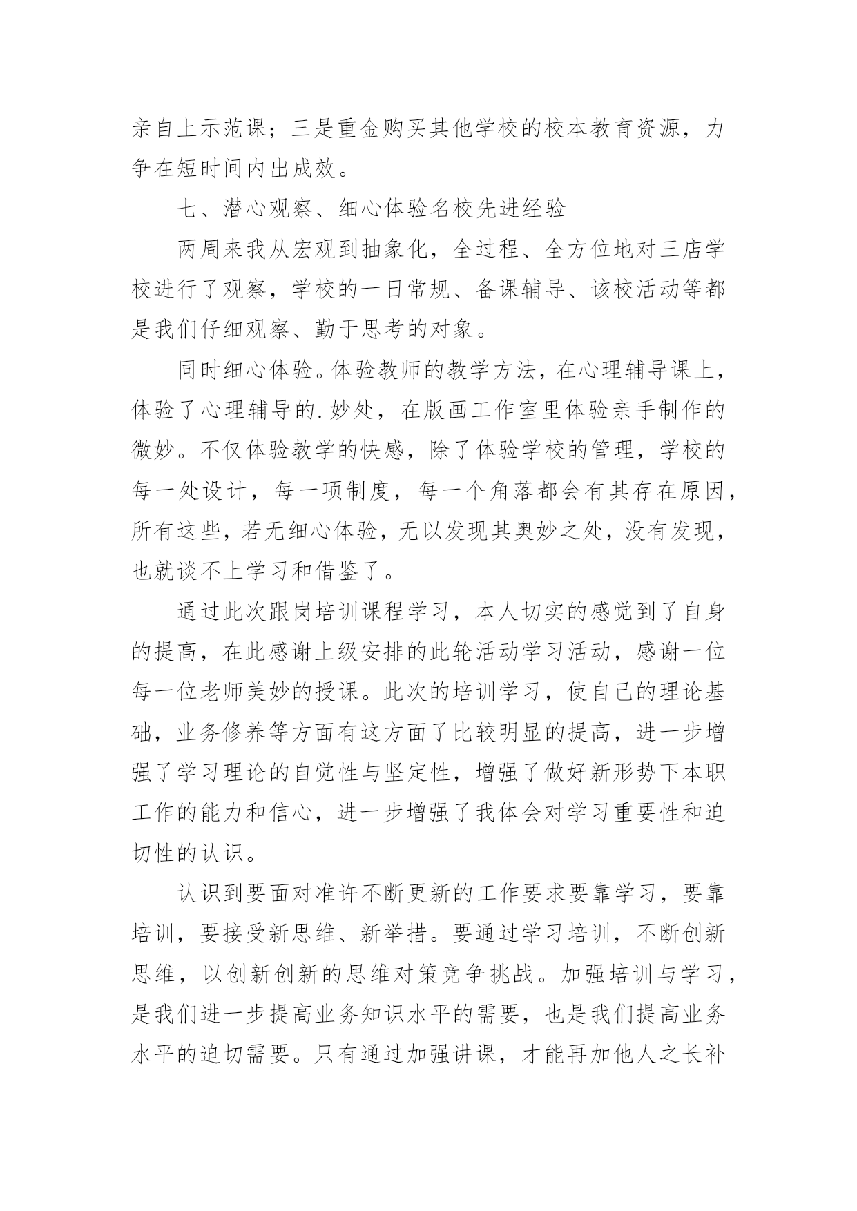 跟岗培训总结(精选)跟岗培训总结总结是在一段时间内对学习和工作生活等表现加以总结和概括的一种书面材料,它可以明确下一步的工作方向,少走弯路,少犯错误,提高工作效益,因此,让我们写一份总结吧。那么总结应该包括什么内容呢?以下是小编整理的跟岗培训总结,欢迎阅读与收藏。跟岗培训总结120xx年10月21日至11月2日,跟岗培训让我有机会走近名校、接触名校,学习了先进的管理方法和项目管理管理理念,让我受益匪浅。三店公立学校学校校本课程的研发有特色、有成效,校容校貌美化整洁,档案的管理规范,学校的办学鲜明特色,可见卢厚鹏校长在学校的管理上的确是花了很多心思,才能取得今天可喜的成就,令各地前来学习的班主任赞叹不已。下面就谈谈自己通过学习后的几点体会一、三店学校校园文化建设有特色有杀手锏校园文化重要的是从教师和学生身上散发出的与众不同的精神面貌,是渗透在这个骨子里的这种品质。它是通过校长不断引领,老师们不断领会,通过外在熏陶,内在培养,最终表现在全体教职员工身上全体的气质,最后形成学校独有美德的一种精神气息。三店学校的校园环境优美,整体分为两大块,一边是教学区域,一边是运动区域,学校在校园文化建设方面却非常有特色。使学校为了使学校的文化氛围和谐统一,专门请团队打造了符合学校自身的校园文化。学校的走廊四周布满了各具特色的宣传栏,里面的内容包罗万象。涉及到了办学理念、教学团队、取得的成绩、师生精彩瞬间、学生的日常行为规范等专版专栏。学校的绿化也很美观,校园周围的一些花草树木,虽然不是花木,却被公立学校修剪得有条有理,树木的周围都用木质板材做成了景观,既美丽又实用,可以用来让孩子们做休息时的板凳坐。整个学校显得欣欣向荣,生气盎然与和谐,人与多自然结为一体,学生的身心健康受到了熏陶。毕业班的全校文化建设也是多种多样,不同班级有不同的指示、布置和目标,每个班级墙上都有那块文化墙,用纤维板做成,便于随时更换。文化墙上有根据学校管理工作工作安排的主题内容,也有根据自身班级特点布置的文化内容,让学生的个性得到了宣扬。可见学校在这方面是下能了很大的功夫。二、三店学校管理规范严格,建立科学技术了科学完善的制度深入学校的日子里,你会感受到,从行政事务,到教育教学;从教师考勤,到教学常规从班级评比,到学生日常进行规范方方面面,都有制度,都有规矩,学校都已经形成了自己的思路。三店学校在制定绩效实施方室的每环节一个环节,都充分发扬民主。草案出来后,学校分层次征求意见,按中层、年级、教研组、个人等层面,让大家不仅提意见,还要提建议。不仅指出不合理,还要设计更合理。不仅从自身角度想着问题,更要从大局的高度提建议,使工资考核实施方案的产生过程成为统一思想、提高认识、激发活力、凝聚人心的过程。三、三店学校将对学生的素质教育方面的实施落实在日常生活中作为教育工作者,我们都弄清楚要把学生培养成为四有新人,这是教育工作的终极目标。在三店学校却看到了令我欣慰高兴的学生行为习惯。三店学校学校虽然是九年一贯制学校,学生人数多,但是学校开设的课程齐全,学生的书写当更具有特色,每个学生速记工整,字迹漂亮,作业本保持得相当整洁,学校多次获得书法比赛名次,学生也喜欢画画,在走廊,课堂到处挂了学生的作品,高中学生的兴趣得到了发扬,促进了学习成绩的大大提高,学生的较为文明礼貌的教育也相当到位,见到来校学习参观的老师会主动打招呼可好、敬礼。学校清洁请了专门的清洁团队,10多人辛勤劳动换来了整洁的校园,这给学员留下了好的印象,乱丢乱扔现象的现象几乎很少亲见。四、三店学校对学校档案的管理做到了精细化、规范化档案科研工作是学校完成各项工作的依据,预览完成了某项工作后把它记录下来并分类登记存档,是三店学校多年来的用法在工作中习惯,学校档案室,分类也相当细,分为教学工作、安全工作、卫生工作、后勤、德育工作等,每类再分为归为几项档案的归类让人一目了然,井然有序。这次的跟此次岗学习让我看得出来了档室管理的必要性和重要性。为此,我校也应重视学校档案管理工作,把每完成一项的工作后全都它记录下来,并进行分类归档。三店学校在档案管理上的努力得到了回报,学校档案管理工作创了省优。五、三店学校校本课程巨研发力度大、成绩显著三店学校非常重视教学内容课程的人文科学研发,现在已经成为系列的校本课程有陶艺、剪纸、绘画、版画等。在共同努力学校美术团队的共同努力下,不仅呈现出打造了校本课程,而且还形成了学校特色,在学校的支持下,不仅有专门针对的场地、经费、团队,还有自己的教材,并且取得了显着的成绩。不仅切合于自己学校的校本需求,还带动其他学校兄弟私立学校一起开发。有了自己的作品,赢得了市场,形成了影响力。六、多措并举抓教研,力争短期出成效据卢校长介绍,三店学校一直以来教学质量存在问题,在他到任后,为了把教学质量搞上去,多措并举抓教研,