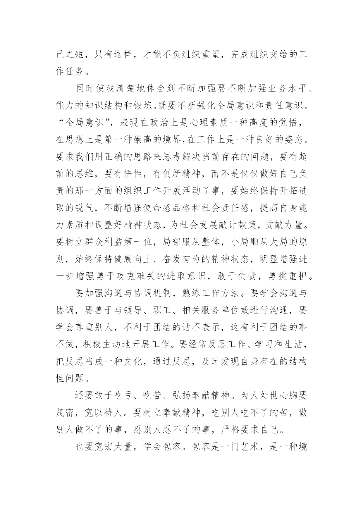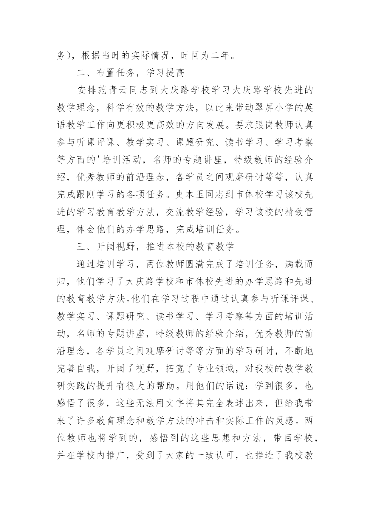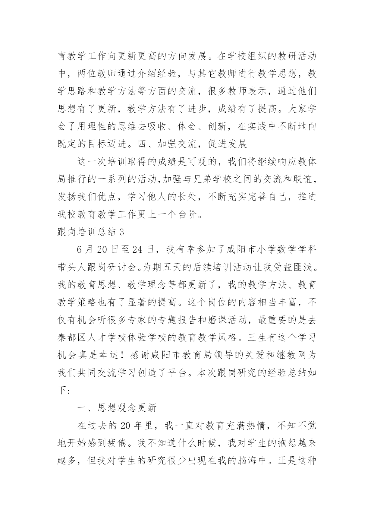 跟岗培训总结(精选)跟岗培训总结总结是在一段时间内对学习和工作生活等表现加以总结和概括的一种书面材料,它可以明确下一步的工作方向,少走弯路,少犯错误,提高工作效益,因此,让我们写一份总结吧。那么总结应该包括什么内容呢?以下是小编整理的跟岗培训总结,欢迎阅读与收藏。跟岗培训总结120xx年10月21日至11月2日,跟岗培训让我有机会走近名校、接触名校,学习了先进的管理方法和项目管理管理理念,让我受益匪浅。三店公立学校学校校本课程的研发有特色、有成效,校容校貌美化整洁,档案的管理规范,学校的办学鲜明特色,可见卢厚鹏校长在学校的管理上的确是花了很多心思,才能取得今天可喜的成就,令各地前来学习的班主任赞叹不已。下面就谈谈自己通过学习后的几点体会一、三店学校校园文化建设有特色有杀手锏校园文化重要的是从教师和学生身上散发出的与众不同的精神面貌,是渗透在这个骨子里的这种品质。它是通过校长不断引领,老师们不断领会,通过外在熏陶,内在培养,最终表现在全体教职员工身上全体的气质,最后形成学校独有美德的一种精神气息。三店学校的校园环境优美,整体分为两大块,一边是教学区域,一边是运动区域,学校在校园文化建设方面却非常有特色。使学校为了使学校的文化氛围和谐统一,专门请团队打造了符合学校自身的校园文化。学校的走廊四周布满了各具特色的宣传栏,里面的内容包罗万象。涉及到了办学理念、教学团队、取得的成绩、师生精彩瞬间、学生的日常行为规范等专版专栏。学校的绿化也很美观,校园周围的一些花草树木,虽然不是花木,却被公立学校修剪得有条有理,树木的周围都用木质板材做成了景观,既美丽又实用,可以用来让孩子们做休息时的板凳坐。整个学校显得欣欣向荣,生气盎然与和谐,人与多自然结为一体,学生的身心健康受到了熏陶。毕业班的全校文化建设也是多种多样,不同班级有不同的指示、布置和目标,每个班级墙上都有那块文化墙,用纤维板做成,便于随时更换。文化墙上有根据学校管理工作工作安排的主题内容,也有根据自身班级特点布置的文化内容,让学生的个性得到了宣扬。可见学校在这方面是下能了很大的功夫。二、三店学校管理规范严格,建立科学技术了科学完善的制度深入学校的日子里,你会感受到,从行政事务,到教育教学;从教师考勤,到教学常规从班级评比,到学生日常进行规范方方面面,都有制度,都有规矩,学校都已经形成了自己的思路。三店学校在制定绩效实施方室的每环节一个环节,都充分发扬民主。草案出来后,学校分层次征求意见,按中层、年级、教研组、个人等层面,让大家不仅提意见,还要提建议。不仅指出不合理,还要设计更合理。不仅从自身角度想着问题,更要从大局的高度提建议,使工资考核实施方案的产生过程成为统一思想、提高认识、激发活力、凝聚人心的过程。三、三店学校将对学生的素质教育方面的实施落实在日常生活中作为教育工作者,我们都弄清楚要把学生培养成为四有新人,这是教育工作的终极目标。在三店学校却看到了令我欣慰高兴的学生行为习惯。三店学校学校虽然是九年一贯制学校,学生人数多,但是学校开设的课程齐全,学生的书写当更具有特色,每个学生速记工整,字迹漂亮,作业本保持得相当整洁,学校多次获得书法比赛名次,学生也喜欢画画,在走廊,课堂到处挂了学生的作品,高中学生的兴趣得到了发扬,促进了学习成绩的大大提高,学生的较为文明礼貌的教育也相当到位,见到来校学习参观的老师会主动打招呼可好、敬礼。学校清洁请了专门的清洁团队,10多人辛勤劳动换来了整洁的校园,这给学员留下了好的印象,乱丢乱扔现象的现象几乎很少亲见。四、三店学校对学校档案的管理做到了精细化、规范化档案科研工作是学校完成各项工作的依据,预览完成了某项工作后把它记录下来并分类登记存档,是三店学校多年来的用法在工作中习惯,学校档案室,分类也相当细,分为教学工作、安全工作、卫生工作、后勤、德育工作等,每类再分为归为几项档案的归类让人一目了然,井然有序。这次的跟此次岗学习让我看得出来了档室管理的必要性和重要性。为此,我校也应重视学校档案管理工作,把每完成一项的工作后全都它记录下来,并进行分类归档。三店学校在档案管理上的努力得到了回报,学校档案管理工作创了省优。五、三店学校校本课程巨研发力度大、成绩显著三店学校非常重视教学内容课程的人文科学研发,现在已经成为系列的校本课程有陶艺、剪纸、绘画、版画等。在共同努力学校美术团队的共同努力下,不仅呈现出打造了校本课程,而且还形成了学校特色,在学校的支持下,不仅有专门针对的场地、经费、团队,还有自己的教材,并且取得了显着的成绩。不仅切合于自己学校的校本需求,还带动其他学校兄弟私立学校一起开发。有了自己的作品,赢得了市场,形成了影响力。六、多措并举抓教研,力争短期出成效据卢校长介绍,三店学校一直以来教学质量存在问题,在他到任后,为了把教学质量搞上去,多措并举抓教研,