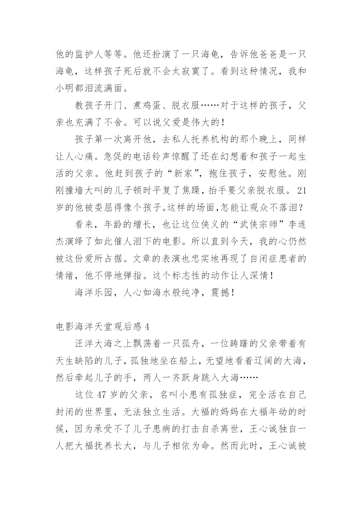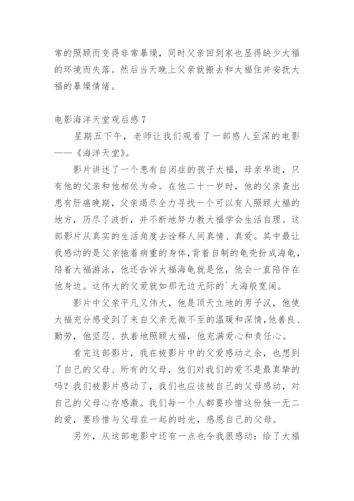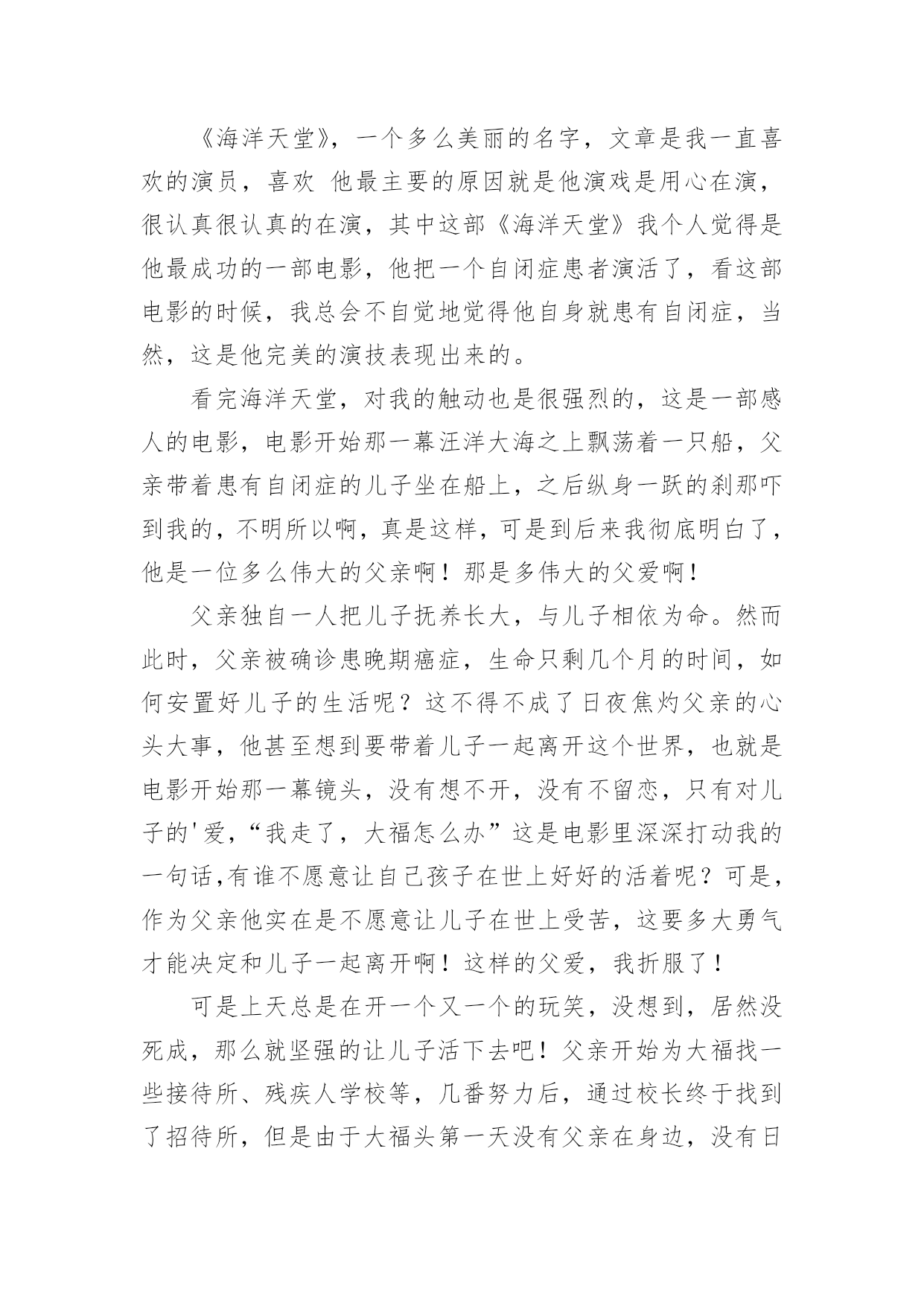 电影海洋天堂观后感看完一部影视作品以后,相信大家的视野一定开拓了不少吧,透过观影,我们可以发现一些深刻的感悟。那么观后感到底应该怎么写呢?下面是小编为大家整理的电影海洋天堂观后感,欢迎大家分享。电影海洋天堂观后感1“一位父亲在自我心脏被刺穿的情景下,竟坚持了三天!而他所做的一切都只为把女儿安全送到妻子身边。”这就是爱,最最深沉的爱,无私的爱。每当我听到一个个关于父亲和母爱的故事时,就会想起与这些伟大传奇的父母不堪相符的一位平凡的父亲。他是电影《海洋天堂》里的.一位父亲。影片讲述了一位身患绝症的父亲在离世前历尽波折安置好儿子的故事。故事很短,很简单,像一瓶矿泉水,仅有细细品味才能感觉到甜。真正的人生不就是如此吗?平凡平淡。影片里感人的镜头一只一向在我前面出现,舅舅回映:身体不好的父亲,不顾别人的劝告,背着自制的海龟壳扮成海龟,为的就是让儿子日后不要孤独,告诉儿子,爸爸就是一只大海龟,爸爸永远陪着你,永远,永远┄┄再看父亲离世后,儿子学会了生活,在他最喜欢的海洋馆里,陪着海龟游泳,依在海龟身上,仿佛这只大海龟就是父亲┄┄看到这,我已泪流满面,这种爱,无私的爱,最平凡的爱,可也是最最深沉的爱!电影最终的“此片献给所有平凡而伟大的父母”让我不禁想起了我父母那平凡可爱的身影:我生病时妈妈冒着大雨送我去医院,雨披全裹在了我的身上,雨水一滴滴流进了妈妈的衣服里,她却毫无感觉,奋力奔向医院;我害怕时,爸爸用温暖的手抚摸我┄┄这是父母给我最最深沉的爱,这份爱是独一无二的,我必须要好好珍惜。电影海洋天堂观后感2喜欢《海洋天堂》沉静而内敛的讲述方式,透着一股子沉淀后的清新,这种风格从开始一向持续到了影片结束——用来表现自闭症这一沉重的社会话题是再适宜但是的了。没有安插刻意的煽情,一些我原以为会大肆渲染以赚人眼泪的桥段被几个镜头轻轻悄悄地带过去了;没有借机违心地讨好制度,毕竟以我国眼下的人口数和自闭症的高发病率若仅凭体制就能把一切安排得妥妥帖帖的显然是脱离实际;没有掐灭所有的期望,片中出现的几乎都是好人,没什么人为的落井下石,总算不至于给主角原本已十分窘迫的生活雪上加霜,而最后几分钟留给了观者的更是暗夜下的火光,蕴出微弱却不容忽视的光芒。闭上眼,我的眼前闪过的依然是点点滴滴的平凡小事——教孩子穿衣服、开门、煮鸡蛋、认钱币面额——再简单、家常但是,这般单纯,却这般揪心。许多琐碎的生活细节恰恰拼出了一个特殊家庭的真实生活:尽管父亲很耐心、很努力,尽管孩子很无辜、很纯真,但现实,一如它的本来面目,有着诸多的不尽人意。于是我们看到的更多的.是无处可诉的辛酸孤独,是四处求援的茫然无助,是一份平凡却又极其伟大的爱——如此坚韧如此包容。正是这份真挚与诚恳,让本片拥有了令人动容的情感力量。在我们身边,父亲的爱都是默默的,不像妈妈那样全部能够从脸上看到,但是爸爸呢,在他的脸上我看不到,只能用心去感受,长这么大,还是没对爸爸说过一句关心的话,我也说不出口,也许有些关心与祝福不需要用言语来表达,只要彼此能够感受到,爸爸就应能感受到的吧!电影海洋天堂观后感3昨天下午,我和小明一起看了《海洋天堂》。擅长动作功夫片的李连杰与出道生活情感片的文文(马伊琍老公)演绎父子情。在水族馆当电工的父亲,在得知儿子大福身患癌症不久后离世,竭尽全力为患有自闭症的儿子大福寻找一个安全的家。从本章开始,父亲准备带着孩子一起沉入蔚蓝的大海,擅长游泳的儿子却解开了拴在铁疙瘩上的绳子。那种无奈,让人心痛!像天使一样纯洁的'大福,喜欢在水族馆的水里游泳,和海豚、海龟那么近……真希望他永远这样。但真相是残酷的。母亲的早逝让父亲既为人又为人母。为了训练孩子上下车,他每天晚上都孜孜不倦地重复站名。儿子的每件衣服上都缝着一个布头,上面密密麻麻写着孩子的名字、自闭症、他的监护人等等。他还扮演了一只海龟,告诉他爸爸是一只海龟,这样孩子死后就不会太寂寞了。看到这种情况,我和小明都泪流满面。教孩子开门、煮鸡蛋、脱衣服……对于这样的孩子,父亲也充满了不舍。可以说父爱是伟大的!孩子第一次离开他,去私人托养机构的那个晚上,同样让人心痛。急促的电话铃声惊醒了还在幻想着和孩子一起生活的父亲。他赶到孩子的“新家”,抱住孩子,安慰他。刚刚撞墙大叫的儿子顿时平复了焦躁,抬手要父亲脱衣服。21岁的他被委屈得像个孩子。这样的场面,怎能让观众不落泪?看来,年龄的增长,也让这位侠义的“武侠宗师”李连杰演绎了如此催人泪下的电影。所以直到今天,我的心仍然被这份爱所占据。文章的表演也忠实地再现了自闭症患者的情绪,他不停地弹指。这个标志性的动作让人深情!海洋乐园,人心如海水般纯净,震撼!电影海洋天堂观后感4汪洋大海之上飘荡着一只孤舟,一位踌躇的父亲带着有天生缺陷的儿子,孤独地坐在船上,无望地看着辽阔的大海,然后牵起儿子的手,两人一齐跃身跳入大海……