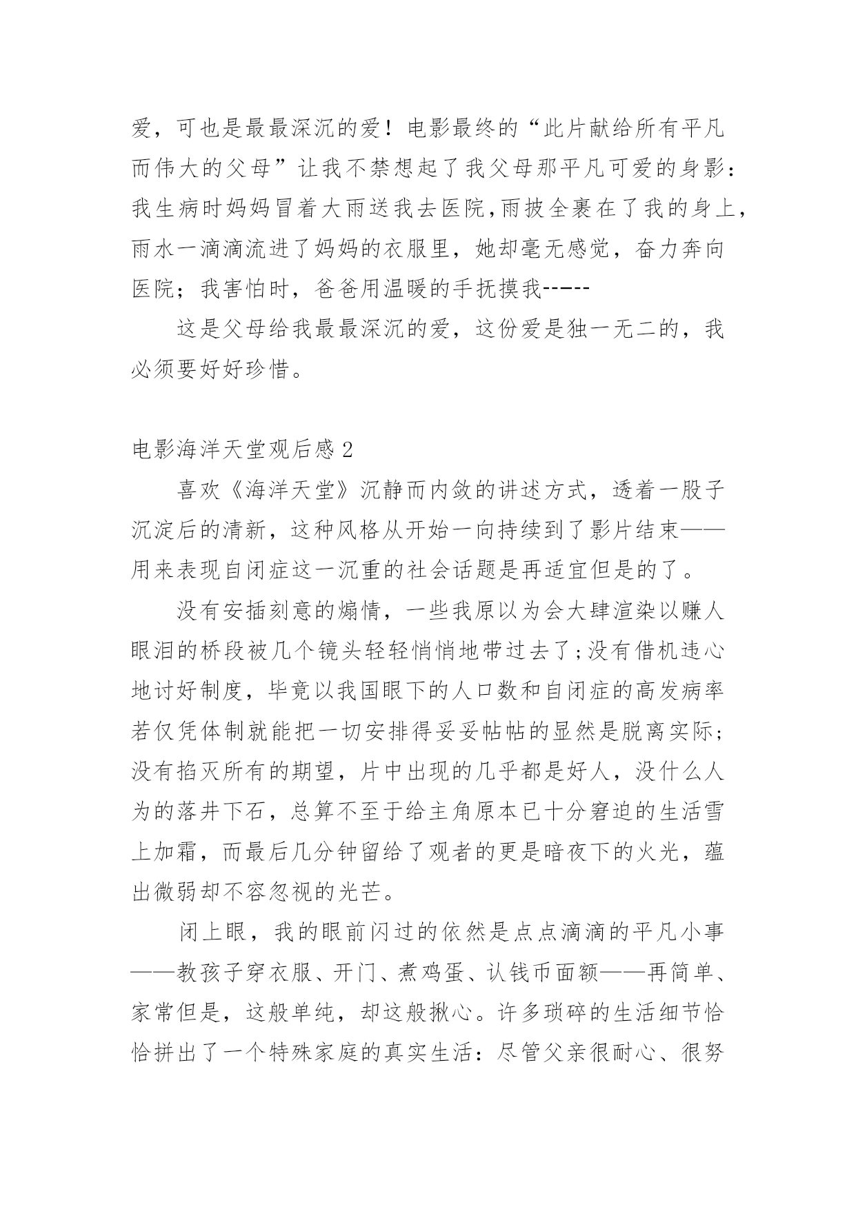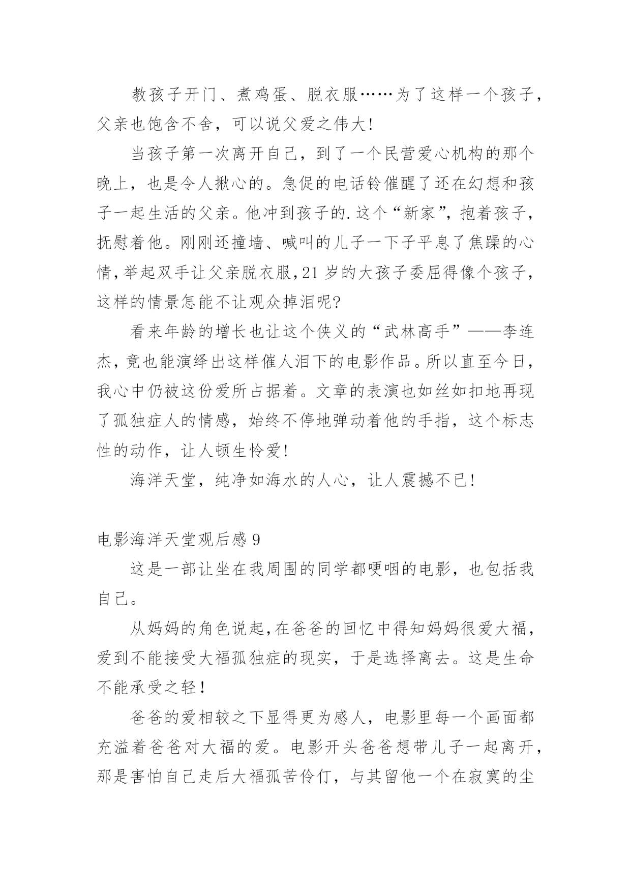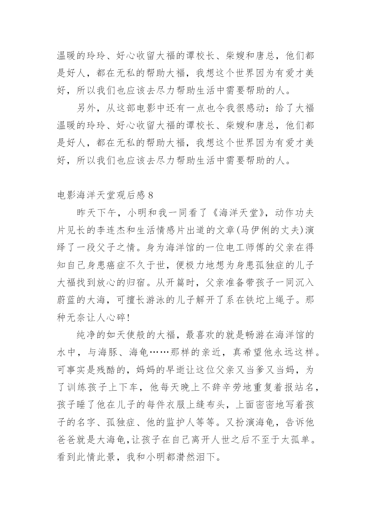 电影海洋天堂观后感看完一部影视作品以后,相信大家的视野一定开拓了不少吧,透过观影,我们可以发现一些深刻的感悟。那么观后感到底应该怎么写呢?下面是小编为大家整理的电影海洋天堂观后感,欢迎大家分享。电影海洋天堂观后感1“一位父亲在自我心脏被刺穿的情景下,竟坚持了三天!而他所做的一切都只为把女儿安全送到妻子身边。”这就是爱,最最深沉的爱,无私的爱。每当我听到一个个关于父亲和母爱的故事时,就会想起与这些伟大传奇的父母不堪相符的一位平凡的父亲。他是电影《海洋天堂》里的.一位父亲。影片讲述了一位身患绝症的父亲在离世前历尽波折安置好儿子的故事。故事很短,很简单,像一瓶矿泉水,仅有细细品味才能感觉到甜。真正的人生不就是如此吗?平凡平淡。影片里感人的镜头一只一向在我前面出现,舅舅回映:身体不好的父亲,不顾别人的劝告,背着自制的海龟壳扮成海龟,为的就是让儿子日后不要孤独,告诉儿子,爸爸就是一只大海龟,爸爸永远陪着你,永远,永远┄┄再看父亲离世后,儿子学会了生活,在他最喜欢的海洋馆里,陪着海龟游泳,依在海龟身上,仿佛这只大海龟就是父亲┄┄看到这,我已泪流满面,这种爱,无私的爱,最平凡的爱,可也是最最深沉的爱!电影最终的“此片献给所有平凡而伟大的父母”让我不禁想起了我父母那平凡可爱的身影:我生病时妈妈冒着大雨送我去医院,雨披全裹在了我的身上,雨水一滴滴流进了妈妈的衣服里,她却毫无感觉,奋力奔向医院;我害怕时,爸爸用温暖的手抚摸我┄┄这是父母给我最最深沉的爱,这份爱是独一无二的,我必须要好好珍惜。电影海洋天堂观后感2喜欢《海洋天堂》沉静而内敛的讲述方式,透着一股子沉淀后的清新,这种风格从开始一向持续到了影片结束——用来表现自闭症这一沉重的社会话题是再适宜但是的了。没有安插刻意的煽情,一些我原以为会大肆渲染以赚人眼泪的桥段被几个镜头轻轻悄悄地带过去了;没有借机违心地讨好制度,毕竟以我国眼下的人口数和自闭症的高发病率若仅凭体制就能把一切安排得妥妥帖帖的显然是脱离实际;没有掐灭所有的期望,片中出现的几乎都是好人,没什么人为的落井下石,总算不至于给主角原本已十分窘迫的生活雪上加霜,而最后几分钟留给了观者的更是暗夜下的火光,蕴出微弱却不容忽视的光芒。闭上眼,我的眼前闪过的依然是点点滴滴的平凡小事——教孩子穿衣服、开门、煮鸡蛋、认钱币面额——再简单、家常但是,这般单纯,却这般揪心。许多琐碎的生活细节恰恰拼出了一个特殊家庭的真实生活:尽管父亲很耐心、很努力,尽管孩子很无辜、很纯真,但现实,一如它的本来面目,有着诸多的不尽人意。于是我们看到的更多的.是无处可诉的辛酸孤独,是四处求援的茫然无助,是一份平凡却又极其伟大的爱——如此坚韧如此包容。正是这份真挚与诚恳,让本片拥有了令人动容的情感力量。在我们身边,父亲的爱都是默默的,不像妈妈那样全部能够从脸上看到,但是爸爸呢,在他的脸上我看不到,只能用心去感受,长这么大,还是没对爸爸说过一句关心的话,我也说不出口,也许有些关心与祝福不需要用言语来表达,只要彼此能够感受到,爸爸就应能感受到的吧!电影海洋天堂观后感3昨天下午,我和小明一起看了《海洋天堂》。擅长动作功夫片的李连杰与出道生活情感片的文文(马伊琍老公)演绎父子情。在水族馆当电工的父亲,在得知儿子大福身患癌症不久后离世,竭尽全力为患有自闭症的儿子大福寻找一个安全的家。从本章开始,父亲准备带着孩子一起沉入蔚蓝的大海,擅长游泳的儿子却解开了拴在铁疙瘩上的绳子。那种无奈,让人心痛!像天使一样纯洁的'大福,喜欢在水族馆的水里游泳,和海豚、海龟那么近……真希望他永远这样。但真相是残酷的。母亲的早逝让父亲既为人又为人母。为了训练孩子上下车,他每天晚上都孜孜不倦地重复站名。儿子的每件衣服上都缝着一个布头,上面密密麻麻写着孩子的名字、自闭症、他的监护人等等。他还扮演了一只海龟,告诉他爸爸是一只海龟,这样孩子死后就不会太寂寞了。看到这种情况,我和小明都泪流满面。教孩子开门、煮鸡蛋、脱衣服……对于这样的孩子,父亲也充满了不舍。可以说父爱是伟大的!孩子第一次离开他,去私人托养机构的那个晚上,同样让人心痛。急促的电话铃声惊醒了还在幻想着和孩子一起生活的父亲。他赶到孩子的“新家”,抱住孩子,安慰他。刚刚撞墙大叫的儿子顿时平复了焦躁,抬手要父亲脱衣服。21岁的他被委屈得像个孩子。这样的场面,怎能让观众不落泪?看来,年龄的增长,也让这位侠义的“武侠宗师”李连杰演绎了如此催人泪下的电影。所以直到今天,我的心仍然被这份爱所占据。文章的表演也忠实地再现了自闭症患者的情绪,他不停地弹指。这个标志性的动作让人深情!海洋乐园,人心如海水般纯净,震撼!电影海洋天堂观后感4汪洋大海之上飘荡着一只孤舟,一位踌躇的父亲带着有天生缺陷的儿子,孤独地坐在船上,无望地看着辽阔的大海,然后牵起儿子的手,两人一齐跃身跳入大海……