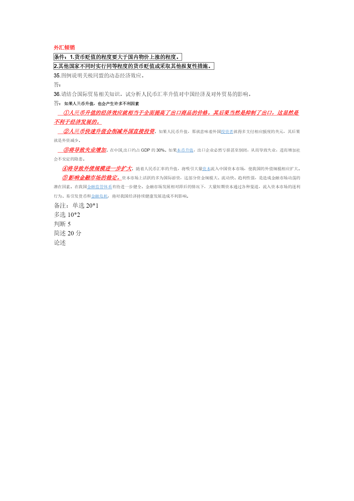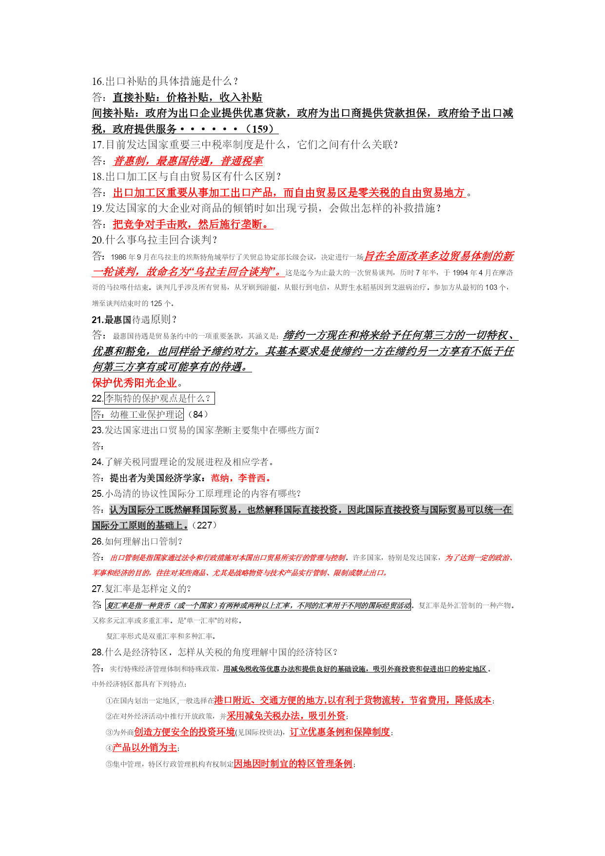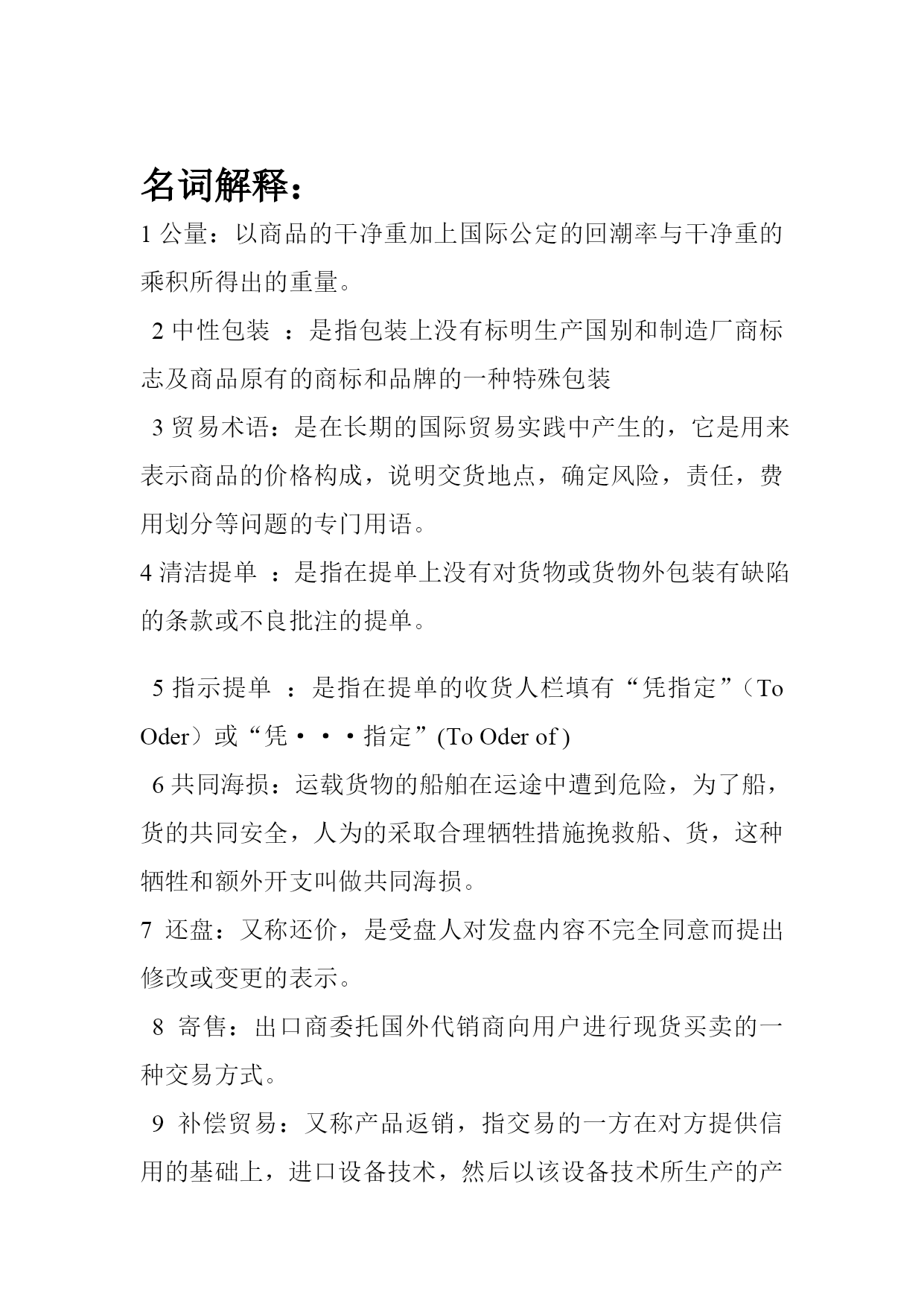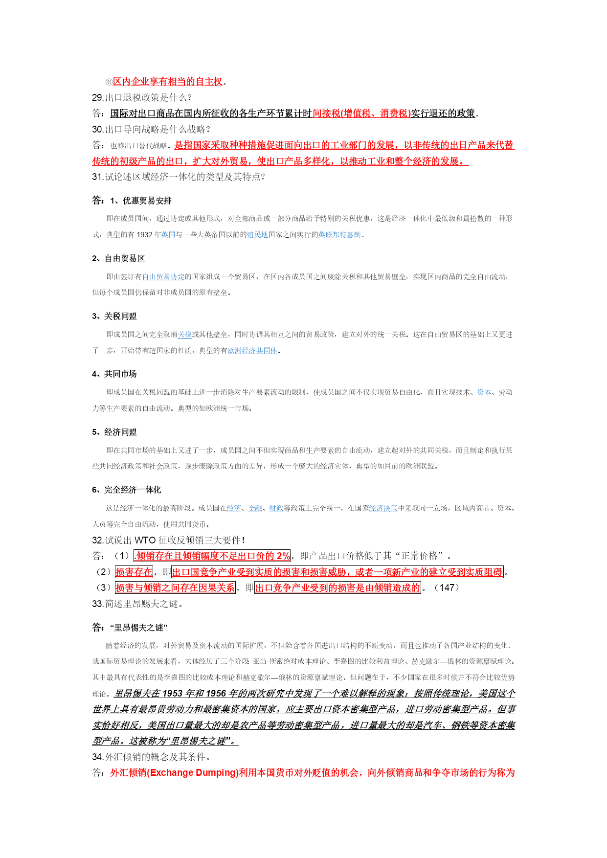 国贸复习资料关于国际分工的了解答:亚当斯密绝对优势(成本)理论:A.交换是人类天然的倾向,B.交换产生分工,C.分工的原则是各自集中生产具有优势的产品,D.国际分工的基础是有利的自然禀赋或后天的有利生产条件。(22)了解WTO的相应结构答:部长会议——总理事会——各专门委员会——秘书处与总干事(242)了解重商的发展答:15世纪末16世纪初,西欧封建制度瓦解,代表新兴力量的民族国家产生,于此相应的新经济力量——重商资本正在兴起。商业资本不再是生存在自然经济夹缝中,而是不断冲击并压倒自然经济。(81)4.“靠山吃山,靠水吃水”描述的是什么样的学说?答:赫克歇尔——俄林5.理解《TBT贸易壁垒协议》的目的。答:限制进口,保护国内产业。6.超保护的贸易政策是什么?其依据是什么?限制进口,保护国内产业。凯恩斯贸易保护理论。7.国际贸易计算方式是什么?例子:国际出口总额为6.3,进口总额是6.1.问国际贸易总额是多少,答案为6.1.8.何种理论可以对发展中国家经济一体化做出阐释?答:关税同盟理论,大市场理论,协议性国际分工理论,综合发展战略理论。9.买方信贷是什么?答:买方HYPERLINK"http://baike.baidu.com/view/168886.htm"\t"_blank"信贷是指由出口商国家的HYPERLINK"http://baike.baidu.com/view/20233.htm"\t"_blank"银行向进口商或进口商国家的银行提供的信贷,用以支付进口货款的一种HYPERLINK"http://baike.baidu.com/view/62273.htm"\t"_blank"贷款形式。其中,由出口方银行直接贷给进口商的,出口方银行通常要求进口方银行提供担保;如由出口方银行贷款给进口方银行,再由进口方银行贷给进口商或使用单位的,则进口方银行要负责向出口方银行清偿贷款。10.什么是有效关税保护率?答:有效关税保护率=进口商品的名义关税/进口商品在进口国的增值率(E=T/V)进口原材料自行加工E=(T-Pt)/(1-P)P为原材料价格在最终商品的比重,t为关税进口商品,关税越高保护效率越好进口原材料,关税越低保护效率越好。11.什么是普惠制?答:发达国家向发展中国家出口制成品、半制成品给予普通的、非歧视的、非互惠的关税制度。12.就美国对中国轮胎反倾销案,中国提高进口美国汽车的关税,这是什么理论?答:技术性贸易壁垒13.生命周期理论答:开发、引进、成长、成熟、衰退的阶段(研发期是资本密集型)14.非关税壁垒的表现形式有哪些?答:反倾销壁垒,反补贴壁垒,保障措施壁垒,技术性贸易壁垒,绿色壁垒,社会壁垒。15.涉及到缔约国之间的经济和贸易各方面问题的条约和协议是什么?答:《关贸总协定》关税与贸易总协定的简称16.出口补贴的具体措施是什么?答:直接补贴:价格补贴,收入补贴间接补贴:政府为出口企业提供优惠贷款,政府为出口商提供贷款担保,政府给予出口减税,政府提供服务······(159)17.目前发达国家重要三中税率制度是什么,它们之间有什么关联?答:普惠制,最惠国待遇,普通税率18.出口加工区与自由贸易区有什么区别?答:出口加工区重要从事加工出口产品,而自由贸易区是零关税的自由贸易地方。19.发达国家的大企业对商品的倾销时如出现亏损,会做出怎样的补救措施?答:把竞争对手击败,然后施行垄断。20.什么事乌拉圭回合谈判?答:1986年9月在乌拉圭的埃斯特角城举行了关贸总协定部长级会议,决定进行一场旨在全面改革多边贸易体制的新一轮谈判,故命名为“乌拉圭回合谈判”。这是迄今为止最大的一次贸易谈判,历时7年半,于1994年4月在摩洛哥的马拉喀什结束。谈判几乎涉及所有贸易,从牙刷到游艇,从银行到电信,从野生水稻基因到艾滋病治疗。参加方从最初的103个,增至谈判结束时的125个。21.最惠国待遇原则?答:最惠国待遇是贸易条约中的一项重要条款,其涵义是:缔约一方现在和将来给予任何第三方的一切特权、优惠和豁免,也同样给予缔约对方。其基本要求是使缔约一方在缔约另一方享有不低于任何第三方享有或可能享有的待遇。保护优秀阳光企业。22.李斯特的保护观点是什么?答:幼稚工业保护理论(84)23.发达国家进出口贸易的国家垄断主要集中在哪些方面?答:24.了解关税同盟理论的发展进程及相应学者。答:提出者为美国经济学家:范纳,李普西。25.小岛清的协议性国际分工原理理论的内容有哪些?答:认为国际分工既然解释国际贸易,也然解释国际直接投资,因此国际直接投资与国际贸易可以统一在国际分工原则的基础上。(227)26.如