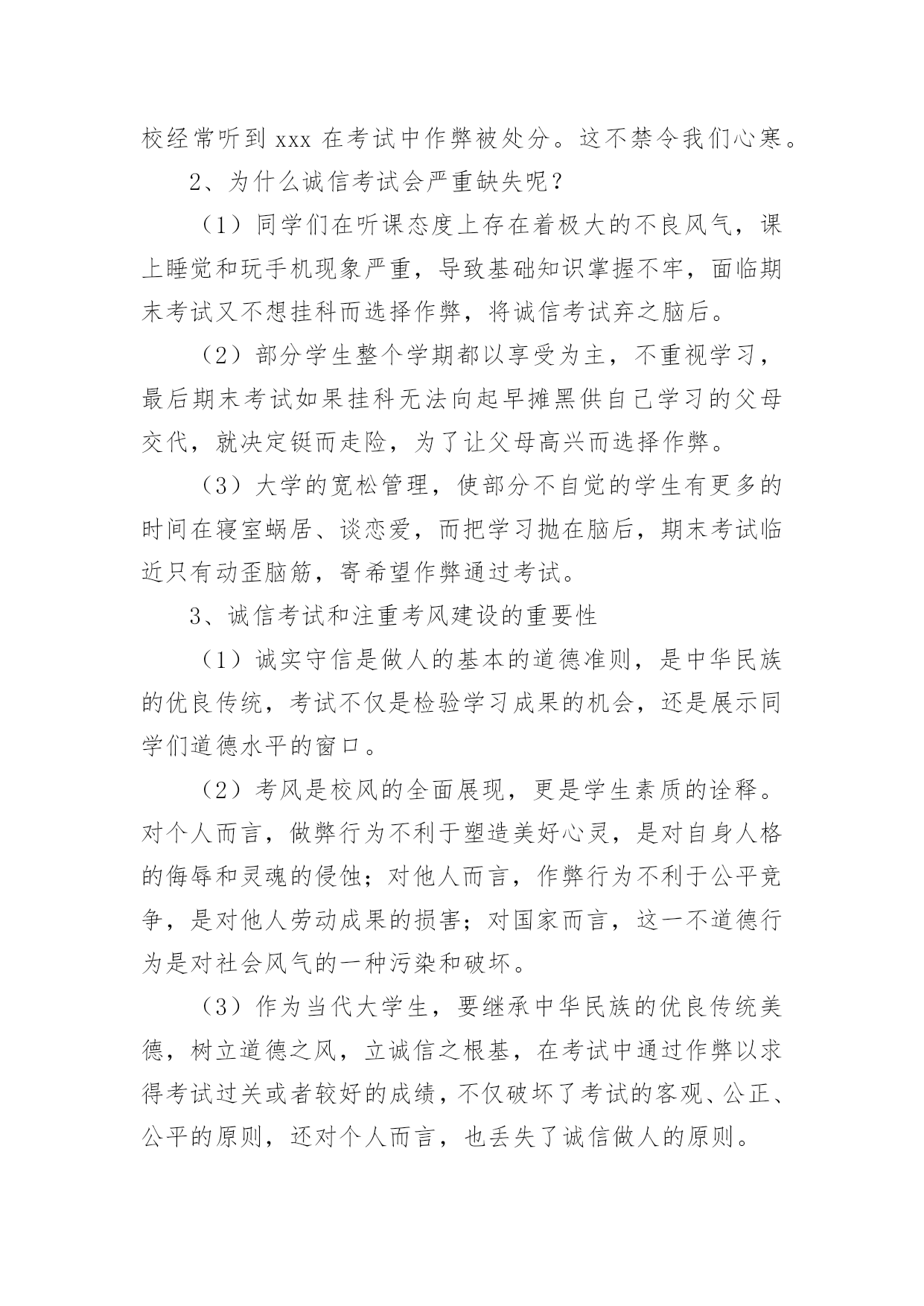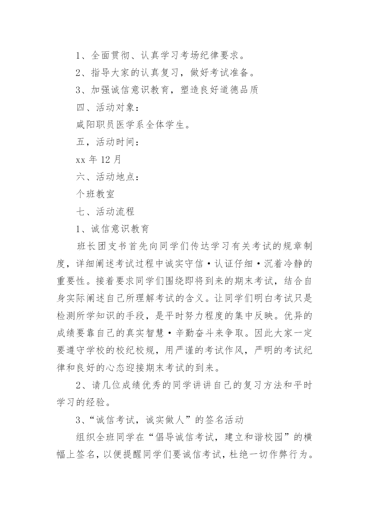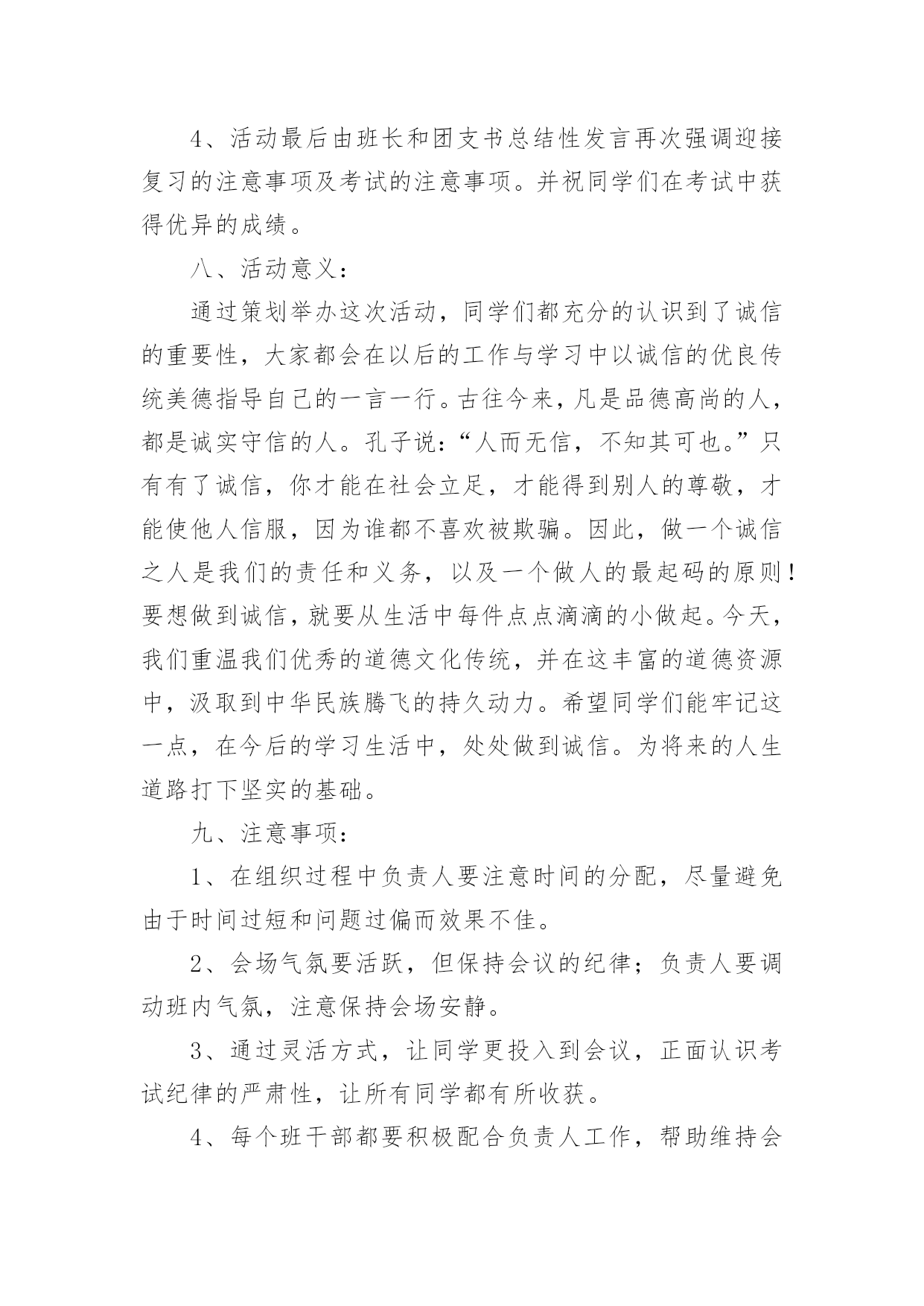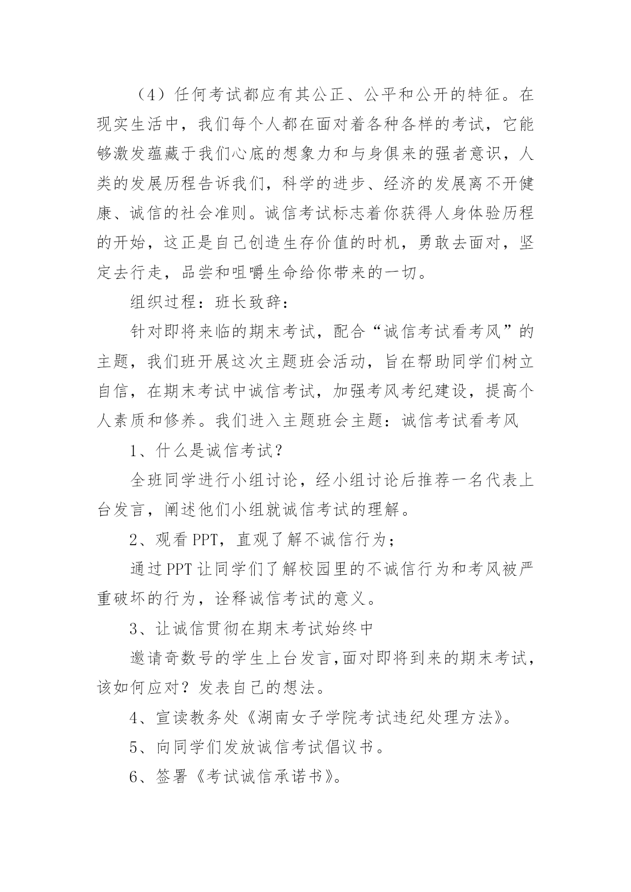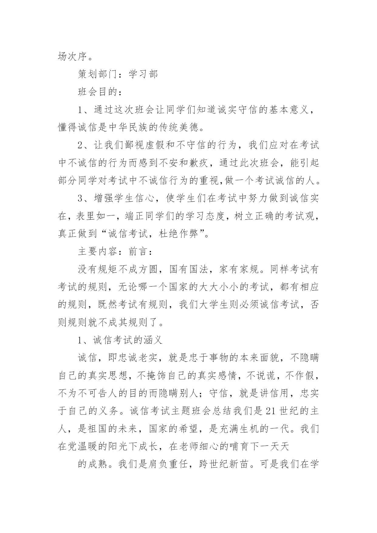 学生诚信考试主题班会【优秀】关于学生诚信考试主题班会在日常的学习中,大家都听说过主题班会吧?主题班会必须有明确的教育目的,自始至终贯穿,渗透着极强的教育性。其实很多人都不太清楚好的主题班会是什么样的,以下是小编整理的关于学生诚信考试主题班会,欢迎大家借鉴与参考,希望对大家有所帮助。一、活动主题:诚信考试诚实做人二、活动背景:诚实守信是中华民族的传统美德,是我们每个人的立身之本。时光飞逝,转眼一学期的学习又将告一段落,我们也迎来了xx—xx学年度第一学期期末考试,我们要面临的既是一次学习成果的检阅,更是一场道德与诚信的考验,面临期末全校已经进入了备考阶段。严肃考风考纪成为普遍关注的问题。本次活动意在使同学们认识到诚信的重要性和培养同学们诚信的意识,并初步学会将诚信融入日常生活中的每一件小事,真正做到诚实守信。让每位同学认识到诚信对于人生的重要性,诚信是做人的一种品质,是职业道德的根本,是个人成就事业的根基。要培养诚信的良好道德品质,就要从身边的每一件小事做起。三、活动目的:1、全面贯彻、认真学习考场纪律要求。2、指导大家的认真复习,做好考试准备。3、加强诚信意识教育,塑造良好道德品质四、活动对象:咸阳职员医学系全体学生。五,活动时间:xx年12月六、活动地点:个班教室七、活动流程1、诚信意识教育班长团支书首先向同学们传达学习有关考试的规章制度,详细阐述考试过程中诚实守信·认证仔细·沉着冷静的重要性。接着要求同学们围绕即将到来的期末考试,结合自身实际阐述自己所理解考试的含义。让同学们明白考试只是检测所学知识的手段,是平时努力程度的集中反映。优异的成绩要靠自己的真实智慧·辛勤奋斗来争取。因此大家一定要遵守学校的校纪校规,用严谨的考试作风,严明的考试纪律和良好的心态迎接期末考试的到来。2、请几位成绩优秀的同学讲讲自己的复习方法和平时学习的经验。3、“诚信考试,诚实做人”的签名活动组织全班同学在“倡导诚信考试,建立和谐校园”的横幅上签名,以便提醒同学们要诚信考试,杜绝一切作弊行为。4、活动最后由班长和团支书总结性发言再次强调迎接复习的注意事项及考试的注意事项。并祝同学们在考试中获得优异的成绩。八、活动意义:通过策划举办这次活动,同学们都充分的认识到了诚信的重要性,大家都会在以后的工作与学习中以诚信的优良传统美德指导自己的一言一行。古往今来,凡是品德高尚的人,都是诚实守信的人。孔子说:“人而无信,不知其可也。”只有有了诚信,你才能在社会立足,才能得到别人的尊敬,才能使他人信服,因为谁都不喜欢被欺骗。因此,做一个诚信之人是我们的责任和义务,以及一个做人的最起码的原则!要想做到诚信,就要从生活中每件点点滴滴的小做起。今天,我们重温我们优秀的道德文化传统,并在这丰富的道德资源中,汲取到中华民族腾飞的持久动力。希望同学们能牢记这一点,在今后的学习生活中,处处做到诚信。为将来的人生道路打下坚实的基础。九、注意事项:1、在组织过程中负责人要注意时间的分配,尽量避免由于时间过短和问题过偏而效果不佳。2、会场气氛要活跃,但保持会议的纪律;负责人要调动班内气氛,注意保持会场安静。3、通过灵活方式,让同学更投入到会议,正面认识考试纪律的严肃性,让所有同学都有所收获。4、每个班干部都要积极配合负责人工作,帮助维持会场次序。策划部门:学习部班会目的:1、通过这次班会让同学们知道诚实守信的基本意义,懂得诚信是中华民族的传统美德。2、让我们鄙视虚假和不守信的行为,我们应对在考试中不诚信的行为而感到不安和歉疚,通过此次班会,能引起部分同学对考试中不诚信行为的重视,做一个考试诚信的人。3、增强学生信心,使学生们在考试中努力做到诚信实在,表里如一,端正同学们的学习态度,树立正确的考试观,真正做到“诚信考试,杜绝作弊”。主要内容:前言:没有规矩不成方圆,国有国法,家有家规。同样考试有考试的规则,无论哪一个国家的大大小小的考试,都有相应的规则,既然考试有规则,我们大学生则必须诚信考试,否则规则就不成其规则了。1、诚信考试的涵义诚信,即忠诚老实,就是忠于事物的本来面貌,不隐瞒自己的真实思想,不掩饰自己的真实感情,不说谎,不作假,不为不可告人的目的而隐瞒别人;守信,就是讲信用,忠实于自己的义务。诚信考试主题班会总结我们是21世纪的主人,是祖国的未来,国家的希望,是充满生机的一代。我们在党温暖的阳光下成长,在老师细心的哺育下一天天的成熟。我们是肩负重任,跨世纪新苗。可是我们在学校经常听到xxx在考试中作弊被处分。这不禁令我们心寒。2、为什么诚信考试会严重缺失呢?(1)同学们在听课态度上存在着极大的不良风气,课上睡觉和玩手机现象严重,导致基础知识掌握不牢,面临期末考试又不想挂科而选择作弊,将诚信考试弃之脑后。(2)部分学生整个学期都以享受为主,不重视学习,最后期末考试如果挂科无法