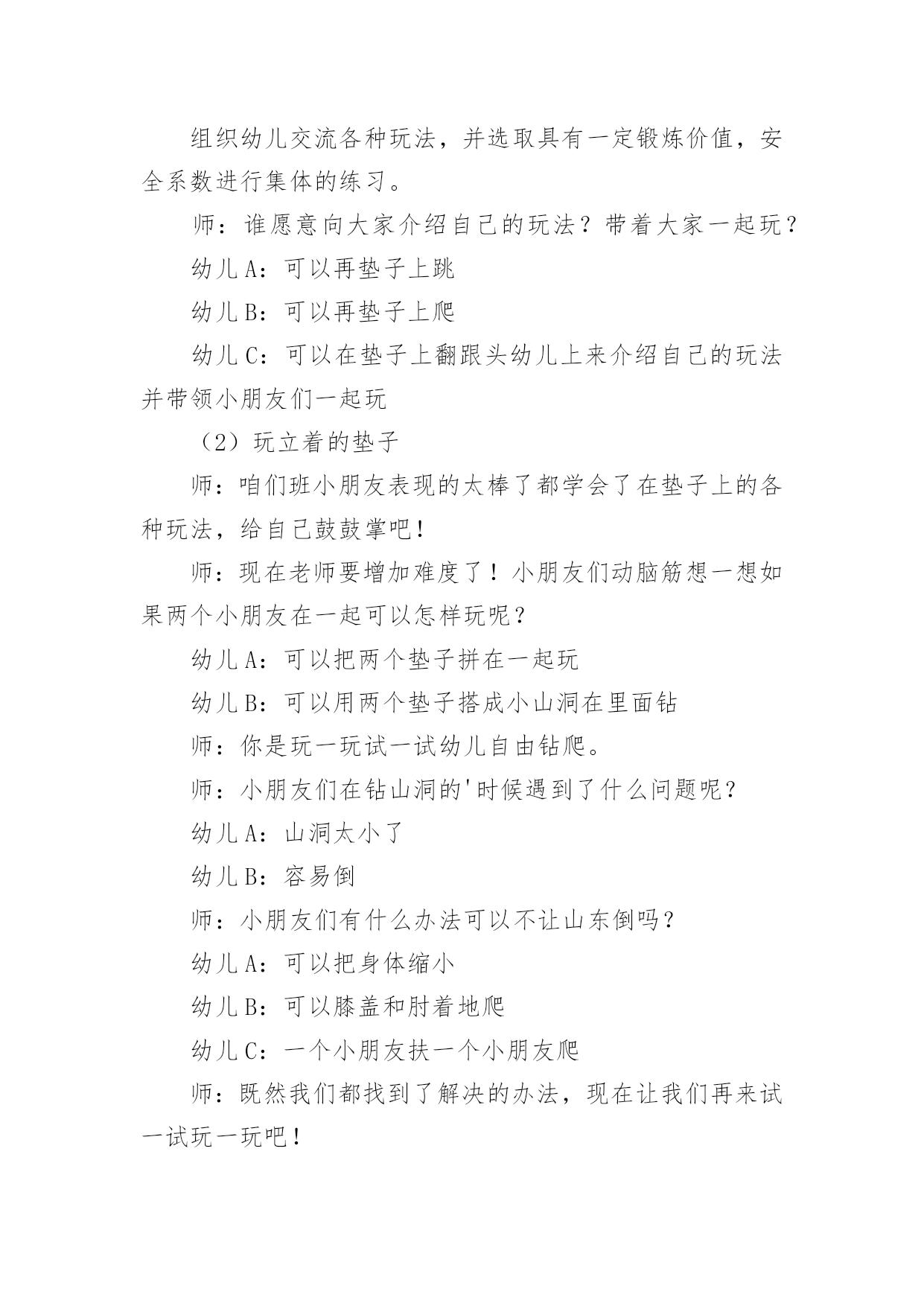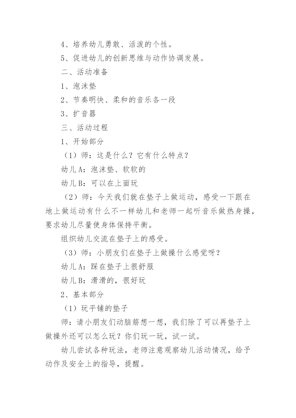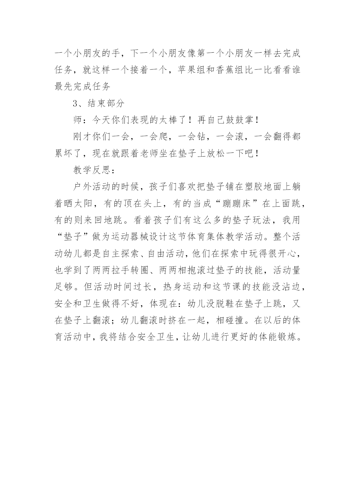 大班健康玩垫子教案作为一位兢兢业业的人民教师,有必要进行细致的教案准备工作,借助教案可以有效提升自己的教学能力。教案应该怎么写呢?以下是小编收集整理的大班健康玩垫子教案,欢迎阅读,希望大家能够喜欢。大班健康玩垫子教案1一、活动目标1、幼儿能愉快的参与活动过程,体验游戏的快乐;2、积极探索垫子的不同摆放方式及玩法;3、增进创造性运动思维,提高身体的协调性及平衡能力。4、培养幼儿勇敢、活泼的个性。5、促进幼儿的创新思维与动作协调发展。二、活动准备1、泡沫垫2、节奏明快、柔和的音乐各一段3、扩音器三、活动过程1、开始部分(1)师:这是什么?它有什么特点?幼儿A:泡沫垫、软软的幼儿B:可以在上面玩(2)师:今天我们就在垫子上做运动,感受一下跟在地上做运动有什么不一样幼儿和老师一起听音乐做热身操,要求幼儿尽量使身体保持平衡。组织幼儿交流在垫子上的感受。(3)师:小朋友们在垫子上做操什么感觉呀?幼儿A:踩在垫子上很舒服幼儿B:滑滑的,很好玩2、基本部分(1)玩平铺的垫子师:请小朋友们动脑筋想一想,我们除了可以再垫子上做操外还可以怎么玩?你们玩一玩,试一试。幼儿尝试各种玩法,老师注意观察幼儿活动情况,给予动作及安全上的指导,提醒。组织幼儿交流各种玩法,并选取具有一定锻炼价值,安全系数进行集体的练习。师:谁愿意向大家介绍自己的玩法?带着大家一起玩?幼儿A:可以再垫子上跳幼儿B:可以再垫子上爬幼儿C:可以在垫子上翻跟头幼儿上来介绍自己的玩法并带领小朋友们一起玩(2)玩立着的垫子师:咱们班小朋友表现的太棒了都学会了在垫子上的各种玩法,给自己鼓鼓掌吧!师:现在老师要增加难度了!小朋友们动脑筋想一想如果两个小朋友在一起可以怎样玩呢?幼儿A:可以把两个垫子拼在一起玩幼儿B:可以用两个垫子搭成小山洞在里面钻师:你是玩一玩试一试幼儿自由钻爬。师:小朋友们在钻山洞的`时候遇到了什么问题呢?幼儿A:山洞太小了幼儿B:容易倒师:小朋友们有什么办法可以不让山东倒吗?幼儿A:可以把身体缩小幼儿B:可以膝盖和肘着地爬幼儿C:一个小朋友扶一个小朋友爬师:既然我们都找到了解决的办法,现在让我们再来试一试玩一玩吧!(3)玩平铺上的大垫子师:刚才啊,小朋友们都通过相互合作,小心翼翼的钻了山洞,表现得太帮了,老师来给你们鼓鼓掌!师:现在请小朋友们拿一个垫子分别站在周老师和王老师的左手边、右手边,请站在周老师这边的两队小朋友一起拼一个长的大垫子,也请站在王老师那边的小朋友也拼一个长的大垫子幼儿拼好垫子,立正站好。师:小朋友们看这么大的垫子我们怎么玩呢?小朋友们试一试幼儿自己滚着玩,教师仔细观察并指导。师:刚才我看到有小朋友再垫子上滚得都歪了,怎样才能是身体保持平衡,不歪呢?教师示范,并进行动作讲解。幼儿试着滚一滚。师:现在我们来玩个游戏,我们来比赛,周老师组和王老师组比赛,每个小朋友在垫子上保持身体平衡一个接着一个滚到垫子那头,再从外面跑回来,比一比哪一组最先结束。预备,开始!(4)游戏师:小朋友觉得垫子好玩嘛?现在老师又要给你们增加难度了,请小朋友看那边!教师示范并讲解跳--爬--钻--滚--翻跟头师:现在请小朋友分别站在老师的左手边和右手边,现在老师要给你们起一个好听的名字,站在老师左手边的,我们叫苹果组,老师右手边的叫做香蕉组!每组的小朋友听老师口令,老师喊预备,开始的时候,每组的第一个小朋友就立刻老师给你们的这写任务。完成之后从外边跑回来拍打下一个小朋友的手,下一个小朋友像第一个小朋友一样去完成任务,就这样一个接着一个,苹果组和香蕉组比一比看看谁最先完成任务3、结束部分师:今天你们表现的太棒了!再自己鼓鼓掌!刚才你们一会,一会爬,一会钻,一会滚,一会翻得都累坏了,现在就跟着老师坐在垫子上放松一下吧!教学反思:户外活动的时候,孩子们喜欢把垫子铺在塑胶地面上躺着晒太阳,有的顶在头上,有的当成“蹦蹦床”在上面跳,有的则来回地跳。看着孩子们有这么多的垫子玩法,我用“垫子”做为运动器械设计这节体育集体教学活动。整个活动幼儿都是自主探索、自由活动,他们在探索中玩得很开心,也学到了两两拉手转圈、两两相抱滚过垫子的技能,活动量足够。但活动时间过长,热身运动和这节课的技能没沾边,安全和卫生做得不好,体现在:幼儿没脱鞋在垫子上跳,又在垫子上翻滚;幼儿翻滚时挤在一起,相碰撞。在以后的体育活动中,我将结合安全卫生,让幼儿进行更好的体能锻炼。大班健康玩垫子教案2一、活动目标1、幼儿能愉快的参与活动过程,体验游戏的快乐;2、积极探索垫子的不同摆放方式及玩法;3、增进创造性运动思维,提高身体的协调性及平衡能力。4、培养幼儿勇敢、活泼的个性。5、促进幼儿的创新思维与动作协调发展。二、活动准备1、泡沫垫2、节奏明快、柔和的音乐各一段3、扩音器三、活动过程1、开始部分(1)师:这是什么?它有什么特点?幼