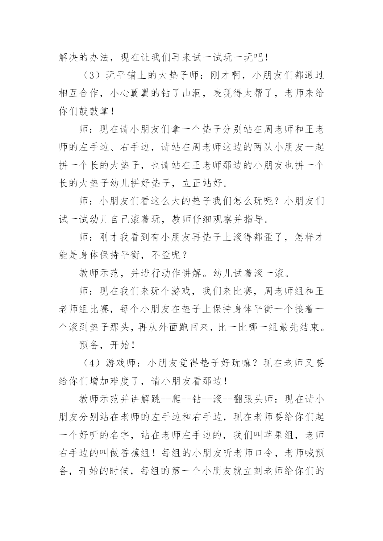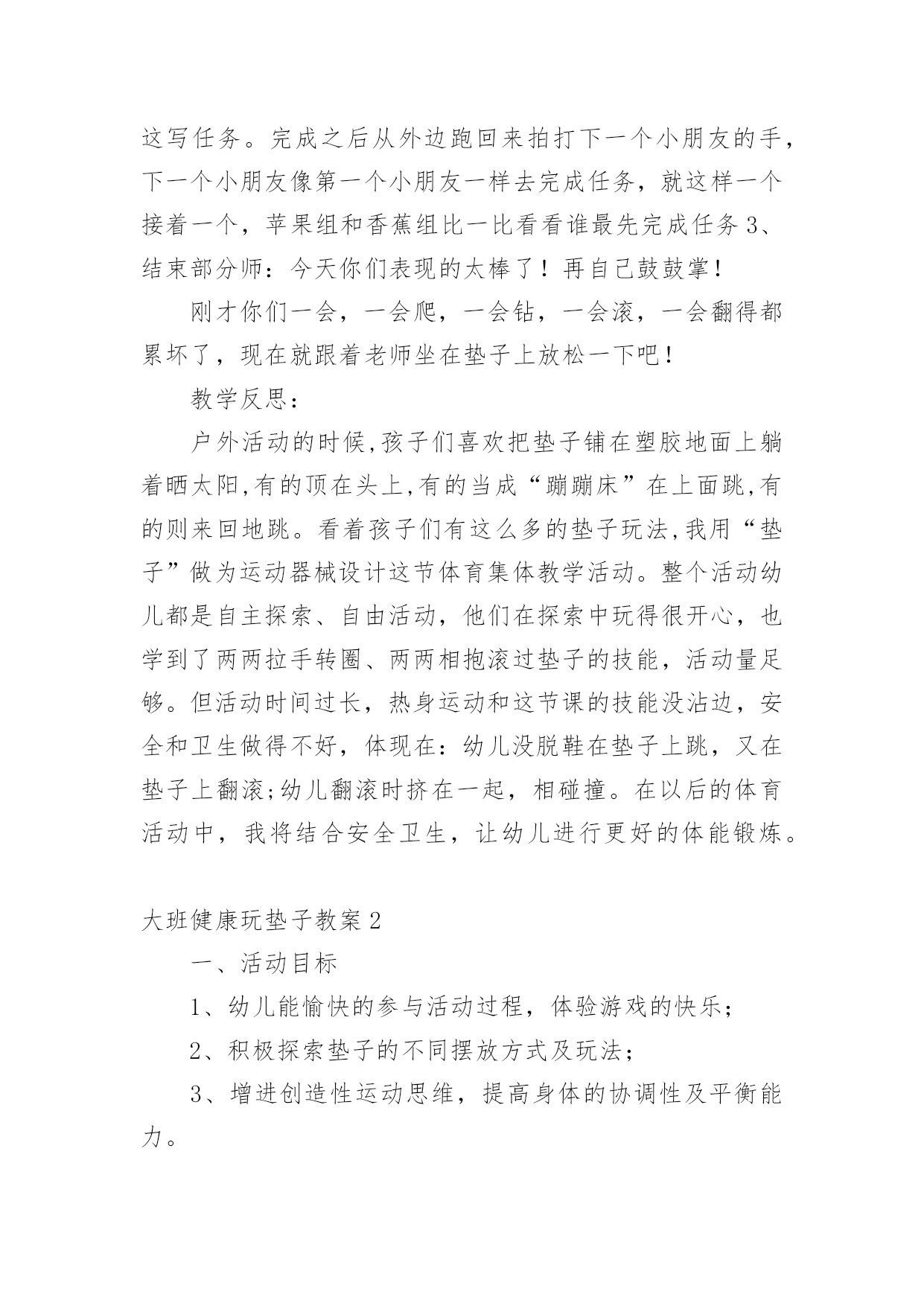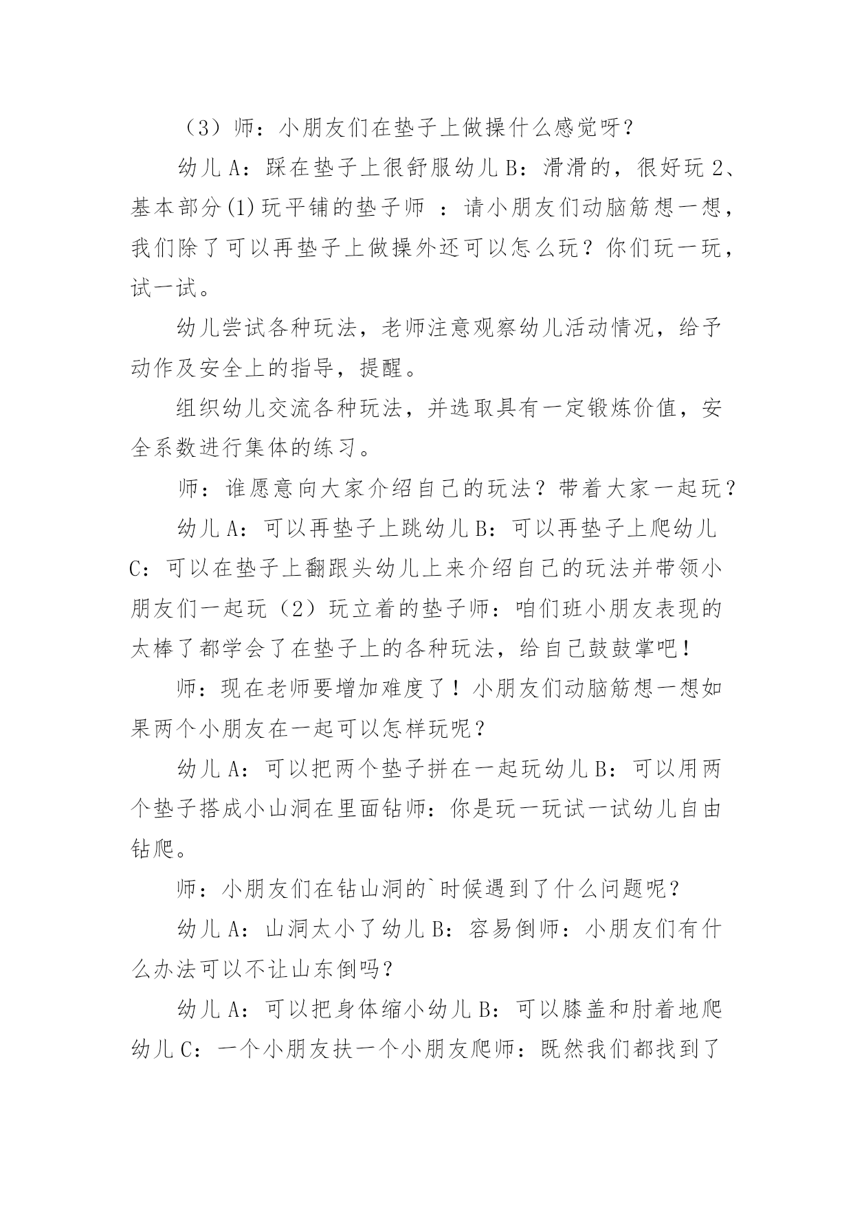 大班健康玩垫子教案作为一位兢兢业业的人民教师,有必要进行细致的教案准备工作,借助教案可以有效提升自己的教学能力。教案应该怎么写呢?以下是小编收集整理的大班健康玩垫子教案,欢迎阅读,希望大家能够喜欢。大班健康玩垫子教案1一、活动目标1、幼儿能愉快的参与活动过程,体验游戏的快乐;2、积极探索垫子的不同摆放方式及玩法;3、增进创造性运动思维,提高身体的协调性及平衡能力。4、培养幼儿勇敢、活泼的个性。5、促进幼儿的创新思维与动作协调发展。二、活动准备1、泡沫垫2、节奏明快、柔和的音乐各一段3、扩音器三、活动过程1、开始部分(1)师:这是什么?它有什么特点?幼儿A:泡沫垫、软软的幼儿B:可以在上面玩(2)师:今天我们就在垫子上做运动,感受一下跟在地上做运动有什么不一样幼儿和老师一起听音乐做热身操,要求幼儿尽量使身体保持平衡。组织幼儿交流在垫子上的感受。(3)师:小朋友们在垫子上做操什么感觉呀?幼儿A:踩在垫子上很舒服幼儿B:滑滑的,很好玩2、基本部分(1)玩平铺的垫子师:请小朋友们动脑筋想一想,我们除了可以再垫子上做操外还可以怎么玩?你们玩一玩,试一试。幼儿尝试各种玩法,老师注意观察幼儿活动情况,给予动作及安全上的指导,提醒。组织幼儿交流各种玩法,并选取具有一定锻炼价值,安全系数进行集体的练习。师:谁愿意向大家介绍自己的玩法?带着大家一起玩?幼儿A:可以再垫子上跳幼儿B:可以再垫子上爬幼儿C:可以在垫子上翻跟头幼儿上来介绍自己的玩法并带领小朋友们一起玩(2)玩立着的垫子师:咱们班小朋友表现的太棒了都学会了在垫子上的各种玩法,给自己鼓鼓掌吧!师:现在老师要增加难度了!小朋友们动脑筋想一想如果两个小朋友在一起可以怎样玩呢?幼儿A:可以把两个垫子拼在一起玩幼儿B:可以用两个垫子搭成小山洞在里面钻师:你是玩一玩试一试幼儿自由钻爬。师:小朋友们在钻山洞的`时候遇到了什么问题呢?幼儿A:山洞太小了幼儿B:容易倒师:小朋友们有什么办法可以不让山东倒吗?幼儿A:可以把身体缩小幼儿B:可以膝盖和肘着地爬幼儿C:一个小朋友扶一个小朋友爬师:既然我们都找到了解决的办法,现在让我们再来试一试玩一玩吧!(3)玩平铺上的大垫子师:刚才啊,小朋友们都通过相互合作,小心翼翼的钻了山洞,表现得太帮了,老师来给你们鼓鼓掌!师:现在请小朋友们拿一个垫子分别站在周老师和王老师的左手边、右手边,请站在周老师这边的两队小朋友一起拼一个长的大垫子,也请站在王老师那边的小朋友也拼一个长的大垫子幼儿拼好垫子,立正站好。师:小朋友们看这么大的垫子我们怎么玩呢?小朋友们试一试幼儿自己滚着玩,教师仔细观察并指导。师:刚才我看到有小朋友再垫子上滚得都歪了,怎样才能是身体保持平衡,不歪呢?教师示范,并进行动作讲解。幼儿试着滚一滚。师:现在我们来玩个游戏,我们来比赛,周老师组和王老师组比赛,每个小朋友在垫子上保持身体平衡一个接着一个滚到垫子那头,再从外面跑回来,比一比哪一组最先结束。预备,开始!(4)游戏师:小朋友觉得垫子好玩嘛?现在老师又要给你们增加难度了,请小朋友看那边!教师示范并讲解跳--爬--钻--滚--翻跟头师:现在请小朋友分别站在老师的左手边和右手边,现在老师要给你们起一个好听的名字,站在老师左手边的,我们叫苹果组,老师右手边的叫做香蕉组!每组的小朋友听老师口令,老师喊预备,开始的时候,每组的第一个小朋友就立刻老师给你们的这写任务。完成之后从外边跑回来拍打下一个小朋友的手,下一个小朋友像第一个小朋友一样去完成任务,就这样一个接着一个,苹果组和香蕉组比一比看看谁最先完成任务3、结束部分师:今天你们表现的太棒了!再自己鼓鼓掌!刚才你们一会,一会爬,一会钻,一会滚,一会翻得都累坏了,现在就跟着老师坐在垫子上放松一下吧!教学反思:户外活动的时候,孩子们喜欢把垫子铺在塑胶地面上躺着晒太阳,有的顶在头上,有的当成“蹦蹦床”在上面跳,有的则来回地跳。看着孩子们有这么多的垫子玩法,我用“垫子”做为运动器械设计这节体育集体教学活动。整个活动幼儿都是自主探索、自由活动,他们在探索中玩得很开心,也学到了两两拉手转圈、两两相抱滚过垫子的技能,活动量足够。但活动时间过长,热身运动和这节课的技能没沾边,安全和卫生做得不好,体现在:幼儿没脱鞋在垫子上跳,又在垫子上翻滚;幼儿翻滚时挤在一起,相碰撞。在以后的体育活动中,我将结合安全卫生,让幼儿进行更好的体能锻炼。大班健康玩垫子教案2一、活动目标1、幼儿能愉快的参与活动过程,体验游戏的快乐;2、积极探索垫子的不同摆放方式及玩法;3、增进创造性运动思维,提高身体的协调性及平衡能力。4、培养幼儿勇敢、活泼的个性。5、促进幼儿的创新思维与动作协调发展。二、活动准备1、泡沫垫2、节奏明快、柔和的音乐各一段3、扩音器三、活动过程1、开始部分(1)师:这是什么?它有什么特点?幼