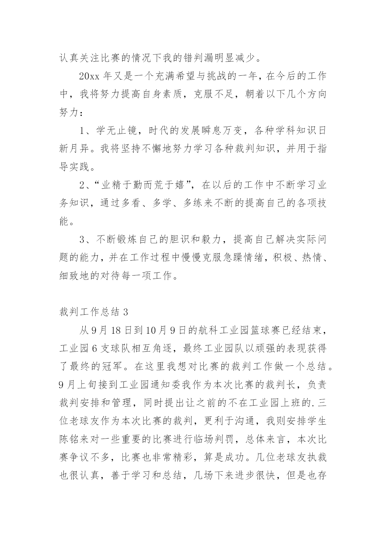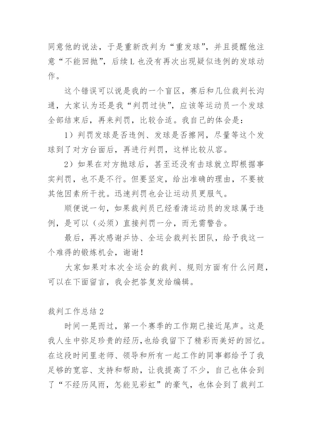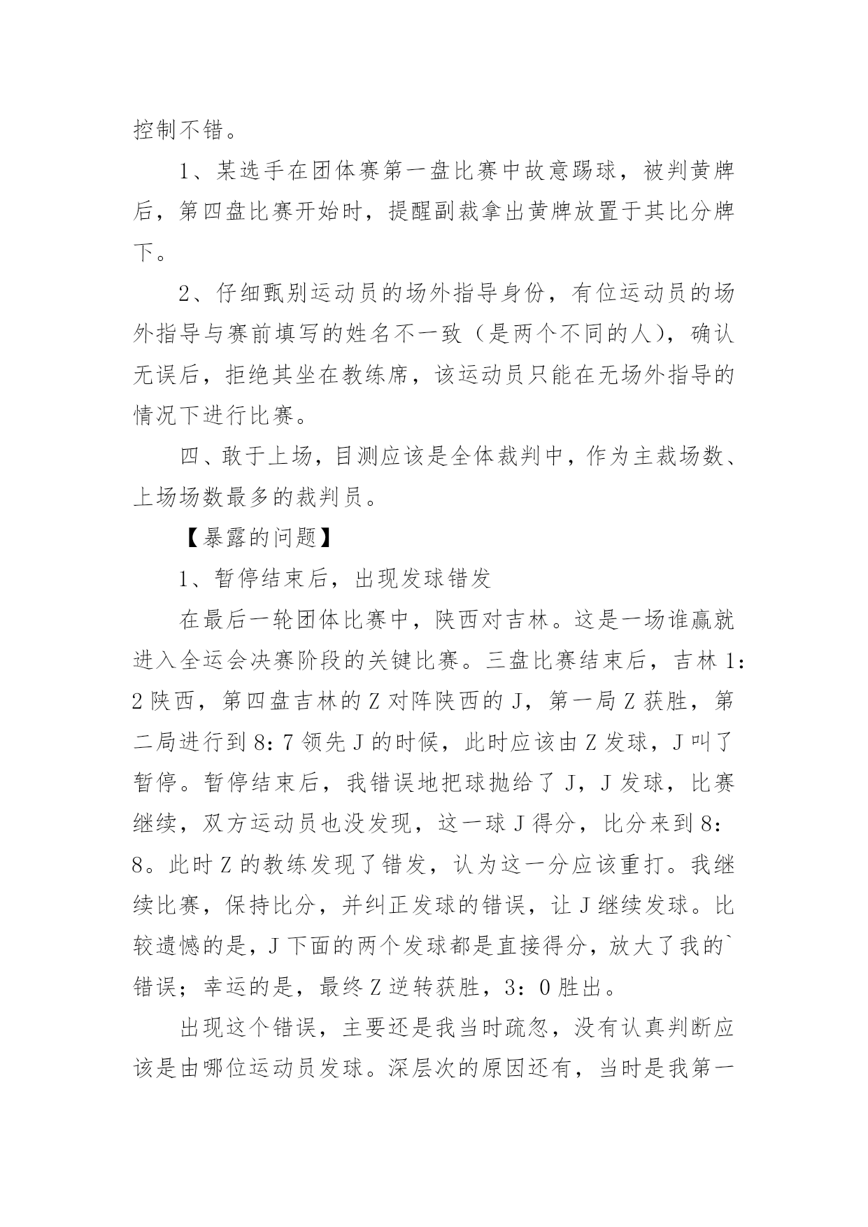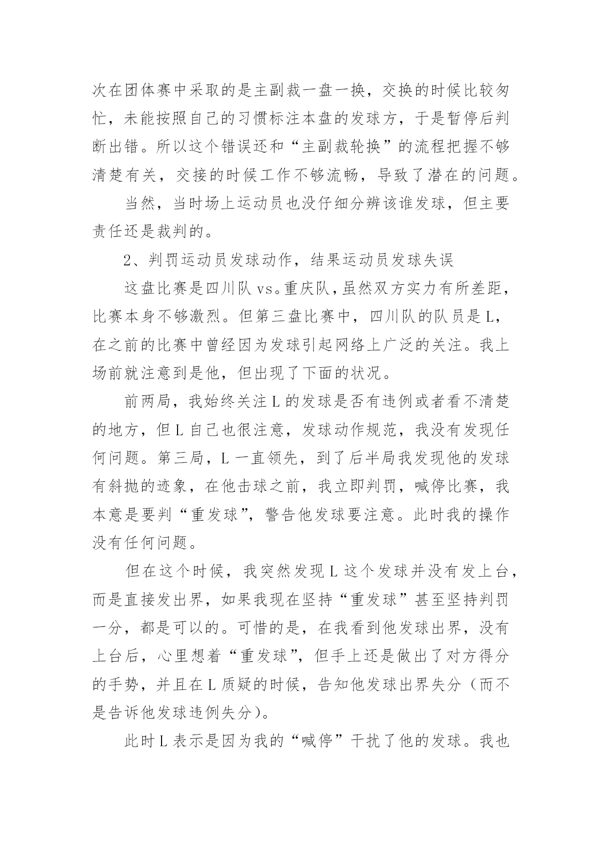 裁判工作总结裁判工作总结15篇总结是对某一特定时间段内的学习和工作生活等表现情况加以回顾和分析的一种书面材料,它可以提升我们发现问题的能力,因此,让我们写一份总结吧。但是总结有什么要求呢?下面是小编帮大家整理的裁判工作总结,欢迎大家借鉴与参考,希望对大家有所帮助。裁判工作总结1在10天的工作中,执法单项赛15+场,团体赛9场,出示黄牌2张,判罚运动员发球8次,业务性错误2次,操作性错误6次。整体上对自己的表现还算满意,但与其他高水平裁判相比还有一定差距。【做得不错的地方】一、在前八天的工作中,表现尚可,没有出现业务性错误。二、敢判运动员的发球违例1、多次对运动员的发球做出判罚,并用手势告诉运动员判罚的理由。2、即便是全场观众助威的东道主队,事关东道主队是否能够进入决赛的场次中,也能坚决判罚发球。三、对于平时较少出现的判罚场景,有心理准备,场上控制不错。1、某选手在团体赛第一盘比赛中故意踢球,被判黄牌后,第四盘比赛开始时,提醒副裁拿出黄牌放置于其比分牌下。2、仔细甄别运动员的场外指导身份,有位运动员的场外指导与赛前填写的姓名不一致(是两个不同的人),确认无误后,拒绝其坐在教练席,该运动员只能在无场外指导的情况下进行比赛。四、敢于上场,目测应该是全体裁判中,作为主裁场数、上场场数最多的裁判员。【暴露的问题】1、暂停结束后,出现发球错发在最后一轮团体比赛中,陕西对吉林。这是一场谁赢就进入全运会决赛阶段的关键比赛。三盘比赛结束后,吉林1:2陕西,第四盘吉林的Z对阵陕西的J,第一局Z获胜,第二局进行到8:7领先J的时候,此时应该由Z发球,J叫了暂停。暂停结束后,我错误地把球抛给了J,J发球,比赛继续,双方运动员也没发现,这一球J得分,比分来到8:8。此时Z的教练发现了错发,认为这一分应该重打。我继续比赛,保持比分,并纠正发球的错误,让J继续发球。比较遗憾的是,J下面的两个发球都是直接得分,放大了我的`错误;幸运的是,最终Z逆转获胜,3:0胜出。出现这个错误,主要还是我当时疏忽,没有认真判断应该是由哪位运动员发球。深层次的原因还有,当时是我第一次在团体赛中采取的是主副裁一盘一换,交换的时候比较匆忙,未能按照自己的习惯标注本盘的发球方,于是暂停后判断出错。所以这个错误还和“主副裁轮换”的流程把握不够清楚有关,交接的时候工作不够流畅,导致了潜在的问题。当然,当时场上运动员也没仔细分辨该谁发球,但主要责任还是裁判的。2、判罚运动员发球动作,结果运动员发球失误这盘比赛是四川队vs。重庆队,虽然双方实力有所差距,比赛本身不够激烈。但第三盘比赛中,四川队的队员是L,在之前的比赛中曾经因为发球引起网络上广泛的关注。我上场前就注意到是他,但出现了下面的状况。前两局,我始终关注L的发球是否有违例或者看不清楚的地方,但L自己也很注意,发球动作规范,我没有发现任何问题。第三局,L一直领先,到了后半局我发现他的发球有斜抛的迹象,在他击球之前,我立即判罚,喊停比赛,我本意是要判“重发球”,警告他发球要注意。此时我的操作没有任何问题。但在这个时候,我突然发现L这个发球并没有发上台,而是直接发出界,如果我现在坚持“重发球”甚至坚持判罚一分,都是可以的。可惜的是,在我看到他发球出界,没有上台后,心里想着“重发球”,但手上还是做出了对方得分的手势,并且在L质疑的时候,告知他发球出界失分(而不是告诉他发球违例失分)。此时L表示是因为我的“喊停”干扰了他的发球。我也同意他的说法,于是重新改判为“重发球”,并且提醒他注意“不能回抛”,后续L也没有再次出现疑似违例的发球动作。这个错误可以说是我的一个盲区,赛后和几位裁判长沟通,大家认为还是我“判罚过快”,应该等运动员一个发球全部结束后,再来判罚,比较合适。我自己的体会是:1)判罚发球是否违例、发球是否擦网,尽量等这个发球到了对方台面后,再进行判罚,这样比较从容。2)如果在对方抛球后,甚至还没有击球就立即根据事实判罚,也不是不行。但要坚定,给出准确的理由,不要被其他因素所干扰。迅速判罚也会让运动员更服气。顺便说一句,如果裁判员已经看清运动员的发球属于违例,是可以(必须)直接判罚一分,而无需警告。最后,再次感谢乒协、全运会裁判长团队,给予我这一个难得的锻炼机会,谢谢!大家如果对本次全运会的裁判、规则方面有什么问题,可以在下面留言,我会把答复发给编辑。裁判工作总结2时间一晃而过,第一个赛季的工作期已接近尾声。这是我人生中弥足珍贵的经历,也给我留下了精彩而美好的回忆。在这段时间里老师、领导和所有一起工作的同事都给予了我足够的宽容、支持和帮助,让我提高了不少,自己也体会到了“不经历风雨,怎能见彩虹”的豪气,也体会到了裁判工作人员的重要性。在这三个月的时间里,在领导和同事们的悉心关怀和指导下,通过自身的不懈努力,各方面均取得了一定的进步,