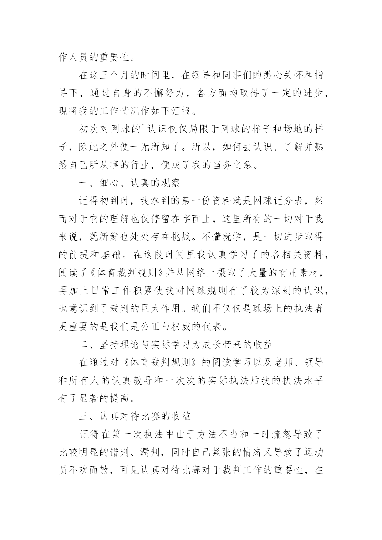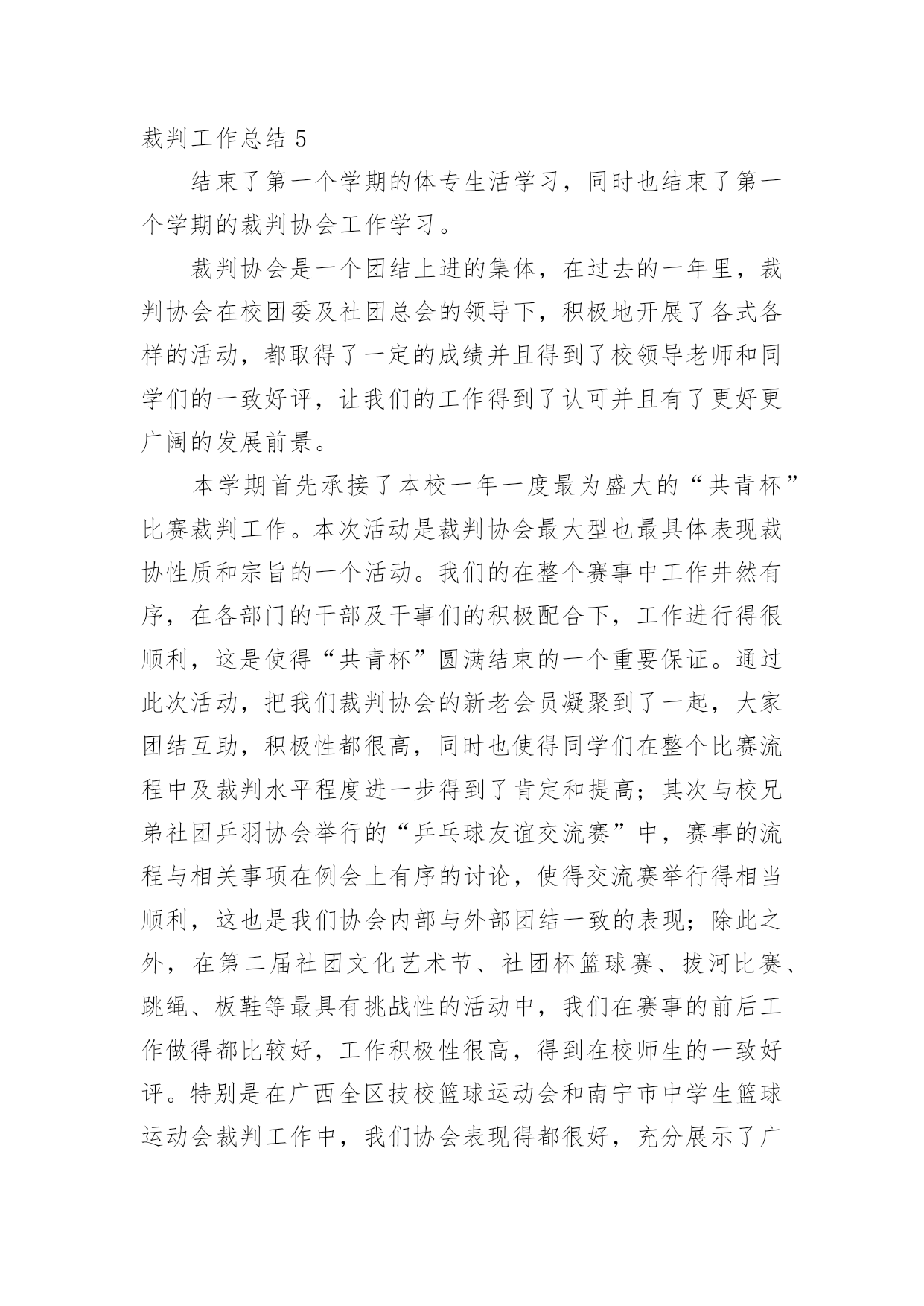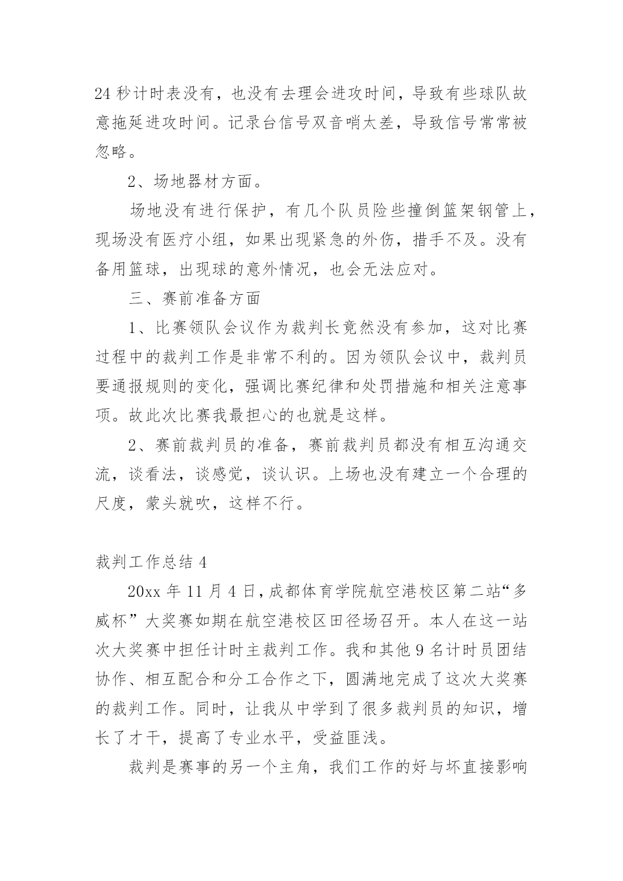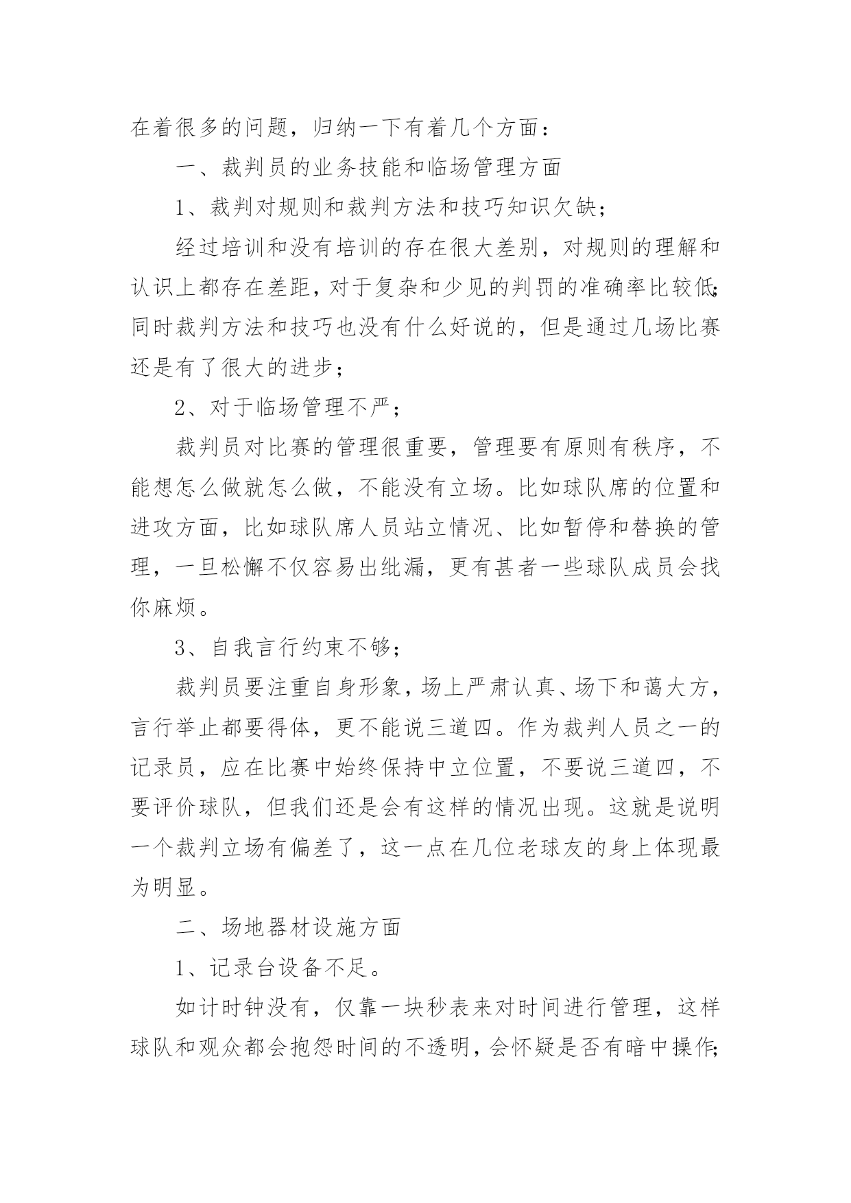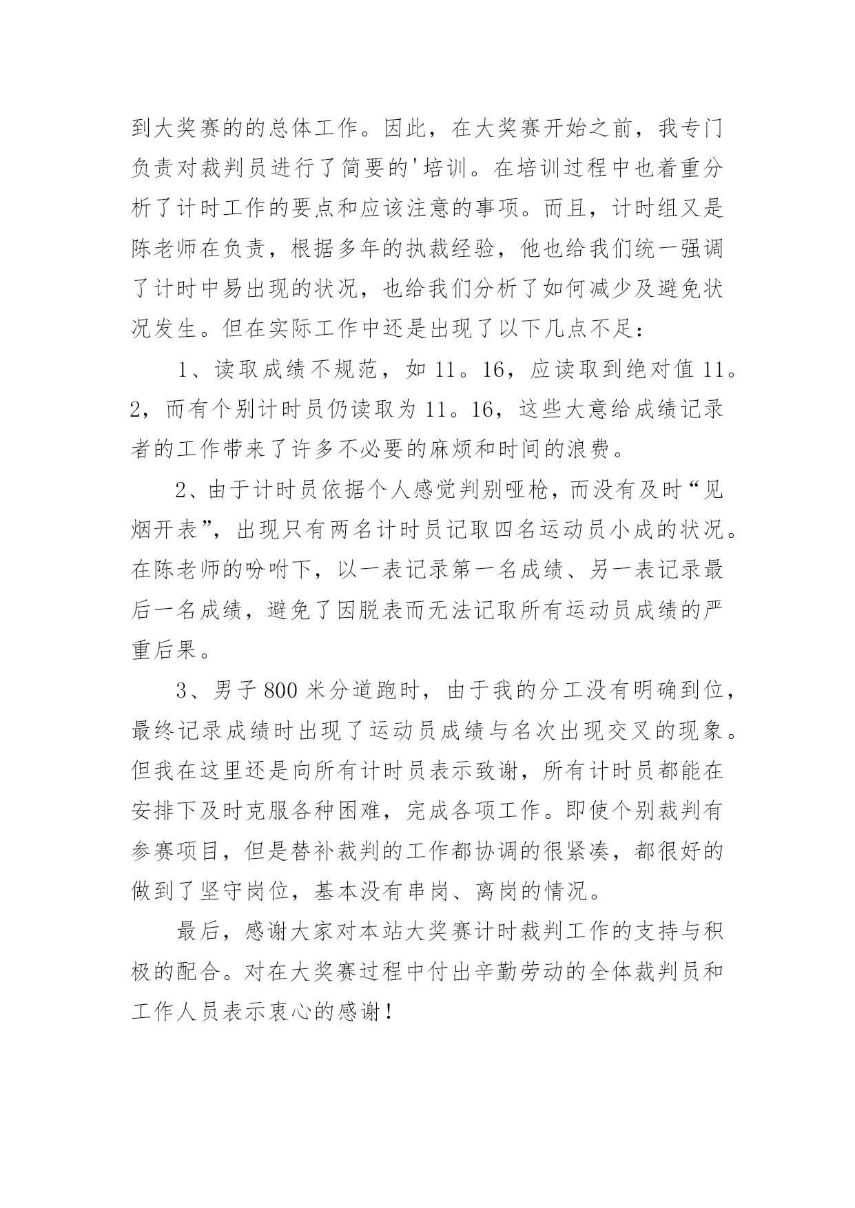 裁判工作总结裁判工作总结15篇总结是对某一特定时间段内的学习和工作生活等表现情况加以回顾和分析的一种书面材料,它可以提升我们发现问题的能力,因此,让我们写一份总结吧。但是总结有什么要求呢?下面是小编帮大家整理的裁判工作总结,欢迎大家借鉴与参考,希望对大家有所帮助。裁判工作总结1在10天的工作中,执法单项赛15+场,团体赛9场,出示黄牌2张,判罚运动员发球8次,业务性错误2次,操作性错误6次。整体上对自己的表现还算满意,但与其他高水平裁判相比还有一定差距。【做得不错的地方】一、在前八天的工作中,表现尚可,没有出现业务性错误。二、敢判运动员的发球违例1、多次对运动员的发球做出判罚,并用手势告诉运动员判罚的理由。2、即便是全场观众助威的东道主队,事关东道主队是否能够进入决赛的场次中,也能坚决判罚发球。三、对于平时较少出现的判罚场景,有心理准备,场上控制不错。1、某选手在团体赛第一盘比赛中故意踢球,被判黄牌后,第四盘比赛开始时,提醒副裁拿出黄牌放置于其比分牌下。2、仔细甄别运动员的场外指导身份,有位运动员的场外指导与赛前填写的姓名不一致(是两个不同的人),确认无误后,拒绝其坐在教练席,该运动员只能在无场外指导的情况下进行比赛。四、敢于上场,目测应该是全体裁判中,作为主裁场数、上场场数最多的裁判员。【暴露的问题】1、暂停结束后,出现发球错发在最后一轮团体比赛中,陕西对吉林。这是一场谁赢就进入全运会决赛阶段的关键比赛。三盘比赛结束后,吉林1:2陕西,第四盘吉林的Z对阵陕西的J,第一局Z获胜,第二局进行到8:7领先J的时候,此时应该由Z发球,J叫了暂停。暂停结束后,我错误地把球抛给了J,J发球,比赛继续,双方运动员也没发现,这一球J得分,比分来到8:8。此时Z的教练发现了错发,认为这一分应该重打。我继续比赛,保持比分,并纠正发球的错误,让J继续发球。比较遗憾的是,J下面的两个发球都是直接得分,放大了我的`错误;幸运的是,最终Z逆转获胜,3:0胜出。出现这个错误,主要还是我当时疏忽,没有认真判断应该是由哪位运动员发球。深层次的原因还有,当时是我第一次在团体赛中采取的是主副裁一盘一换,交换的时候比较匆忙,未能按照自己的习惯标注本盘的发球方,于是暂停后判断出错。所以这个错误还和“主副裁轮换”的流程把握不够清楚有关,交接的时候工作不够流畅,导致了潜在的问题。当然,当时场上运动员也没仔细分辨该谁发球,但主要责任还是裁判的。2、判罚运动员发球动作,结果运动员发球失误这盘比赛是四川队vs。重庆队,虽然双方实力有所差距,比赛本身不够激烈。但第三盘比赛中,四川队的队员是L,在之前的比赛中曾经因为发球引起网络上广泛的关注。我上场前就注意到是他,但出现了下面的状况。前两局,我始终关注L的发球是否有违例或者看不清楚的地方,但L自己也很注意,发球动作规范,我没有发现任何问题。第三局,L一直领先,到了后半局我发现他的发球有斜抛的迹象,在他击球之前,我立即判罚,喊停比赛,我本意是要判“重发球”,警告他发球要注意。此时我的操作没有任何问题。但在这个时候,我突然发现L这个发球并没有发上台,而是直接发出界,如果我现在坚持“重发球”甚至坚持判罚一分,都是可以的。可惜的是,在我看到他发球出界,没有上台后,心里想着“重发球”,但手上还是做出了对方得分的手势,并且在L质疑的时候,告知他发球出界失分(而不是告诉他发球违例失分)。此时L表示是因为我的“喊停”干扰了他的发球。我也同意他的说法,于是重新改判为“重发球”,并且提醒他注意“不能回抛”,后续L也没有再次出现疑似违例的发球动作。这个错误可以说是我的一个盲区,赛后和几位裁判长沟通,大家认为还是我“判罚过快”,应该等运动员一个发球全部结束后,再来判罚,比较合适。我自己的体会是:1)判罚发球是否违例、发球是否擦网,尽量等这个发球到了对方台面后,再进行判罚,这样比较从容。2)如果在对方抛球后,甚至还没有击球就立即根据事实判罚,也不是不行。但要坚定,给出准确的理由,不要被其他因素所干扰。迅速判罚也会让运动员更服气。顺便说一句,如果裁判员已经看清运动员的发球属于违例,是可以(必须)直接判罚一分,而无需警告。最后,再次感谢乒协、全运会裁判长团队,给予我这一个难得的锻炼机会,谢谢!大家如果对本次全运会的裁判、规则方面有什么问题,可以在下面留言,我会把答复发给编辑。裁判工作总结2时间一晃而过,第一个赛季的工作期已接近尾声。这是我人生中弥足珍贵的经历,也给我留下了精彩而美好的回忆。在这段时间里老师、领导和所有一起工作的同事都给予了我足够的宽容、支持和帮助,让我提高了不少,自己也体会到了“不经历风雨,怎能见彩虹”的豪气,也体会到了裁判工作人员的重要性。在这三个月的时间里,在领导和同事们的悉心关怀和指导下,通过自身的不懈努力,各方面均取得了一定的进步,