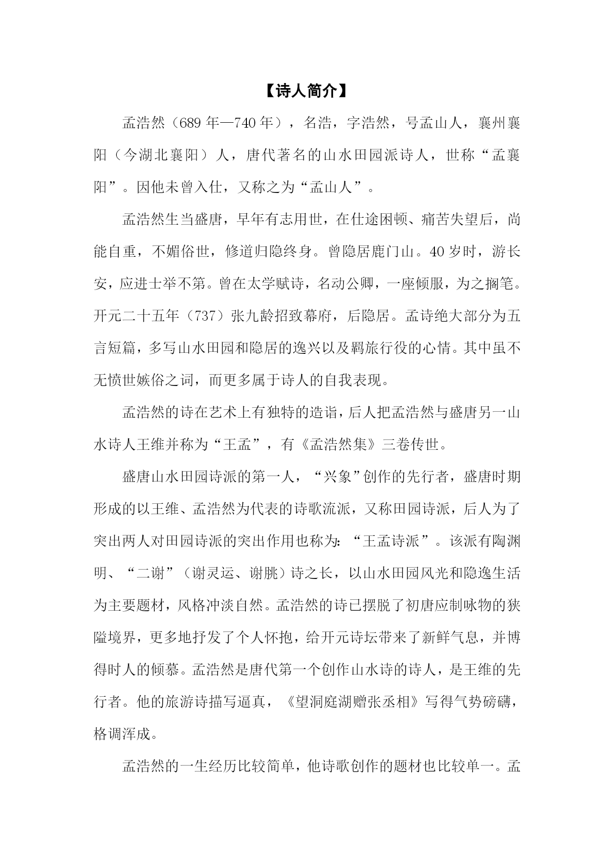 诗人孟浩然的资料孟浩然,唐代诗人。本名不详(一说名浩),汉族,襄州襄阳(今湖北襄阳)人。字浩然,世称「孟襄阳」,与另一位山水田园诗人王维合称为"王孟"。以写田园山水诗为主。因他未曾入仕,又称之为孟山人。襄阳南门外背山临江之涧南园有他的故居。曾隐居鹿门山。生平孟浩然出生于公元689年(武后永昌元年),唐代一位不甘隐居。壮年时曾往吴越漫游,后又赴长安谋求官职,但以「当路无人」,只好还归故园。开元二十八年(七四零)诗人王昌龄游襄阳,和他相聚甚欢,但此时孟浩然背上正生毒疮,据说就是因为「食鲜疾动」,终于病故,年五十二岁。孟浩然的一生,徘徊于求官与归隐的矛盾之中,直到碰了钉子才了结了求官的愿望。他虽然隐居林下,但仍与当时达官显官如张九龄等有往还,和诗人王维、李白、王昌龄也有酬唱。孟浩然的诗已摆脱了初唐应制,咏物的狭窄境界,更多地抒写了个人的怀抱,给开元诗坛带来了新鲜气息,并得到时人的倾慕。李白称颂他「高山仰,徒此揖清芬」,杜甫礼赞他「清诗句句尽堪传」。可见他在当时即享有盛名。他死后不到十年,诗集便两经编定,并送上「秘府」保存。现有孟浩然集。孟浩然出生于公元689年(武后永昌元年)。40岁时,游长安,应进士举不第。曾在太学赋诗,名动公卿,一座倾服,为之搁笔。他和王维交谊甚笃。传说王维曾私邀入内署,适逢玄宗至,浩然惊避床下。王维不敢隐瞒,据实奏闻,玄宗命出见。浩然自诵其诗,至"不才明主弃"之句,玄宗不悦,说:"卿不求仕,而朕未尝弃卿,奈何诬我!"放归襄阳。后漫游吴越,穷极山水之胜。开元二十二年(734),韩朝宗为襄州刺史,约孟浩然一同到长安,为他延誉。但他不慕荣名,至期竟失约不赴,终于无成。开元二十五年,张九龄为荆州长史,招致幕府。不久,仍返故居。公元740年(开元二十八年),王昌龄游襄阳,访孟浩然,相见甚欢。适浩然背上长了毒疮,医治将愈,因纵情宴饮,食鲜疾发逝世。孟浩然生当盛唐,早年有用世之志,但政治上困顿失意,以隐士终身。他是个洁身自好的人,不乐于趋承逢迎。他耿介不随的性格和清白高尚的情操,为同时和后世所倾慕。李白称赞他"红颜弃轩冕,白首卧松云",赞叹说:"高山仰,徒此揖清芬"(赠孟浩然)。王士源在孟浩然集序里,说他"骨貌淑清,风神散朗;救患释纷,以立义表;灌蔬艺竹,以全高尚"。王维曾画他的像于郢州亭子里,题曰:"浩然亭"。后人因尊崇他,不愿直呼其名,改作"孟亭",成为当地的名胜古迹。可见他在古代诗人中的盛名。王维、李白、王昌龄都是他的好友,杜甫等人也与他关系甚好隐居本是那时代普遍的倾向,但在旁人仅仅是一个期望,至多也只是点暂时的调剂,或过期的赔偿,在孟浩然却是一个完完整整的事实。在构成这事实的复杂因素中家乡的历史地理背景,或许是很重要的一点。在一个乱世,例如庞德公(东汉名士)的时代,对于某种特别性格的人,入山采药,一去不返,本是唯一的出路。但生在“开元全盛日”的孟浩然,有那必要吗?然则为什么三番两次朋友伸过援引的手来,都被拒绝,甚至最后和本州采访使韩朝宗约好了一同入京,到头还是喝得酩酊大醉,让韩公等烦了,一赌气独自走路呢?正如当时许多有隐士倾向的读书人,孟浩然原来是为隐居而隐居,为着一个浪漫的理想,为着对古人的一个神圣的默契而隐居。在他这回,无疑的那成立默契的对象便是庞德公。孟浩然当然不能为韩朝宗背弃庞公。鹿山不许他,他自己家园所在,也就是“庞公栖隐处”的鹿门山,决不许他那样做。鹿门月照开烟树,忽到庞公栖隐处。岩扉松径长寂寥,惟有幽人自来去。这幽人究竟是谁?庞公的精灵,还是诗人自己?恐怕那时他自己也分辨不出,因为心理上他早与那位先贤同体化了。历史的庞德公给了他启示,地理的鹿门山给了他方便,这两项重要条件具备了,隐居的事实便容易完成得多了。实在,鹿门山的家园早已使隐居成为既成事实,只要念头一转,承认自己是庞公的继承人,此身便俨然是高士传中的人物了。总之,是襄阳的历史地理环境促成孟浩然一生老于布衣的。孟浩然毕竟是襄阳的孟浩然。文学创作孟浩然的一生经历比较简单,他诗歌创作的题材也比较单一。孟诗绝大部分为五言短篇,多写山水田园和隐居的逸兴以及羁旅行役的心情。其中虽不无愤世嫉俗之词,而更多属于诗人的自我表现。他和王维并称,他的诗虽不如王诗题材广泛,但在艺术上有独特的造诣。孟诗不事雕饰,伫兴造思,富有超妙自得之趣,而不流于寒俭枯瘠。他善于发掘自然和生活之美,即景会心,写出一时真切的感受。如秋登万山寄张五、夏日南亭怀辛大、过故人庄、春晓、宿建德江、夜归鹿门歌等篇,自然浑成,而意境清迥,韵致流溢。杜甫说他、"清诗句句尽堪传"(解闷),又赞叹他"赋诗何必多,往往凌鲍谢"(遣兴)。皮日休则称:"先生之作遇景入咏,不拘奇抉异,令龌龊束人口者,涵涵然有干霄之兴,若公输氏当巧而不巧者也。北齐美萧悫'芙蓉露下落,杨柳月中疏';先生则有'微