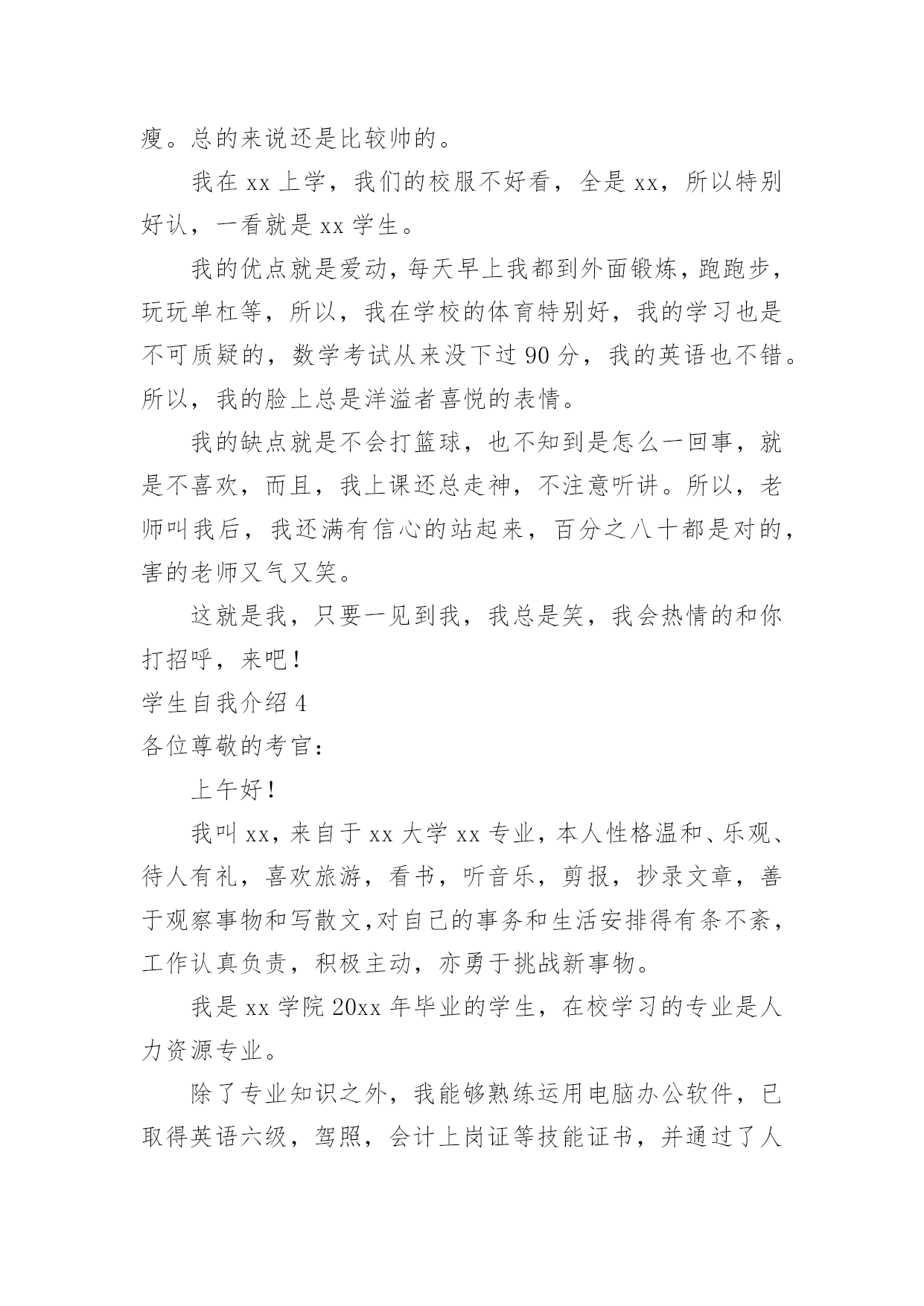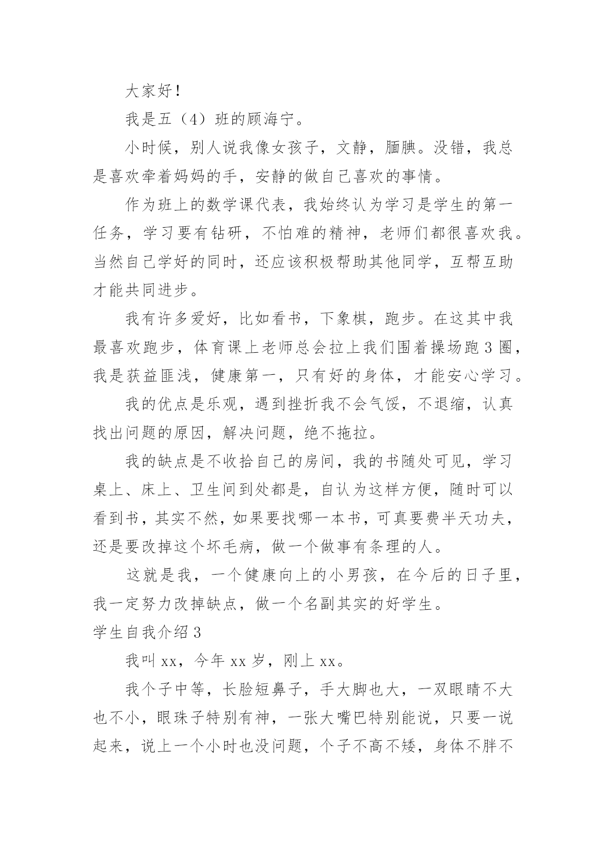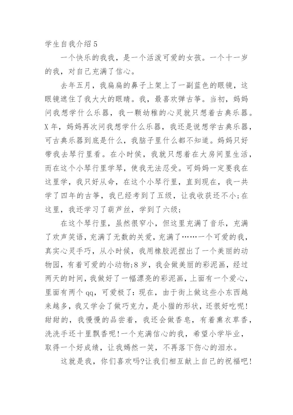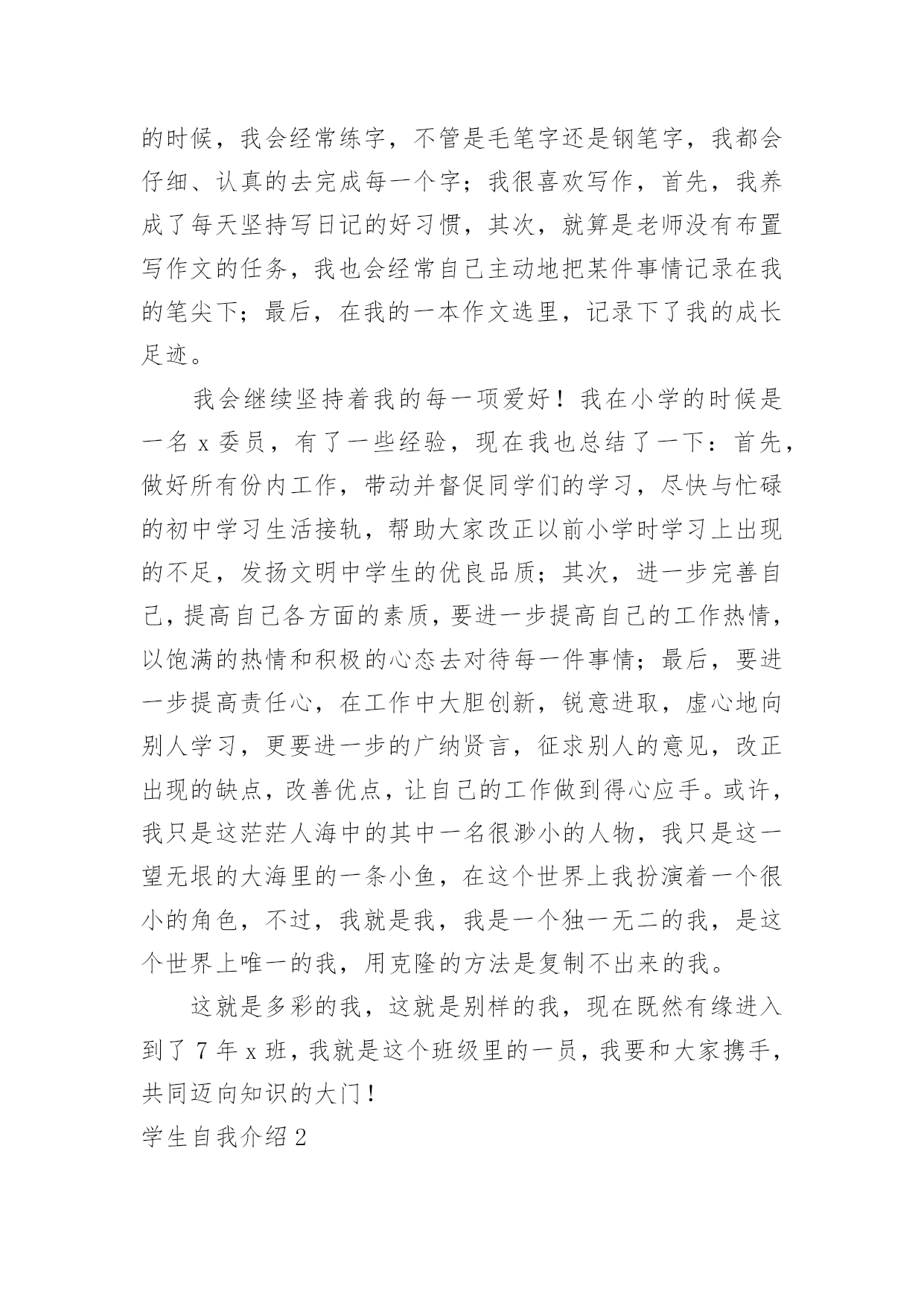学生自我介绍学生自我介绍精选15篇当进入一个陌生环境,常常要进行自我介绍,通过自我介绍可以让别人认识自己。你所见过的自我介绍是什么样的呢?下面是小编为大家整理的学生自我介绍,欢迎阅读与收藏。学生自我介绍1尊敬的老师,同学们:你们好!我叫xx,今年x岁,以前在x小学六年x班担任班里的x委员。现在我已经成为一名中学生了,对于我来说真的是一次很大的挑战,我会更加认真、努力的学习,与此同时,自己的课余生活也有待提高。我是一个全面发展的女生,我的爱好很多、兴趣很广泛:喜欢唱歌、书法、写作、绘画、弹琴、读书……我特别喜欢学习,或许有的时候有一点的失误,但是在以后的日子里我要证明我自己。我最大的缺点就是太马虎,所以我要在今后把这个毛病改掉,俗话说“金无足赤,人无完人”,人都是没有十全十美的,不过我要用我的实际行动来证明,尽管不会有十全十美,但我要尽量做到十全九美!例如:书法和写作,在家里的时候,我会经常练字,不管是毛笔字还是钢笔字,我都会仔细、认真的去完成每一个字;我很喜欢写作,首先,我养成了每天坚持写日记的好习惯,其次,就算是老师没有布置写作文的任务,我也会经常自己主动地把某件事情记录在我的笔尖下;最后,在我的一本作文选里,记录下了我的成长足迹。我会继续坚持着我的每一项爱好!我在小学的时候是一名x委员,有了一些经验,现在我也总结了一下:首先,做好所有份内工作,带动并督促同学们的学习,尽快与忙碌的初中学习生活接轨,帮助大家改正以前小学时学习上出现的不足,发扬文明中学生的优良品质;其次,进一步完善自己,提高自己各方面的素质,要进一步提高自己的工作热情,以饱满的热情和积极的心态去对待每一件事情;最后,要进一步提高责任心,在工作中大胆创新,锐意进取,虚心地向别人学习,更要进一步的广纳贤言,征求别人的意见,改正出现的缺点,改善优点,让自己的工作做到得心应手。或许,我只是这茫茫人海中的其中一名很渺小的人物,我只是这一望无垠的大海里的一条小鱼,在这个世界上我扮演着一个很小的角色,不过,我就是我,我是一个独一无二的我,是这个世界上唯一的我,用克隆的方法是复制不出来的我。这就是多彩的我,这就是别样的我,现在既然有缘进入到了7年x班,我就是这个班级里的一员,我要和大家携手,共同迈向知识的大门!学生自我介绍2大家好!我是五(4)班的顾海宁。小时候,别人说我像女孩子,文静,腼腆。没错,我总是喜欢牵着妈妈的手,安静的做自己喜欢的事情。作为班上的数学课代表,我始终认为学习是学生的第一任务,学习要有钻研,不怕难的精神,老师们都很喜欢我。当然自己学好的同时,还应该积极帮助其他同学,互帮互助才能共同进步。我有许多爱好,比如看书,下象棋,跑步。在这其中我最喜欢跑步,体育课上老师总会拉上我们围着操场跑3圈,我是获益匪浅,健康第一,只有好的身体,才能安心学习。我的优点是乐观,遇到挫折我不会气馁,不退缩,认真找出问题的原因,解决问题,绝不拖拉。我的缺点是不收拾自己的房间,我的书随处可见,学习桌上、床上、卫生间到处都是,自认为这样方便,随时可以看到书,其实不然,如果要找哪一本书,可真要费半天功夫,还是要改掉这个坏毛病,做一个做事有条理的人。这就是我,一个健康向上的小男孩,在今后的日子里,我一定努力改掉缺点,做一个名副其实的好学生。学生自我介绍3我叫xx,今年xx岁,刚上xx。我个子中等,长脸短鼻子,手大脚也大,一双眼睛不大也不小,眼珠子特别有神,一张大嘴巴特别能说,只要一说起来,说上一个小时也没问题,个子不高不矮,身体不胖不瘦。总的来说还是比较帅的。我在xx上学,我们的校服不好看,全是xx,所以特别好认,一看就是xx学生。我的优点就是爱动,每天早上我都到外面锻炼,跑跑步,玩玩单杠等,所以,我在学校的体育特别好,我的学习也是不可质疑的,数学考试从来没下过90分,我的英语也不错。所以,我的脸上总是洋溢者喜悦的表情。我的缺点就是不会打篮球,也不知到是怎么一回事,就是不喜欢,而且,我上课还总走神,不注意听讲。所以,老师叫我后,我还满有信心的站起来,百分之八十都是对的,害的老师又气又笑。这就是我,只要一见到我,我总是笑,我会热情的和你打招呼,来吧!学生自我介绍4各位尊敬的考官:上午好!我叫xx,来自于xx大学xx专业,本人性格温和、乐观、待人有礼,喜欢旅游,看书,听音乐,剪报,抄录文章,善于观察事物和写散文,对自己的事务和生活安排得有条不紊,工作认真负责,积极主动,亦勇于挑战新事物。我是xx学院20xx年毕业的学生,在校学习的专业是人力资源专业。除了专业知识之外,我能够熟练运用电脑办公软件,已取得英语六级,驾照,会计上岗证等技能证书,并通过了人力资源师三级的考试。性格开朗、乐于与人沟通,拥有较强的适应能力,并具有良好的身体素质。与同学相处和睦融洽,乐于助人,对工作认真负责,注重团队合作。
