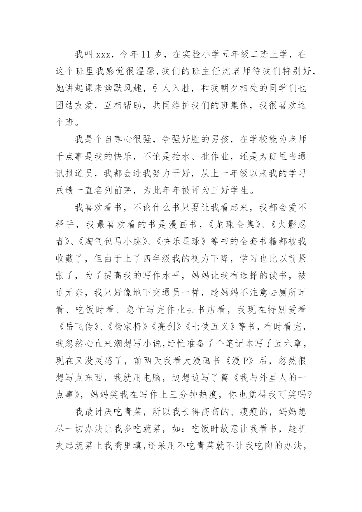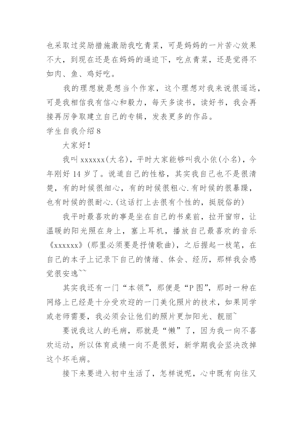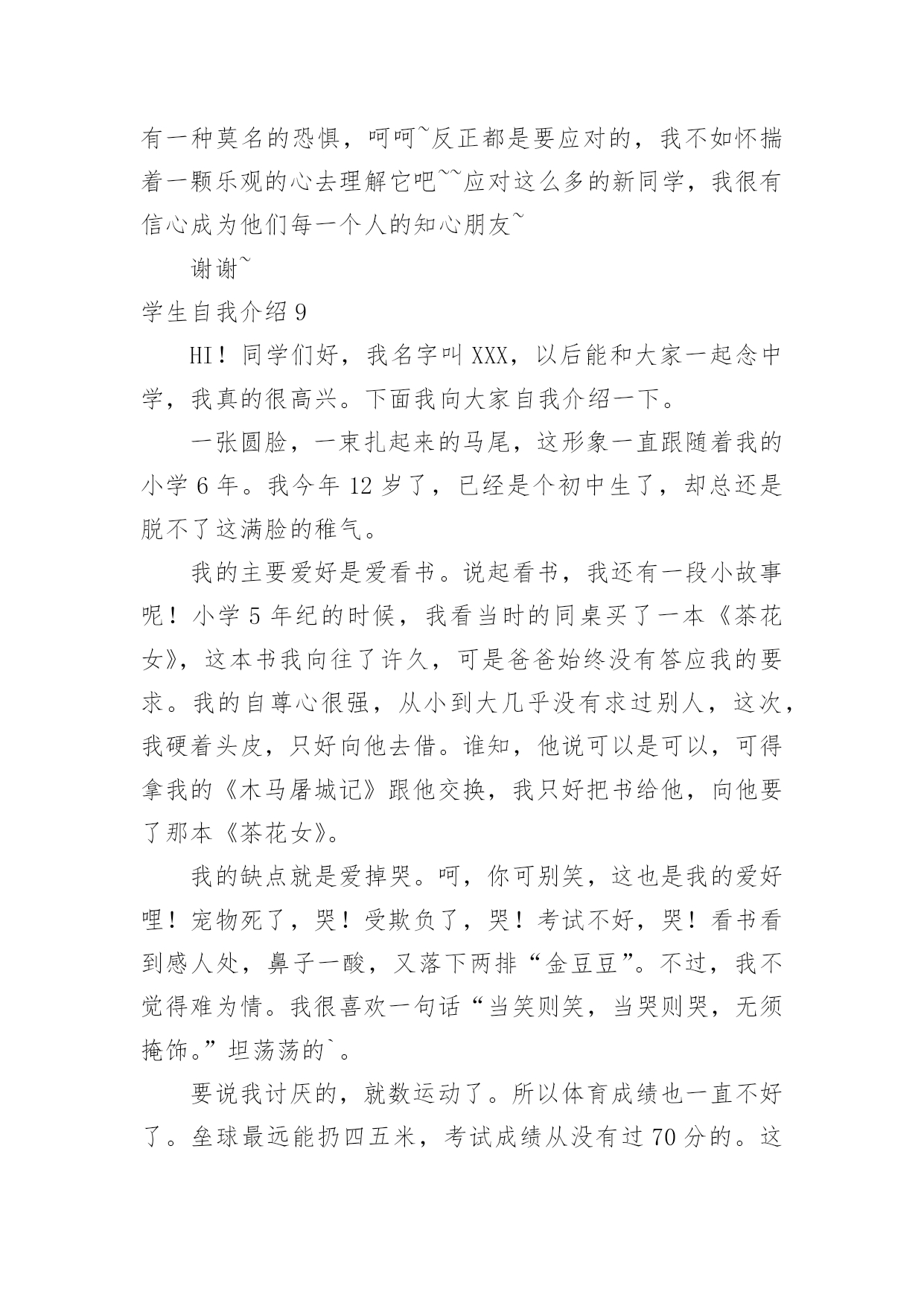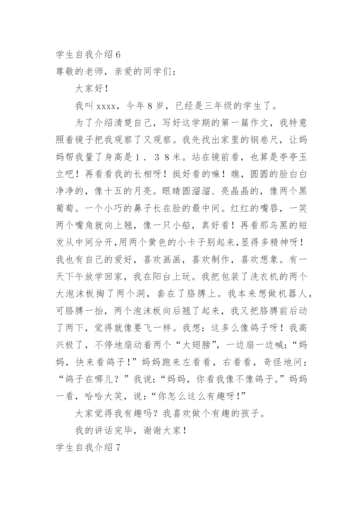 学生自我介绍学生自我介绍精选15篇当进入一个陌生环境,常常要进行自我介绍,通过自我介绍可以让别人认识自己。你所见过的自我介绍是什么样的呢?下面是小编为大家整理的学生自我介绍,欢迎阅读与收藏。学生自我介绍1尊敬的老师,同学们:你们好!我叫xx,今年x岁,以前在x小学六年x班担任班里的x委员。现在我已经成为一名中学生了,对于我来说真的是一次很大的挑战,我会更加认真、努力的学习,与此同时,自己的课余生活也有待提高。我是一个全面发展的女生,我的爱好很多、兴趣很广泛:喜欢唱歌、书法、写作、绘画、弹琴、读书……我特别喜欢学习,或许有的时候有一点的失误,但是在以后的日子里我要证明我自己。我最大的缺点就是太马虎,所以我要在今后把这个毛病改掉,俗话说“金无足赤,人无完人”,人都是没有十全十美的,不过我要用我的实际行动来证明,尽管不会有十全十美,但我要尽量做到十全九美!例如:书法和写作,在家里的时候,我会经常练字,不管是毛笔字还是钢笔字,我都会仔细、认真的去完成每一个字;我很喜欢写作,首先,我养成了每天坚持写日记的好习惯,其次,就算是老师没有布置写作文的任务,我也会经常自己主动地把某件事情记录在我的笔尖下;最后,在我的一本作文选里,记录下了我的成长足迹。我会继续坚持着我的每一项爱好!我在小学的时候是一名x委员,有了一些经验,现在我也总结了一下:首先,做好所有份内工作,带动并督促同学们的学习,尽快与忙碌的初中学习生活接轨,帮助大家改正以前小学时学习上出现的不足,发扬文明中学生的优良品质;其次,进一步完善自己,提高自己各方面的素质,要进一步提高自己的工作热情,以饱满的热情和积极的心态去对待每一件事情;最后,要进一步提高责任心,在工作中大胆创新,锐意进取,虚心地向别人学习,更要进一步的广纳贤言,征求别人的意见,改正出现的缺点,改善优点,让自己的工作做到得心应手。或许,我只是这茫茫人海中的其中一名很渺小的人物,我只是这一望无垠的大海里的一条小鱼,在这个世界上我扮演着一个很小的角色,不过,我就是我,我是一个独一无二的我,是这个世界上唯一的我,用克隆的方法是复制不出来的我。这就是多彩的我,这就是别样的我,现在既然有缘进入到了7年x班,我就是这个班级里的一员,我要和大家携手,共同迈向知识的大门!学生自我介绍2大家好!我是五(4)班的顾海宁。小时候,别人说我像女孩子,文静,腼腆。没错,我总是喜欢牵着妈妈的手,安静的做自己喜欢的事情。作为班上的数学课代表,我始终认为学习是学生的第一任务,学习要有钻研,不怕难的精神,老师们都很喜欢我。当然自己学好的同时,还应该积极帮助其他同学,互帮互助才能共同进步。我有许多爱好,比如看书,下象棋,跑步。在这其中我最喜欢跑步,体育课上老师总会拉上我们围着操场跑3圈,我是获益匪浅,健康第一,只有好的身体,才能安心学习。我的优点是乐观,遇到挫折我不会气馁,不退缩,认真找出问题的原因,解决问题,绝不拖拉。我的缺点是不收拾自己的房间,我的书随处可见,学习桌上、床上、卫生间到处都是,自认为这样方便,随时可以看到书,其实不然,如果要找哪一本书,可真要费半天功夫,还是要改掉这个坏毛病,做一个做事有条理的人。这就是我,一个健康向上的小男孩,在今后的日子里,我一定努力改掉缺点,做一个名副其实的好学生。学生自我介绍3我叫xx,今年xx岁,刚上xx。我个子中等,长脸短鼻子,手大脚也大,一双眼睛不大也不小,眼珠子特别有神,一张大嘴巴特别能说,只要一说起来,说上一个小时也没问题,个子不高不矮,身体不胖不瘦。总的来说还是比较帅的。我在xx上学,我们的校服不好看,全是xx,所以特别好认,一看就是xx学生。我的优点就是爱动,每天早上我都到外面锻炼,跑跑步,玩玩单杠等,所以,我在学校的体育特别好,我的学习也是不可质疑的,数学考试从来没下过90分,我的英语也不错。所以,我的脸上总是洋溢者喜悦的表情。我的缺点就是不会打篮球,也不知到是怎么一回事,就是不喜欢,而且,我上课还总走神,不注意听讲。所以,老师叫我后,我还满有信心的站起来,百分之八十都是对的,害的老师又气又笑。这就是我,只要一见到我,我总是笑,我会热情的和你打招呼,来吧!学生自我介绍4各位尊敬的考官:上午好!我叫xx,来自于xx大学xx专业,本人性格温和、乐观、待人有礼,喜欢旅游,看书,听音乐,剪报,抄录文章,善于观察事物和写散文,对自己的事务和生活安排得有条不紊,工作认真负责,积极主动,亦勇于挑战新事物。我是xx学院20xx年毕业的学生,在校学习的专业是人力资源专业。除了专业知识之外,我能够熟练运用电脑办公软件,已取得英语六级,驾照,会计上岗证等技能证书,并通过了人力资源师三级的考试。性格开朗、乐于与人沟通,拥有较强的适应能力,并具有良好的身体素质。与同学相处和睦融洽,乐于助人,对工作认真负责,注重团队合作。