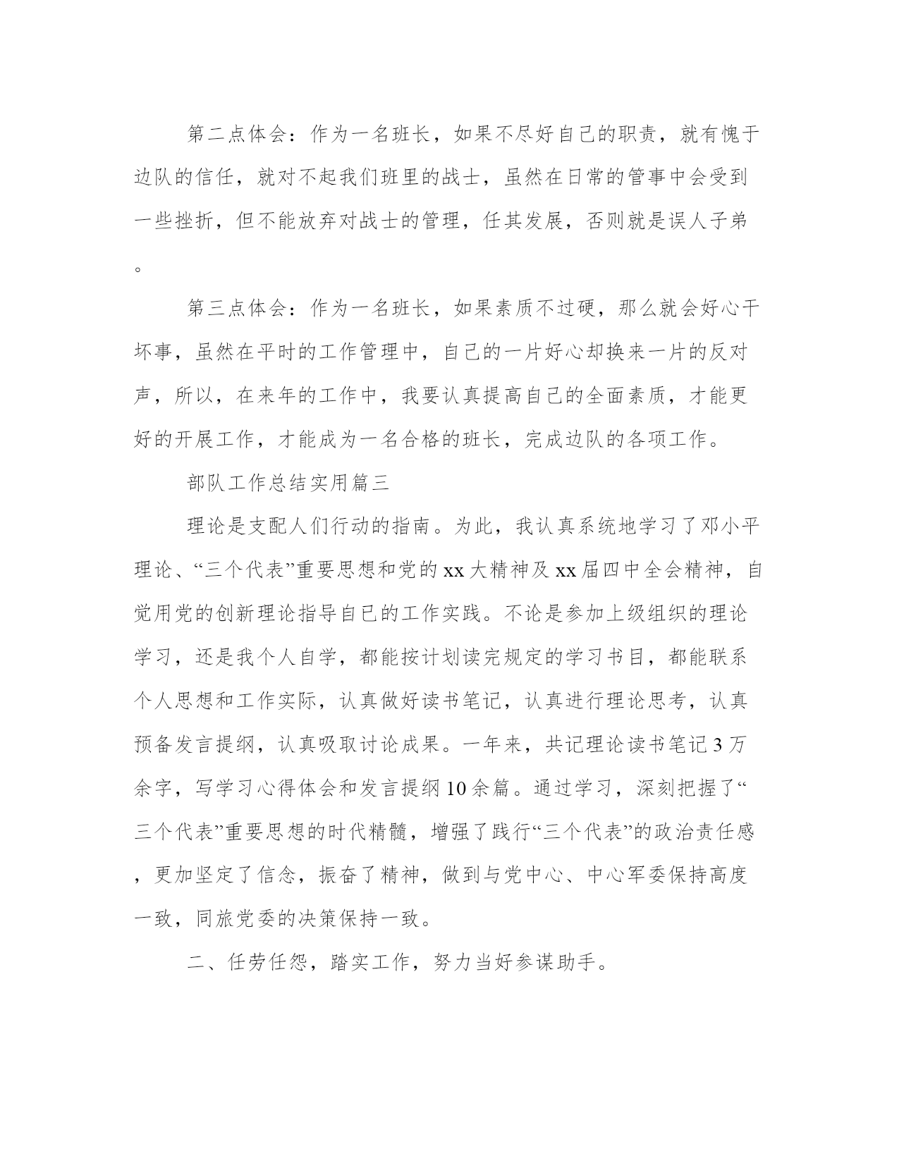 部队工作总结实用部队工作总结(汇总14篇)总结是指对某一阶段的工作、学习或思想中的经验或情况加以总结和概括的书面材料,它可以明确下一步的工作方向,少走弯路,少犯错误,提高工作效益,因此,让我们写一份总结吧。那么,我们该怎么写总结呢?下面是小编为大家带来的总结书优秀范文,希望大家可以喜欢。部队工作总结实用篇一今年以来,在直属队党委的正确引导以及机关业务科的详细赞助下,我和营党委班子其它成员一起,率领全营官兵认真完成了新年度工作计划、新兵训练、专业训练展开和日常保险管理等工作。在这半年的一百多个日昼夜夜里,在广大官兵的支撑辅助下,全营以军事训练为核心的各项工作,能按年初营党委提出的总体目的,得到健康稳步发展,美满完成了上级赋予咱们的各项任务,全营内外关系顺畅,完成任务杰出,部队平安稳固。回想这年来的工作,虽然工作上获得了必定的成就,但也有不尽人如意之处,下面我就将半年来的履职司责情况向同志们作一汇报,敬请大家批驳和监视。一、所做的重要工作和好的方面。(一)、认真抓好了以贯彻落实训练纲要为主线的军事训练工作,全营的整体训练程度有所提高。今年我师将参加总部军事训练一级师达标考评,训练任务要求高,任务重,固然去年营对新大纲划定的一些新增课目作了一些探索,但全营的训练基础仍不是十分扎实,作为营主管训练的负责人,身感责任的重大,因此,在这年,自已始终能将军事训练摆在各项工作的首位,不断强化中情意识,扎实打牢官兵的训练基本。一是认真学习分析提纲和年度训练任务,科学制订年度训练打算。在去年系统学习训练大纲的基础上,为了更好地落实好年度训练,从去年迈兵一退伍,自己就抽时间对大纲内容及年初业务科下发的年度训练任务进行认真地学习分析,进一步吃透其精力本质,加深对训练任务的懂得,在此基础上依据年度军事训练部署和大纲的请求,在对前几年营训练情况进行认真剖析的基础上,组织三个连队局部干部对大纲内容进行研讨,科学谋划新年度训练规划,做到迷信公道,操作性强,确保部队一开训就步入了按纲施训的正确轨道。二是严厉按纲施训,狠抓训练规范。开训当前,能严格按计划抓好训练落实,杜绝了偏训、漏训,到目前为止,三个连队均能严格按方案展开训练,训练品质也有很大的提高。三是器重抓好警官、士官练习。为了认真贯彻落实大纲领求,进一步提高警官、士官的组训能力和整体素质,今年以来,营十分看重抓好警官士官训练,通过压担子、教方法、集训观摩等情势,彼此扬长避短,警官训练自觉性高,较好地保持了体能集中训练,理论学习轨制,当初自觉学习分析军事理论和业务技巧的良好风尚正在警官步队中逐渐构成;同时根据营士官队伍人数多,但又绝对缺少培训机遇的情形,为了提高广大士官的组训能力和综合素质,营从四月开端至六月中旬,组织了一期为期两个月的士官素质培训,由部门教学才能强,素质过硬的副连以上干部担负教养任务,通过学习基础知识,组训带兵根本办法,组织教学法观摩等形式,使宽大士官较为体系地控制了管理和组训的基础方法,为平时发展工作组织训练打下了较好的基础。四是加强对训练的指导。专业训练开展后,为了扎实落实全体训练内容,顺利完成年度训练任务,自已不仅能按筹划把握全营的训练进度,同时也常常和几位连长一起就训练中的一些问题进行探讨和分析。虽然上半年部队的其它一些工作较多,或多或少影响了自己抓训练的部分精神,但仍是能时常深入训练场检讨训练情况,不仅只是给部属压任务,安排训练,还能利用自己以前在院校及连队任职期间学习和积聚的一些方法、经验,和广大官兵一起解决训练中的一些详细问题,使部队训练进入了良性发展的轨道,训练水平有显明提高。(二)、狠抓了常常性治理工作落实,营队标准化水平有所进步。一是坚持抓好一日生活制度的落实。按条令要求,规范了从起床到熄灯的日常制度落实,按职责要求,监督检查连队按条令办事,重点改正了中午午休时间和晚上熄灯后少数职员加班搞训练的问题,一日生活制度得到了较好的落实,生涯秩序逐步走向正规。二是重视抓好风格造就和人员管控。从人员警容、礼仪礼貌、请销假等小事抓起,规范官兵言行,培养良好作风,尤其是在防治非典期间,能严格人员把持,认真落实上级的各项规定要求,自己也能模范带头,从四月二旬日到现在,未去过一趟丁山、宜兴,全营官兵纪律观点强,都能认真自觉履行规定唆使,到目前为止,未产生一起违背纪律的现象。三是以规范各类值班值勤为打破口,强化各级人员的职责意识。今年以来,为了进一步加强营队的正规化建设,从年初一开始,就认真抓了营连值班员、连值日员、厨房值班员、等各级值班值勤人员履职司责情况,同时借助四月份师召开的正规化管理现场会,营又对大门哨兵、夜间哨兵进行了进一步规范,通过营连教导要求,现在各级值班员都能认真履行职责,做到职责明白,按时交接,大门哨兵和夜哨,姿势端正、警戒性高,并以此为冲破口