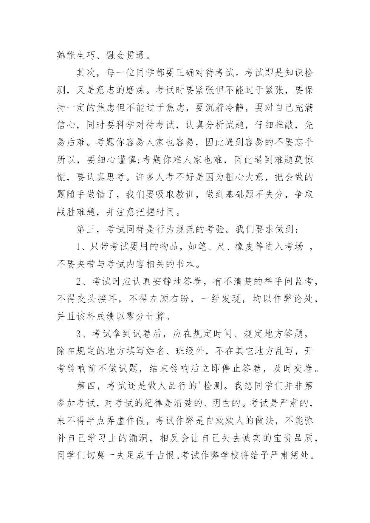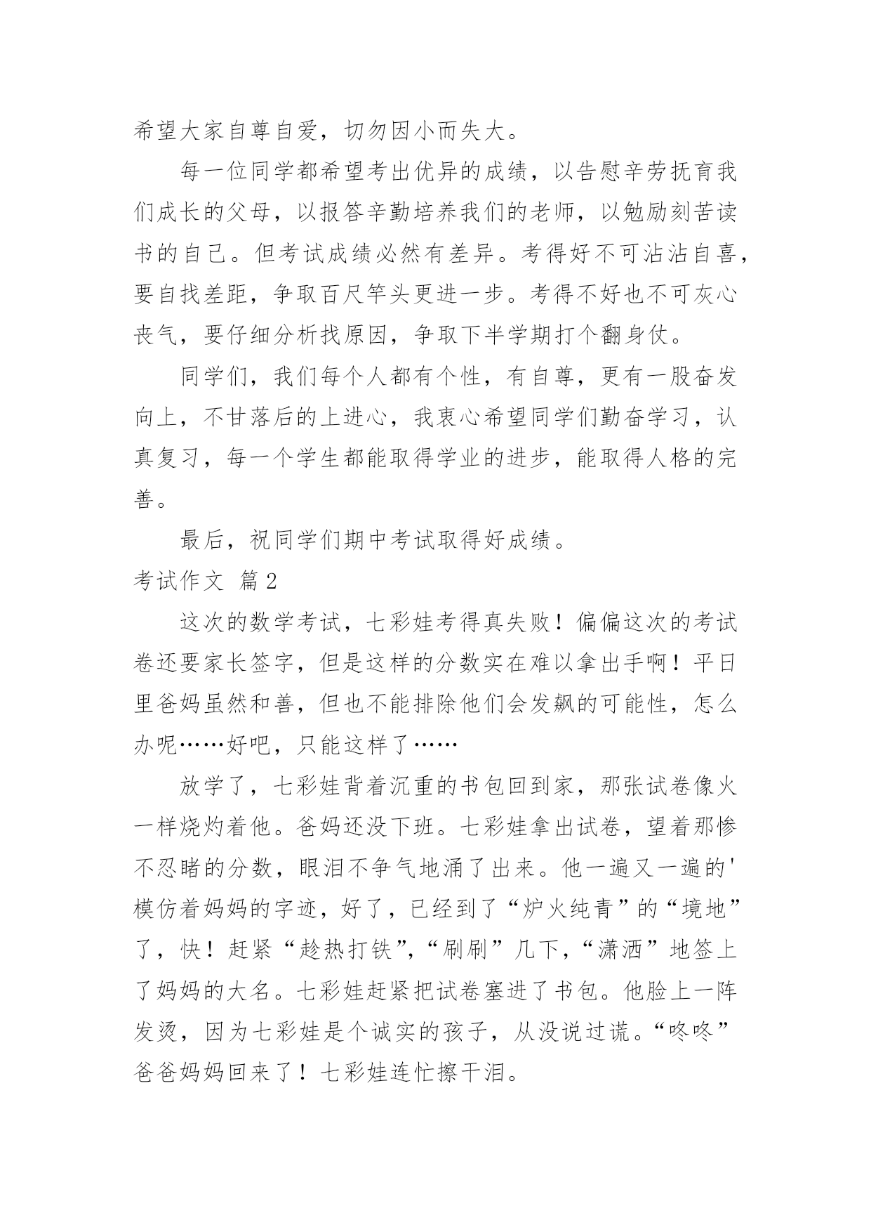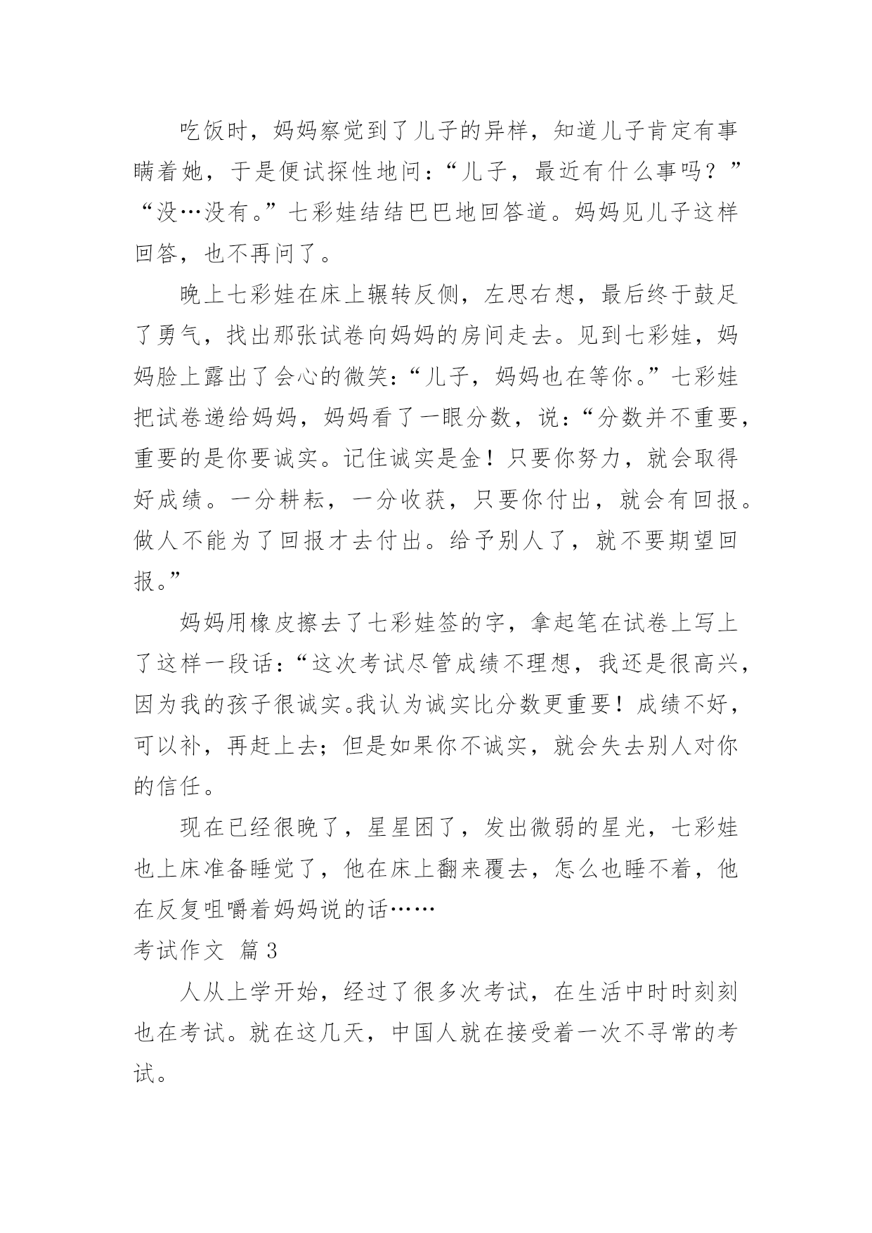 考试作文实用的考试作文大全(3篇)在日常学习、工作抑或是生活中,大家都经常接触到作文吧,作文一定要做到主题集中,围绕同一主题作深入阐述,切忌东拉西扯,主题涣散甚至无主题。那么你有了解过作文吗?下面是小编收集整理的考试作文3篇,欢迎大家分享。考试作文篇1考试,作为教学评价的一种手段,其作用除对学生基础知识和基本技能进行考查之外,就是通过考试让教师了解学生掌握知识的总体情况,为老师教学方法的改进,教学措施的调整,教学策略的制定和实施,提供全面的客观的依据。因此,严肃考风考纪,确保考试过程和考试结果的公平公证,确保考试的权威性和可信性,是学校教学常规管理和维护教学秩序的需要。而且,同学们通过考试,对自己的学习情况有一个理性的认识,促使自己巩固所学知识,技能,从学习结果的反馈中,及时获得矫正信息,调整自己今后的学习,包括学科平衡,查漏补缺,学习态度和方法。因此,每一个学生都必须以认真、严肃、负责的态度对待期中考试。首先,我们每个学生要重视考前的复习。孔子说:“温习而知新”,就是告诉我们学习要重视复习,一个成绩优秀的学生肯定是肯吃苦,肯钻研认真复习并掌握科学的学习方法的人。所以希望每一位同学能够在老师的指导下,把所学的知识认真整理、归类,并全面系统地进行复习,争取做到熟能生巧、融会贯通。其次,每一位同学都要正确对待考试。考试即是知识检测,又是意志的磨炼。考试时要紧张但不能过于紧张,要保持一定的焦虑但不能过于焦虑,要沉着冷静,要对自己充满信心,同时要科学对待考试,认真分析试题,仔细推敲,先易后难。考题你容易人家也容易,因此遇到容易的不要忘乎所以,要细心谨慎;考题你难人家也难,因此遇到难题莫惊慌,要认真思考。许多人考不好是因为粗心大意,把会做的题随手做错了,我们要吸取教训,做到基础题不失分,争取战胜难题,并注意把握时间。第三,考试同样是行为规范的考验。我们要求做到:1、只带考试要用的物品,如笔、尺、橡皮等进入考场,不要夹带与考试内容相关的书本。2、考试时应认真安静地答卷,有不清楚的举手问监考,不得交头接耳,不得左顾右盼,一经发现,均以作弊论处,并且该科成绩以零分计算。3、考试拿到试卷后,应在规定时间、规定地方答题,除在规定的地方填写姓名、班级外,不在其它地方乱写,开考铃响前不做试题,结束铃响后立即停止答卷,及时交卷。第四,考试还是做人品行的'检测。我想同学们并非第参加考试,对考试的纪律是清楚的、明白的。考试是严肃的,来不得半点弄虚作假,考试作弊是自欺欺人的做法,不能弥补自己学习上的漏洞,相反会让自己失去诚实的宝贵品质,同学们切莫一失足成千古恨。考试作弊学校将给予严肃惩处。希望大家自尊自爱,切勿因小而失大。每一位同学都希望考出优异的成绩,以告慰辛劳抚育我们成长的父母,以报答辛勤培养我们的老师,以勉励刻苦读书的自己。但考试成绩必然有差异。考得好不可沾沾自喜,要自找差距,争取百尺竿头更进一步。考得不好也不可灰心丧气,要仔细分析找原因,争取下半学期打个翻身仗。同学们,我们每个人都有个性,有自尊,更有一股奋发向上,不甘落后的上进心,我衷心希望同学们勤奋学习,认真复习,每一个学生都能取得学业的进步,能取得人格的完善。最后,祝同学们期中考试取得好成绩。考试作文篇2这次的数学考试,七彩娃考得真失败!偏偏这次的考试卷还要家长签字,但是这样的分数实在难以拿出手啊!平日里爸妈虽然和善,但也不能排除他们会发飙的可能性,怎么办呢……好吧,只能这样了……放学了,七彩娃背着沉重的书包回到家,那张试卷像火一样烧灼着他。爸妈还没下班。七彩娃拿出试卷,望着那惨不忍睹的分数,眼泪不争气地涌了出来。他一遍又一遍的'模仿着妈妈的字迹,好了,已经到了“炉火纯青”的“境地”了,快!赶紧“趁热打铁”,“刷刷”几下,“潇洒”地签上了妈妈的大名。七彩娃赶紧把试卷塞进了书包。他脸上一阵发烫,因为七彩娃是个诚实的孩子,从没说过谎。“咚咚”爸爸妈妈回来了!七彩娃连忙擦干泪。吃饭时,妈妈察觉到了儿子的异样,知道儿子肯定有事瞒着她,于是便试探性地问:“儿子,最近有什么事吗?”“没…没有。”七彩娃结结巴巴地回答道。妈妈见儿子这样回答,也不再问了。晚上七彩娃在床上辗转反侧,左思右想,最后终于鼓足了勇气,找出那张试卷向妈妈的房间走去。见到七彩娃,妈妈脸上露出了会心的微笑:“儿子,妈妈也在等你。”七彩娃把试卷递给妈妈,妈妈看了一眼分数,说:“分数并不重要,重要的是你要诚实。记住诚实是金!只要你努力,就会取得好成绩。一分耕耘,一分收获,只要你付出,就会有回报。做人不能为了回报才去付出。给予别人了,就不要期望回报。”妈妈用橡皮擦去了七彩娃签的字,拿起笔在试卷上写上了这样一段话:“这次考试尽管成绩不理想,我还是很高兴,因为我的孩子很诚实。我认为诚实比分数更重要!成绩不好,可以补,再赶上去;但是如果你不诚实,就会