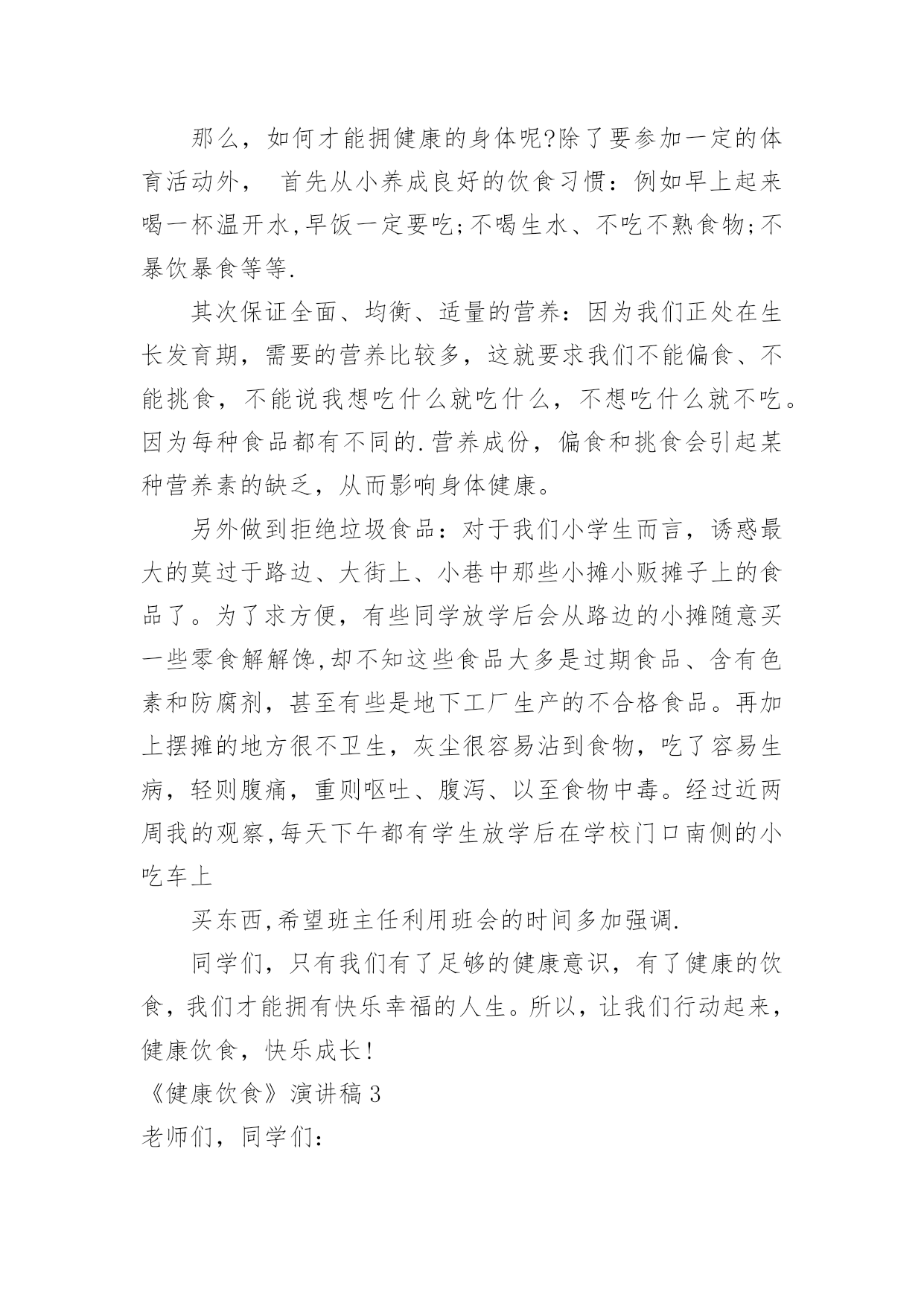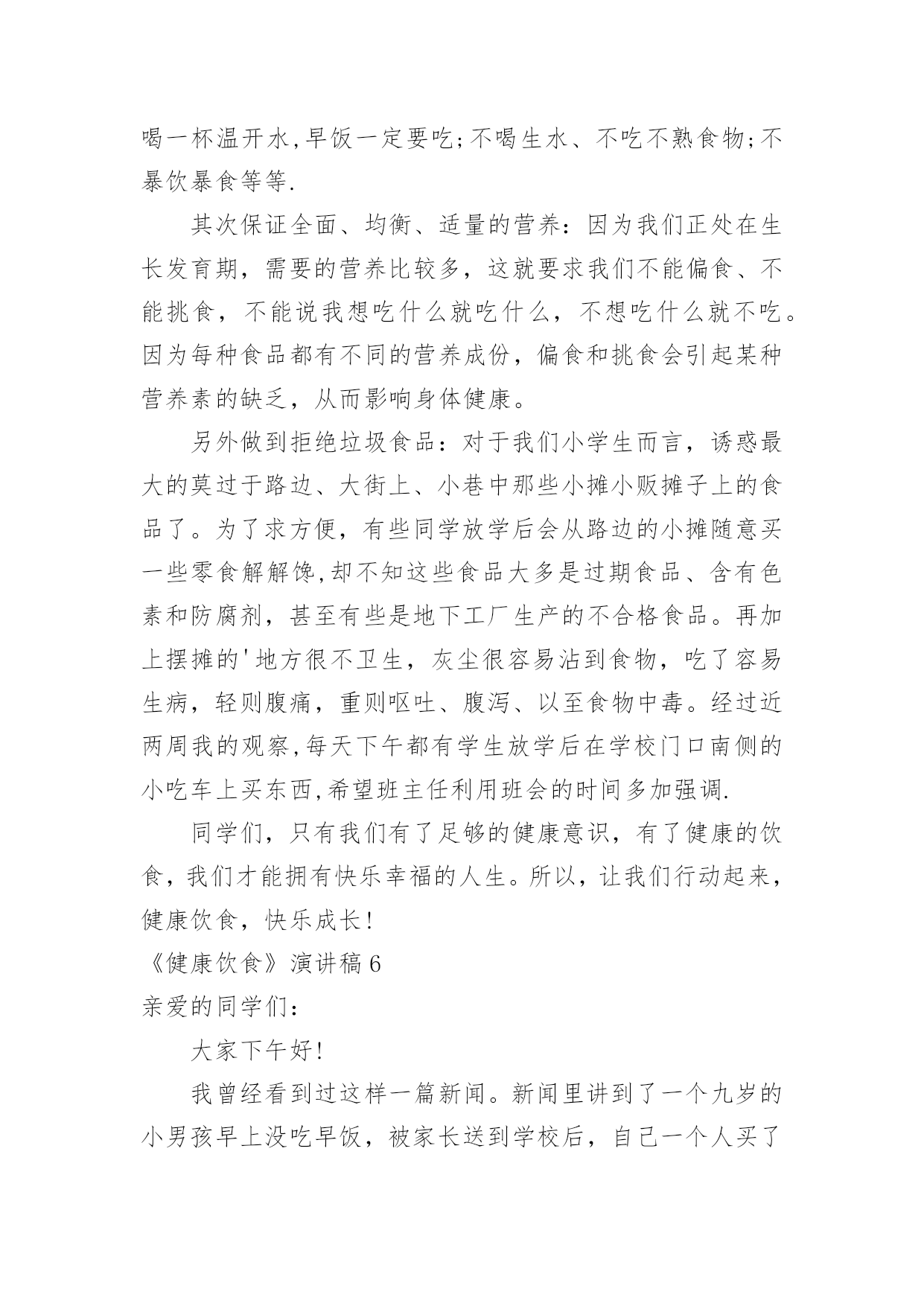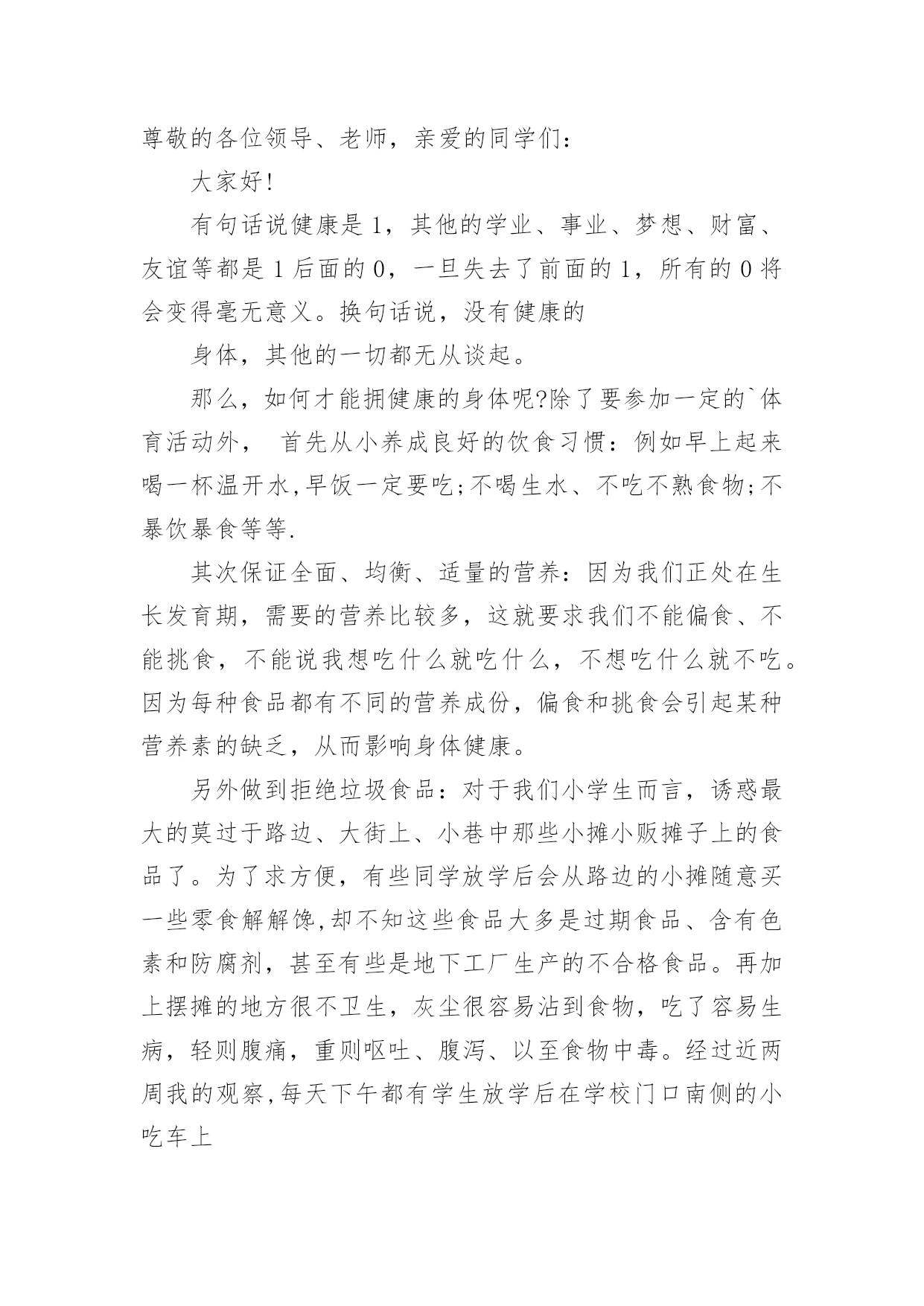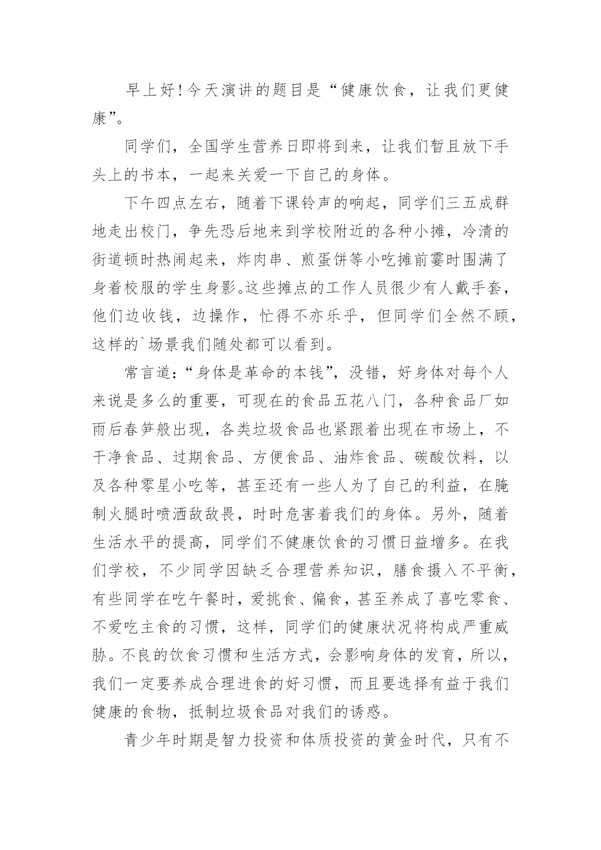 《健康饮食》演讲稿《健康饮食》演讲稿演讲稿的内容要根据具体情境、具体场合来确定,要求情感真实,尊重观众。在充满活力,日益开放的今天,演讲稿的使用频率越来越高,大家知道演讲稿的格式吗?下面是小编精心整理的《健康饮食》演讲稿,希望对大家有所帮助。《健康饮食》演讲稿1老师们,同学们:早上好!今天演讲的题目是“健康饮食,让我们更健康”。同学们,全国学生营养日即将到来,让我们暂且放下手头上的书本,一起来关爱一下自己的身体。下午四点左右,随着下课铃声的响起,同学们三五成群地走出校门,争先恐后地来到学校附近的各种小摊,冷清的街道顿时热闹起来,炸肉串、煎蛋饼等小吃摊前霎时围满了身着校服的学生身影。这些摊点的工作人员很少有人戴手套,他们边收钱,边操作,忙得不亦乐乎,但同学们全然不顾,这样的场景我们随处都可以看到。常言道:“身体是革命的本钱”,没错,好身体对每个人来说是多么的重要,可现在的食品五花八门,各种食品厂如雨后春笋般出现,各类垃圾食品也紧跟着出现在市场上,不干净食品、过期食品、方便食品、油炸食品、碳酸饮料,以及各种零星小吃等,甚至还有一些人为了自己的利益,在腌制火腿时喷洒敌敌畏,时时危害着我们的身体。另外,随着生活水平的'提高,同学们不健康饮食的习惯日益增多。在我们学校,不少同学因缺乏合理营养知识,膳食摄入不平衡,有些同学在吃午餐时,爱挑食、偏食,甚至养成了喜吃零食、不爱吃主食的习惯,这样,同学们的健康状况将构成严重威胁。不良的饮食习惯和生活方式,会影响身体的发育,所以,我们一定要养成合理进食的好习惯,而且要选择有益于我们健康的食物,抵制垃圾食品对我们的诱惑。青少年时期是智力投资和体质投资的黄金时代,只有不误“天时”,才能生长发育完好、体质健壮、思维敏捷、健康成长。最后,我们编个口诀和同学们共勉:“管好嘴,不贪食。多喝开水,少吃零食。经常锻炼,关爱身体。重视三餐,平衡饮食。”我的讲话到此结束,谢谢大家!《健康饮食》演讲稿2尊敬的各位领导、老师,亲爱的同学们:大家好!有句话说健康是1,其他的学业、事业、梦想、财富、友谊等都是1后面的0,一旦失去了前面的1,所有的0将会变得毫无意义。换句话说,没有健康的身体,其他的一切都无从谈起。那么,如何才能拥健康的身体呢?除了要参加一定的体育活动外,首先从小养成良好的饮食习惯:例如早上起来喝一杯温开水,早饭一定要吃;不喝生水、不吃不熟食物;不暴饮暴食等等.其次保证全面、均衡、适量的营养:因为我们正处在生长发育期,需要的营养比较多,这就要求我们不能偏食、不能挑食,不能说我想吃什么就吃什么,不想吃什么就不吃。因为每种食品都有不同的.营养成份,偏食和挑食会引起某种营养素的缺乏,从而影响身体健康。另外做到拒绝垃圾食品:对于我们小学生而言,诱惑最大的莫过于路边、大街上、小巷中那些小摊小贩摊子上的食品了。为了求方便,有些同学放学后会从路边的小摊随意买一些零食解解馋,却不知这些食品大多是过期食品、含有色素和防腐剂,甚至有些是地下工厂生产的不合格食品。再加上摆摊的地方很不卫生,灰尘很容易沾到食物,吃了容易生病,轻则腹痛,重则呕吐、腹泻、以至食物中毒。经过近两周我的观察,每天下午都有学生放学后在学校门口南侧的小吃车上买东西,希望班主任利用班会的时间多加强调.同学们,只有我们有了足够的健康意识,有了健康的饮食,我们才能拥有快乐幸福的人生。所以,让我们行动起来,健康饮食,快乐成长!《健康饮食》演讲稿3老师们,同学们:早上好!今天演讲的题目是“健康饮食,让我们更健康”。同学们,全国学生营养日即将到来,让我们暂且放下手头上的书本,一起来关爱一下自己的身体。下午四点左右,随着下课铃声的响起,同学们三五成群地走出校门,争先恐后地来到学校附近的各种小摊,冷清的街道顿时热闹起来,炸肉串、煎蛋饼等小吃摊前霎时围满了身着校服的学生身影。这些摊点的工作人员很少有人戴手套,他们边收钱,边操作,忙得不亦乐乎,但同学们全然不顾,这样的`场景我们随处都可以看到。常言道:“身体是革命的本钱”,没错,好身体对每个人来说是多么的重要,可现在的食品五花八门,各种食品厂如雨后春笋般出现,各类垃圾食品也紧跟着出现在市场上,不干净食品、过期食品、方便食品、油炸食品、碳酸饮料,以及各种零星小吃等,甚至还有一些人为了自己的利益,在腌制火腿时喷洒敌敌畏,时时危害着我们的身体。另外,随着生活水平的提高,同学们不健康饮食的习惯日益增多。在我们学校,不少同学因缺乏合理营养知识,膳食摄入不平衡,有些同学在吃午餐时,爱挑食、偏食,甚至养成了喜吃零食、不爱吃主食的习惯,这样,同学们的健康状况将构成严重威胁。不良的饮食习惯和生活方式,会影响身体的发育,所以,我们一定要养成合理进食的好习惯,而且要选择有益于我们健康的食物,抵制垃圾食品对我们的诱惑。青少年时期是智力投资和体质投资的黄金