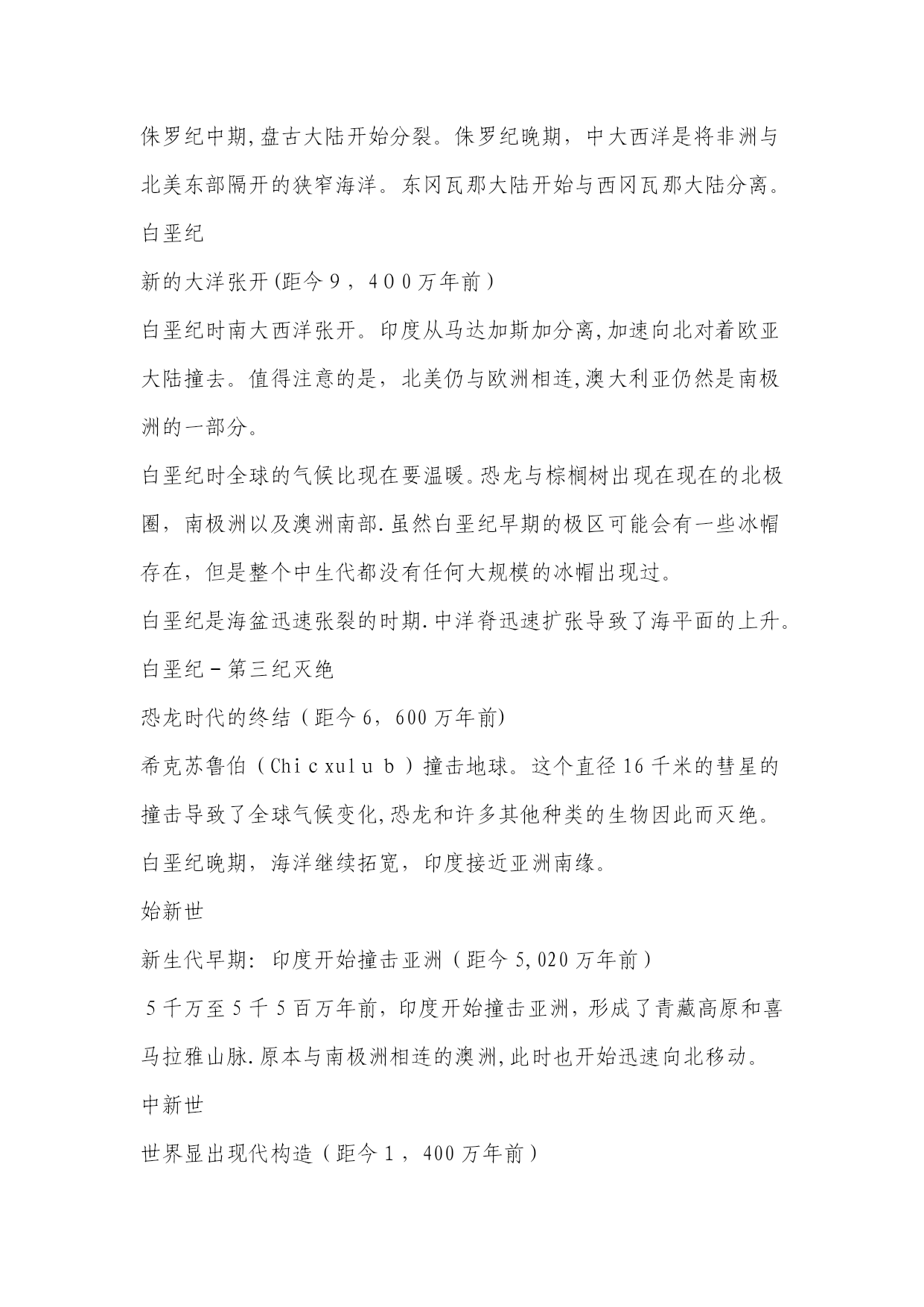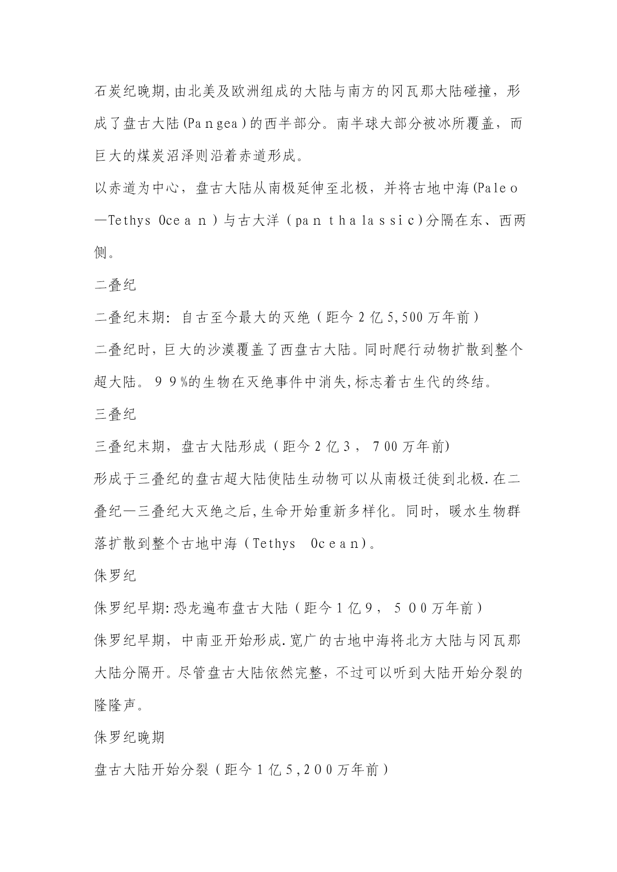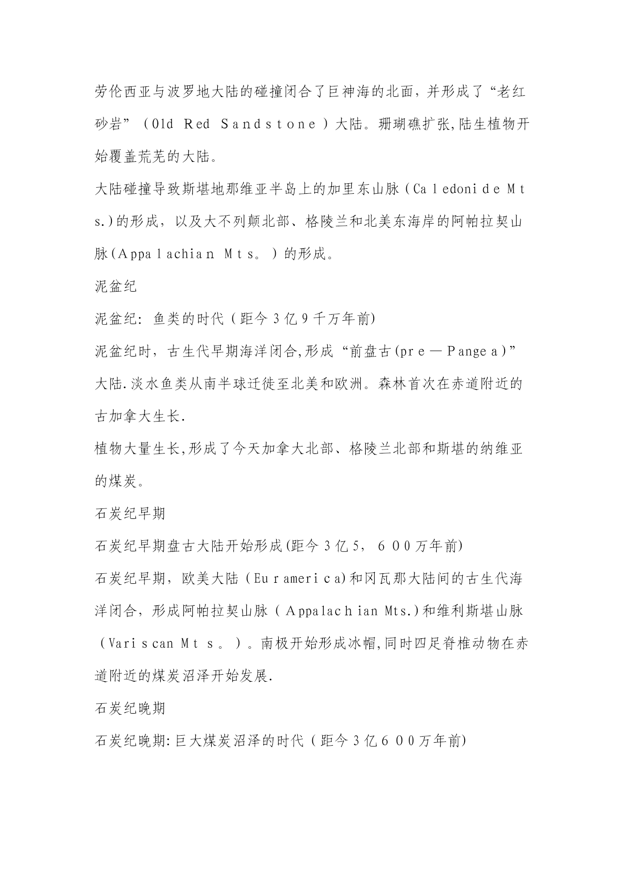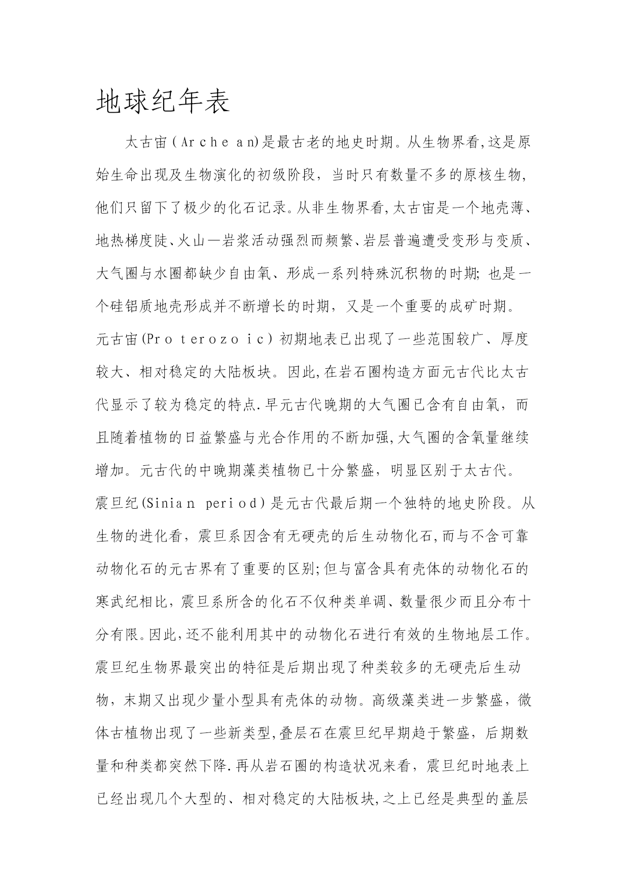 地球纪年表(完整资料)(可以直接使用,可编辑优秀版资料,欢迎下载)地球纪年表太古宙(Archean)是最古老的地史时期。从生物界看,这是原始生命出现及生物演化的初级阶段,当时只有数量不多的原核生物,他们只留下了极少的化石记录。从非生物界看,太古宙是一个地壳薄、地热梯度陡、火山—岩浆活动强烈而频繁、岩层普遍遭受变形与变质、大气圈与水圈都缺少自由氧、形成一系列特殊沉积物的时期;也是一个硅铝质地壳形成并不断增长的时期,又是一个重要的成矿时期。元古宙(Proterozoic)初期地表已出现了一些范围较广、厚度较大、相对稳定的大陆板块。因此,在岩石圈构造方面元古代比太古代显示了较为稳定的特点.早元古代晚期的大气圈已含有自由氧,而且随着植物的日益繁盛与光合作用的不断加强,大气圈的含氧量继续增加。元古代的中晚期藻类植物已十分繁盛,明显区别于太古代。震旦纪(Sinianperiod)是元古代最后期一个独特的地史阶段。从生物的进化看,震旦系因含有无硬壳的后生动物化石,而与不含可靠动物化石的元古界有了重要的区别;但与富含具有壳体的动物化石的寒武纪相比,震旦系所含的化石不仅种类单调、数量很少而且分布十分有限。因此,还不能利用其中的动物化石进行有效的生物地层工作。震旦纪生物界最突出的特征是后期出现了种类较多的无硬壳后生动物,末期又出现少量小型具有壳体的动物。高级藻类进一步繁盛,微体古植物出现了一些新类型,叠层石在震旦纪早期趋于繁盛,后期数量和种类都突然下降.再从岩石圈的构造状况来看,震旦纪时地表上已经出现几个大型的、相对稳定的大陆板块,之上已经是典型的盖层沉积,与古生界相似。因此,震旦纪可以被认为是元古代与古生代之间的一个过渡阶段。1前寒武纪2寒武纪3奥陶纪4志留纪5泥盆纪6石炭纪早期7石炭纪晚期8二叠纪9三叠纪10侏罗纪11侏罗纪晚期12白垩纪13白垩纪-第三纪灭绝14始新世15中新世16冰川时代晚期17现代世界18未来世界191。5亿年后202。5亿年后前寒武纪前寒武纪晚期超大陆和“冰室”世界(距今6亿5千万年前)形成于11亿年前的罗迪尼亚超大陆这时开始分裂。前寒武纪晚期的世界与现在的气候十分相近,是一个“冰室”世界。罗迪尼亚大约在7.5亿年前分裂成两半,形成了古大洋寒武纪:古生代的开始(距今5亿1,400万年前)具有硬壳的生物在寒武纪第一次大量出现。诸大陆为浅海所泛滥。超大陆冈瓦那开始在南极附近形成。巨神海(IapetusOcean)在劳伦西亚(Laurentia,北美)、波罗地(Baltica,北欧)和西伯利亚(Siberia)这几个古大陆之间扩张。奥陶纪古海洋隔开诸大陆(距今4亿5,800万年前)奥陶纪时,古海洋分隔开劳伦西亚、波罗地、西伯利亚和冈瓦那大陆。奥陶纪末期是地球历史上最寒冷的时期之一。冈瓦那大陆的南方完全为冰所覆盖。巨神海(IapetusOcean)隔开了波罗地和西伯利亚大陆,古地中海(Paleo-TeyhysOcean)分隔开冈瓦那大陆、波罗地和西伯利亚大陆,古大洋(PanthalassicOcean)则覆盖了北半球的大部分.志留纪古生代海洋闭合,诸大陆开始碰撞(距今4亿2,500万年前)劳伦西亚与波罗地大陆的碰撞闭合了巨神海的北面,并形成了“老红砂岩”(OldRedSandstone)大陆。珊瑚礁扩张,陆生植物开始覆盖荒芜的大陆。大陆碰撞导致斯堪地那维亚半岛上的加里东山脉(CaledonideMts.)的形成,以及大不列颠北部、格陵兰和北美东海岸的阿帕拉契山脉(AppalachianMts。)的形成。泥盆纪泥盆纪:鱼类的时代(距今3亿9千万年前)泥盆纪时,古生代早期海洋闭合,形成“前盘古(pre—Pangea)”大陆.淡水鱼类从南半球迁徙至北美和欧洲。森林首次在赤道附近的古加拿大生长.植物大量生长,形成了今天加拿大北部、格陵兰北部和斯堪的纳维亚的煤炭。石炭纪早期石炭纪早期盘古大陆开始形成(距今3亿5,600万年前)石炭纪早期,欧美大陆(Euramerica)和冈瓦那大陆间的古生代海洋闭合,形成阿帕拉契山脉(AppalachianMts.)和维利斯堪山脉(VariscanMts。)。南极开始形成冰帽,同时四足脊椎动物在赤道附近的煤炭沼泽开始发展.石炭纪晚期石炭纪晚期:巨大煤炭沼泽的时代(距今3亿600万年前)石炭纪晚期,由北美及欧洲组成的大陆与南方的冈瓦那大陆碰撞,形成了盘古大陆(Pangea)的西半部分。南半球大部分被冰所覆盖,而巨大的煤炭沼泽则沿着赤道形成。以赤道为中心,盘古大陆从南极延伸至北极,并将古地中海(Paleo—TethysOcean)与古大洋(panthalassic)分隔在东、西两侧。二叠纪二叠纪末期:自