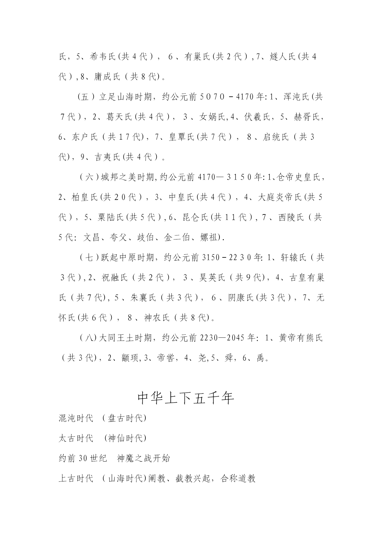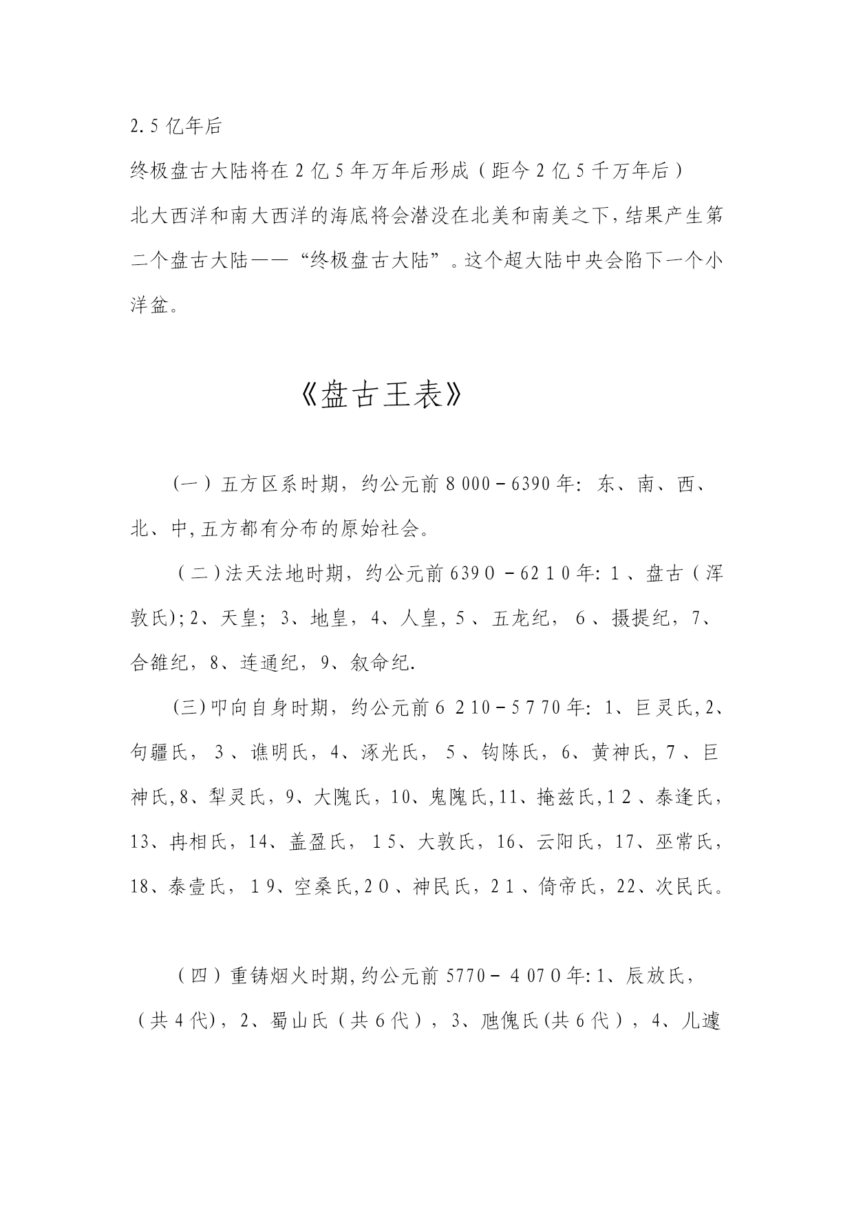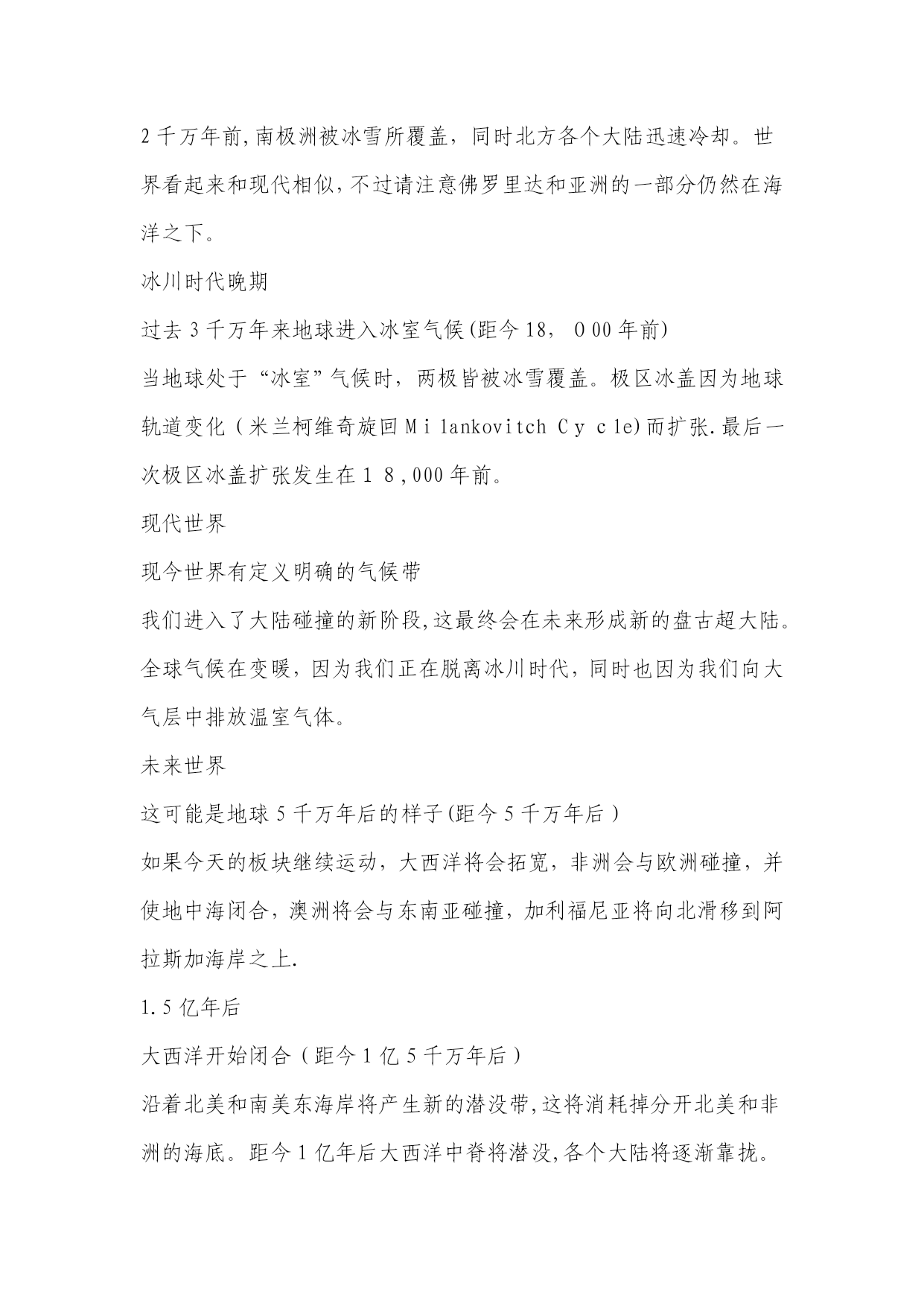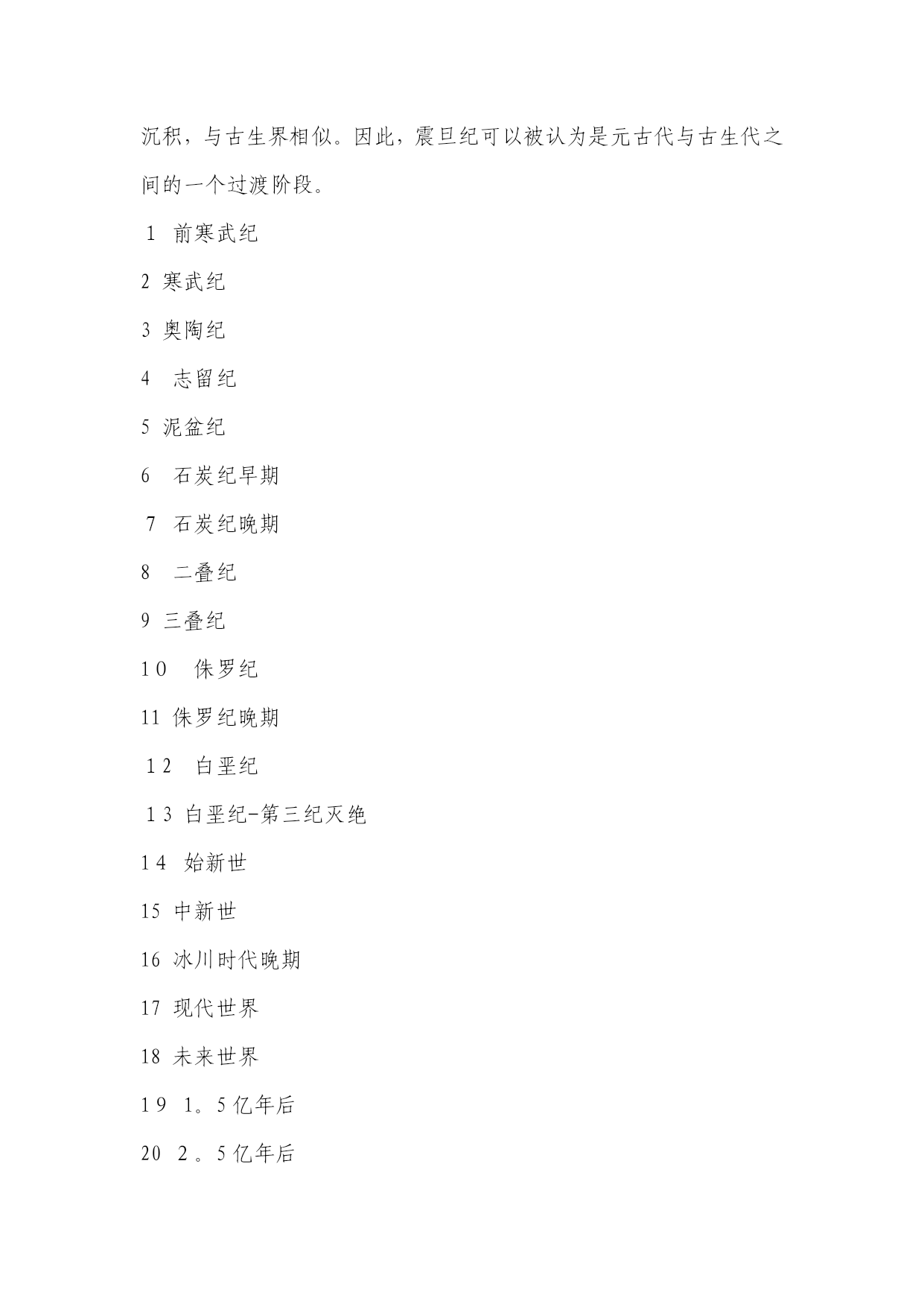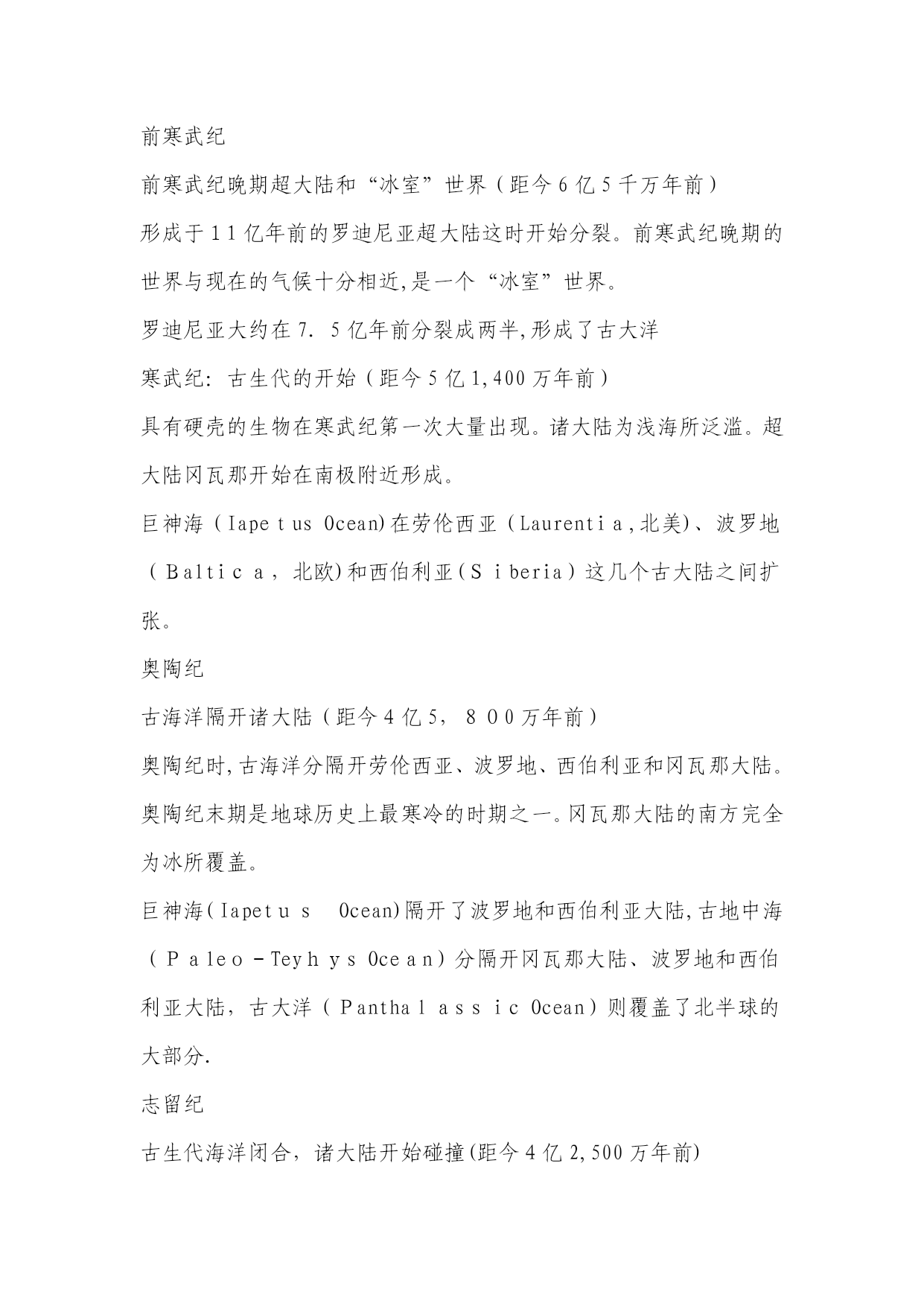 地球纪年表(完整资料)(可以直接使用,可编辑优秀版资料,欢迎下载)地球纪年表太古宙(Archean)是最古老的地史时期。从生物界看,这是原始生命出现及生物演化的初级阶段,当时只有数量不多的原核生物,他们只留下了极少的化石记录。从非生物界看,太古宙是一个地壳薄、地热梯度陡、火山—岩浆活动强烈而频繁、岩层普遍遭受变形与变质、大气圈与水圈都缺少自由氧、形成一系列特殊沉积物的时期;也是一个硅铝质地壳形成并不断增长的时期,又是一个重要的成矿时期。元古宙(Proterozoic)初期地表已出现了一些范围较广、厚度较大、相对稳定的大陆板块。因此,在岩石圈构造方面元古代比太古代显示了较为稳定的特点.早元古代晚期的大气圈已含有自由氧,而且随着植物的日益繁盛与光合作用的不断加强,大气圈的含氧量继续增加。元古代的中晚期藻类植物已十分繁盛,明显区别于太古代。震旦纪(Sinianperiod)是元古代最后期一个独特的地史阶段。从生物的进化看,震旦系因含有无硬壳的后生动物化石,而与不含可靠动物化石的元古界有了重要的区别;但与富含具有壳体的动物化石的寒武纪相比,震旦系所含的化石不仅种类单调、数量很少而且分布十分有限。因此,还不能利用其中的动物化石进行有效的生物地层工作。震旦纪生物界最突出的特征是后期出现了种类较多的无硬壳后生动物,末期又出现少量小型具有壳体的动物。高级藻类进一步繁盛,微体古植物出现了一些新类型,叠层石在震旦纪早期趋于繁盛,后期数量和种类都突然下降.再从岩石圈的构造状况来看,震旦纪时地表上已经出现几个大型的、相对稳定的大陆板块,之上已经是典型的盖层沉积,与古生界相似。因此,震旦纪可以被认为是元古代与古生代之间的一个过渡阶段。1前寒武纪2寒武纪3奥陶纪4志留纪5泥盆纪6石炭纪早期7石炭纪晚期8二叠纪9三叠纪10侏罗纪11侏罗纪晚期12白垩纪13白垩纪-第三纪灭绝14始新世15中新世16冰川时代晚期17现代世界18未来世界191。5亿年后202。5亿年后前寒武纪前寒武纪晚期超大陆和“冰室”世界(距今6亿5千万年前)形成于11亿年前的罗迪尼亚超大陆这时开始分裂。前寒武纪晚期的世界与现在的气候十分相近,是一个“冰室”世界。罗迪尼亚大约在7.5亿年前分裂成两半,形成了古大洋寒武纪:古生代的开始(距今5亿1,400万年前)具有硬壳的生物在寒武纪第一次大量出现。诸大陆为浅海所泛滥。超大陆冈瓦那开始在南极附近形成。巨神海(IapetusOcean)在劳伦西亚(Laurentia,北美)、波罗地(Baltica,北欧)和西伯利亚(Siberia)这几个古大陆之间扩张。奥陶纪古海洋隔开诸大陆(距今4亿5,800万年前)奥陶纪时,古海洋分隔开劳伦西亚、波罗地、西伯利亚和冈瓦那大陆。奥陶纪末期是地球历史上最寒冷的时期之一。冈瓦那大陆的南方完全为冰所覆盖。巨神海(IapetusOcean)隔开了波罗地和西伯利亚大陆,古地中海(Paleo-TeyhysOcean)分隔开冈瓦那大陆、波罗地和西伯利亚大陆,古大洋(PanthalassicOcean)则覆盖了北半球的大部分.志留纪古生代海洋闭合,诸大陆开始碰撞(距今4亿2,500万年前)劳伦西亚与波罗地大陆的碰撞闭合了巨神海的北面,并形成了“老红砂岩”(OldRedSandstone)大陆。珊瑚礁扩张,陆生植物开始覆盖荒芜的大陆。大陆碰撞导致斯堪地那维亚半岛上的加里东山脉(CaledonideMts.)的形成,以及大不列颠北部、格陵兰和北美东海岸的阿帕拉契山脉(AppalachianMts。)的形成。泥盆纪泥盆纪:鱼类的时代(距今3亿9千万年前)泥盆纪时,古生代早期海洋闭合,形成“前盘古(pre—Pangea)”大陆.淡水鱼类从南半球迁徙至北美和欧洲。森林首次在赤道附近的古加拿大生长.植物大量生长,形成了今天加拿大北部、格陵兰北部和斯堪的纳维亚的煤炭。石炭纪早期石炭纪早期盘古大陆开始形成(距今3亿5,600万年前)石炭纪早期,欧美大陆(Euramerica)和冈瓦那大陆间的古生代海洋闭合,形成阿帕拉契山脉(AppalachianMts.)和维利斯堪山脉(VariscanMts。)。南极开始形成冰帽,同时四足脊椎动物在赤道附近的煤炭沼泽开始发展.石炭纪晚期石炭纪晚期:巨大煤炭沼泽的时代(距今3亿600万年前)石炭纪晚期,由北美及欧洲组成的大陆与南方的冈瓦那大陆碰撞,形成了盘古大陆(Pangea)的西半部分。南半球大部分被冰所覆盖,而巨大的煤炭沼泽则沿着赤道形成。以赤道为中心,盘古大陆从南极延伸至北极,并将古地中海(Paleo—TethysOcean)与古大洋(panthalassic)分隔在东、西两侧。二叠纪二叠纪末期:自
